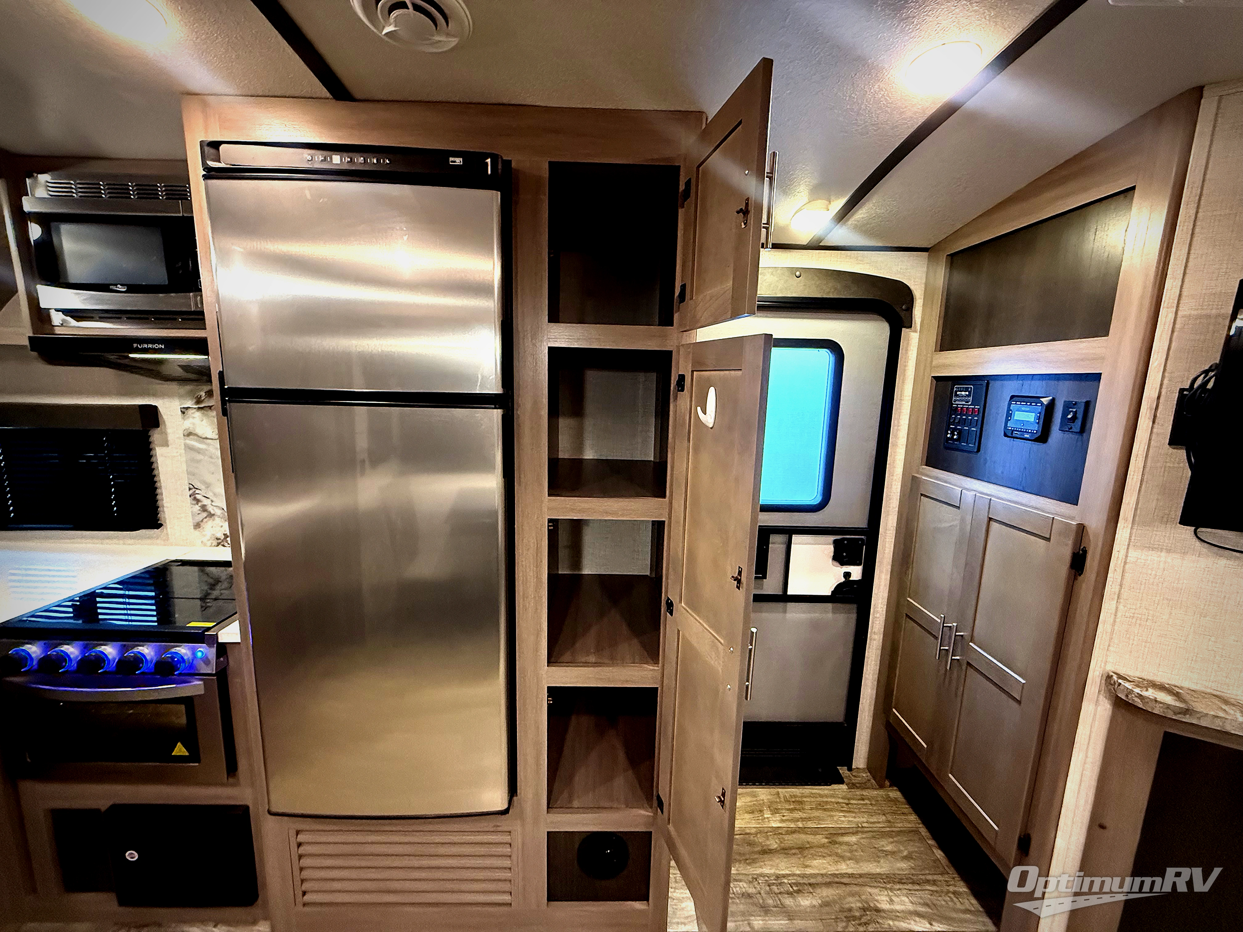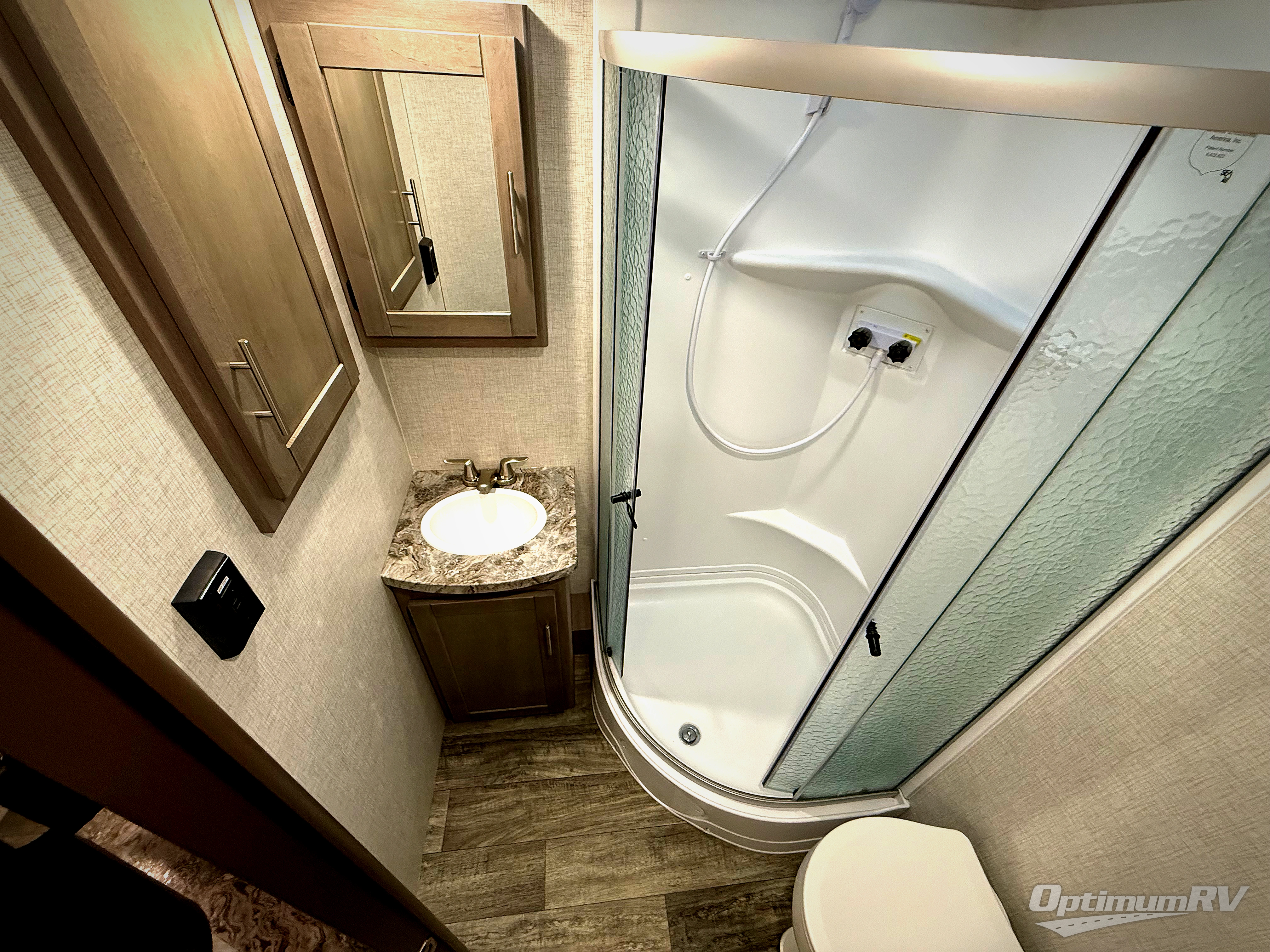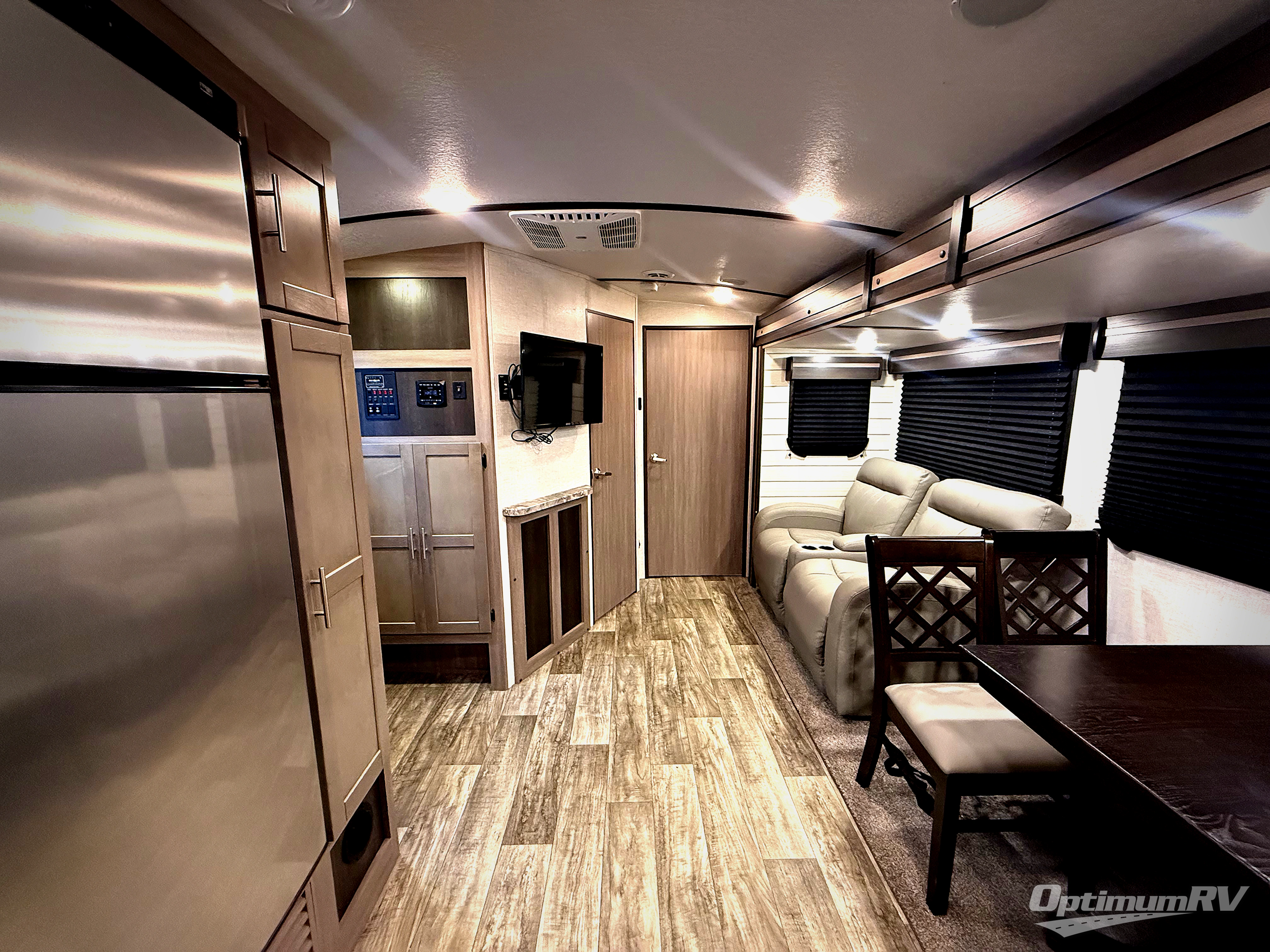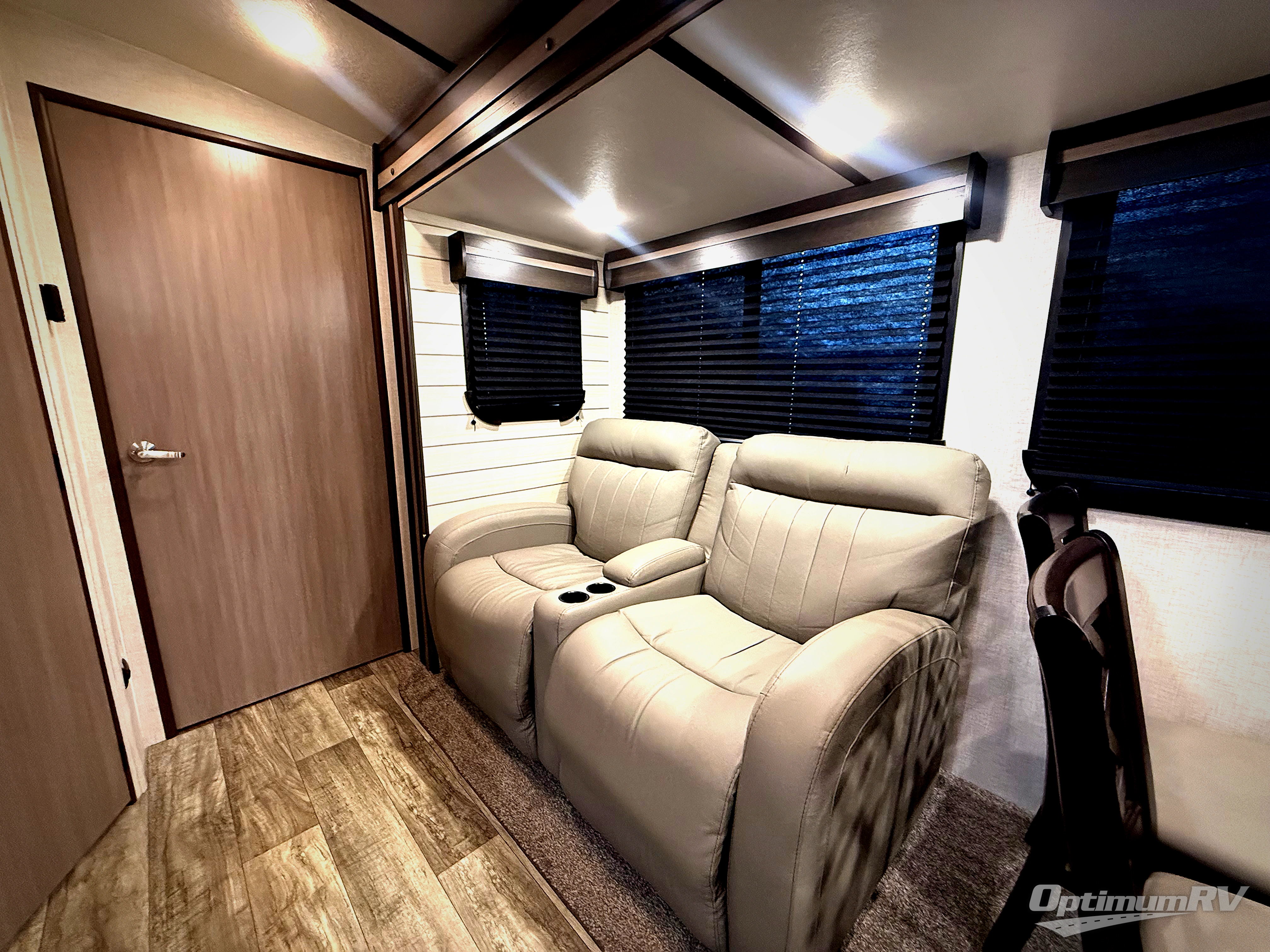 Pack your bags and head to the lake in this spacious travel trailer. Once you arrive you can prepare a quick lunch on the glass top range or use the convenient stainless steel microwave. Take a look around the campground or find a trail or two, and when you return you can freshen up in the full bath. The XL booth dinette provides a place to dine and two can comfortably sleep here. You'll also find a tri-fold sofa or you can choose optional theater seating if you're not needing the extra sleeping space. Mom and dad will enjoy the rear private bedroom with its king bed, dual wardrobes, plus a shoe storage and pet station for convenience.