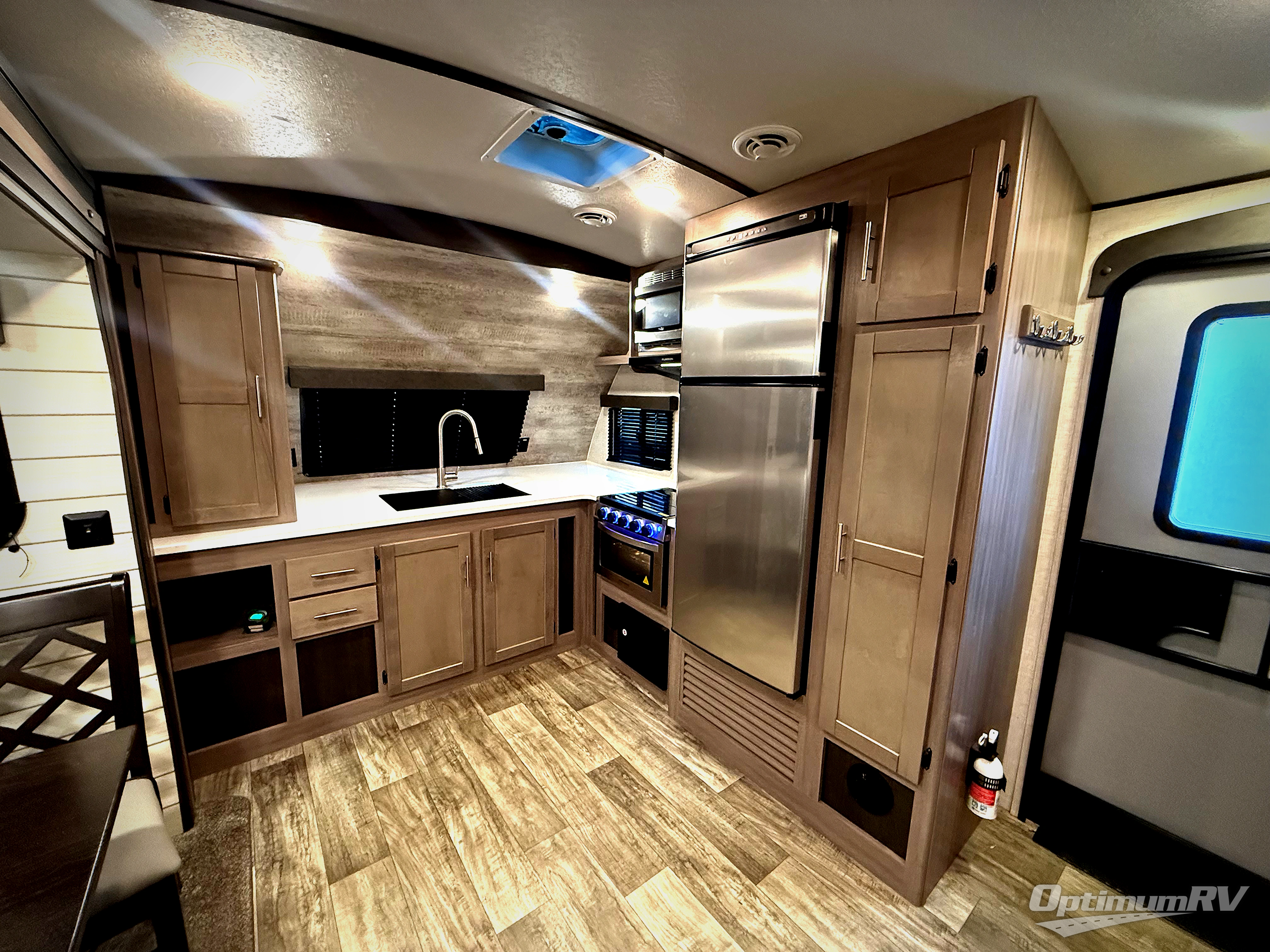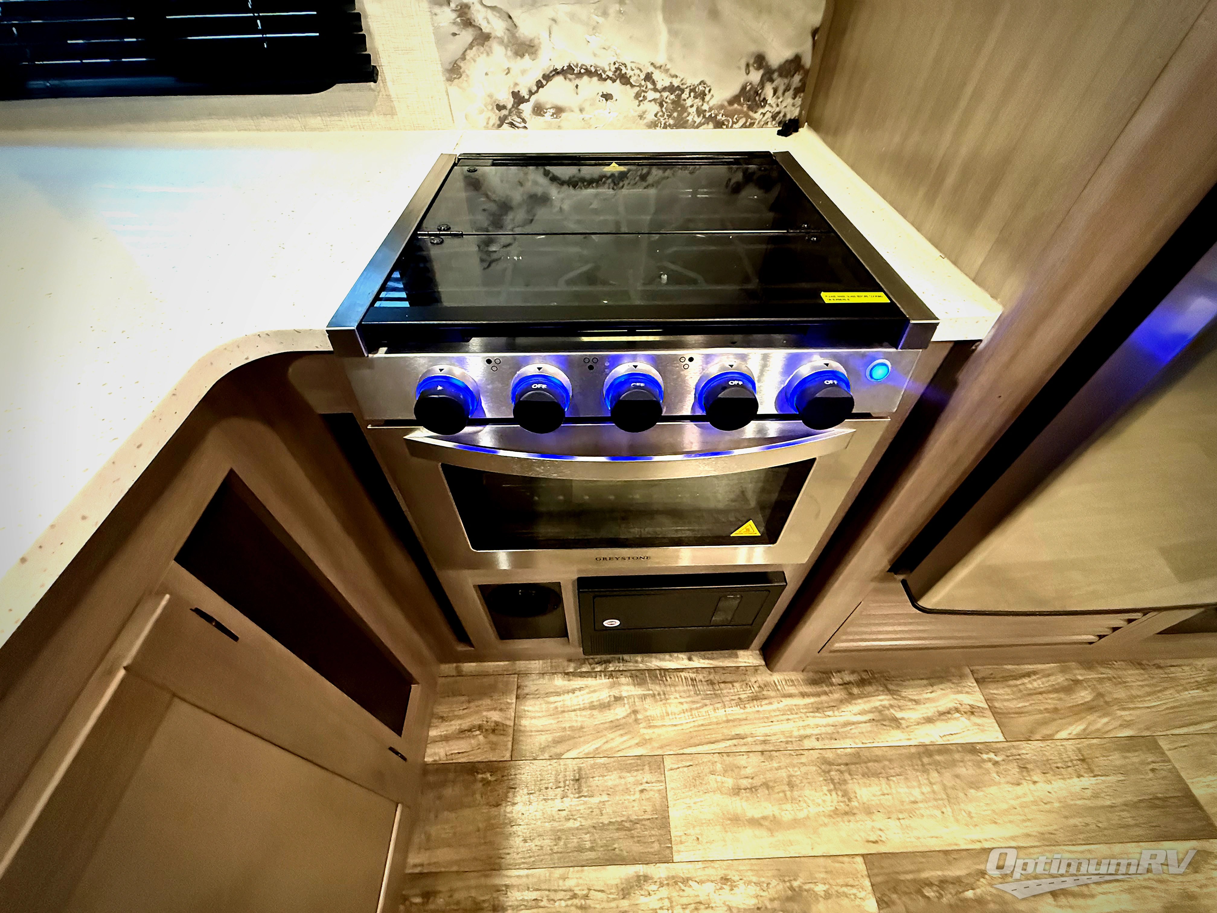 The lightweight Sunset Trail travel trailers by CrossRoads RV include EZ lube axles, laminated sidewalls, secure stance entry steps, plus an exterior convenience center to make each camping trip enjoyable. The gas oven, stainless steel microwave, and refrigerator allow you to cook and store food during your trip to the lake, and the stainless steel farmhouse sink will make clean-up a breeze. These models feature solid wood drawer construction and LED lights for an open and bright living space. You can choose to add many convenient options, such as the optional 50 amp electrical service, a second 13,500 BTU A/C, and a free-standing table and chairs in place of the booth dinette!