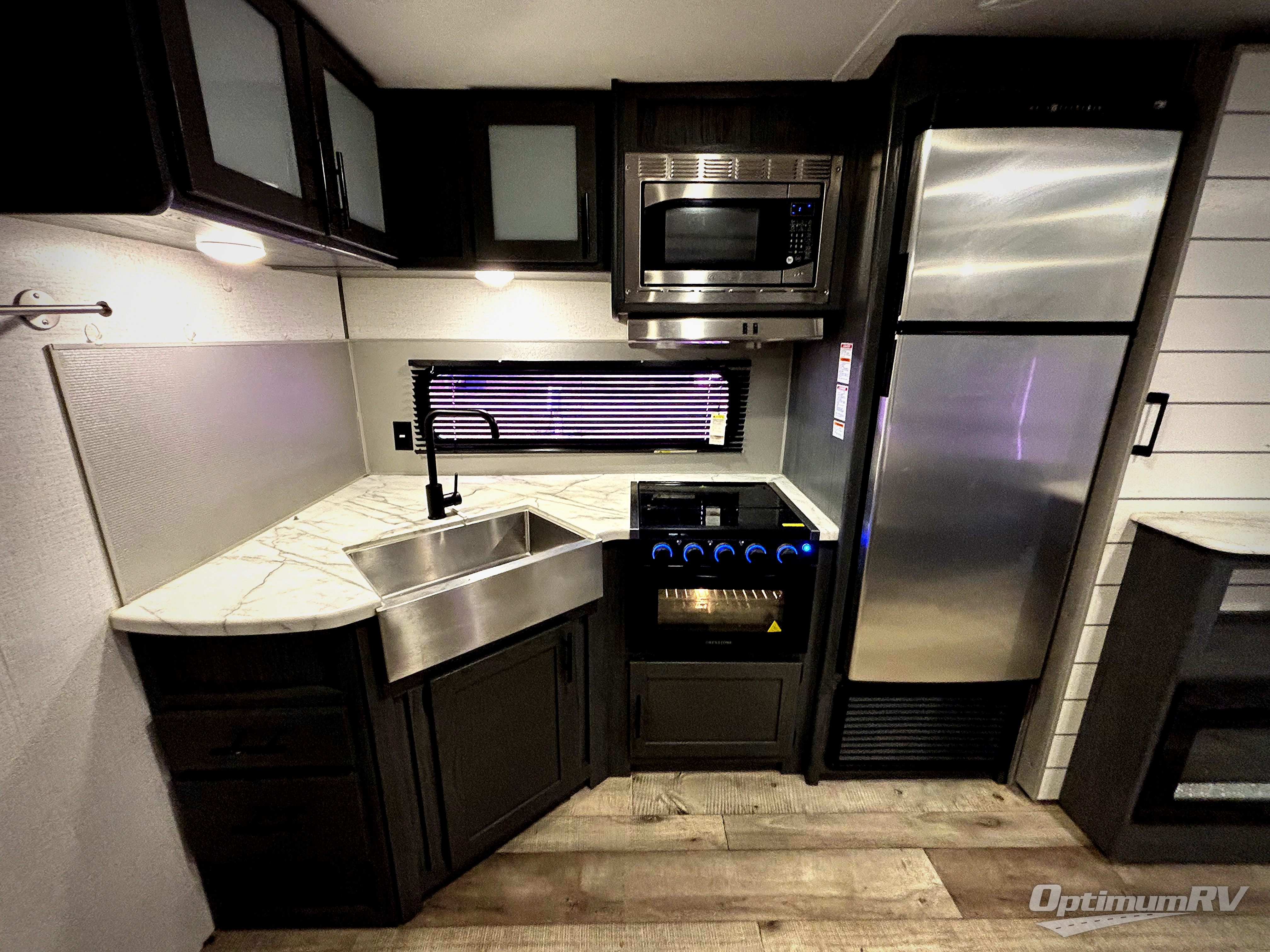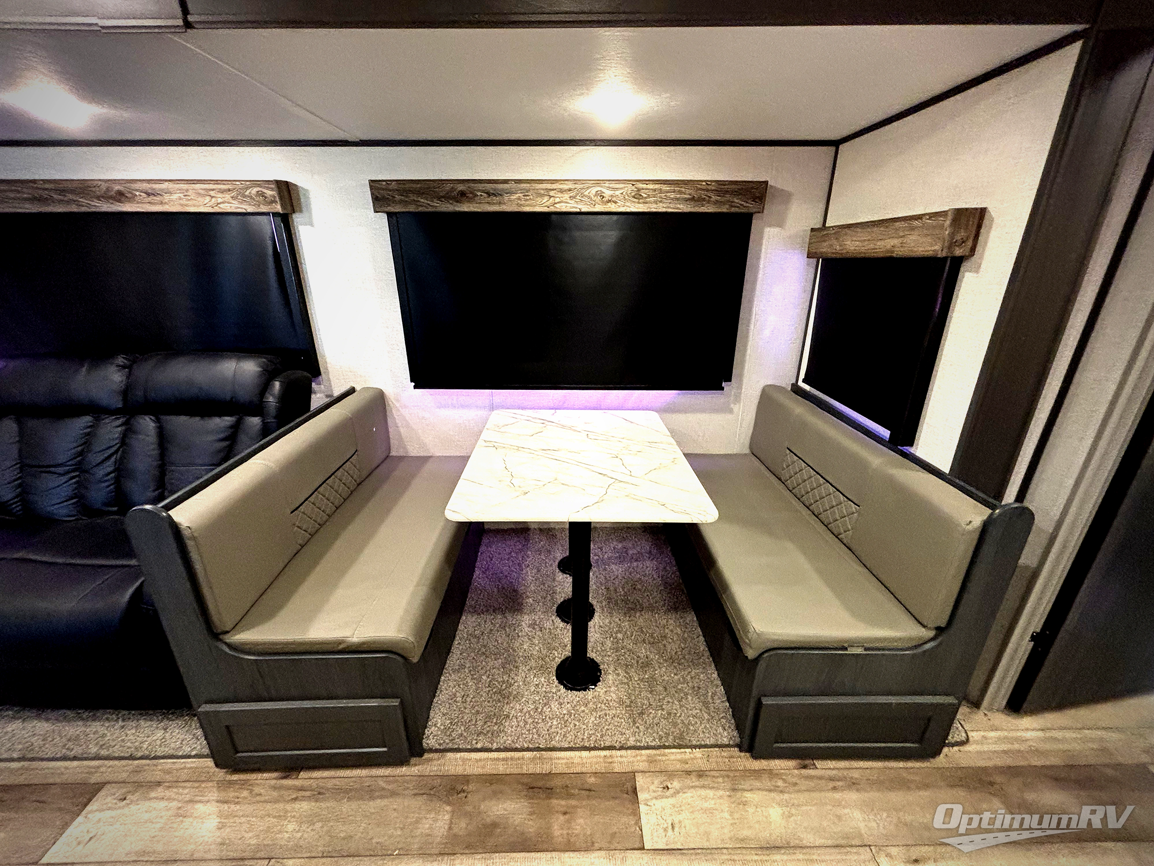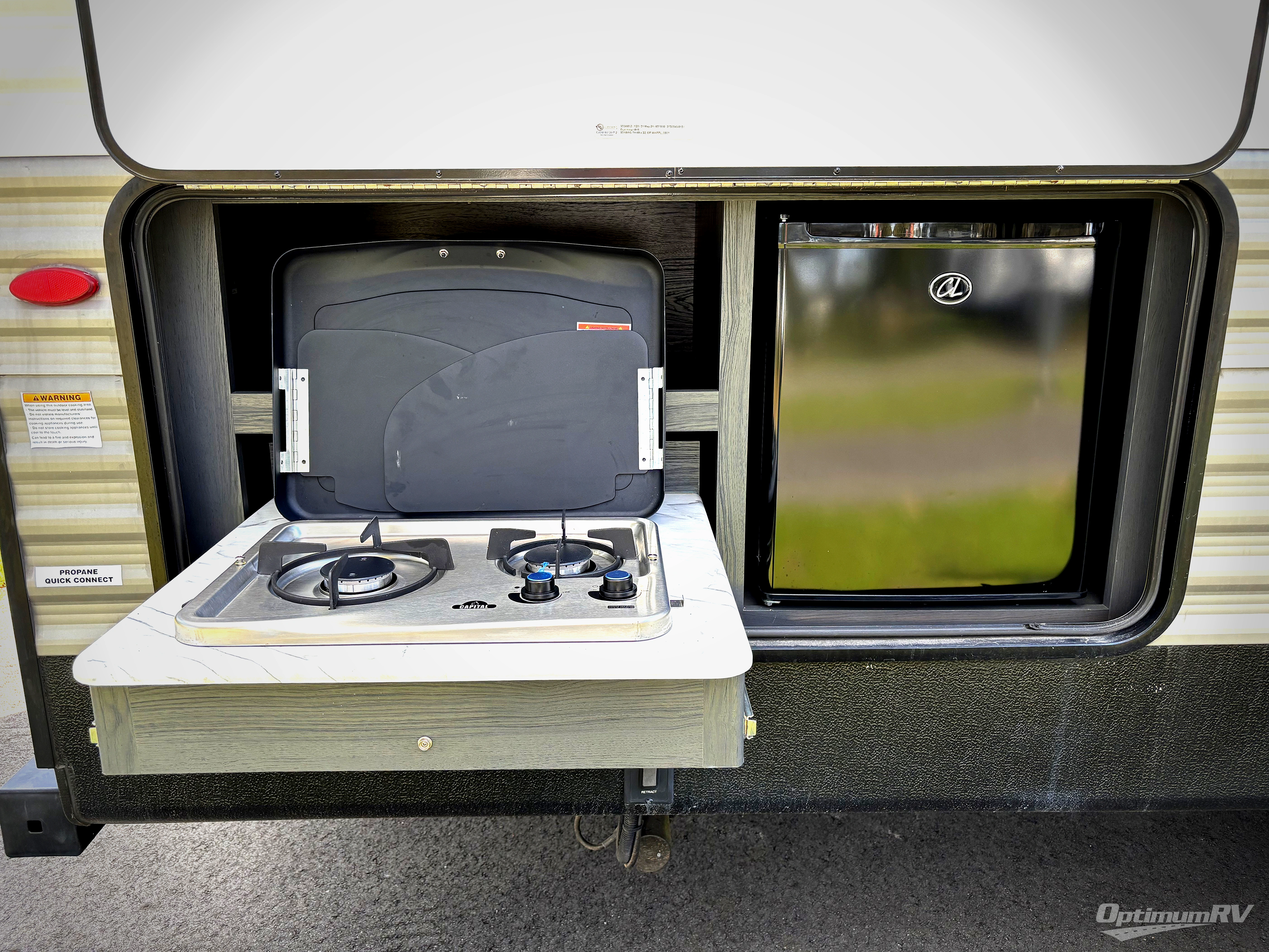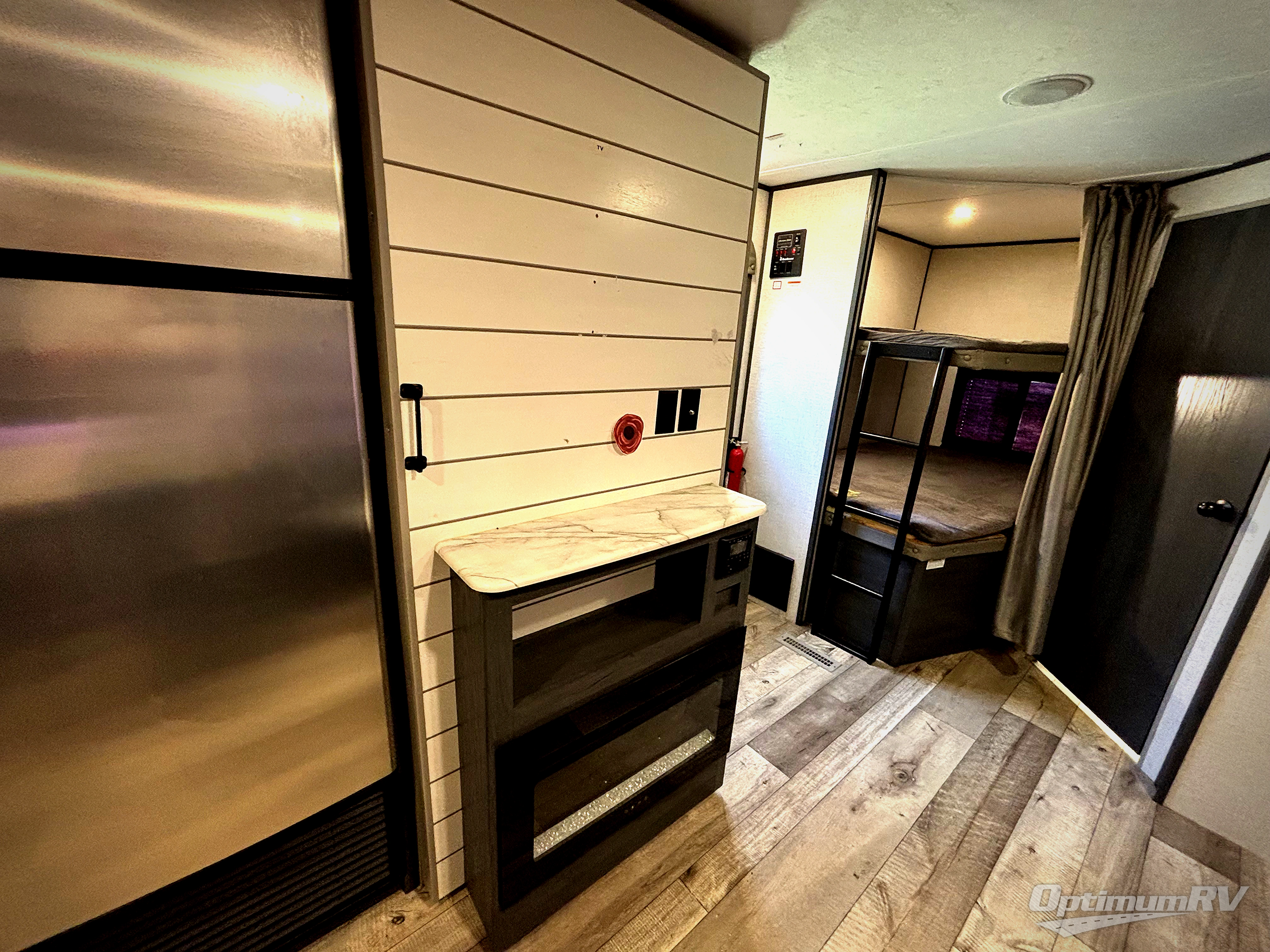 This travel trailer is decked out in features you will love! From the U-shaped dinette and sofa slide across from the hinged entertainment center with a fireplace to the front private bedroom with its very own private half bathroom. The kids will also have their own private bathroom with it being conveniently right next to the set of rear corner bunk beds. Whether you cook indoors on the three burner cooktop and oven or at the outdoor kitchen, you are sure to enjoy a delicious meal.
