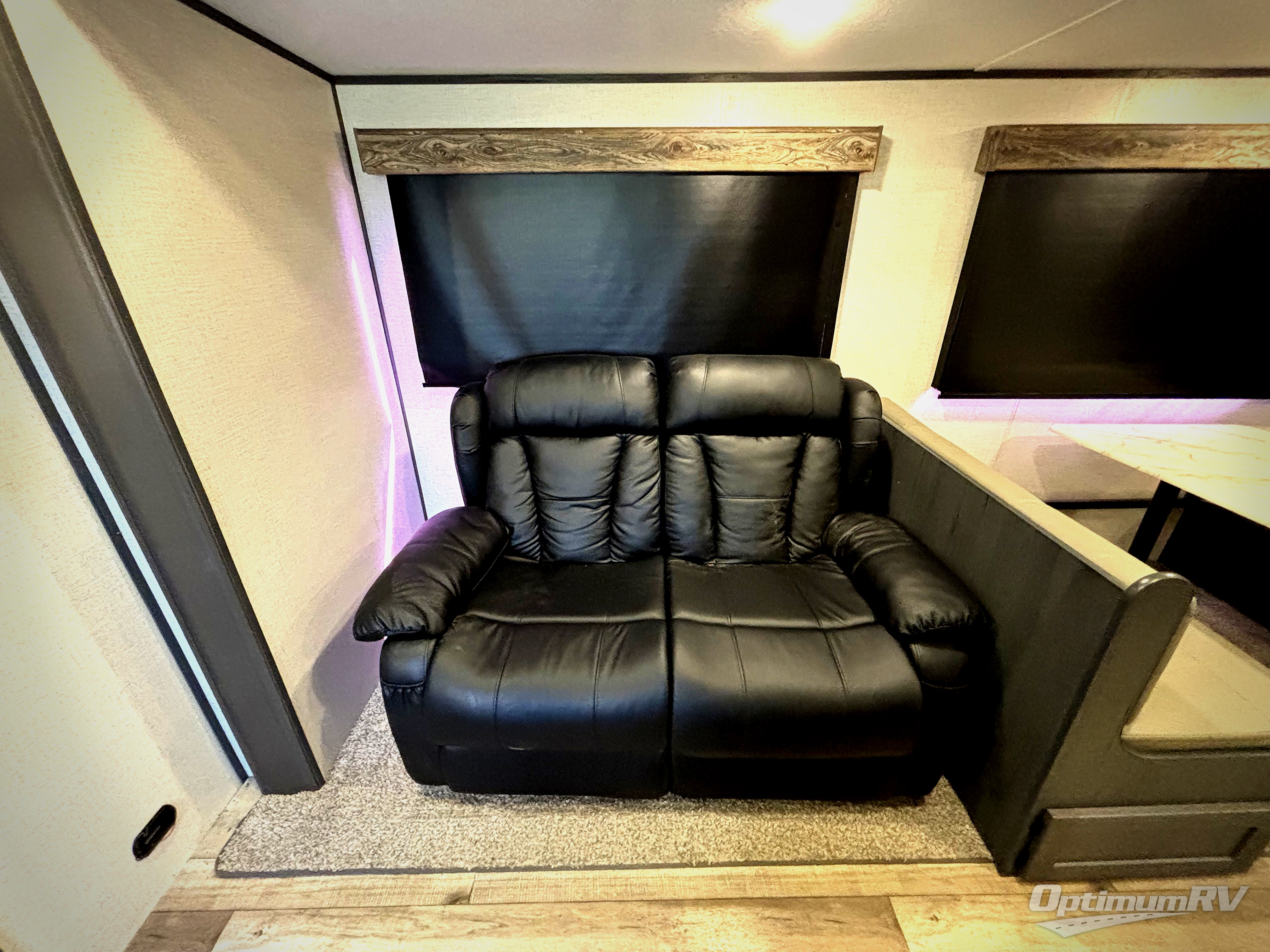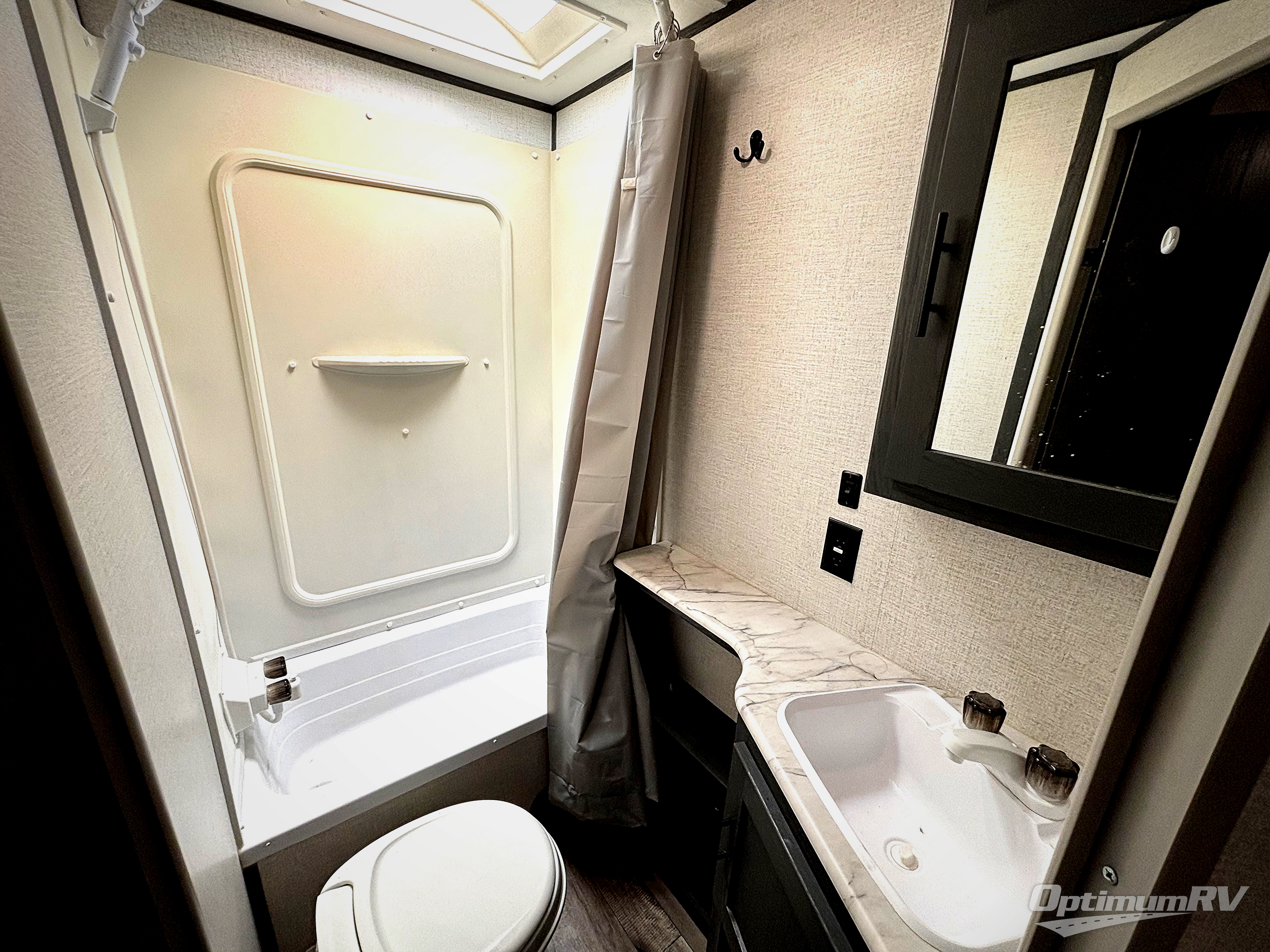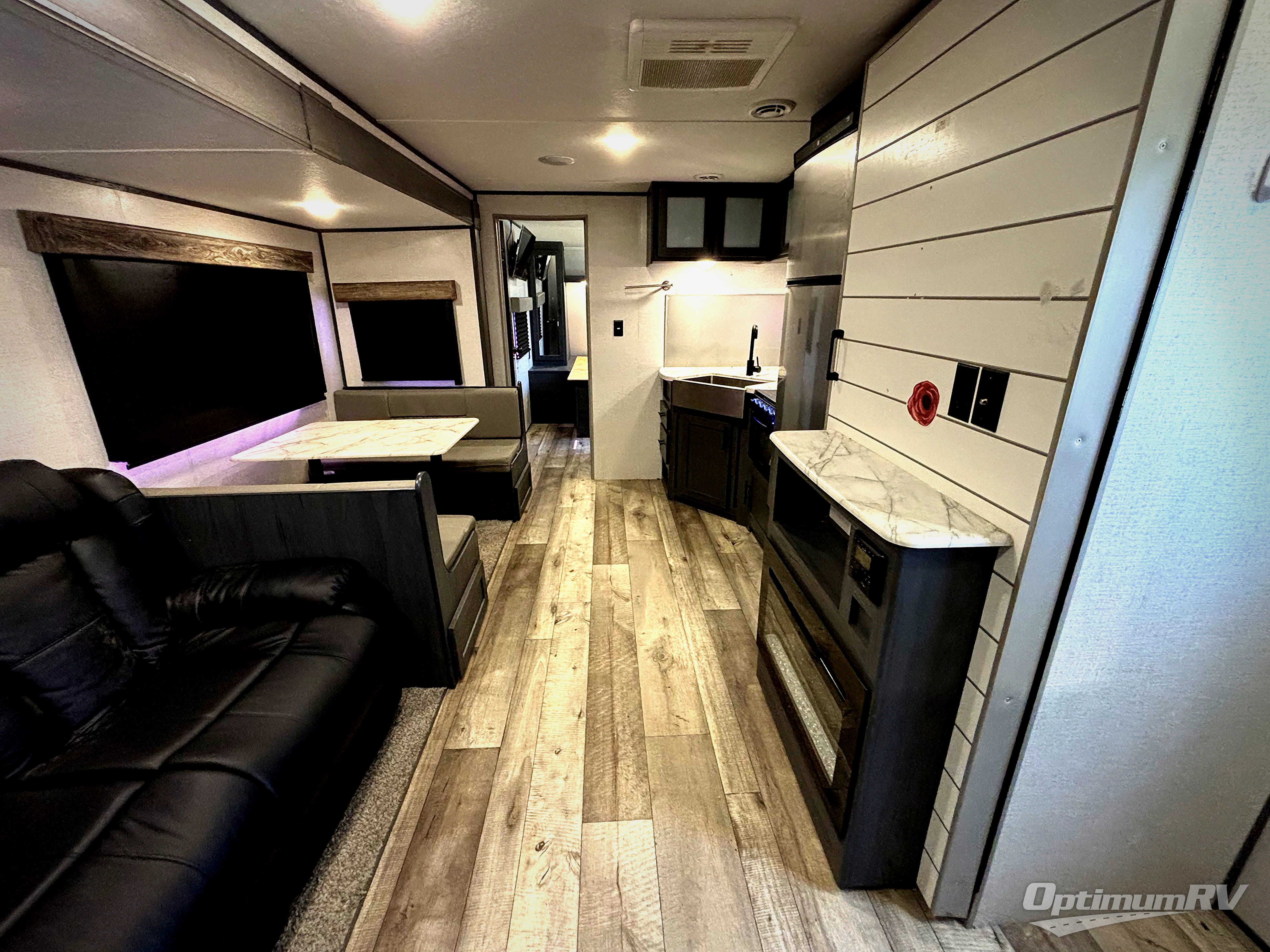 This travel trailer is decked out in features you will love! From the U-shaped dinette and sofa slide across from the hinged entertainment center with a fireplace to the front private bedroom with its very own private half bathroom. The kids will also have their own private bathroom with it being conveniently right next to the set of rear corner bunk beds. Whether you cook indoors on the three burner cooktop and oven or at the outdoor kitchen, you are sure to enjoy a delicious meal.