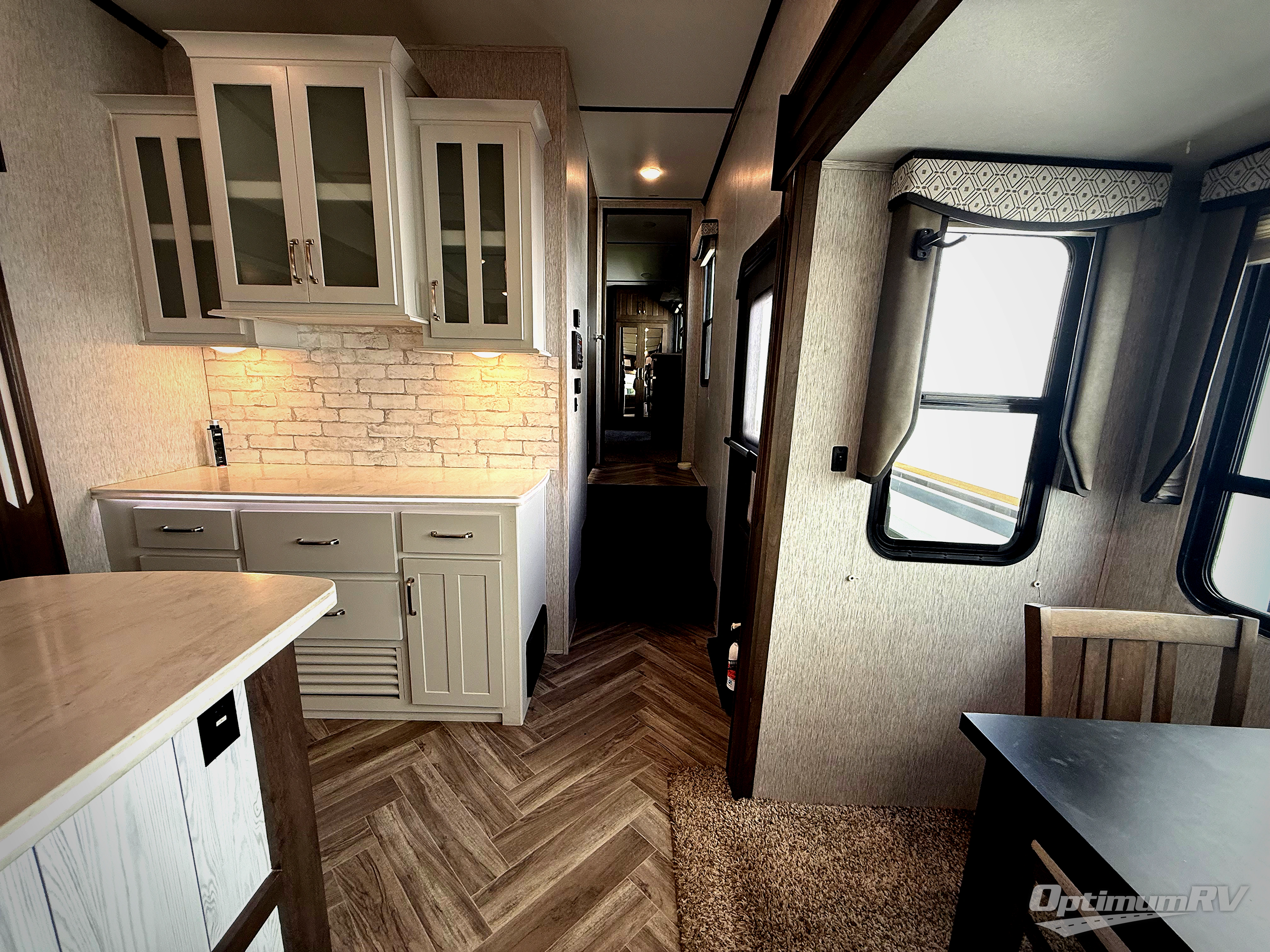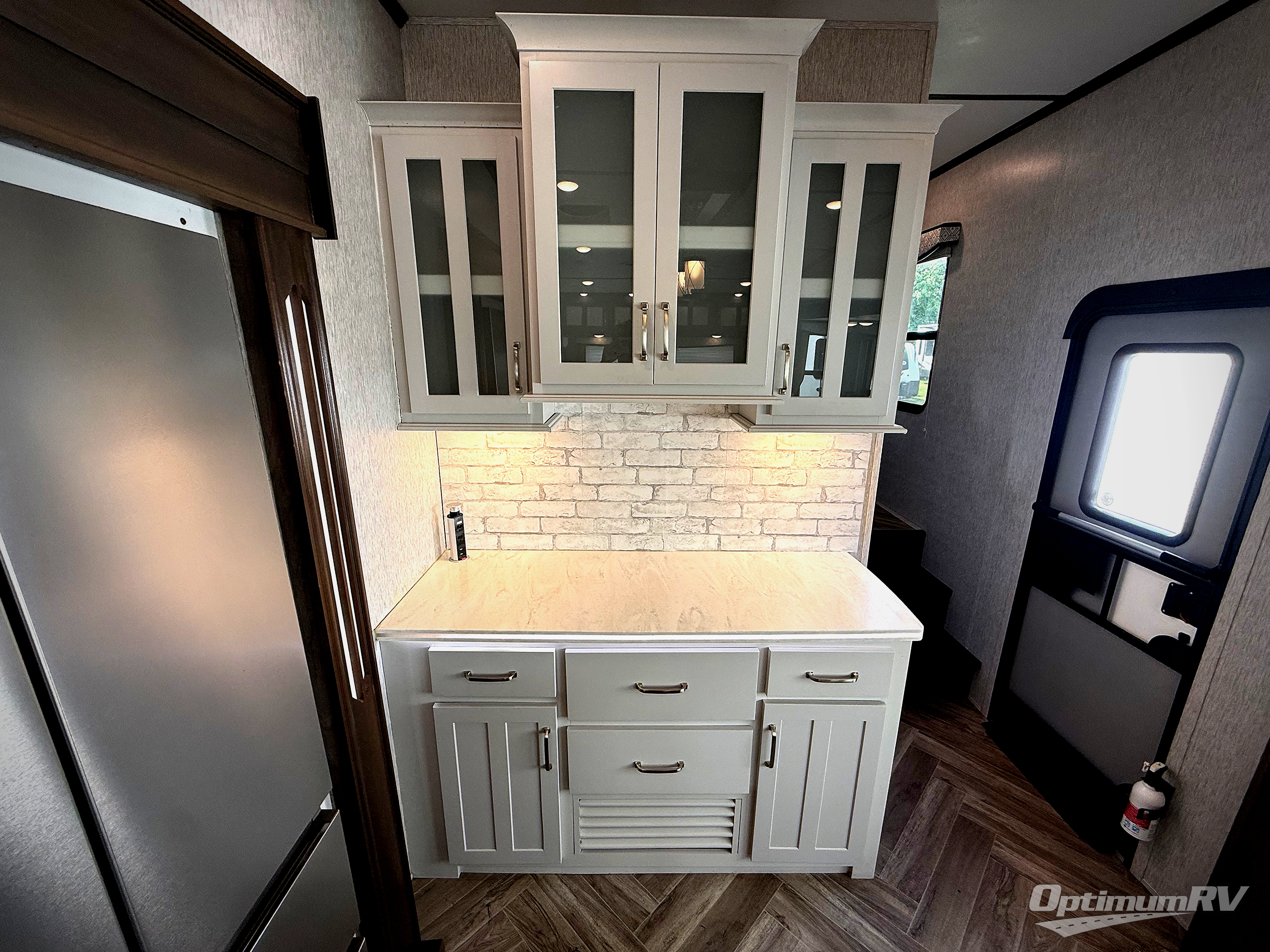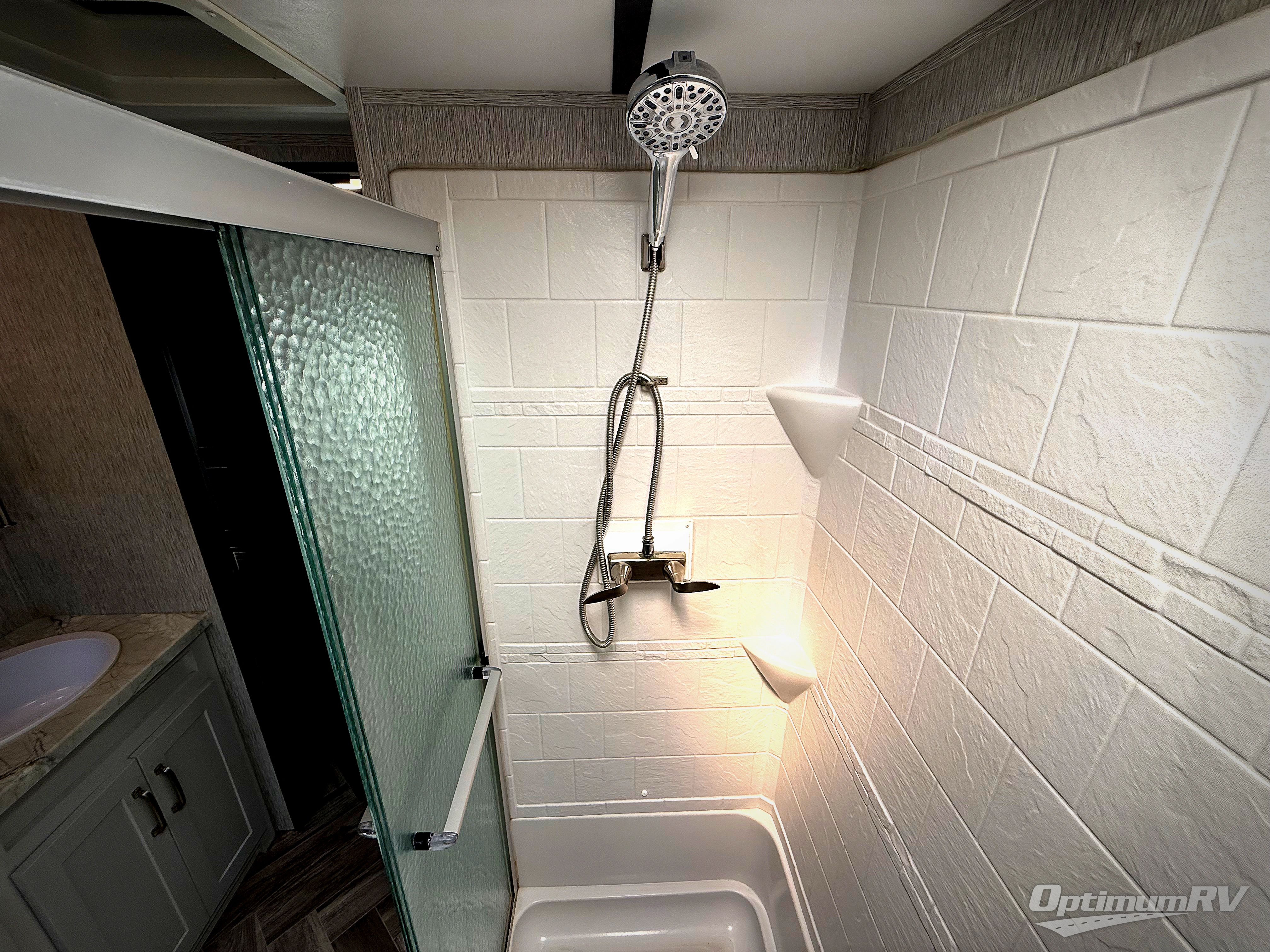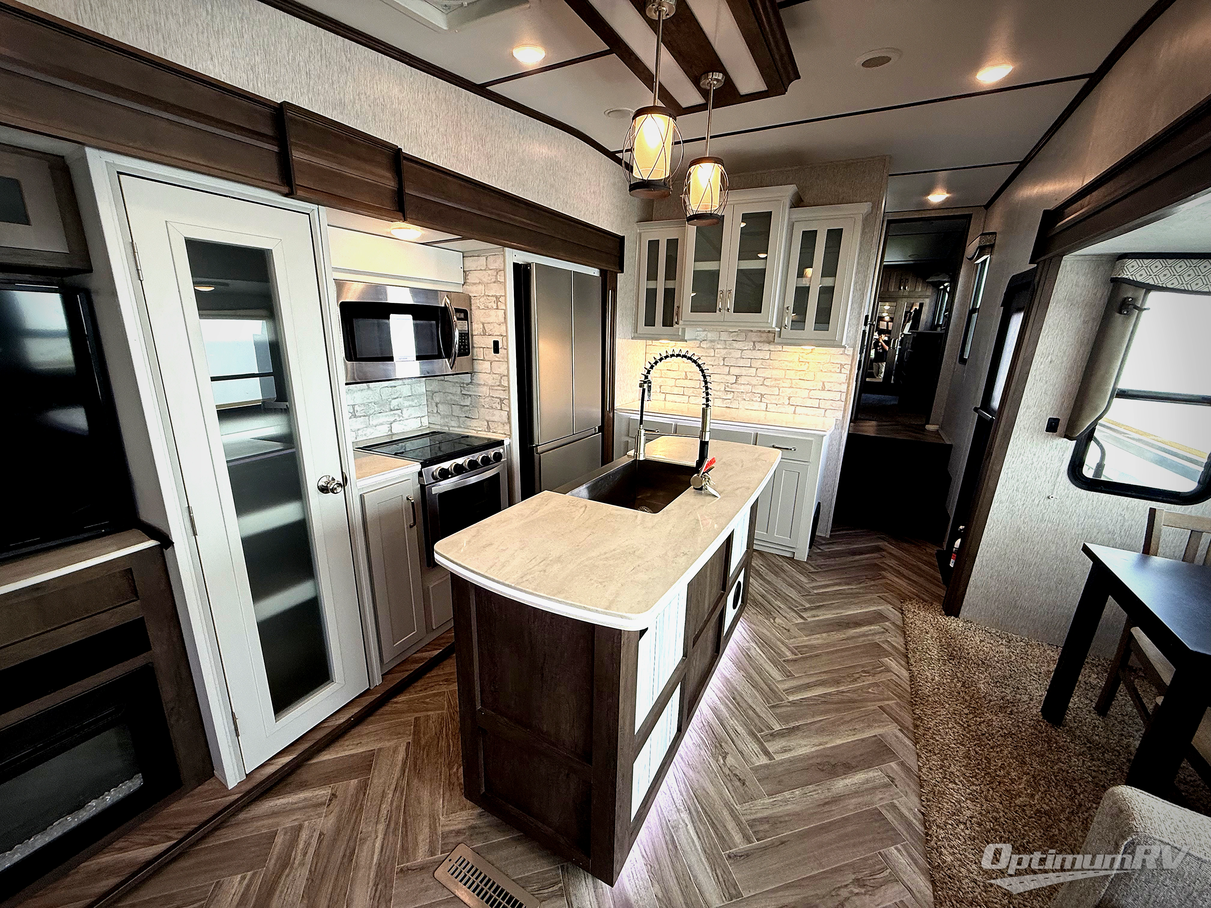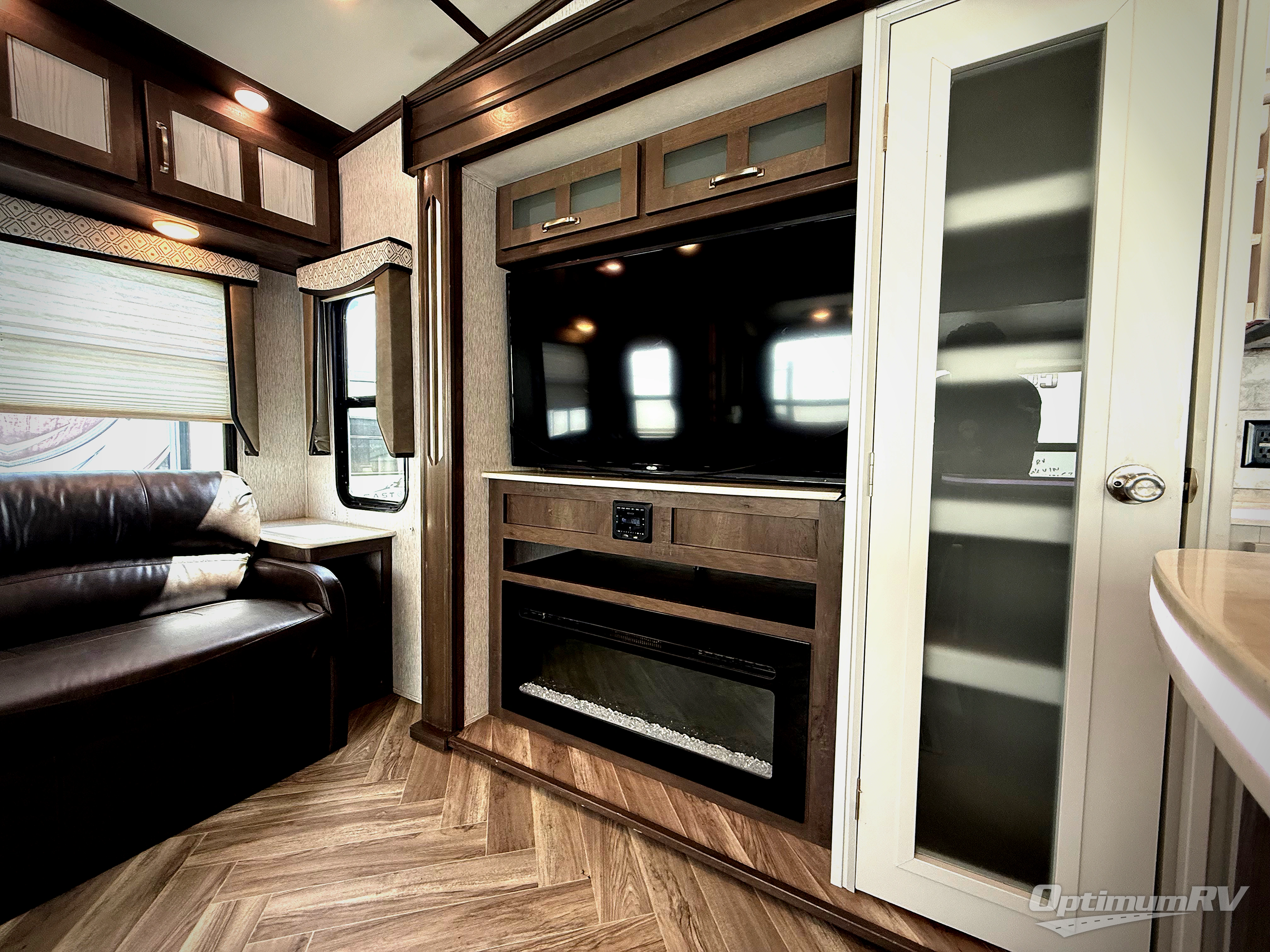 Whether you travel with your spouse or your family to state parks or RV resorts, this fifth wheel offers enough space and comfort! Enjoy the cozy 40" glass fireplace during chilly months, and the 50" LED TV on rainy days. The dual opposing slides in the rear living/kitchen area open up the whole space, and the kitchen island with solid surface countertop makes it feel more like home. You'll appreciate all the storage space you have, including a pantry and a 12 cu. ft. refrigerator for all your food for the week. This unit features a front private bedroom with a king-size bed slide and a large front wardrobe.