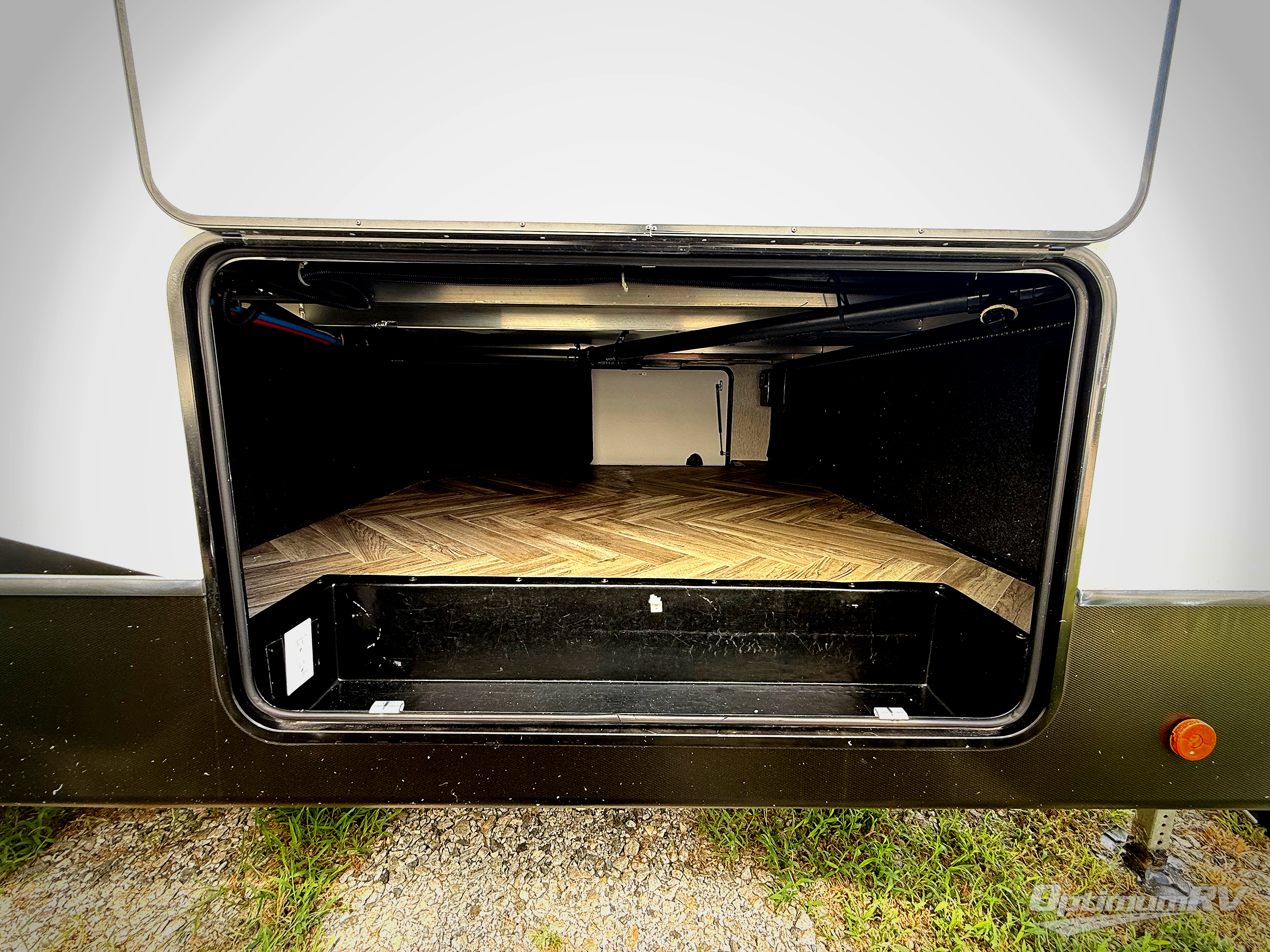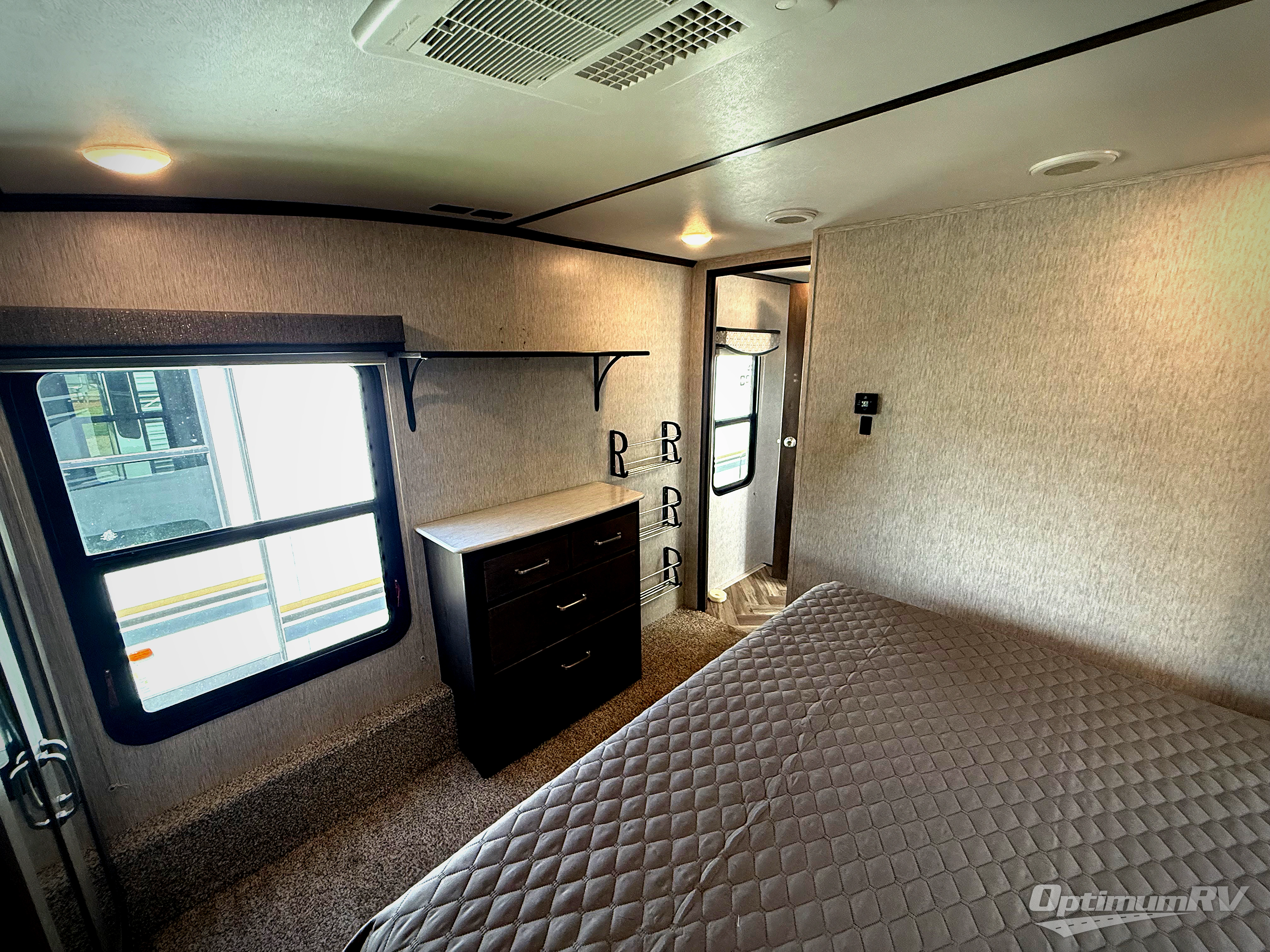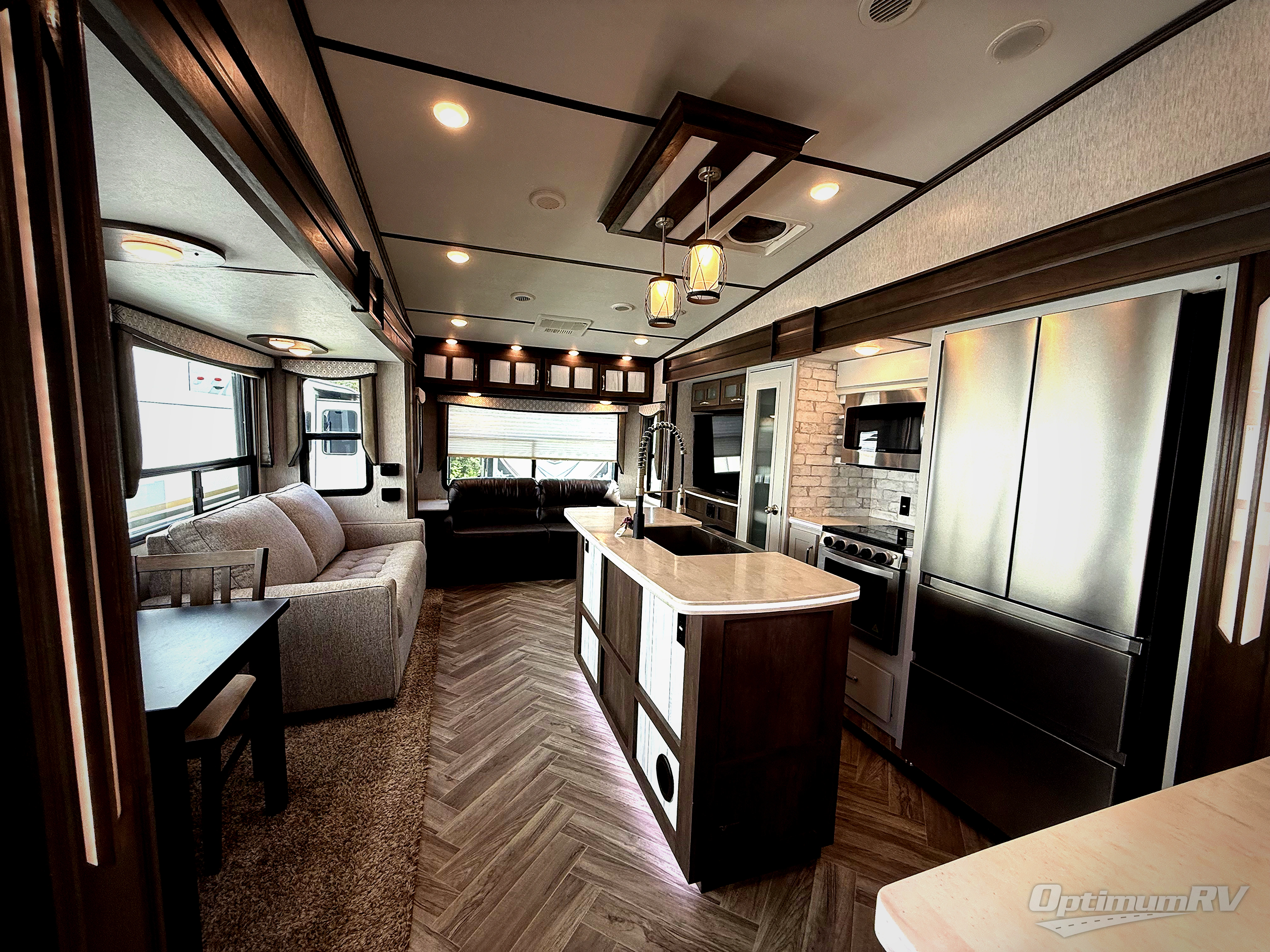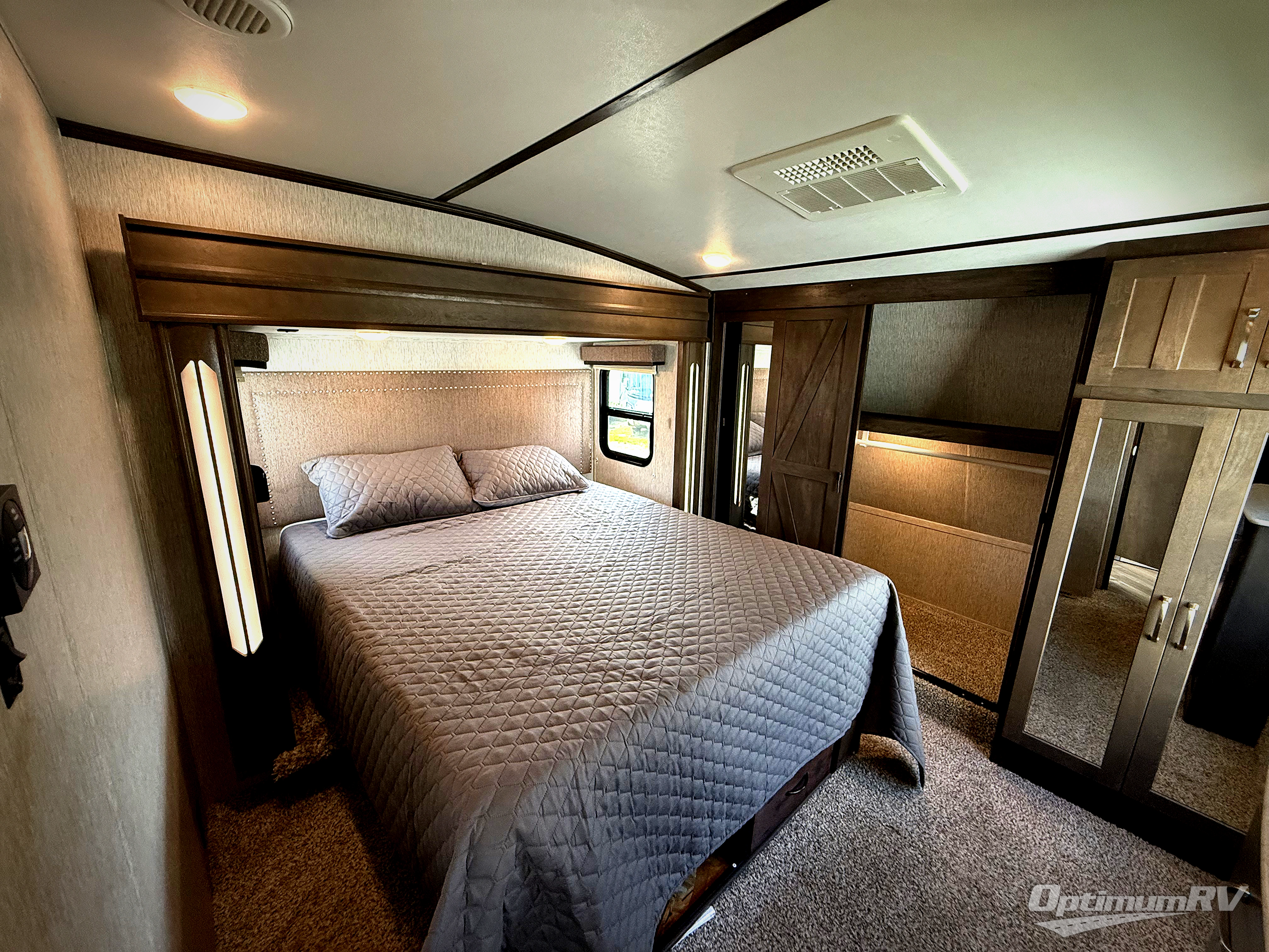 Whether you travel with your spouse or your family to state parks or RV resorts, this fifth wheel offers enough space and comfort! Enjoy the cozy 40" glass fireplace during chilly months, and the 50" LED TV on rainy days. The dual opposing slides in the rear living/kitchen area open up the whole space, and the kitchen island with solid surface countertop makes it feel more like home. You'll appreciate all the storage space you have, including a pantry and a 12 cu. ft. refrigerator for all your food for the week. This unit features a front private bedroom with a king-size bed slide and a large front wardrobe.