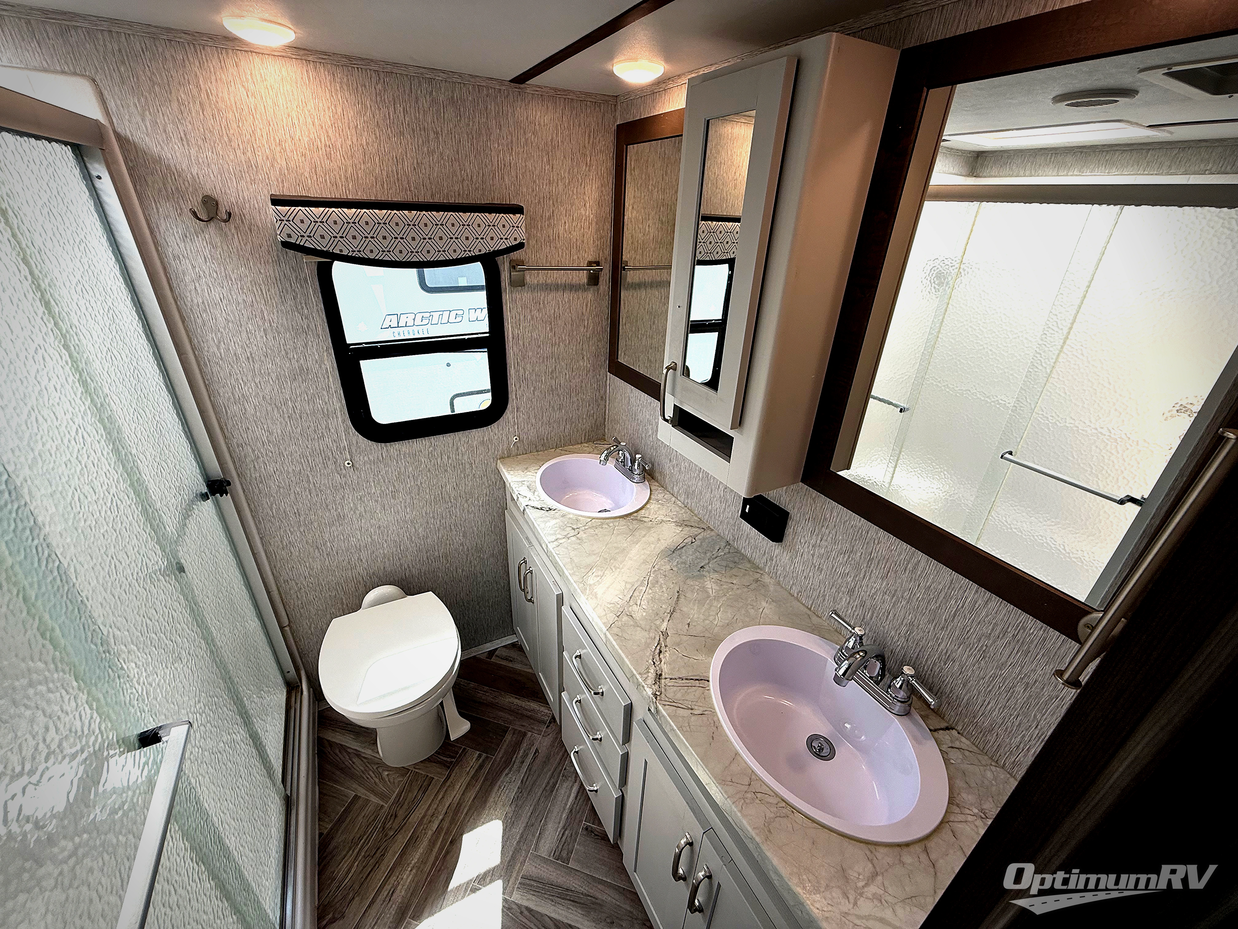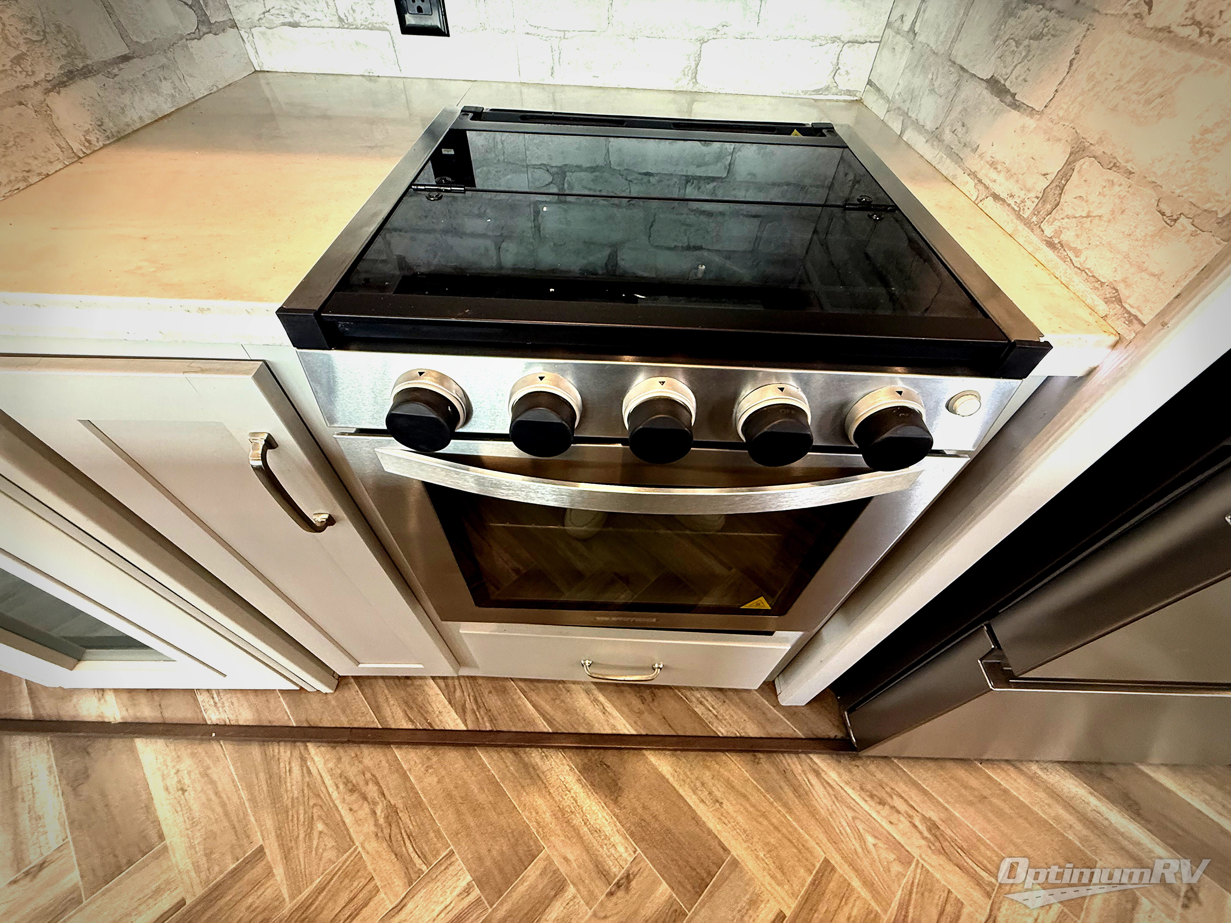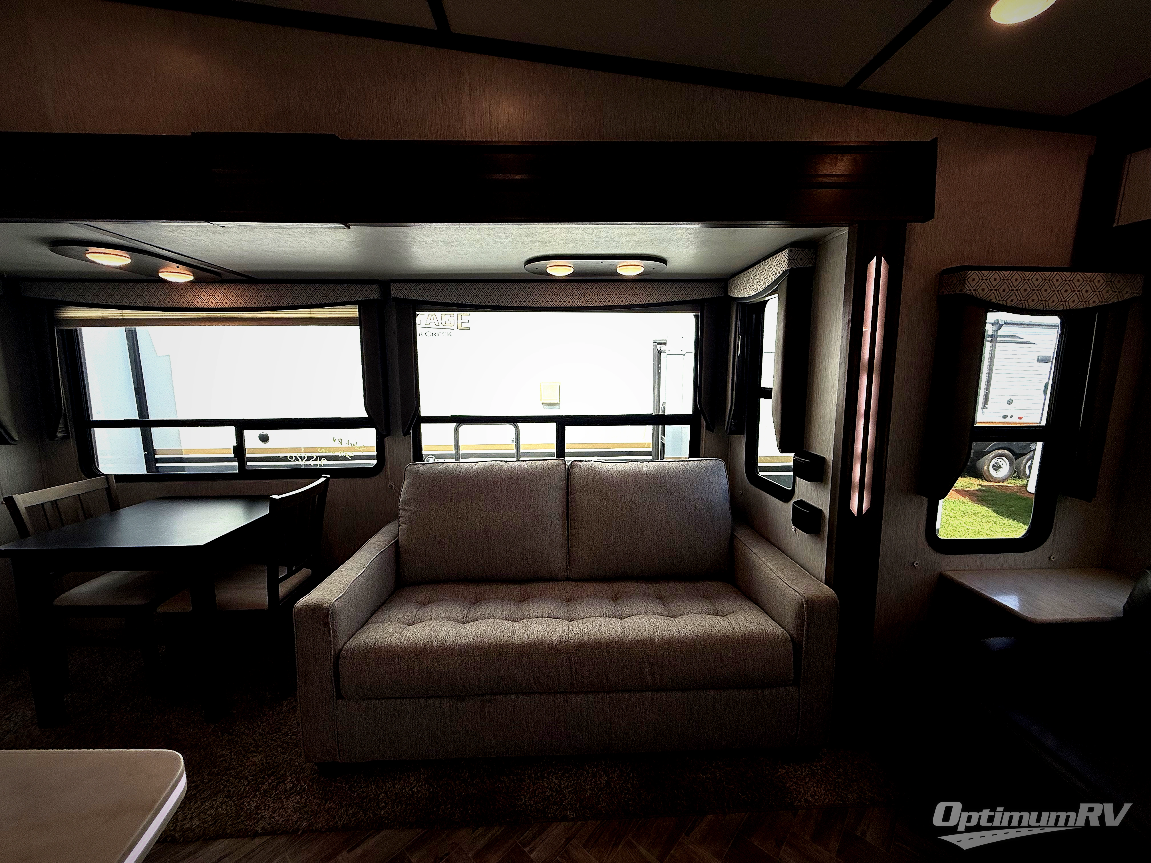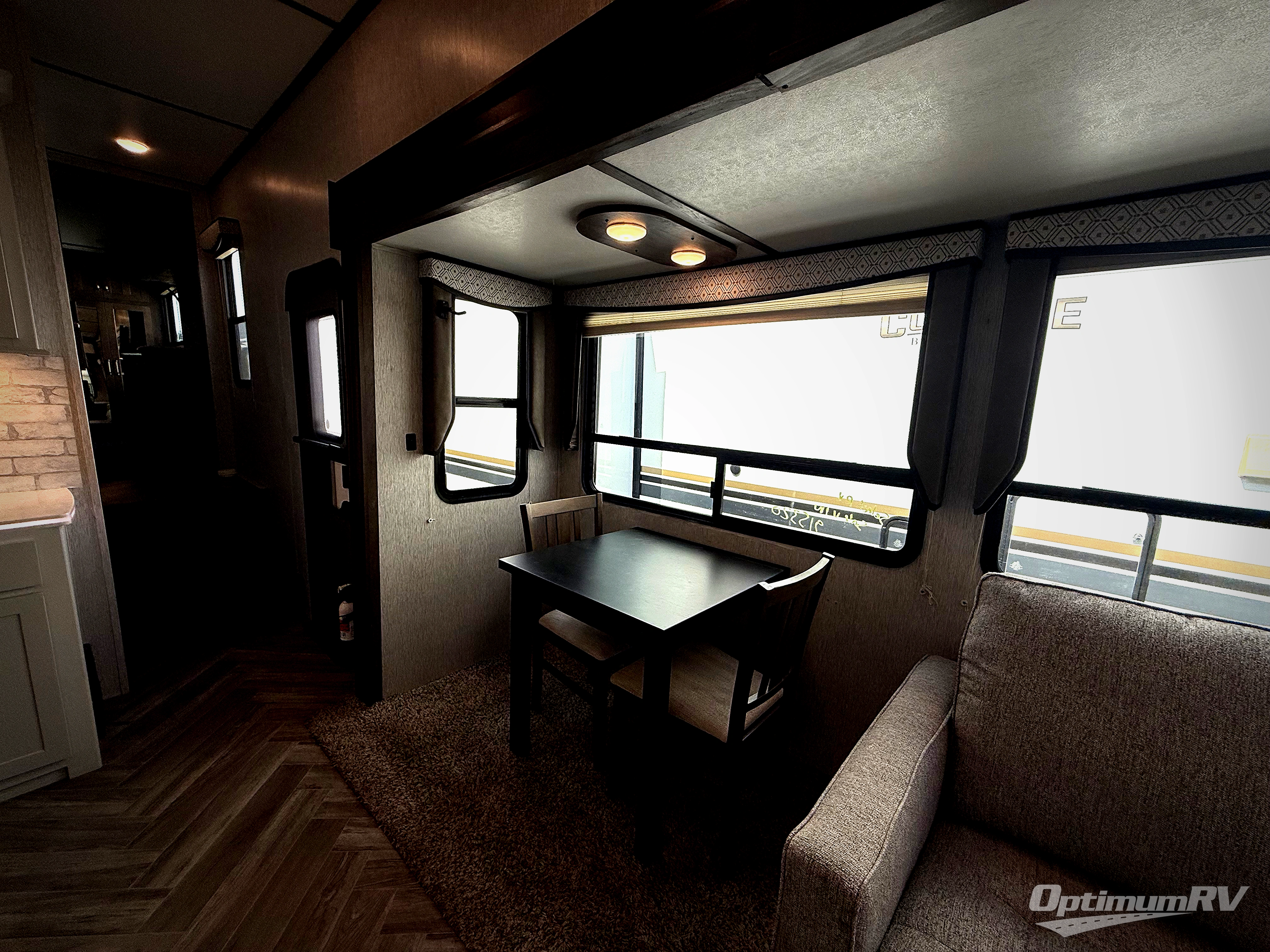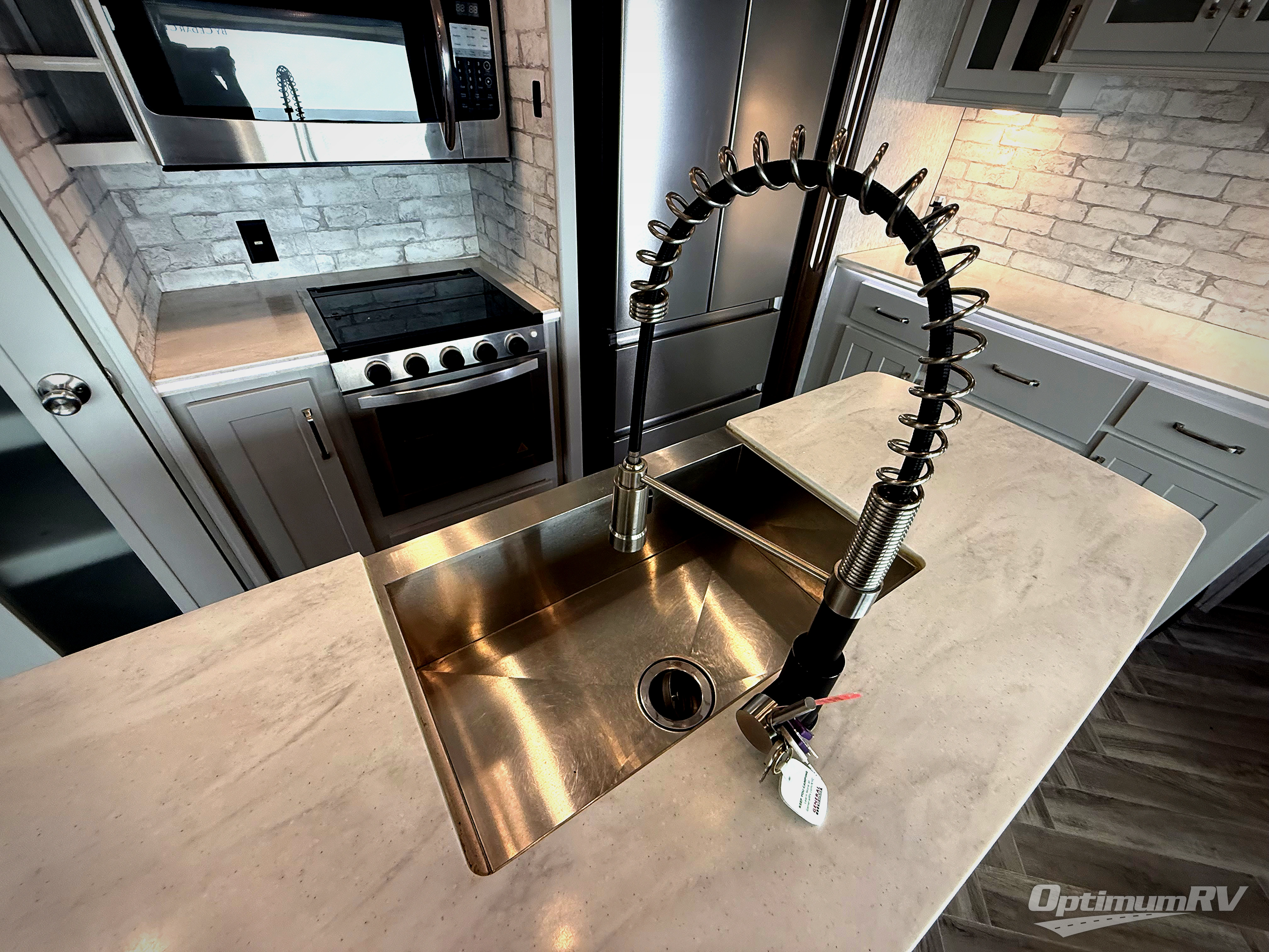 Whether you travel with your spouse or your family to state parks or RV resorts, this fifth wheel offers enough space and comfort! Enjoy the cozy 40" glass fireplace during chilly months, and the 50" LED TV on rainy days. The dual opposing slides in the rear living/kitchen area open up the whole space, and the kitchen island with solid surface countertop makes it feel more like home. You'll appreciate all the storage space you have, including a pantry and a 12 cu. ft. refrigerator for all your food for the week. This unit features a front private bedroom with a king-size bed slide and a large front wardrobe.