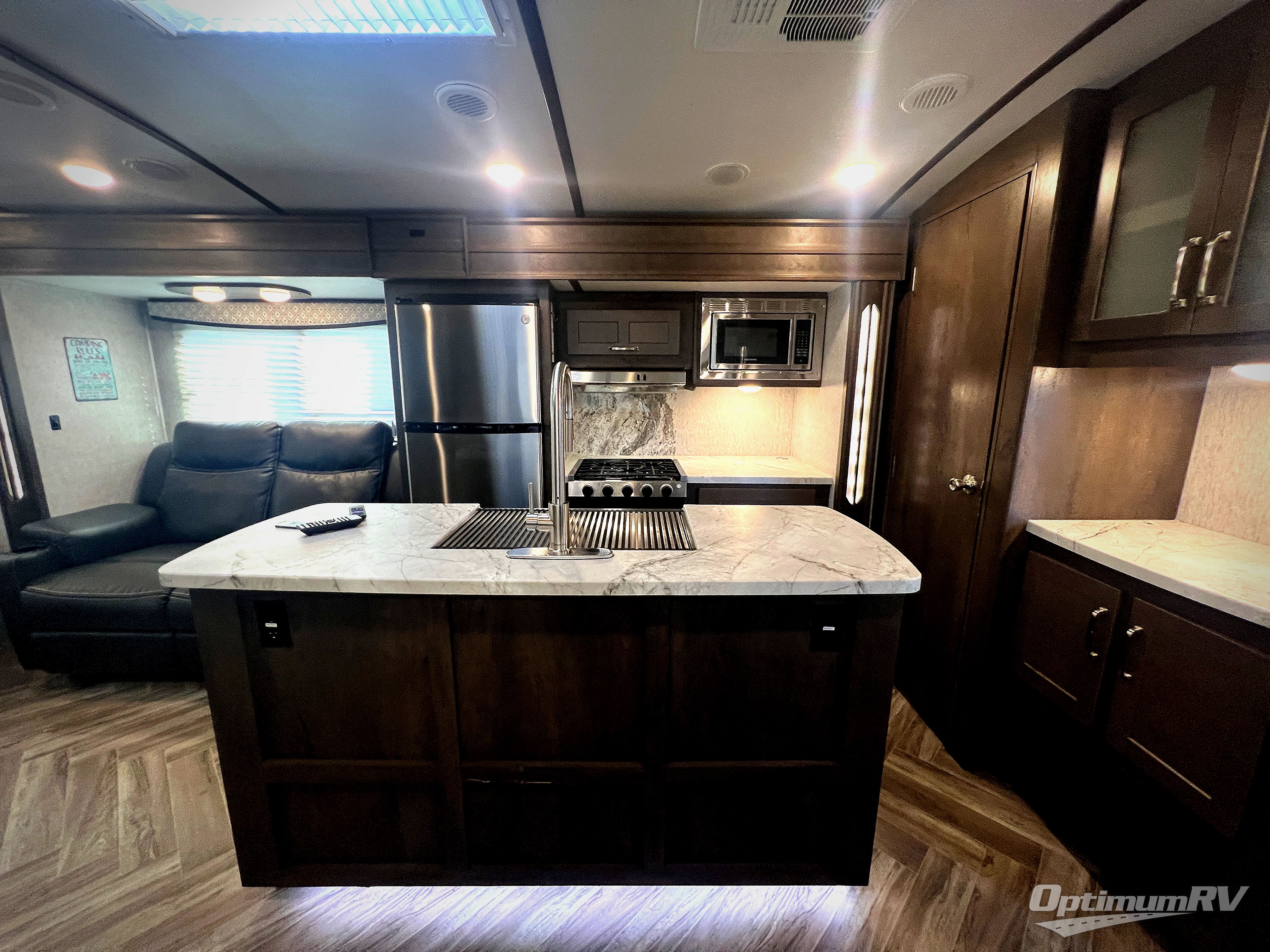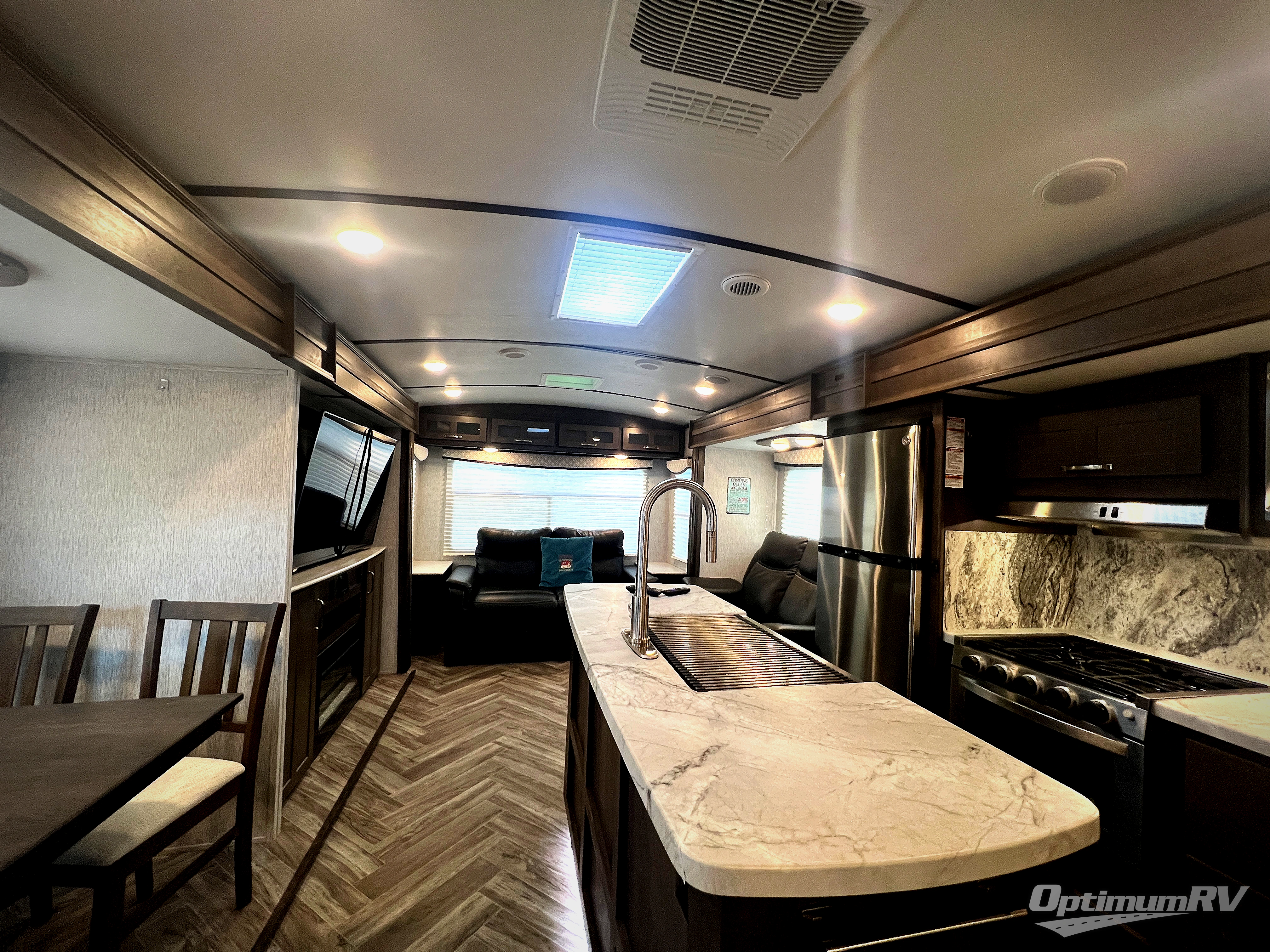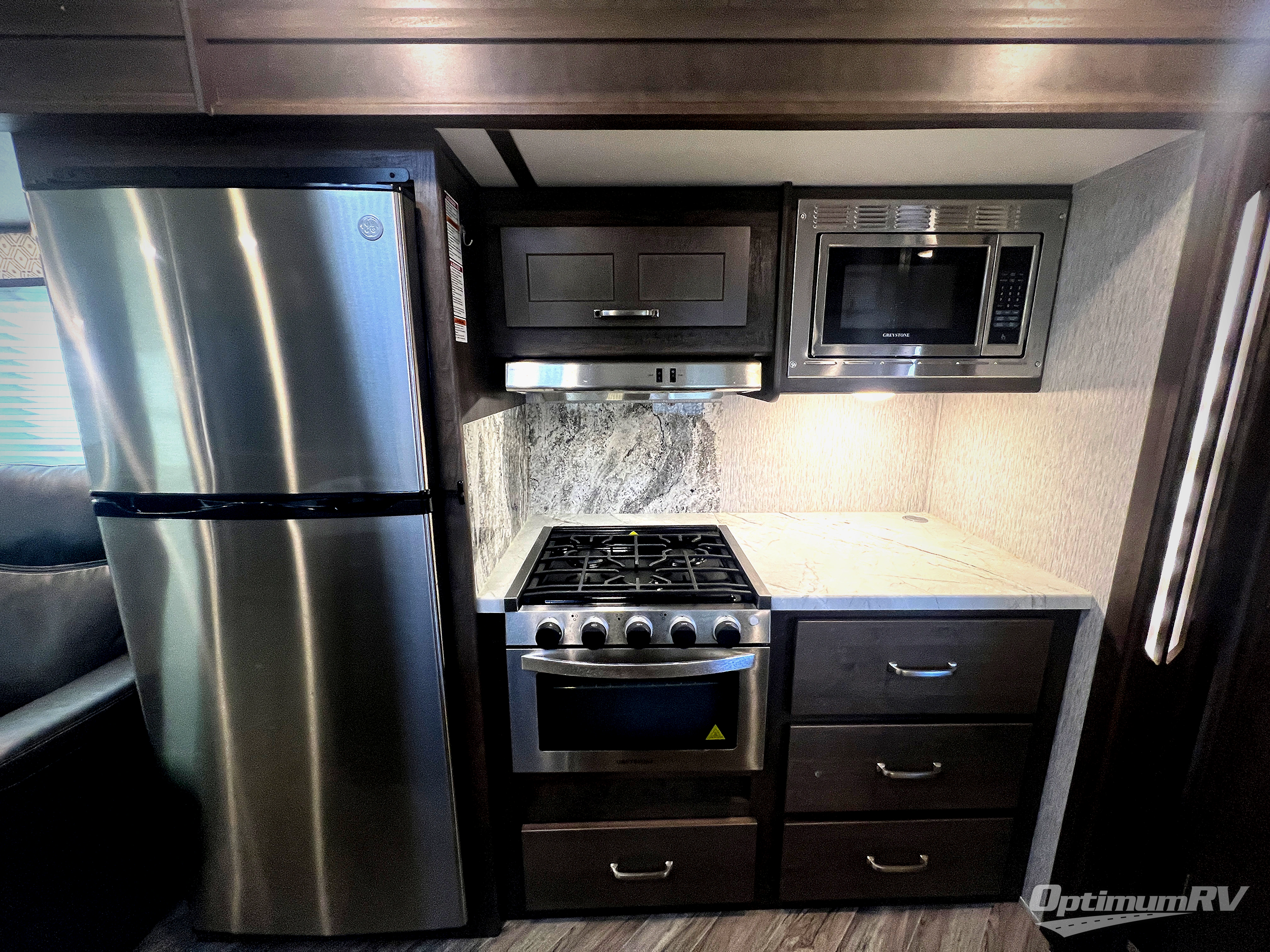 A fun time will be had by all in this Astoria travel trailer! You will be able to whip up dinner quickly and effortlessly with the three-burner range and 17" oven, and dishes will be easy to do in the large sink with a high-rise sprayer faucet at the island. Plus, your family can even sit down on the theater seating or tri-fold sofa to chat with you while you prep. You could also take your skills outside to the outdoor kitchen while you spend some time underneath the 12' power awning with LED lights.