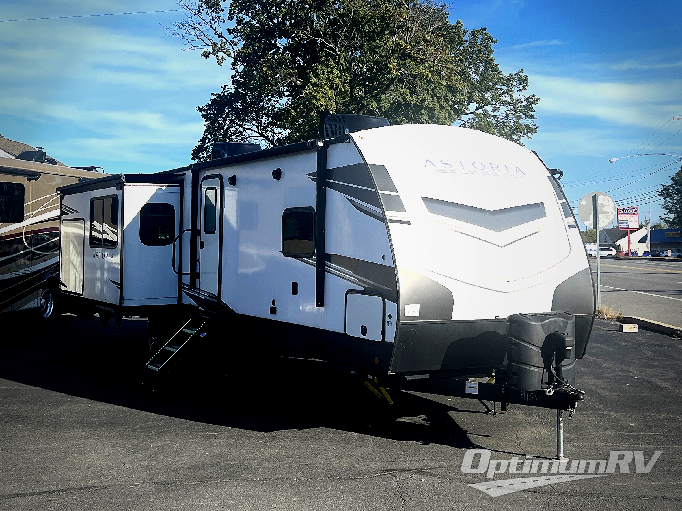 With any Astoria travel trailer, you'll get the Dutchmen construction advantage with features such as HyperDeck floor construction which includes linoleum flooring, vacuum bonded lamination, and a fully enclosed underbelly, plus a fiberglass cap with windshield. Some standard features that will impress you include an exterior spray port to keep the sand outside, arched interior ceiling for more standing space, dual 20 lb. propane tanks, dark-tinted safety glass windows, and stainless steel appliances so you can keep your bellies full with home cooked meals. Plus, an Astoria Premium package for even more convenience and comforts. Choose your favorite today!