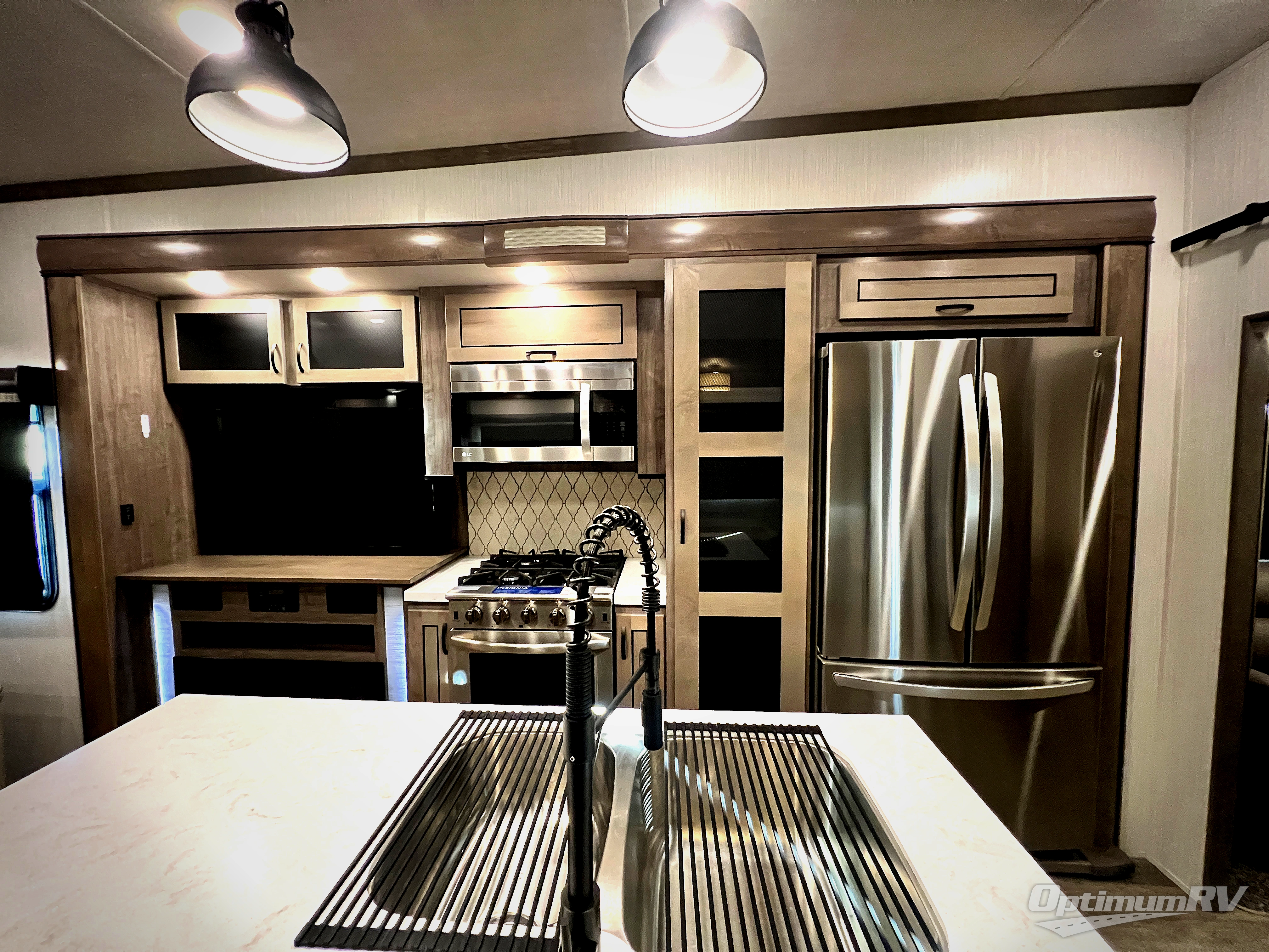 With two bedrooms, everyone will enjoy a good night's rest in this Cedar Creek fifth wheel! The front private bedroom has a king bed across from a dresser with a 32" TV and a full-width wardrobe with storage shelves and an area prepped to add the optional washer and dryer. The second bedroom has hide-a-bed sofa across from a wardrobe with a 91" x 64 1/4" loft above it all for extra sleeping and storage space. Everyone can freshen up each morning in the full bathroom that has a shower with a seat and a linen closet to store your towels. You can whip up a delicious home-cooked meal indoors with the kitchen island, or if you wish to add the optional exterior pull-out kitchen, then you can breathe in some fresh air while you grill!