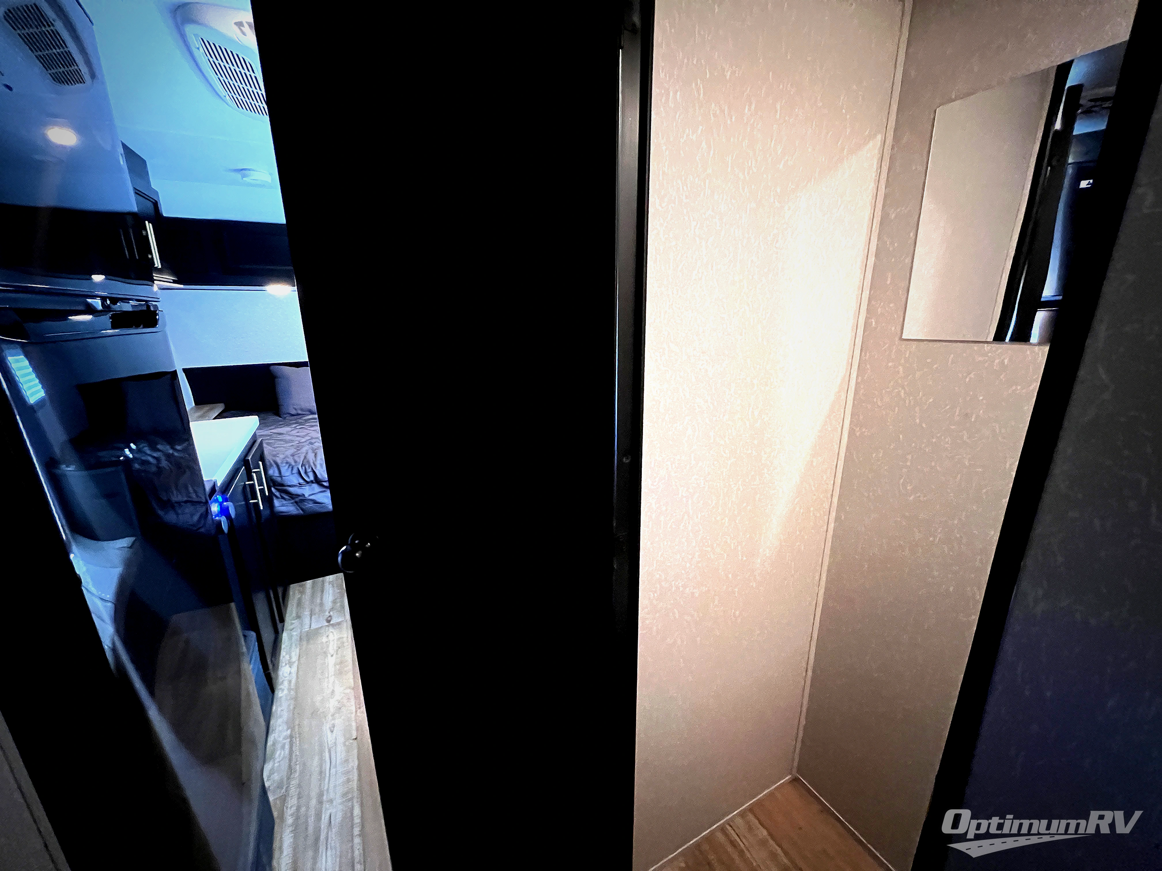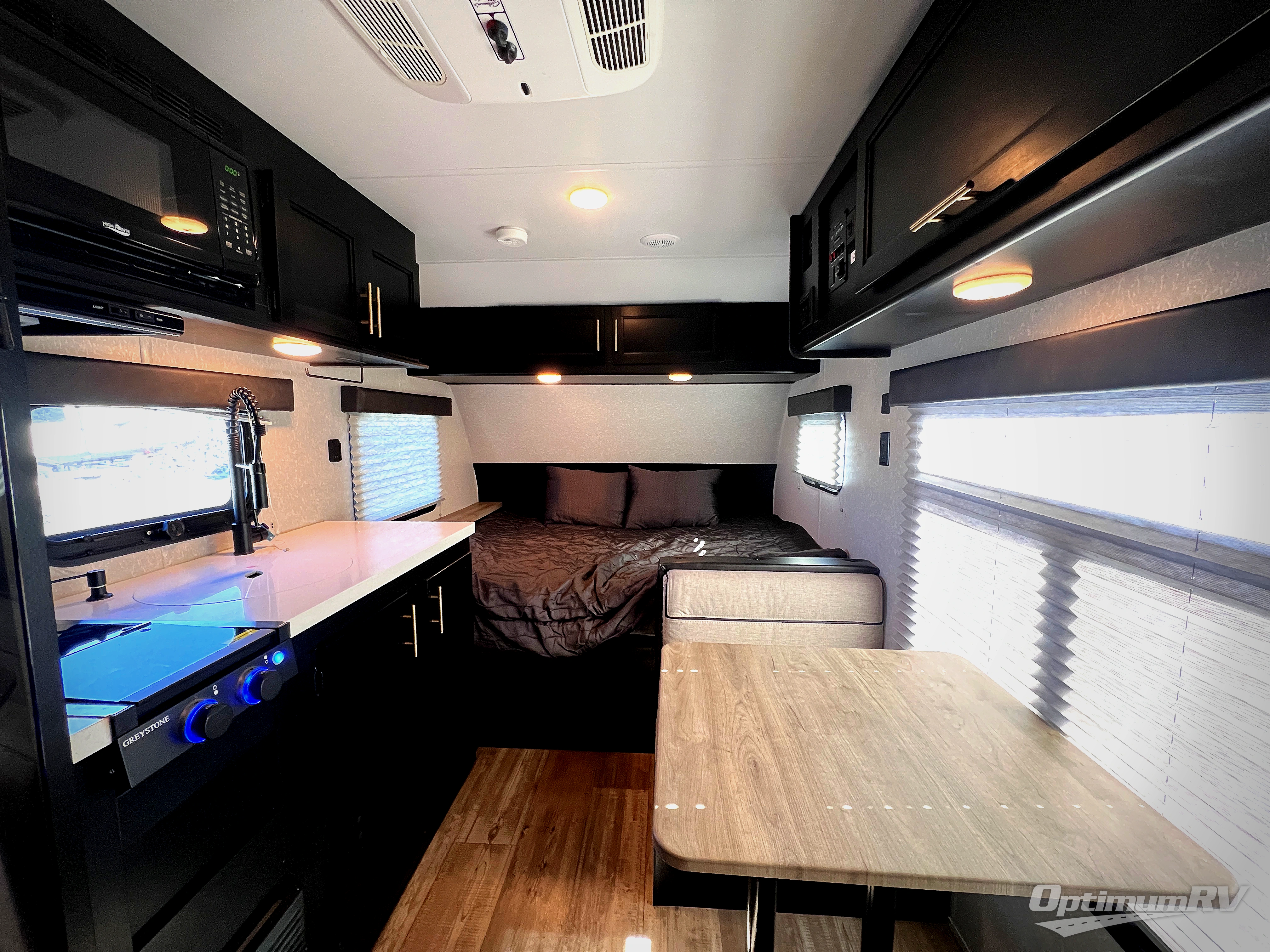 The unique rear entry on this Cherokee Wolf Pup Black Label travel trailer allows you to set up at the campsite with a view as you walk outside each morning. You can relax under the power awning before going fishing or taking a walk around the lake. When you get hungry, the cooktop and microwave allow you to make hot meals, and you can store your drinks in the 11-cu. ft. refrigerator. Have a seat at the dinette for meals or playing games, and offer an overnight guest a place to sleep. The queen bed up front allows you to sleep on your own bedding each night with overhead cabinets for your clothing and a shelf to set your cell phone and keys on, and the split bath offers a private toilet room and a private shower on the opposite side so that two people can get ready at once.