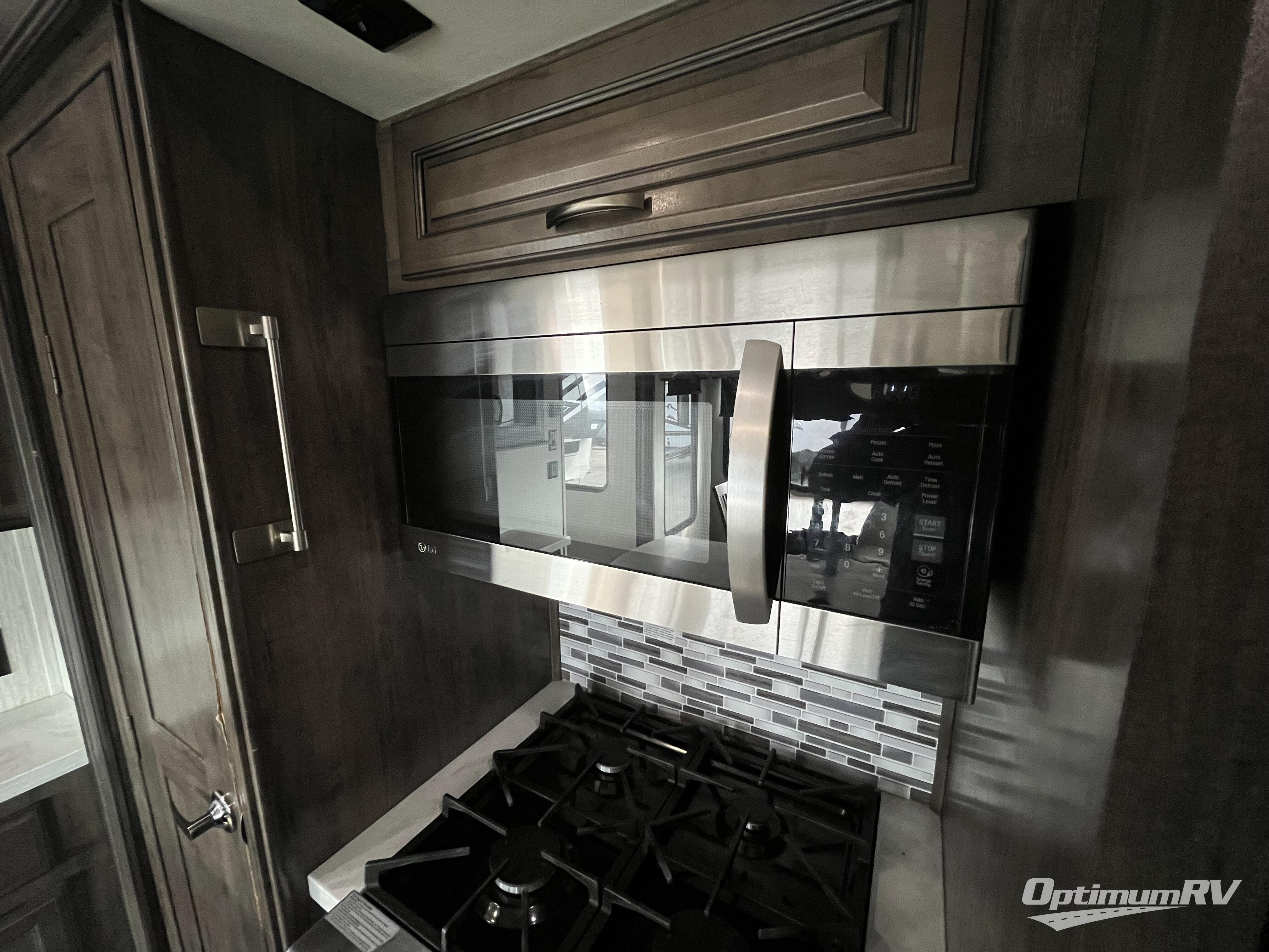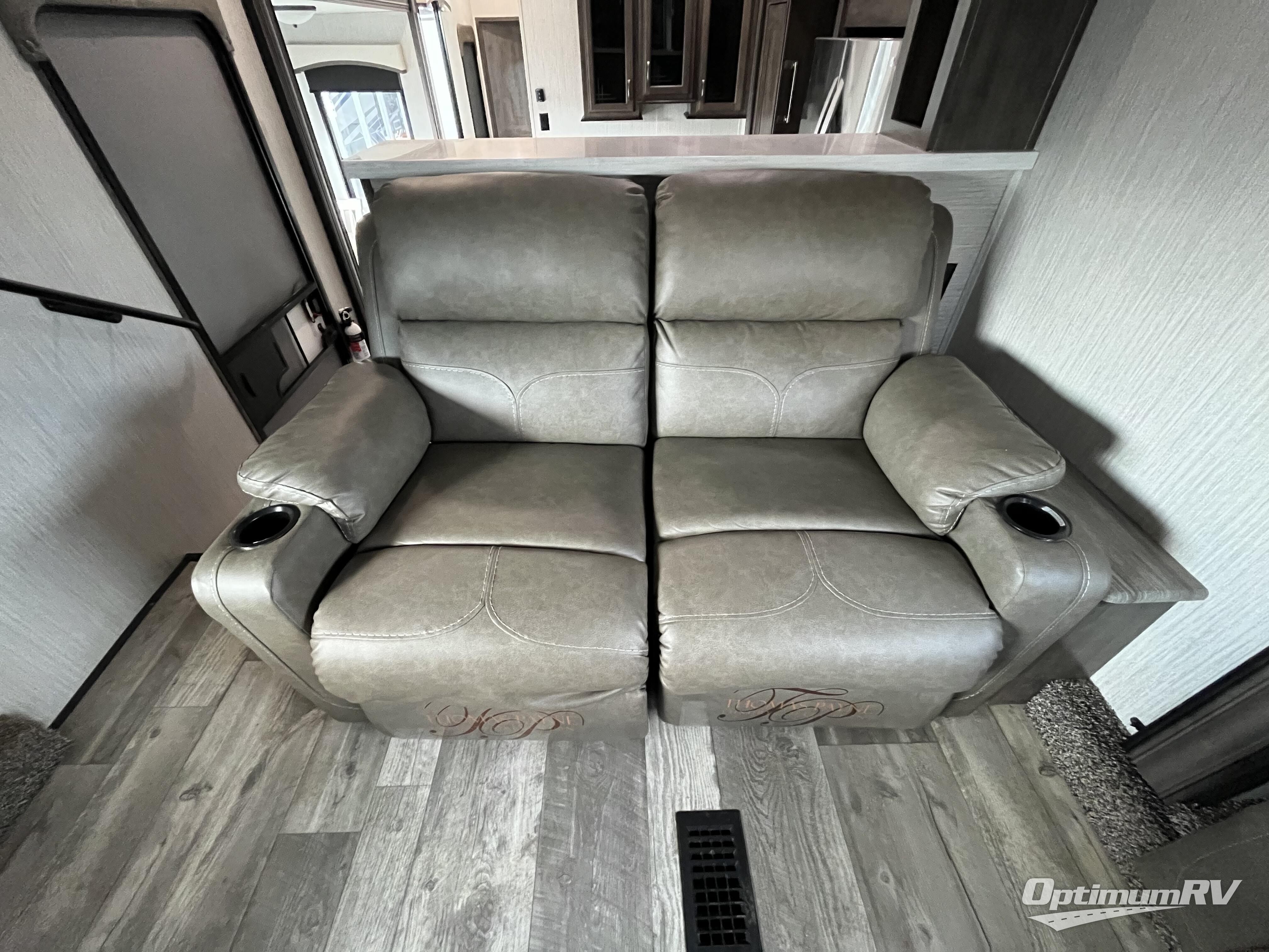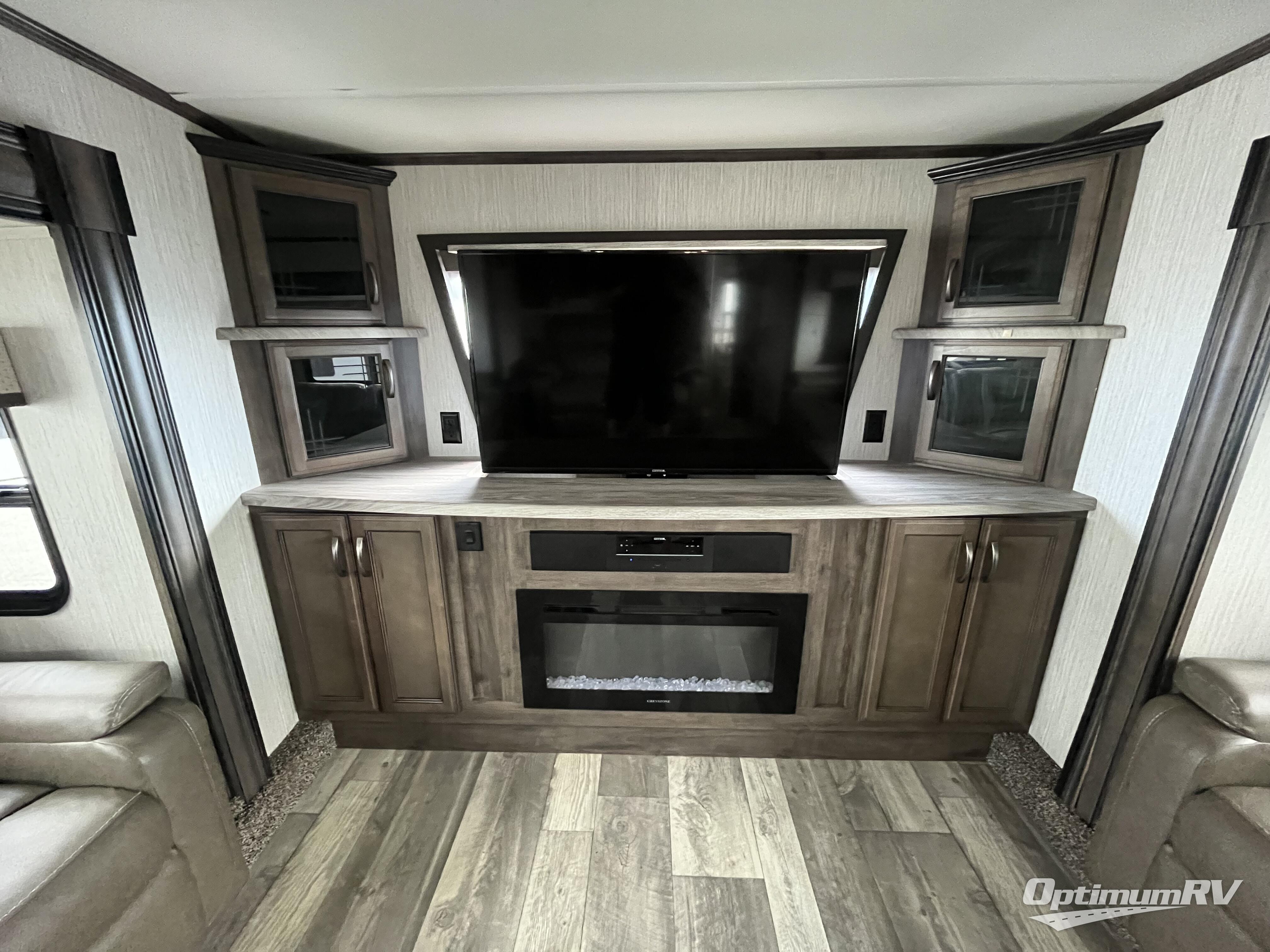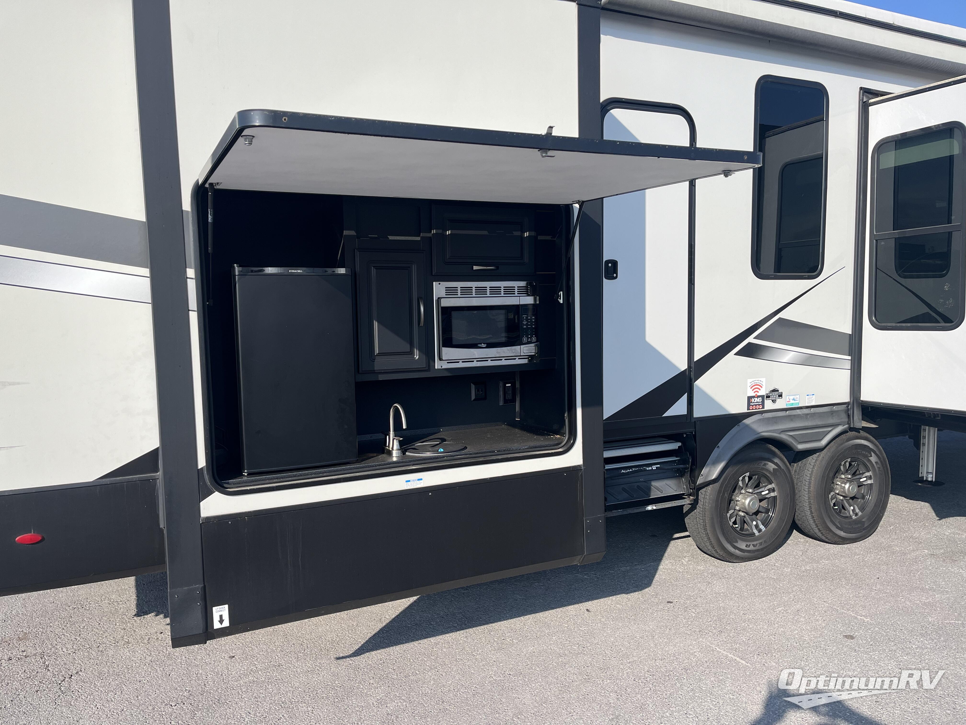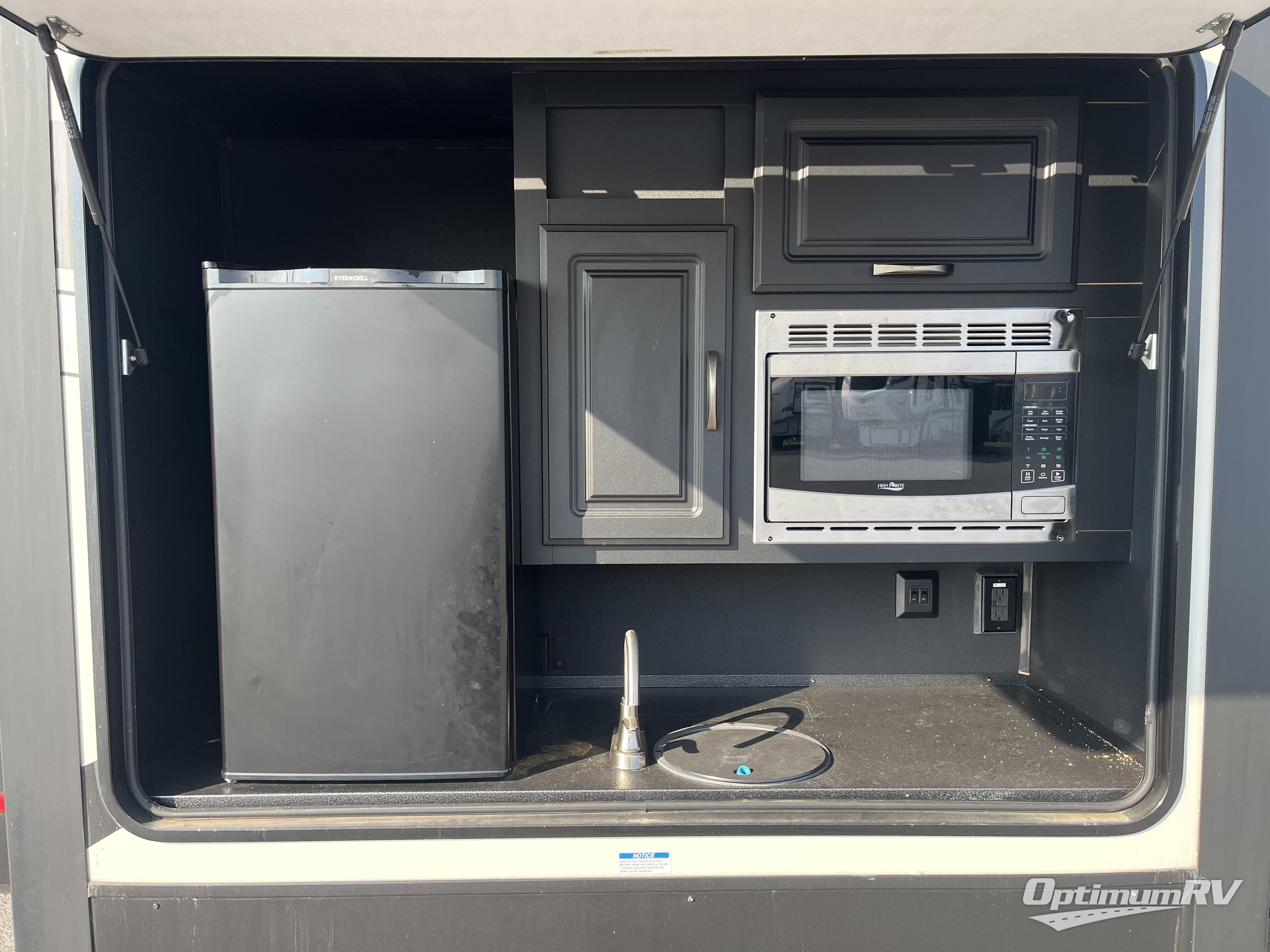 RV living is more fun when you have a spacious interior with six slides throughout from the front separate living area, the middle kitchen and the rear bedroom all offering dual opposing slides to open up each area to relax, cook and unwind. You can entertain everyone by providing food and drinks set out on the kitchen island or hutch, play games at the free standing dinette. Plan to watch the big game on the 50" pop-up LED HDTV with fireplace below or enjoy the view out of the front window in the living area with dual tri-fold hide-a-bed sofas and theater seats. Sleep like a king on your own pillowtop mattress and allow guests to sleep on the sofas. You will also have the exterior kitchen to help feed everyone, a 20' electric awning to hang out underneath, and dual entry doors to keep the flow of traffic moving.