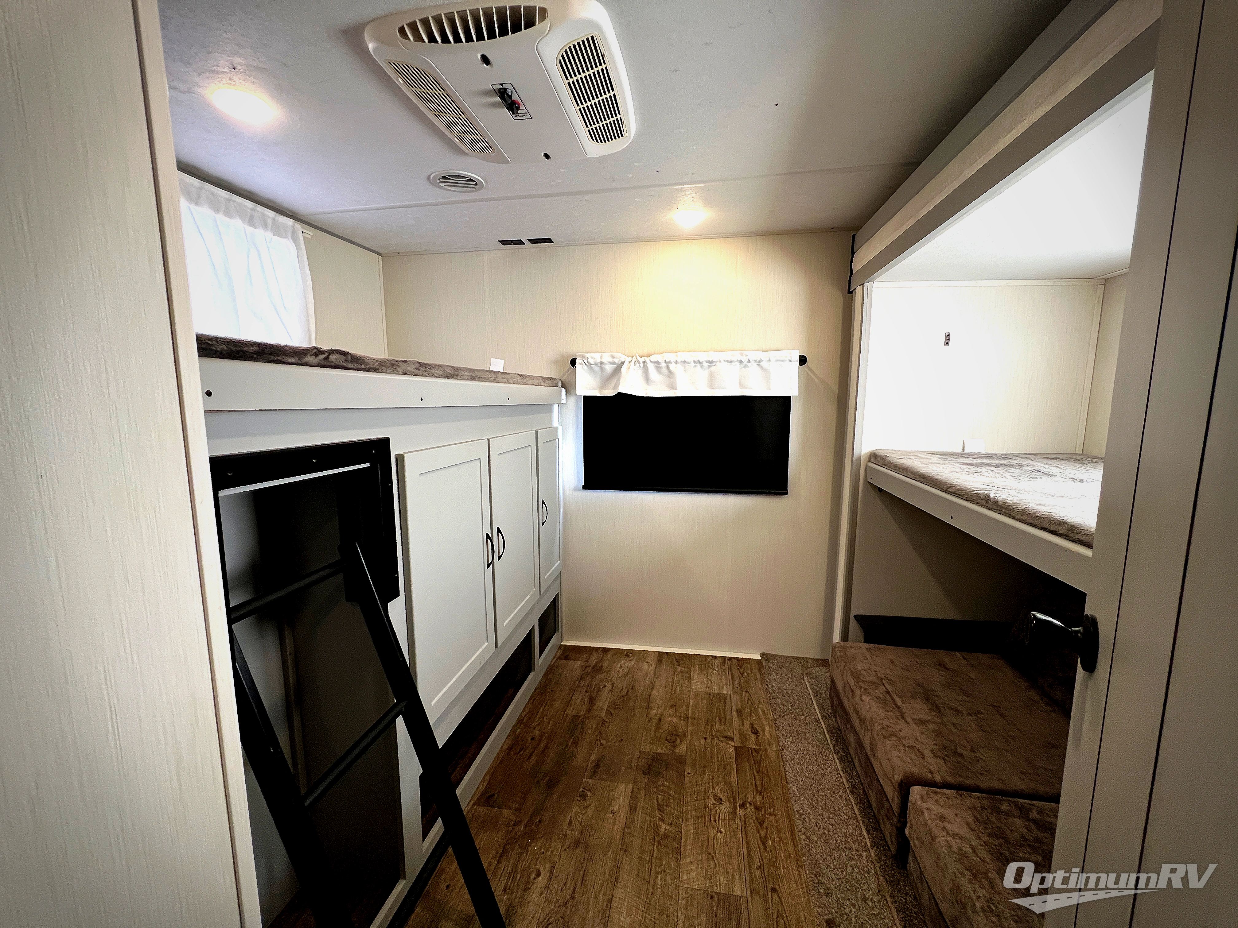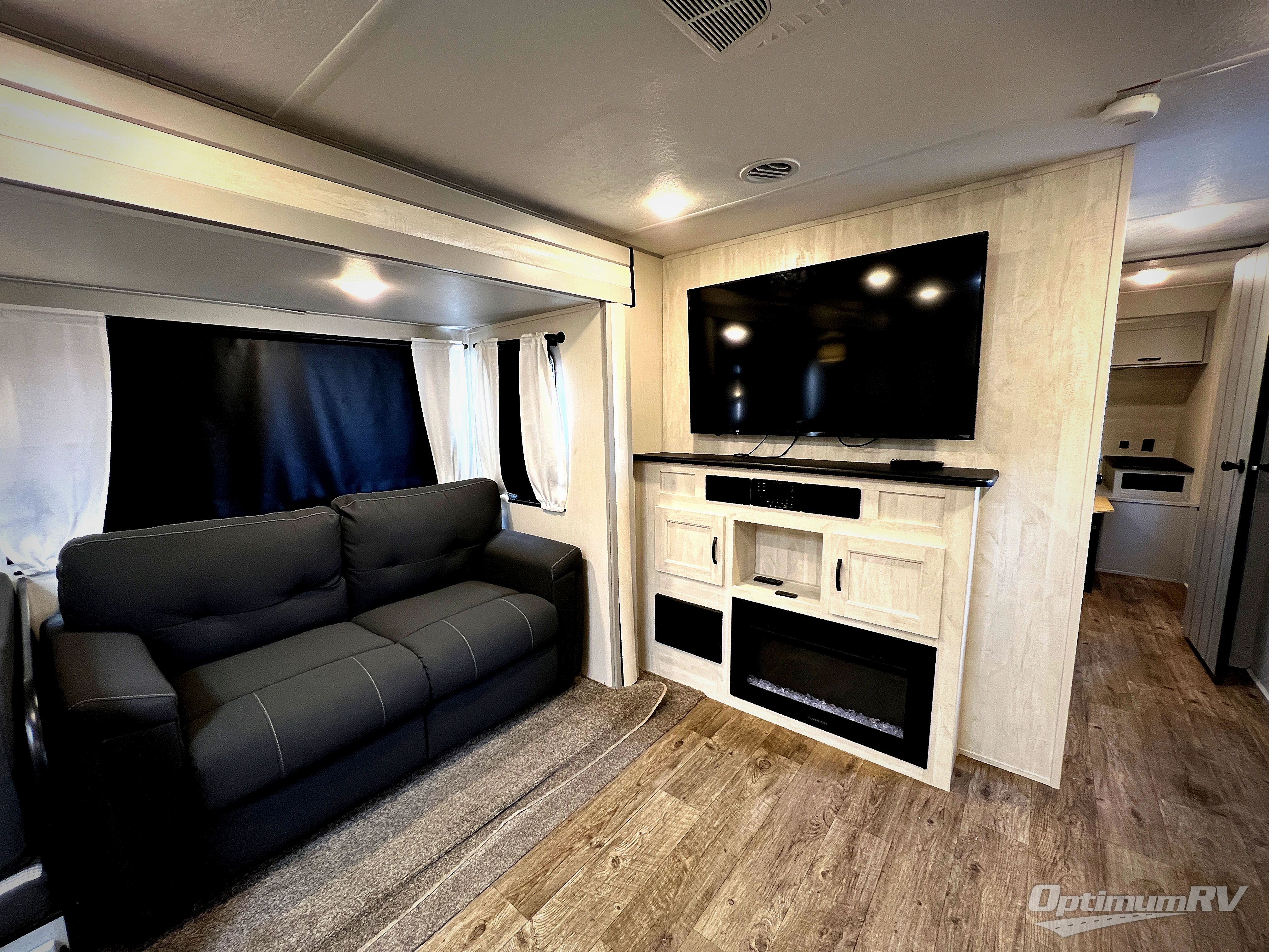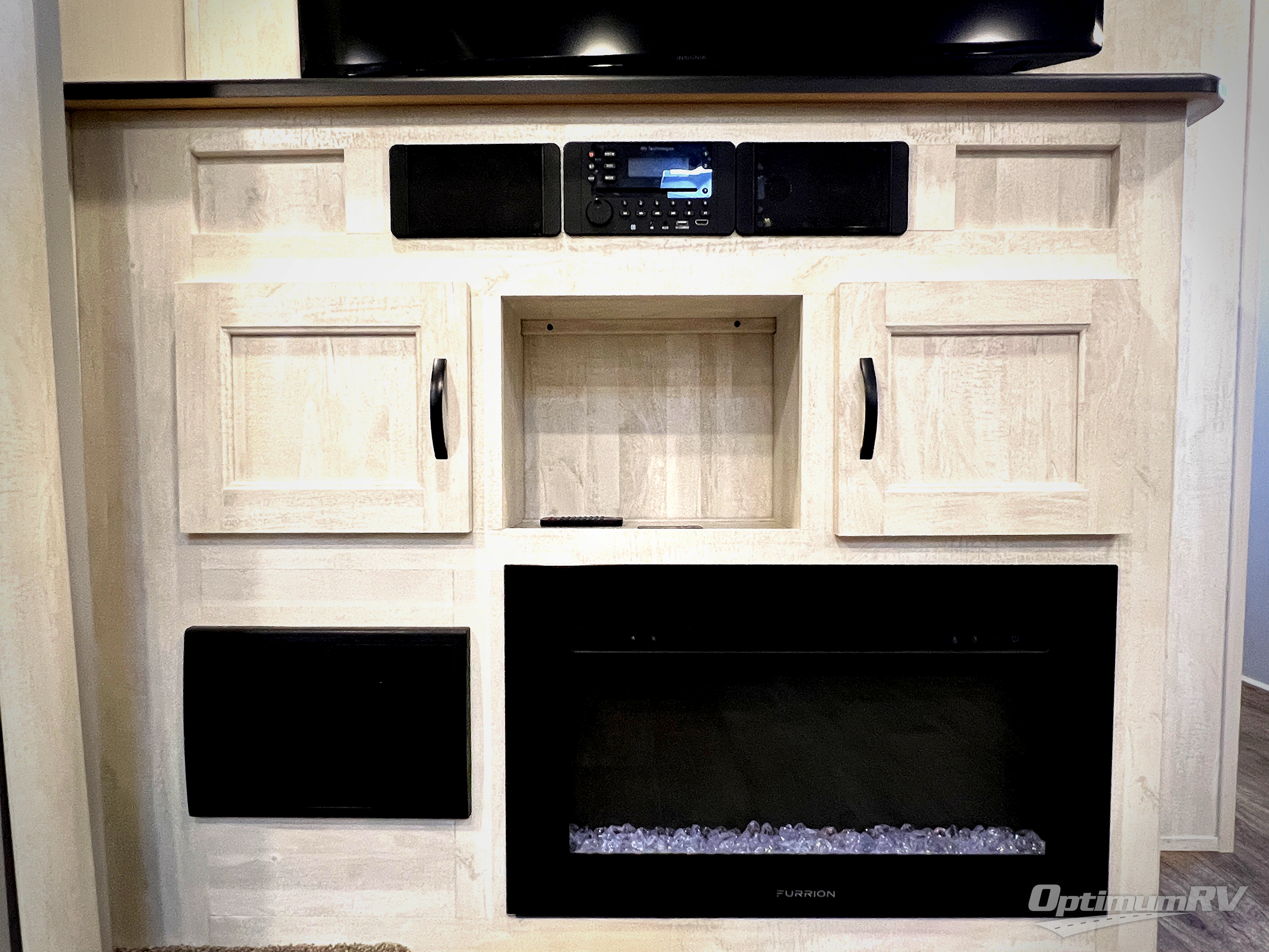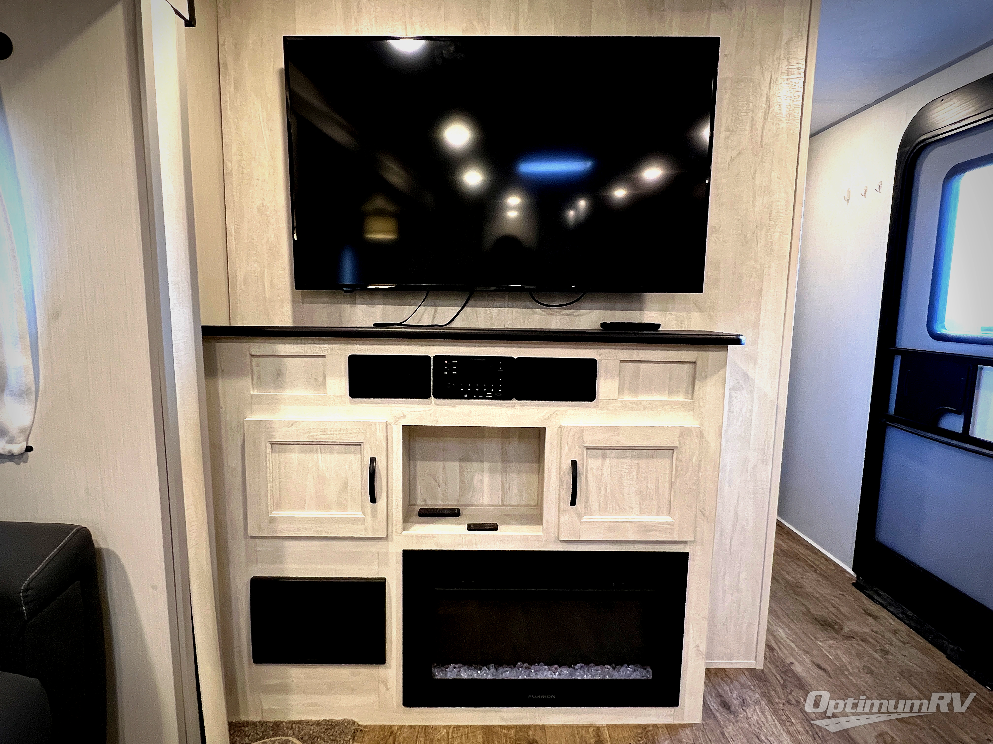 Whether you enjoy spending time outdoors or indoors, there is something for everyone in this travel trailer. The large pass-through storage can store your fishing poles, and the 20' electric awning with LED lights will create an outdoor living space. There is even an exterior baggage door with two exterior refrigerators, a TV, a spray port, and storage for snacks! You will love all the interior space thanks to the dual opposing slides in the main living area, which will give the chef space to work around the kitchen island. Your crew can visit on the two tri-fold sofas and booth dinette while the fireplace is going, but you'll probably find the kids spending most of their time in the private bunkhouse! They will have two bunks, Vibe cubes, a slide out for more space, plus a wardrobe to store all their clothes. What more could you want in a travel trailer?!