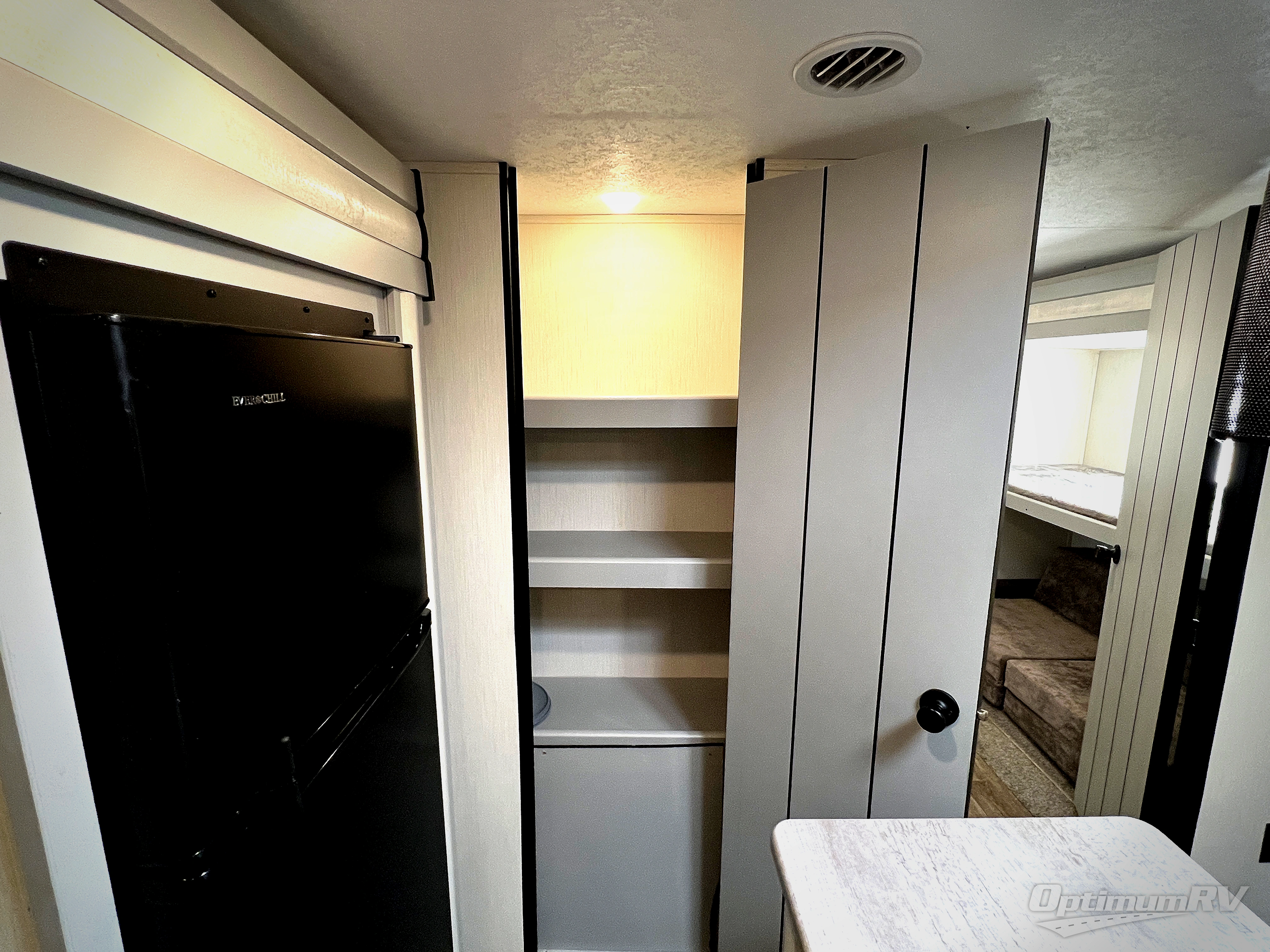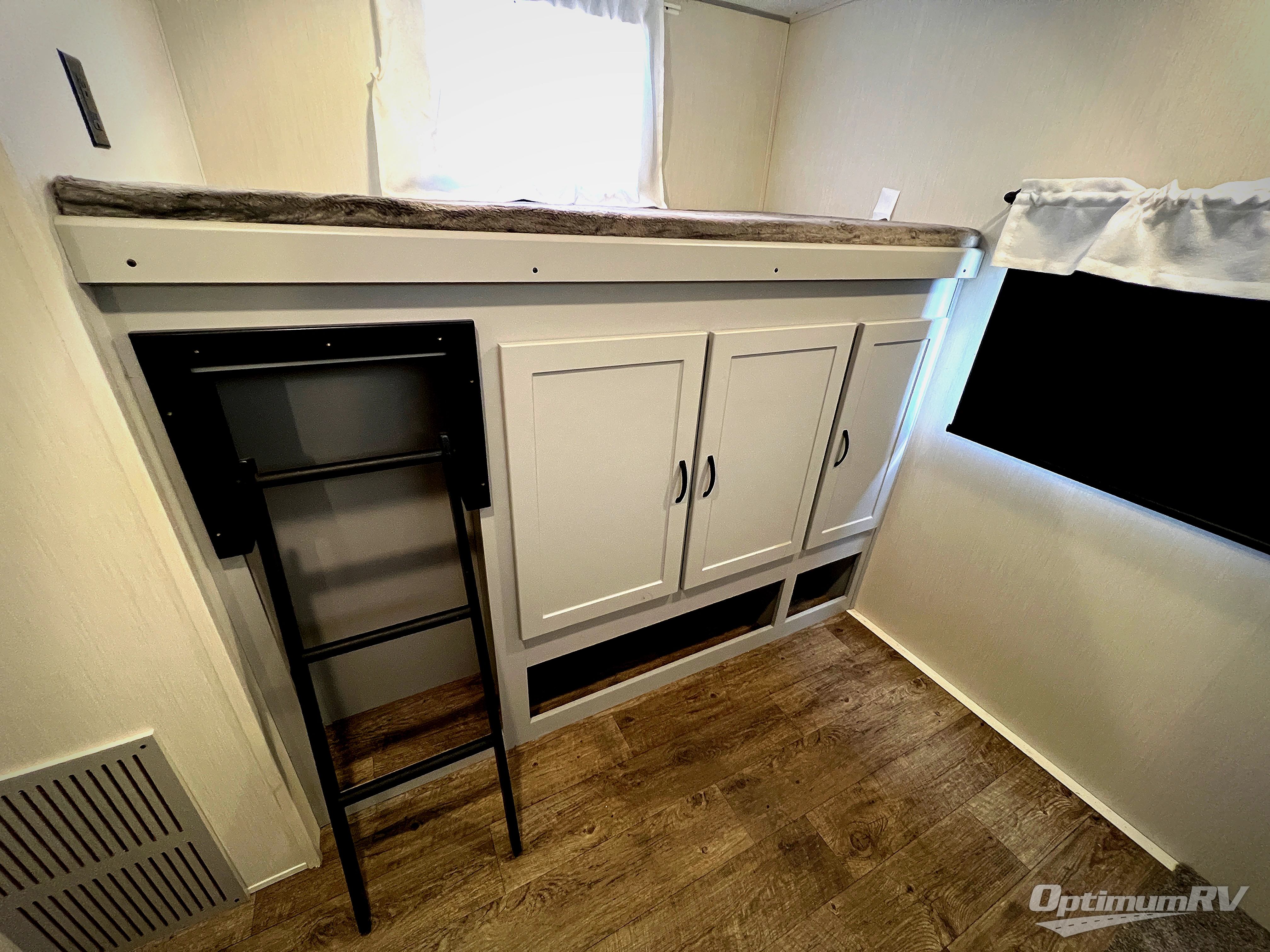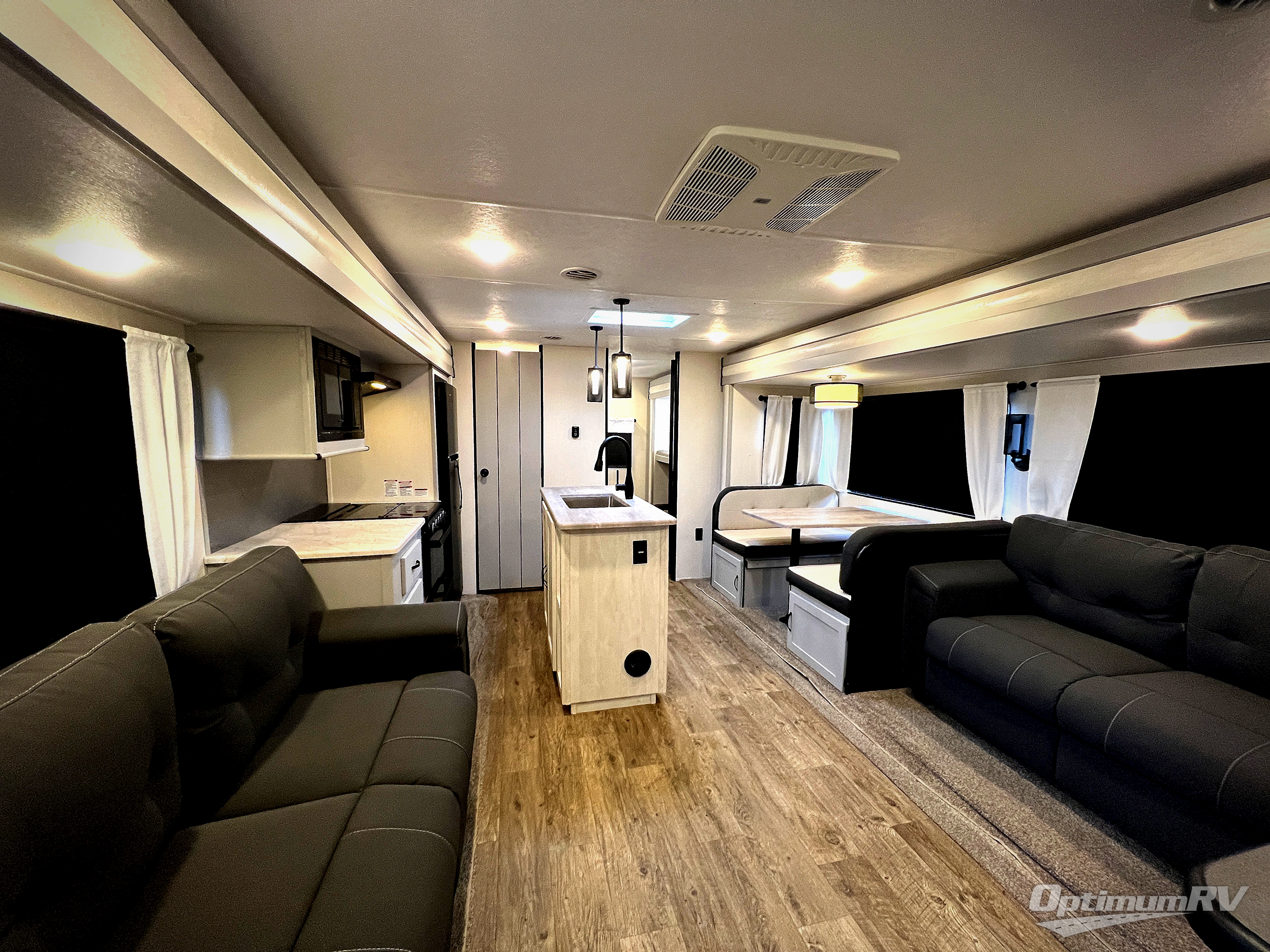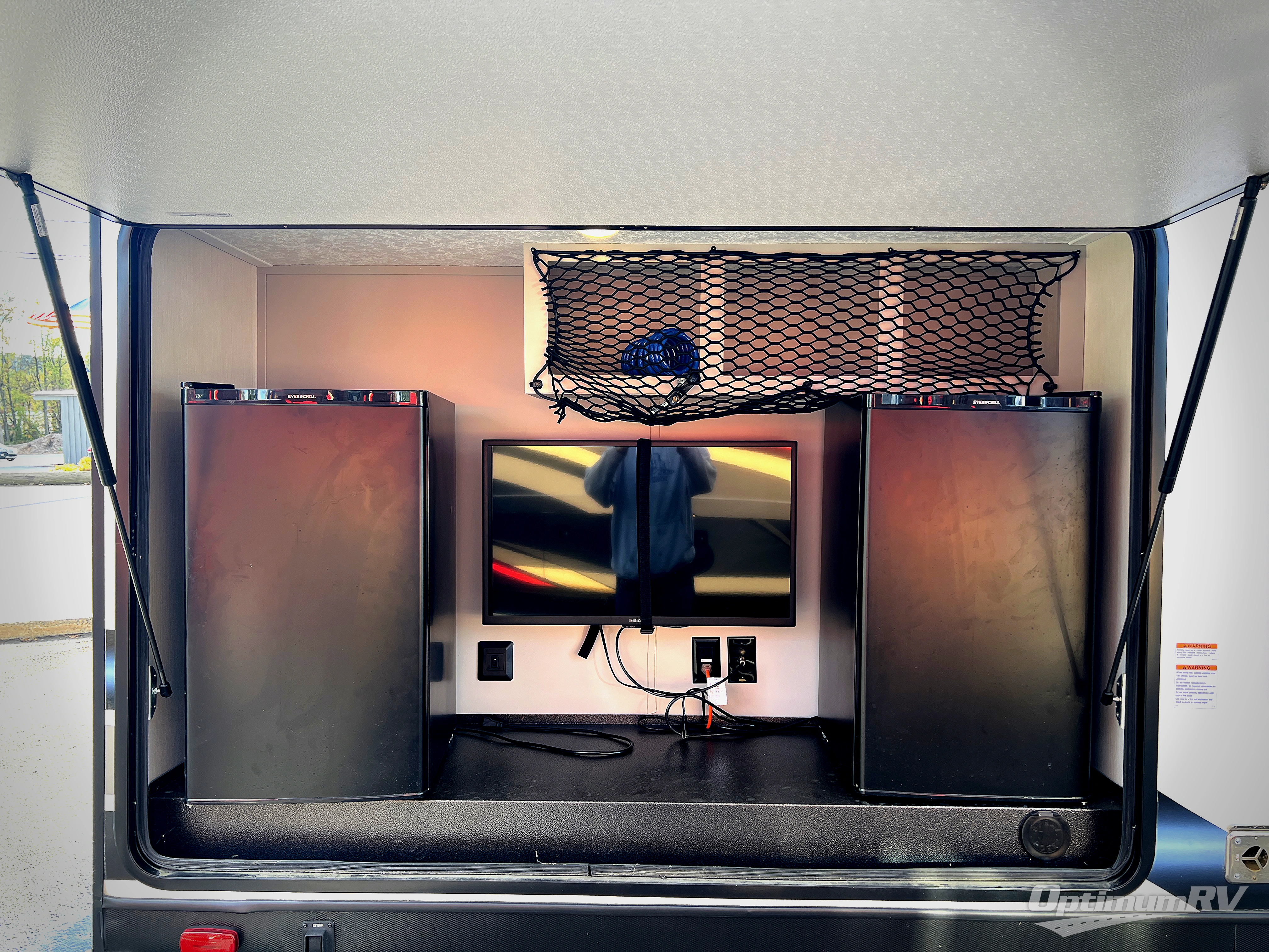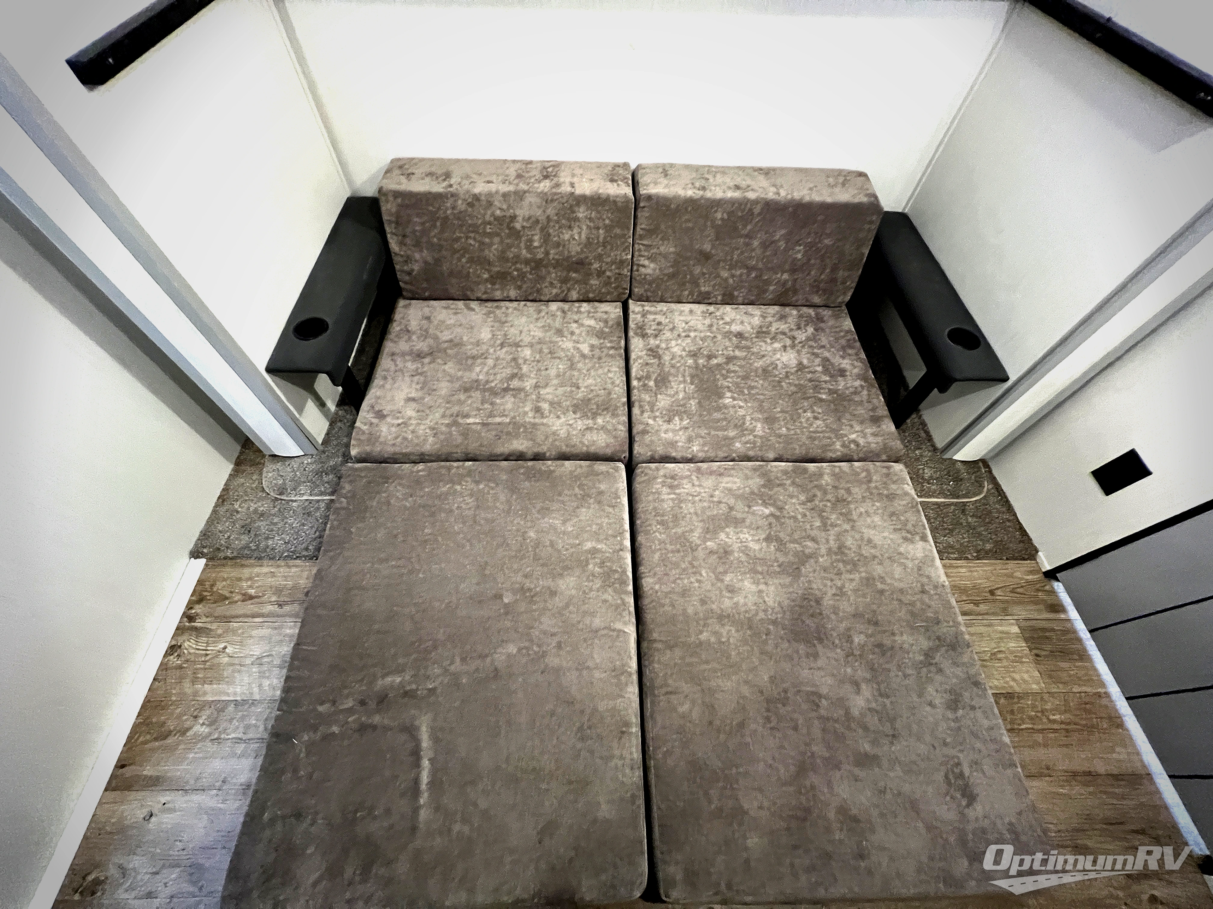 Whether you enjoy spending time outdoors or indoors, there is something for everyone in this travel trailer. The large pass-through storage can store your fishing poles, and the 20' electric awning with LED lights will create an outdoor living space. There is even an exterior baggage door with two exterior refrigerators, a TV, a spray port, and storage for snacks! You will love all the interior space thanks to the dual opposing slides in the main living area, which will give the chef space to work around the kitchen island. Your crew can visit on the two tri-fold sofas and booth dinette while the fireplace is going, but you'll probably find the kids spending most of their time in the private bunkhouse! They will have two bunks, Vibe cubes, a slide out for more space, plus a wardrobe to store all their clothes. What more could you want in a travel trailer?!