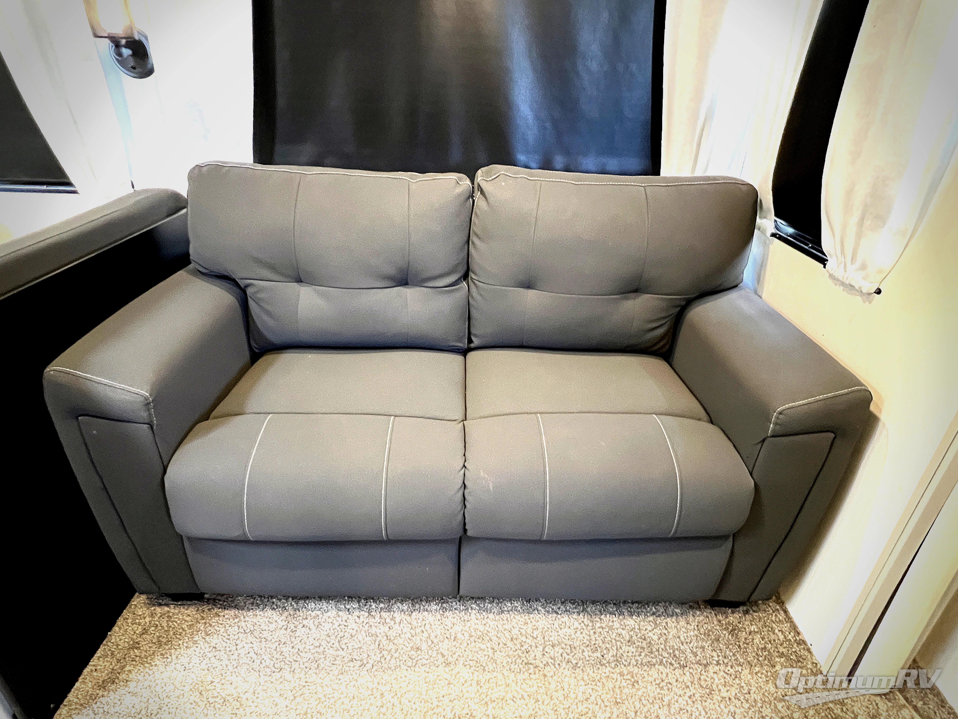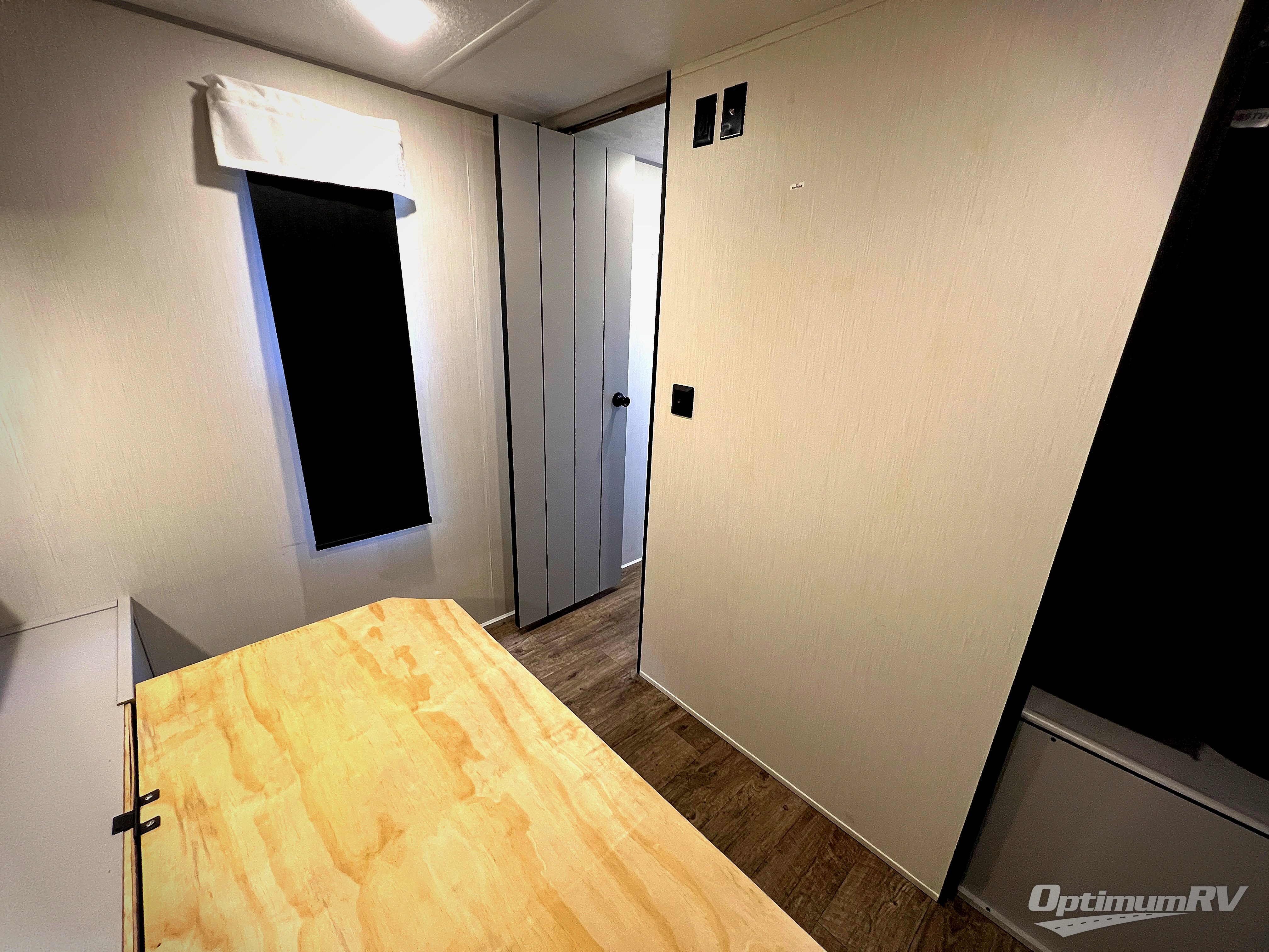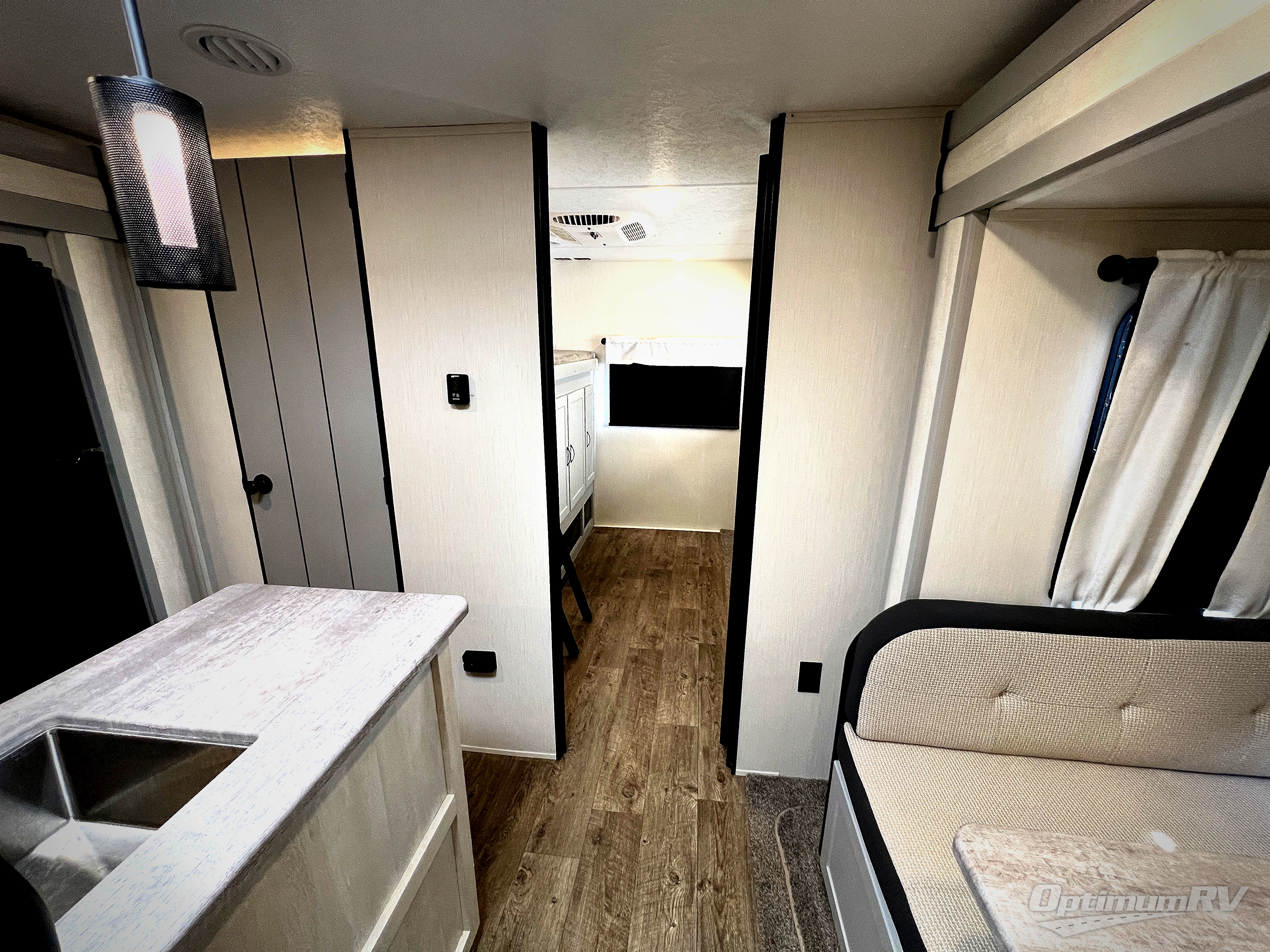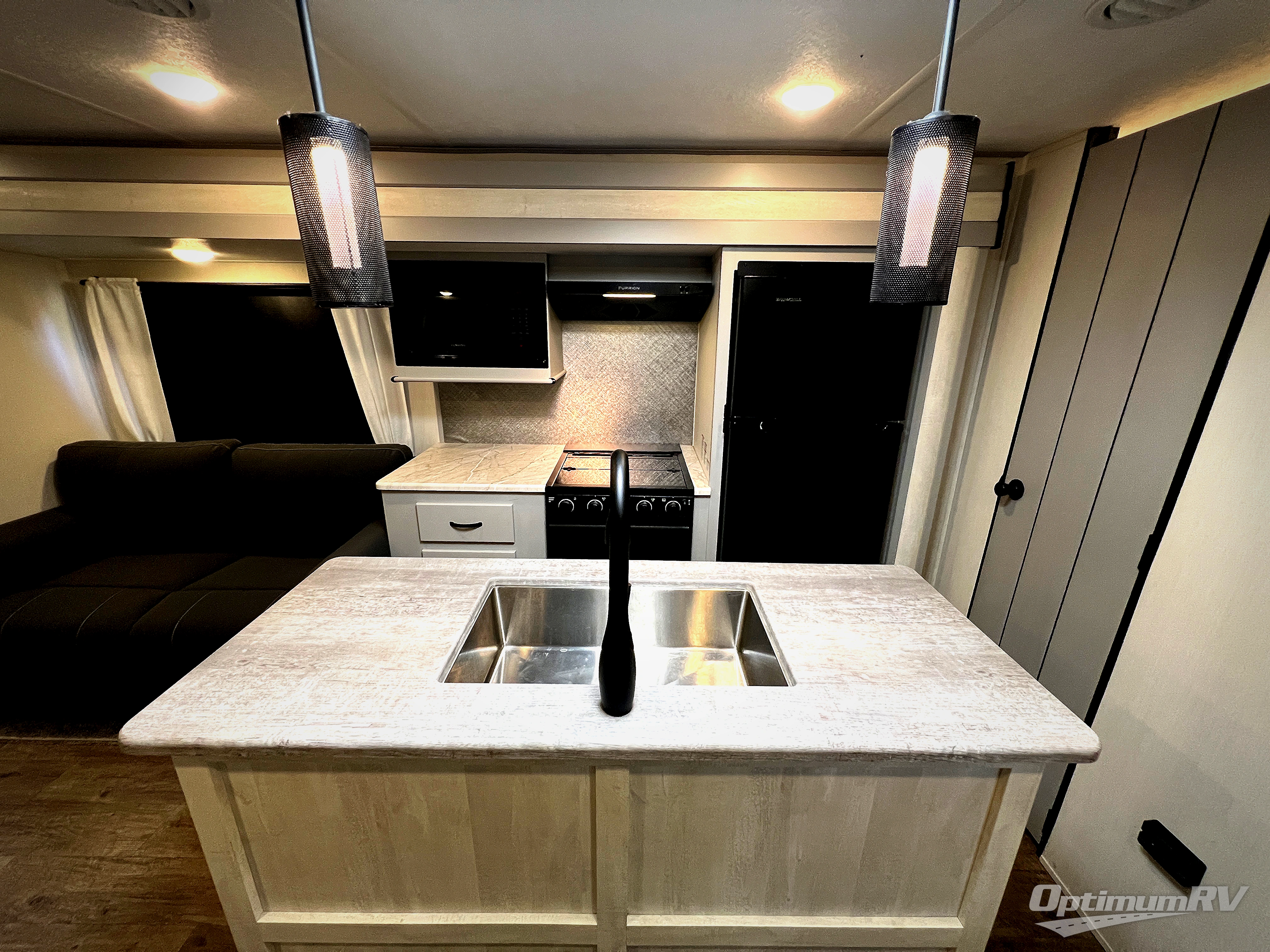Whether you enjoy spending time outdoors or indoors, there is something for everyone in this travel trailer. The large pass-through storage can store your fishing poles, and the 20' electric awning with LED lights will create an outdoor living space. There is even an exterior baggage door with two exterior refrigerators, a TV, a spray port, and storage for snacks! You will love all the interior space thanks to the dual opposing slides in the main living area, which will give the chef space to work around the kitchen island. Your crew can visit on the two tri-fold sofas and booth dinette while the fireplace is going, but you'll probably find the kids spending most of their time in the private bunkhouse! They will have two bunks, Vibe cubes, a slide out for more space, plus a wardrobe to store all their clothes. What more could you want in a travel trailer?!