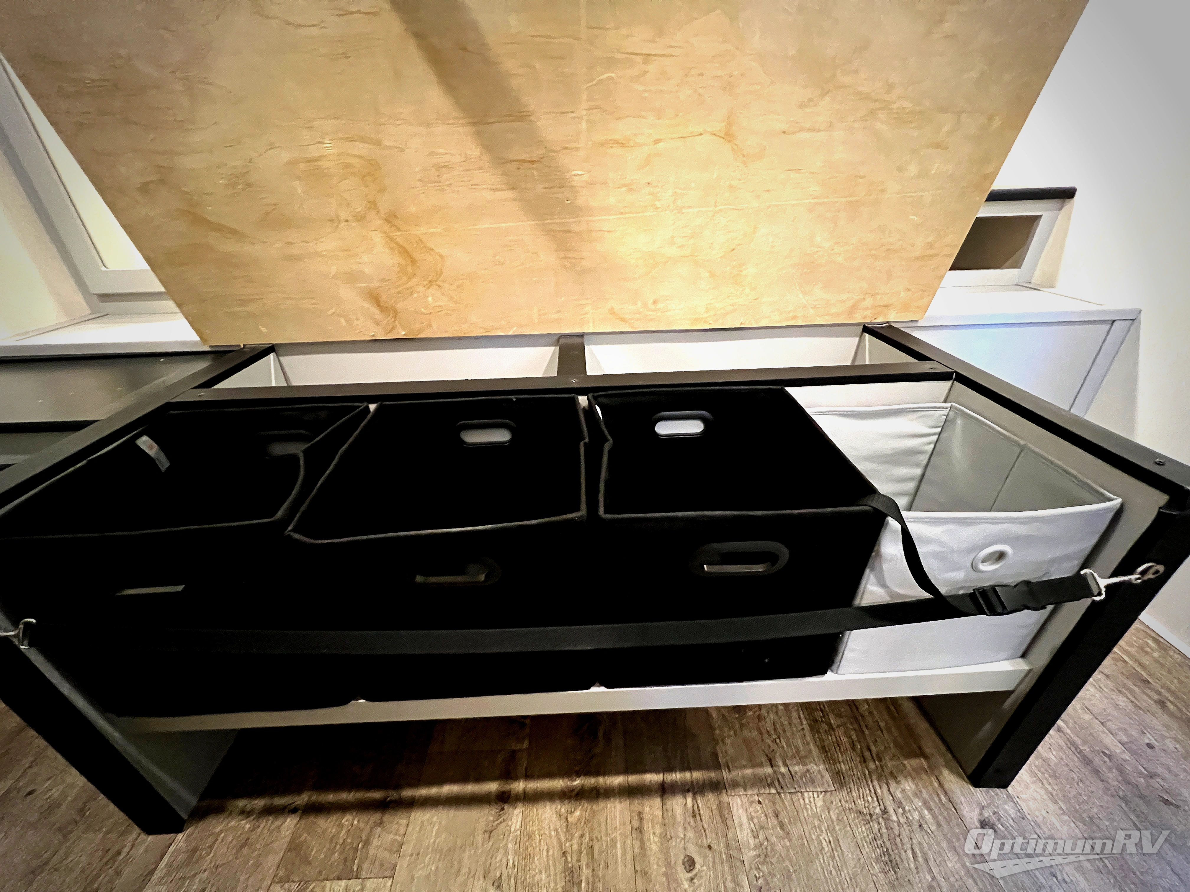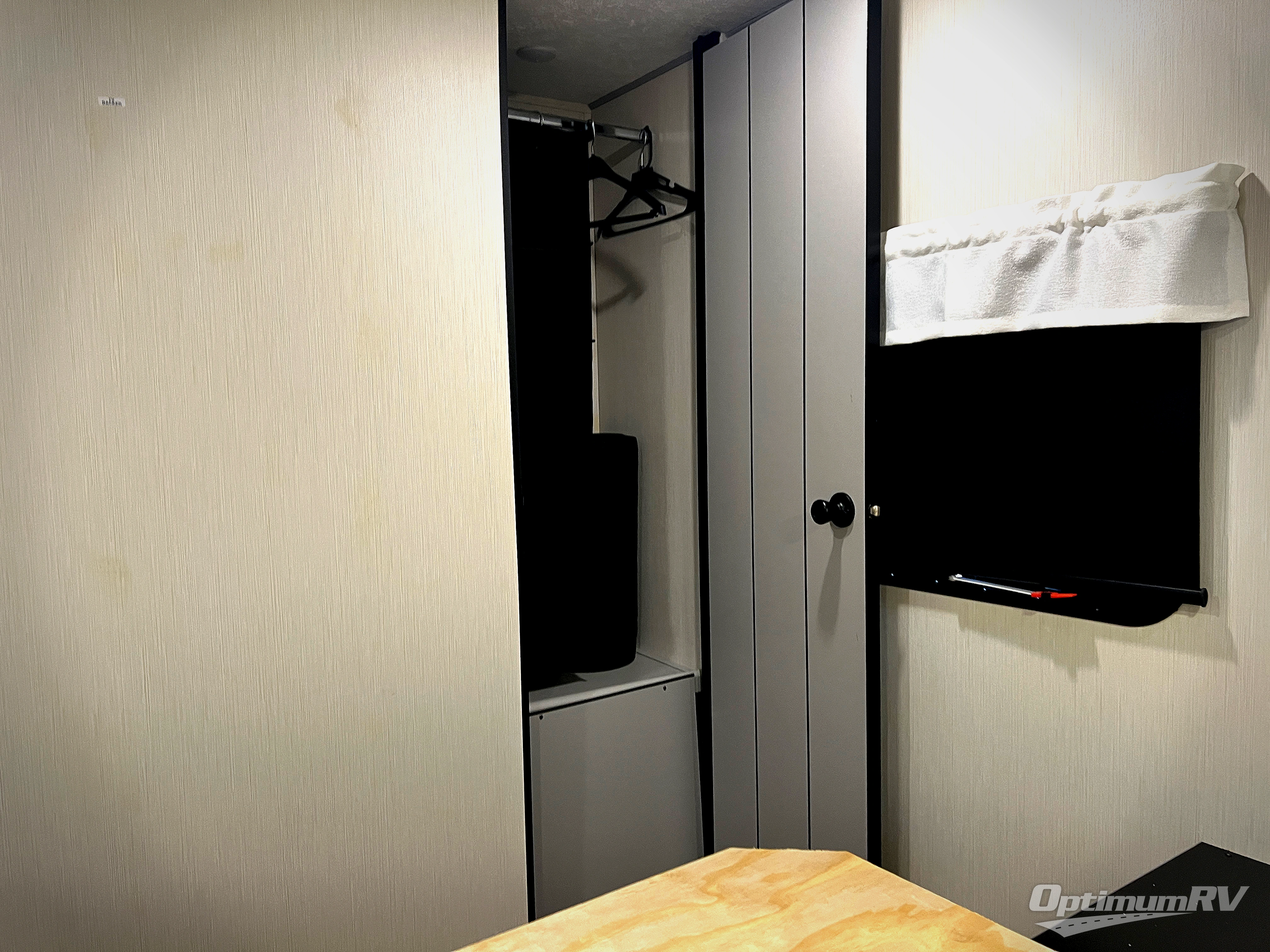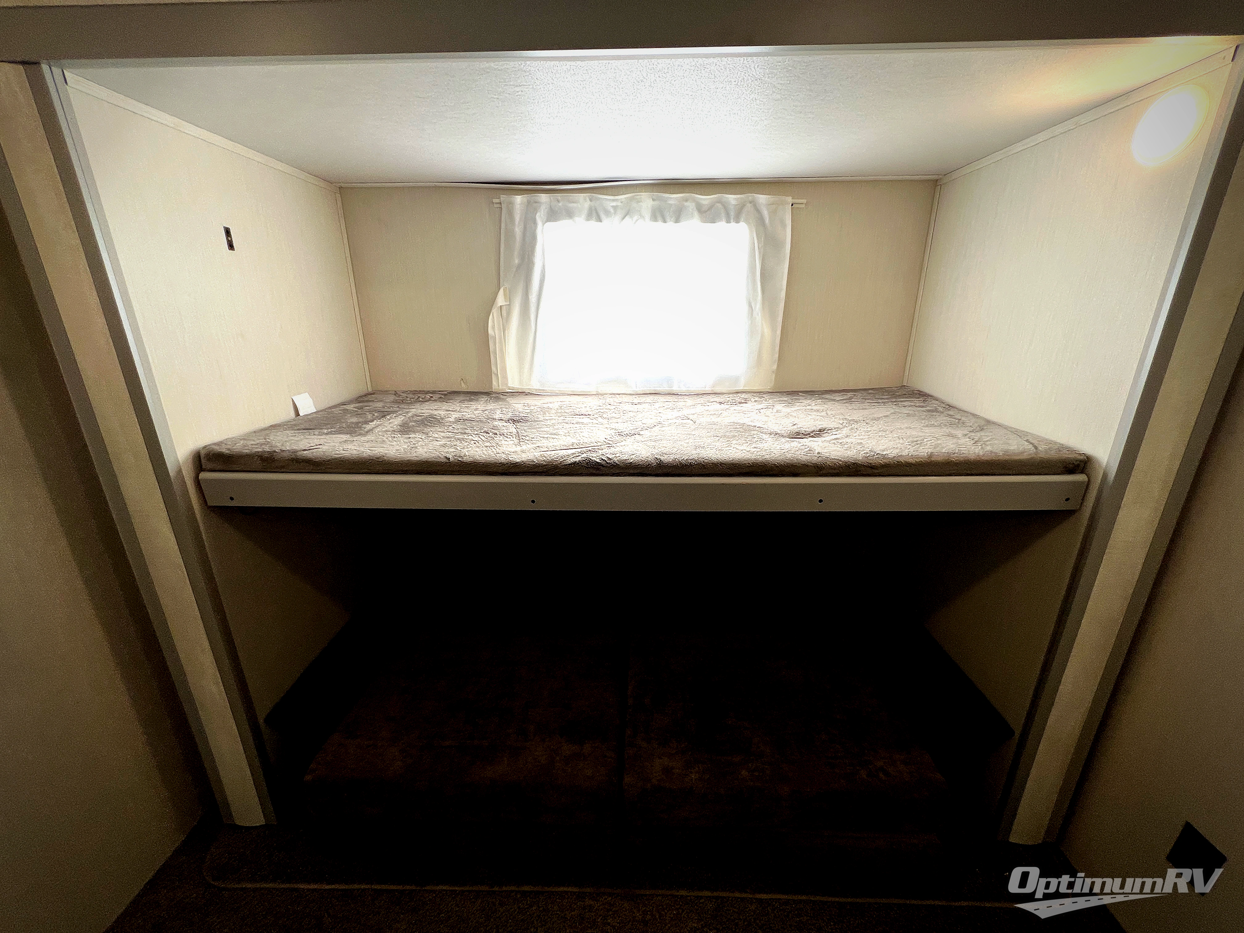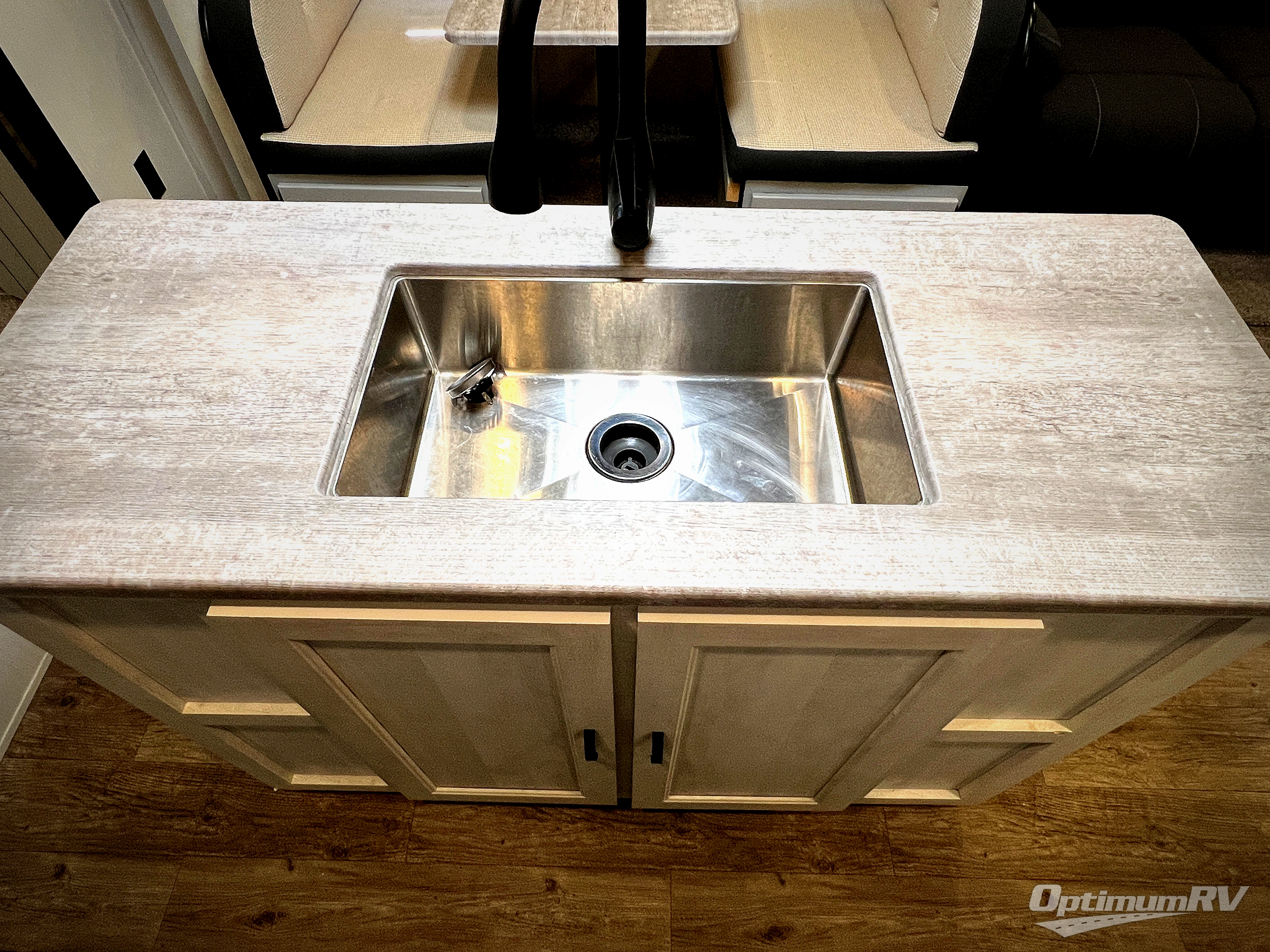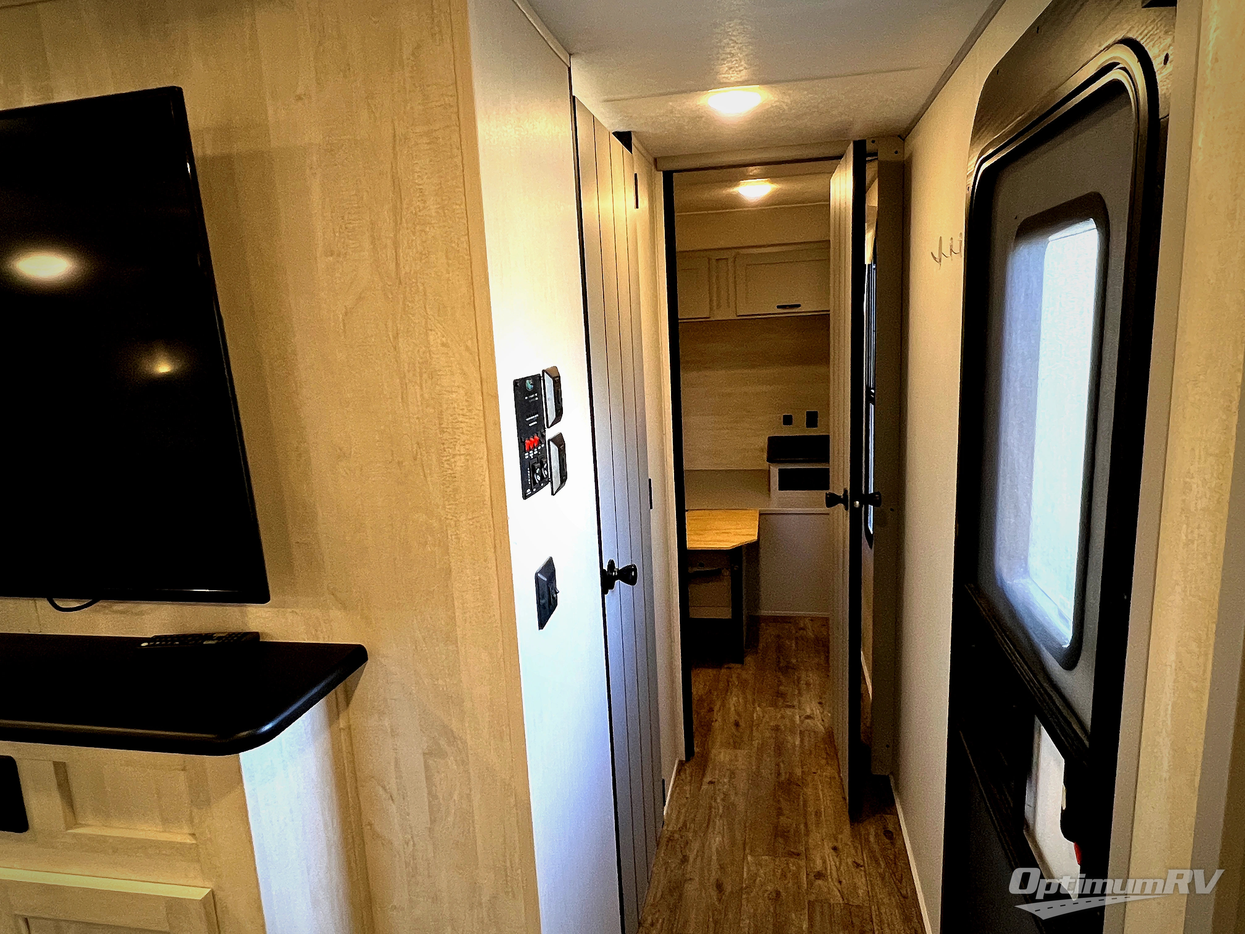 Whether you enjoy spending time outdoors or indoors, there is something for everyone in this travel trailer. The large pass-through storage can store your fishing poles, and the 20' electric awning with LED lights will create an outdoor living space. There is even an exterior baggage door with two exterior refrigerators, a TV, a spray port, and storage for snacks! You will love all the interior space thanks to the dual opposing slides in the main living area, which will give the chef space to work around the kitchen island. Your crew can visit on the two tri-fold sofas and booth dinette while the fireplace is going, but you'll probably find the kids spending most of their time in the private bunkhouse! They will have two bunks, Vibe cubes, a slide out for more space, plus a wardrobe to store all their clothes. What more could you want in a travel trailer?!