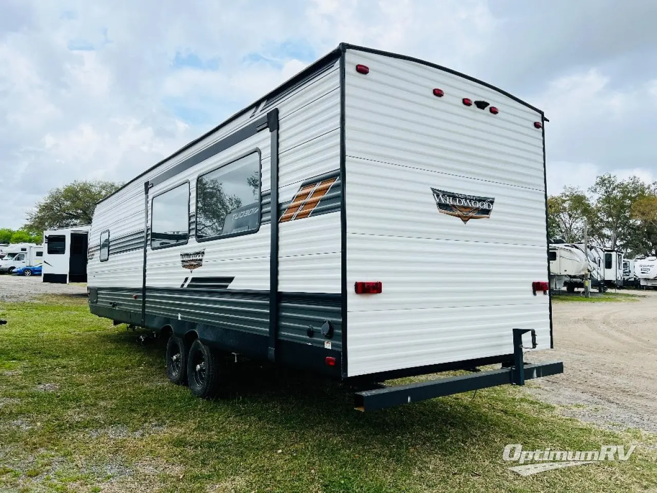 With each Midwest region Wildwood travel trailer by Forest River you will enjoy many interior comforts, like the Herringbone pattern luxury vinyl flooring, the Evergreen mattress, the tub surround, plus much more. There is a fully walkable one piece roof that will make cleaning off the top of your unit a snap, each model is also constructed with a powder coated I-beam frame and a tough coat paint exterior. The power awning with adjustable legs will provide an outdoor living space, and the exterior speakers with a blue LED light will keep the party going!