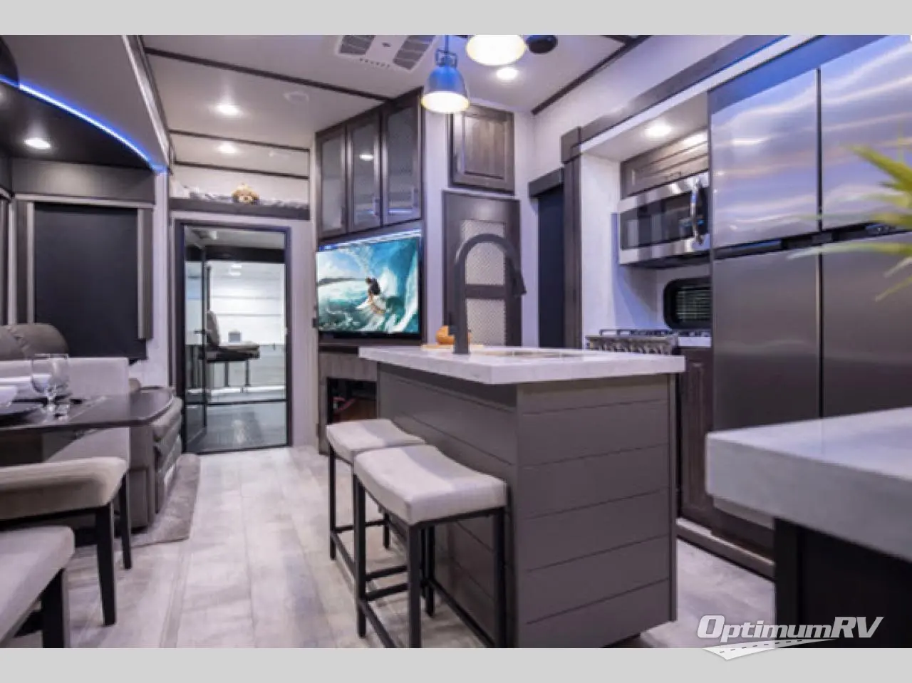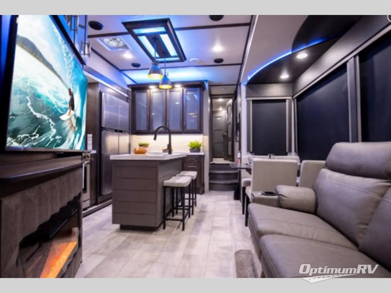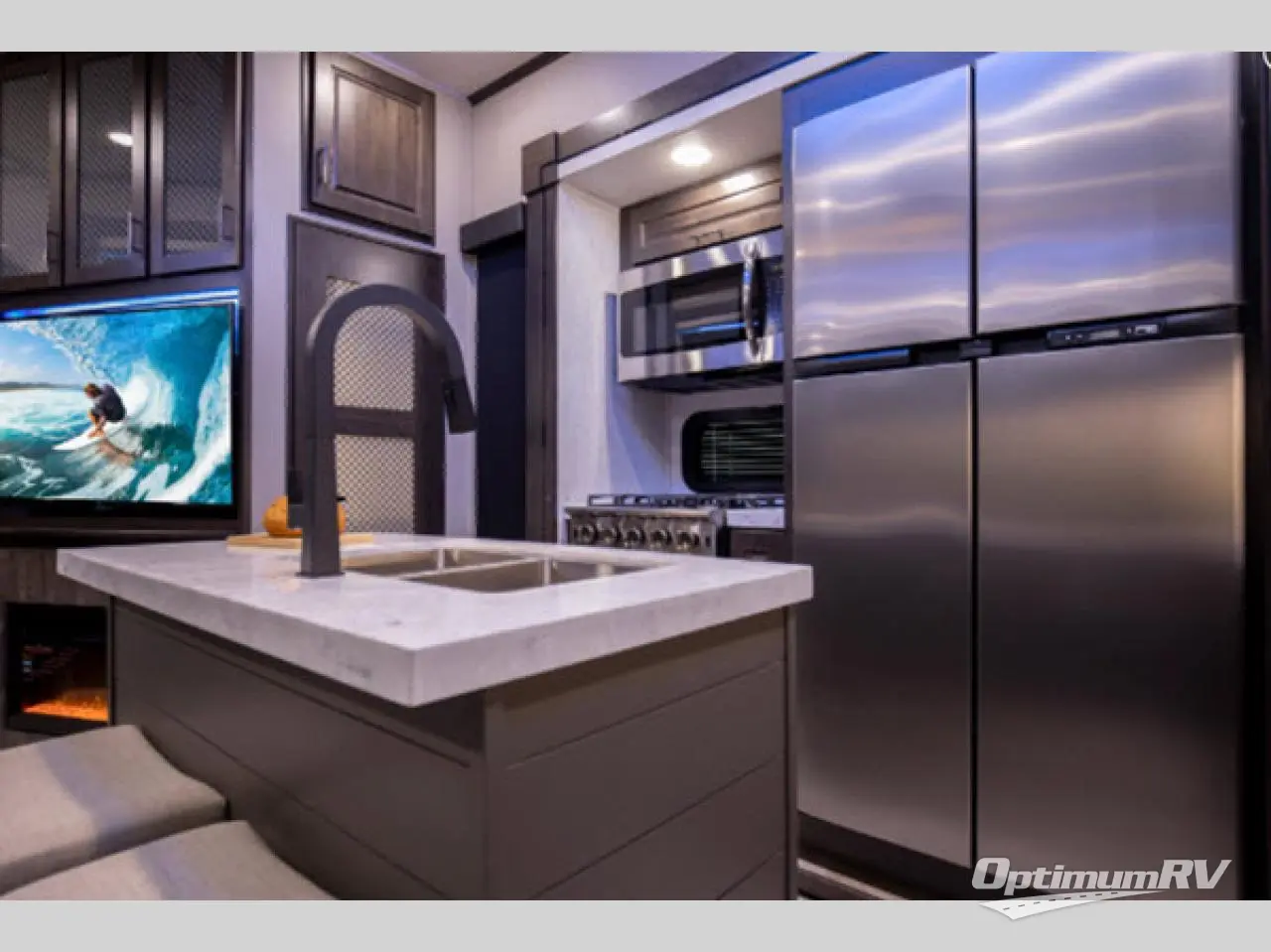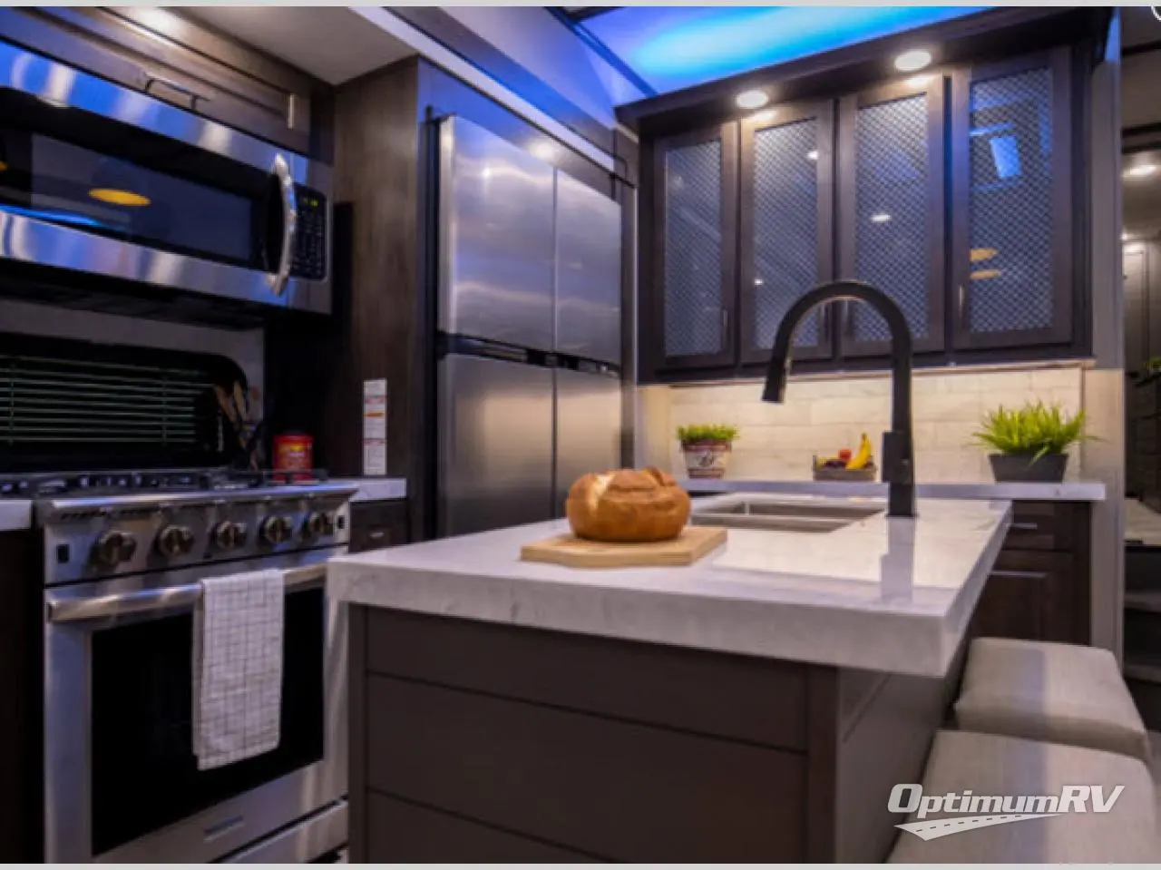 This Momentum toy hauler provides the maximum entertainment with its 49" LED TV in the living area, 32" LED TV in the private bedroom, 32" LED TV in the 12' 6" separate garage, and exterior LED TV! You can choose to add the optional Super Sofa which will create an amazingly comfortable area to sit down across from the electric fireplace. The two full bathrooms are one of the most impressive features found on this unit, and the three power awnings are another shocking addition. Within the kitchen, you'll be able to prepare all of your family's favorite dishes when you use the chef-inspired range and oven, and the window behind the range allows you to view the campsite while you cook. If you would prefer to have an 18-cubic foot RV refrigerator, you should check out model 397TH!