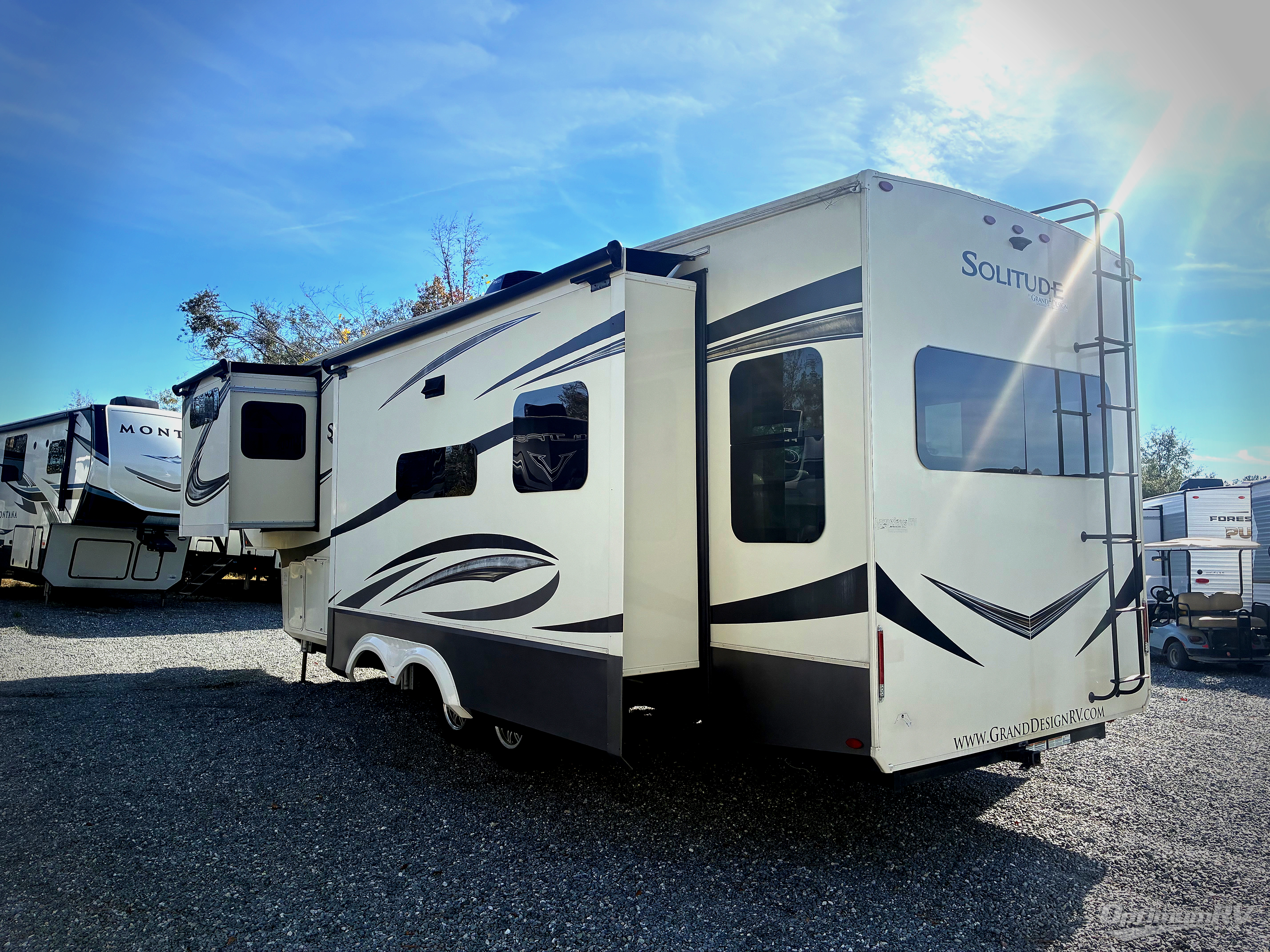 With each Solitude fifth wheel by Grand Design, you will have an exclusive superchassis, a wide rail design on heavy duty l-beam main rails providing a more stable jack stance, and maximum insulation from the thermal roof design and the exclusive full laminated walls to the insulated gooseneck and baggage doors. More features offered to help with traveling include the MORryde rubber pin box, the Tire Linc TPMS system, and the 6-point hydraulic system. And the 40,000 BTU of heating power, the heated underbelly and heated storage bay, the Evenflow heating system, and the Stealth A/C system with racetrack ducting, allow you to camp all year long! You will also find maximum storage solutions, residential features and so much more!