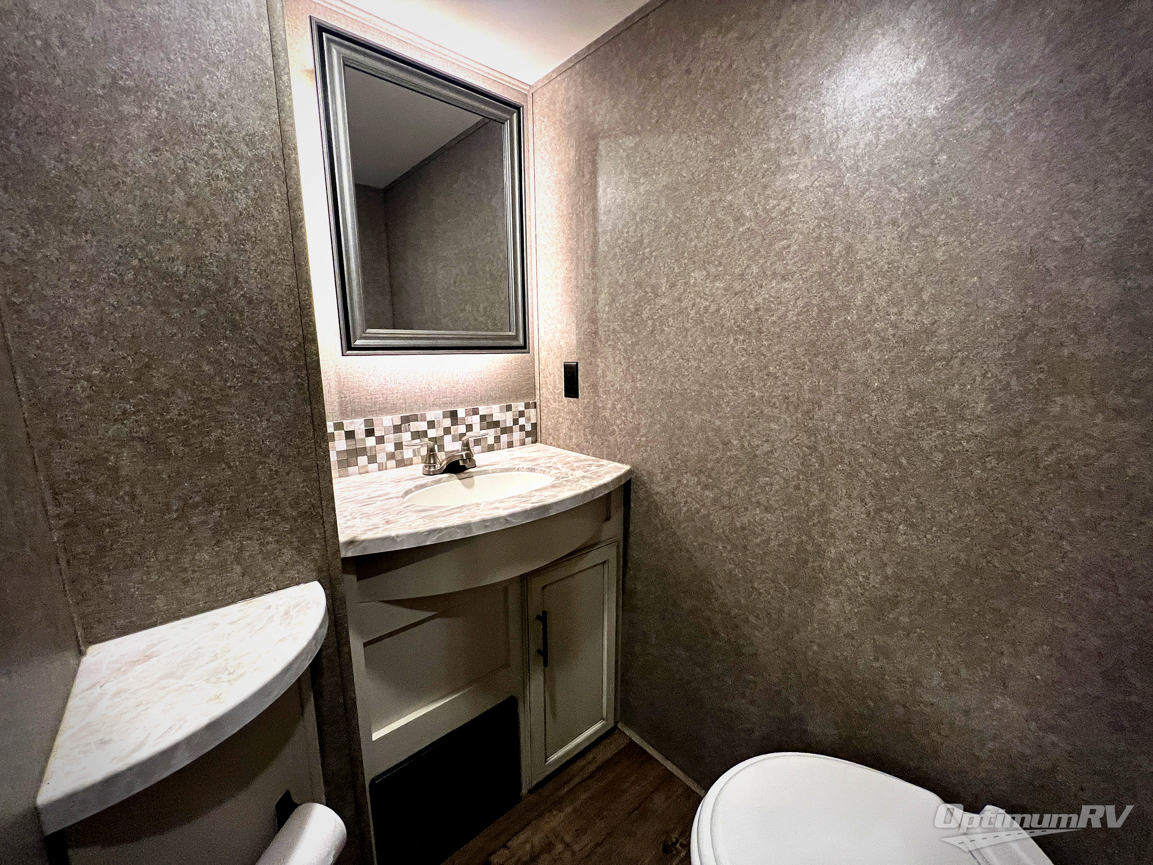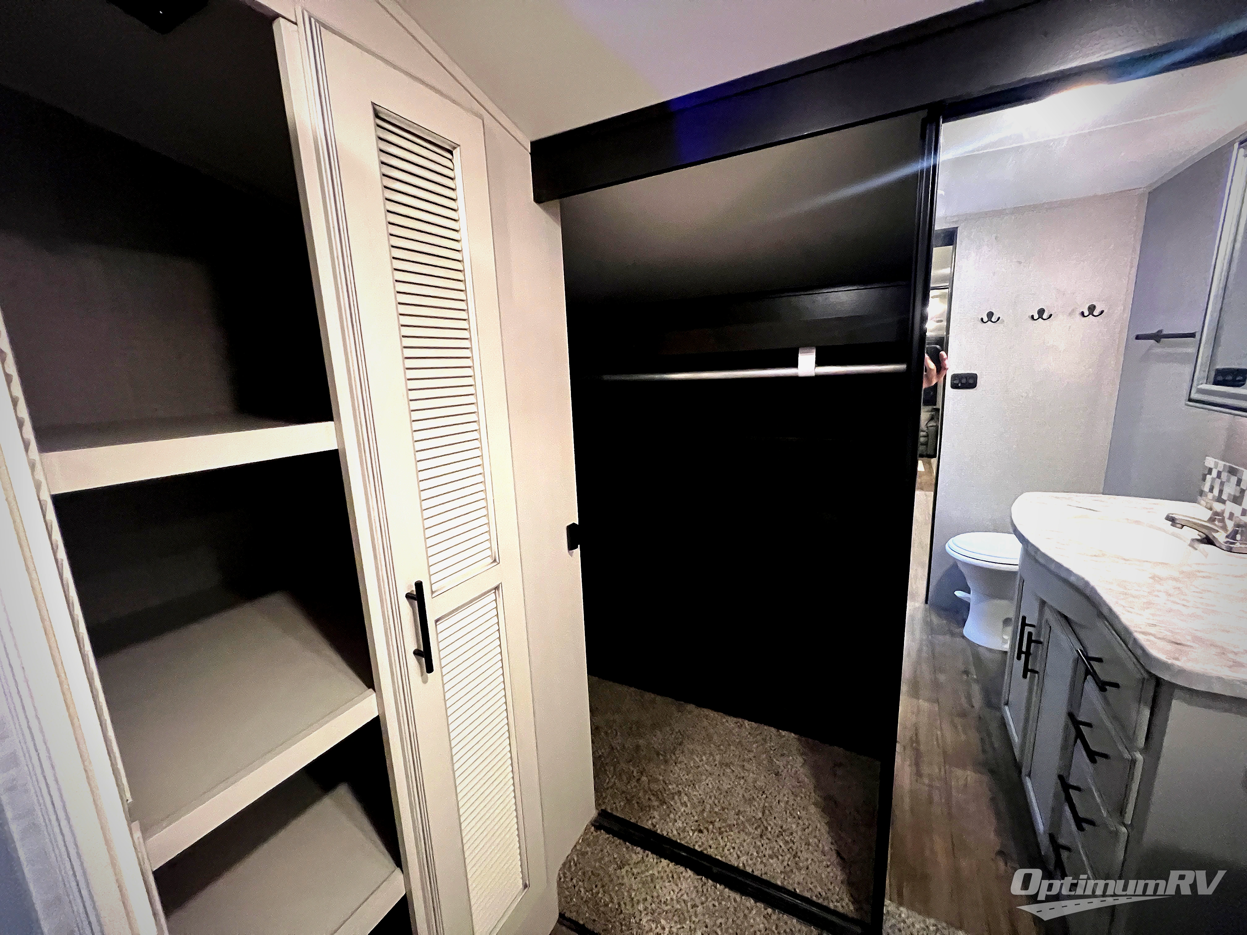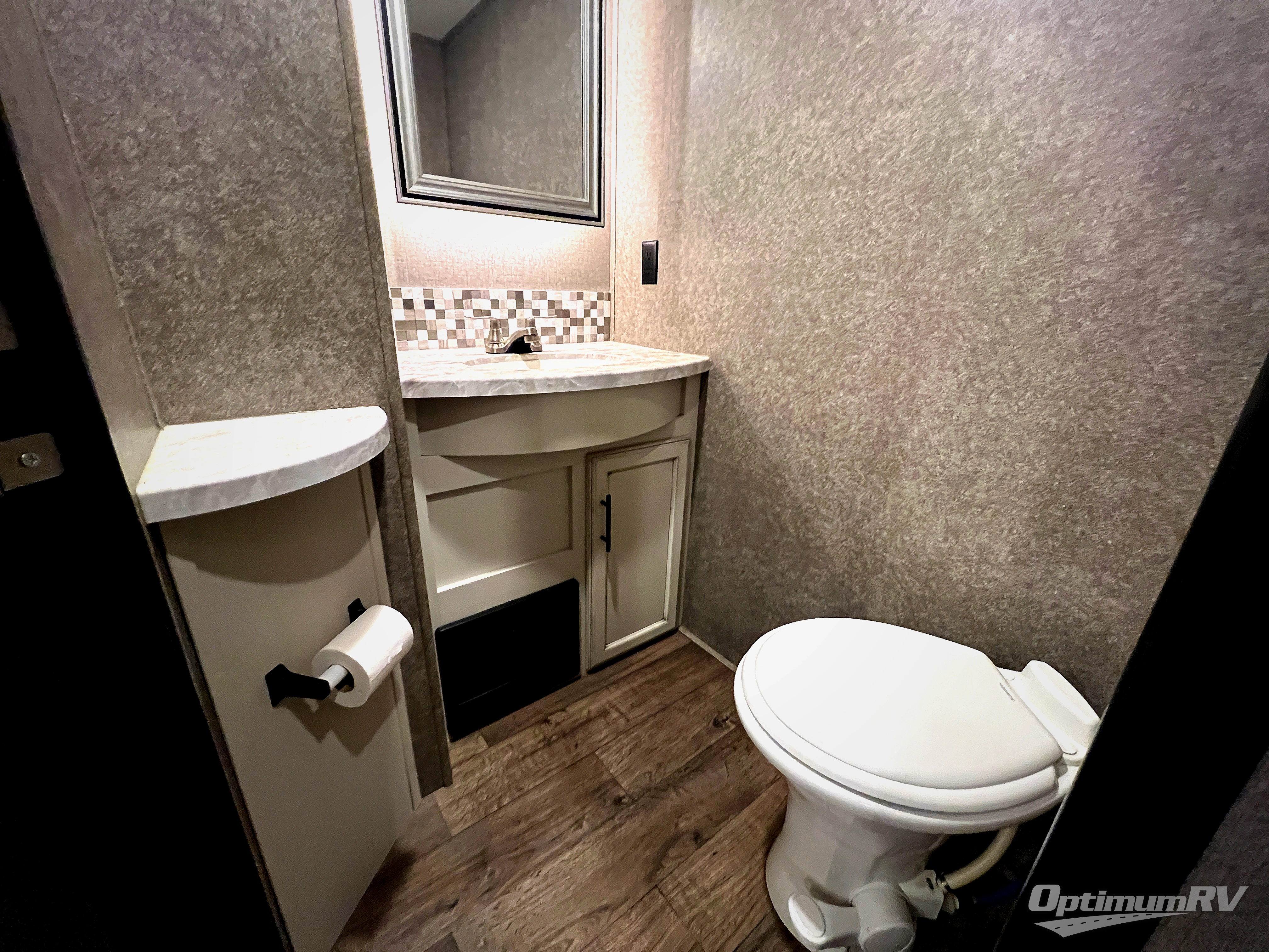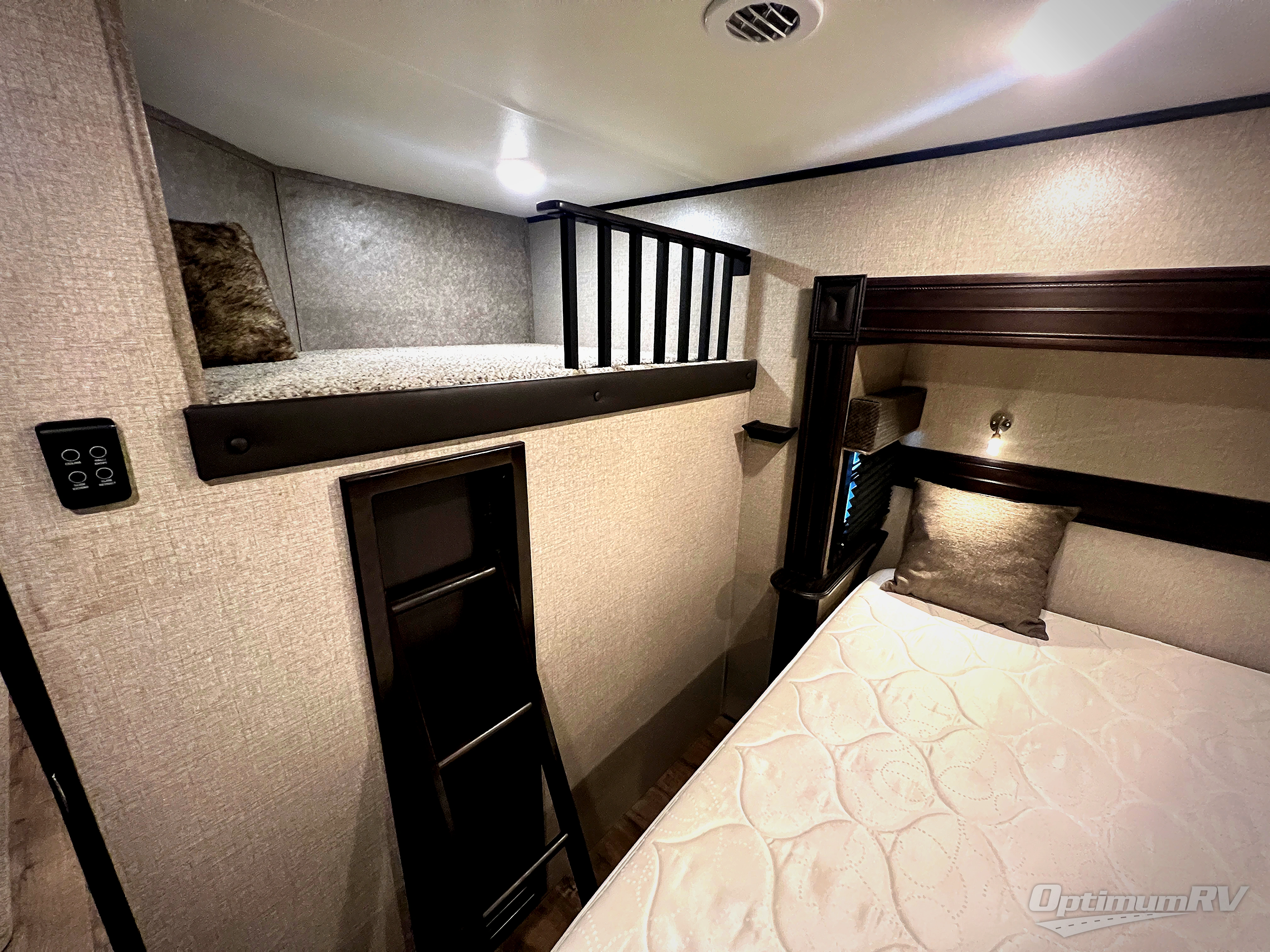 Check out the industry's first front full bathroom and half bathroom with a loft above it in this fifth wheel! Inside the front bathroom is a shower with a seat and a walk-in closet with an area prepped to add the optional washer and dryer, plus it leads right into the private bedroom that has a queen bed but can be switched out for the optional king Serta mattress. The kitchen island will make meal prepping easy and the free standing dinette is a great place to enjoy your meals then play a card game or two. The rear living area features a tri-fold sofa that can be used for seating during the day and a sleeping space at night, and theater seating across from the entertainment center with a fireplace and 50" HDTV with a JBL sound system. Outside you will find many handy features like the two electric awnings, the electric auto-leveling, the JAY COMMAND Smart RV technology, and the pass-through storage area!