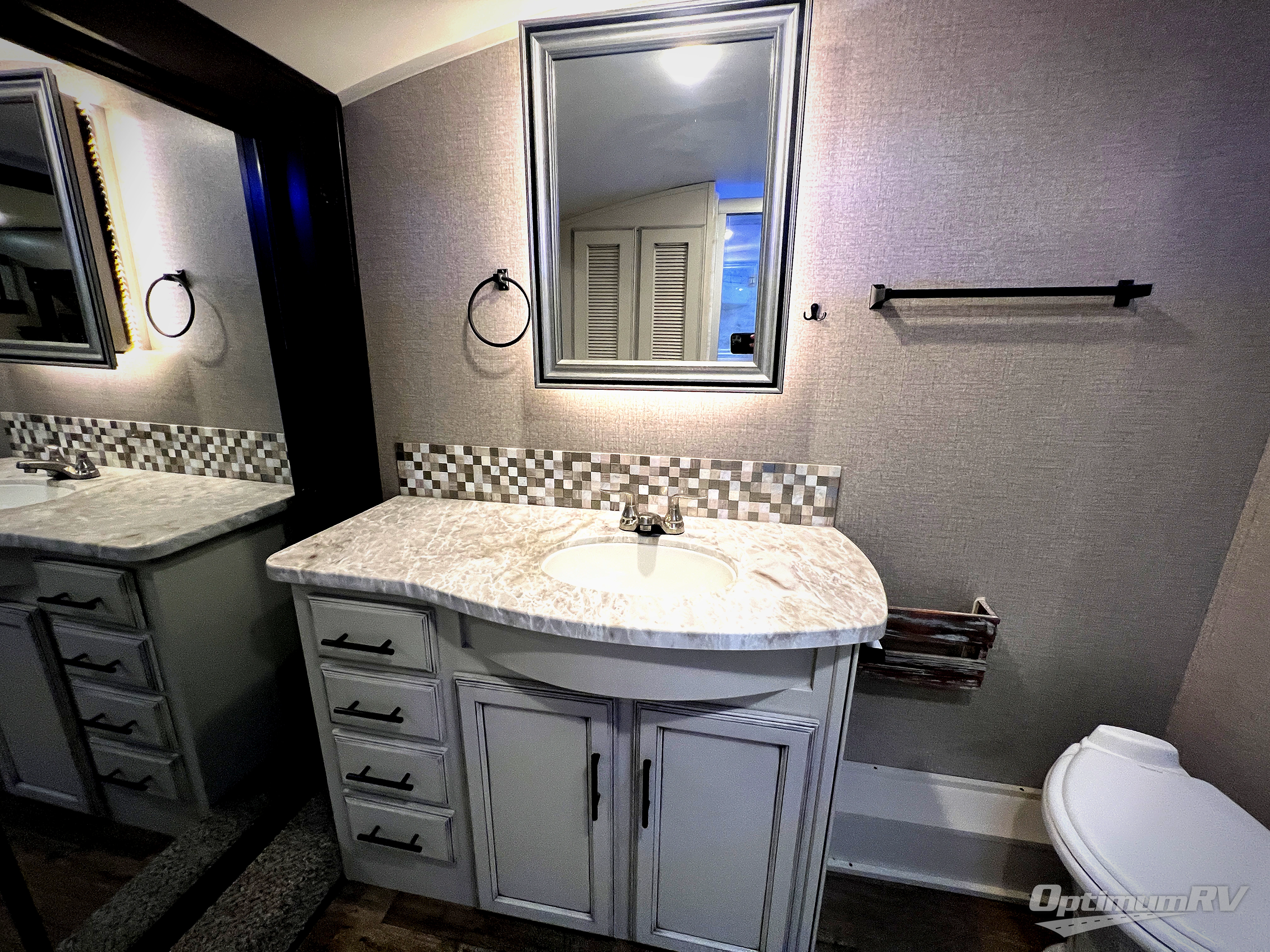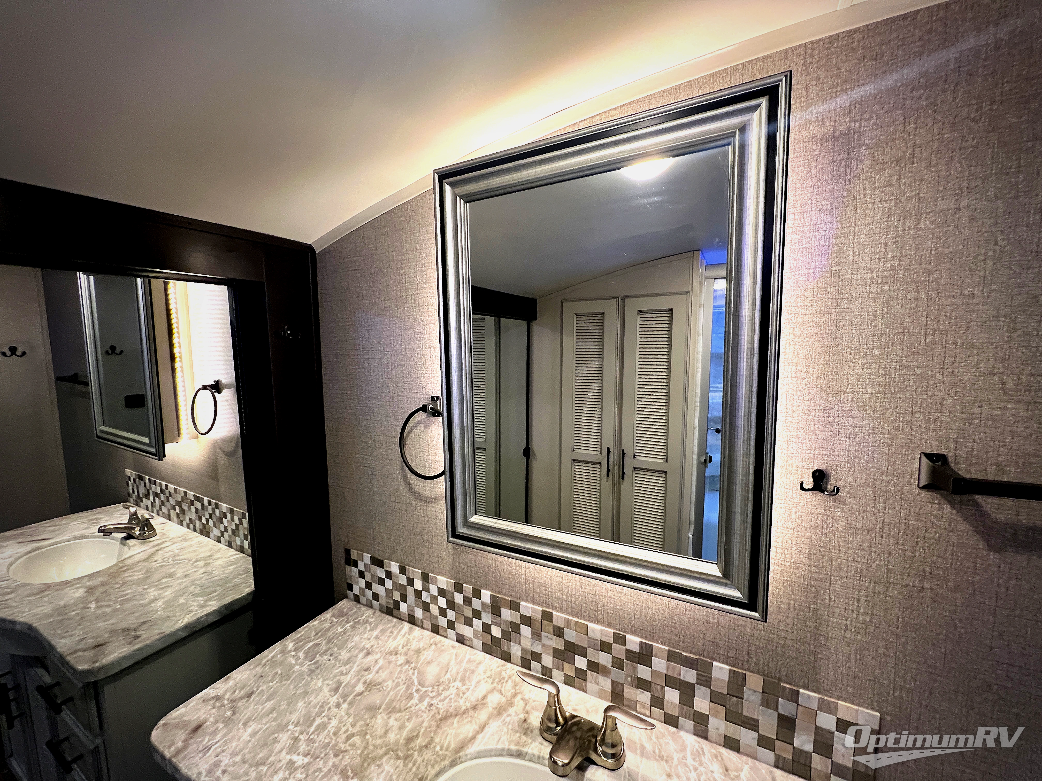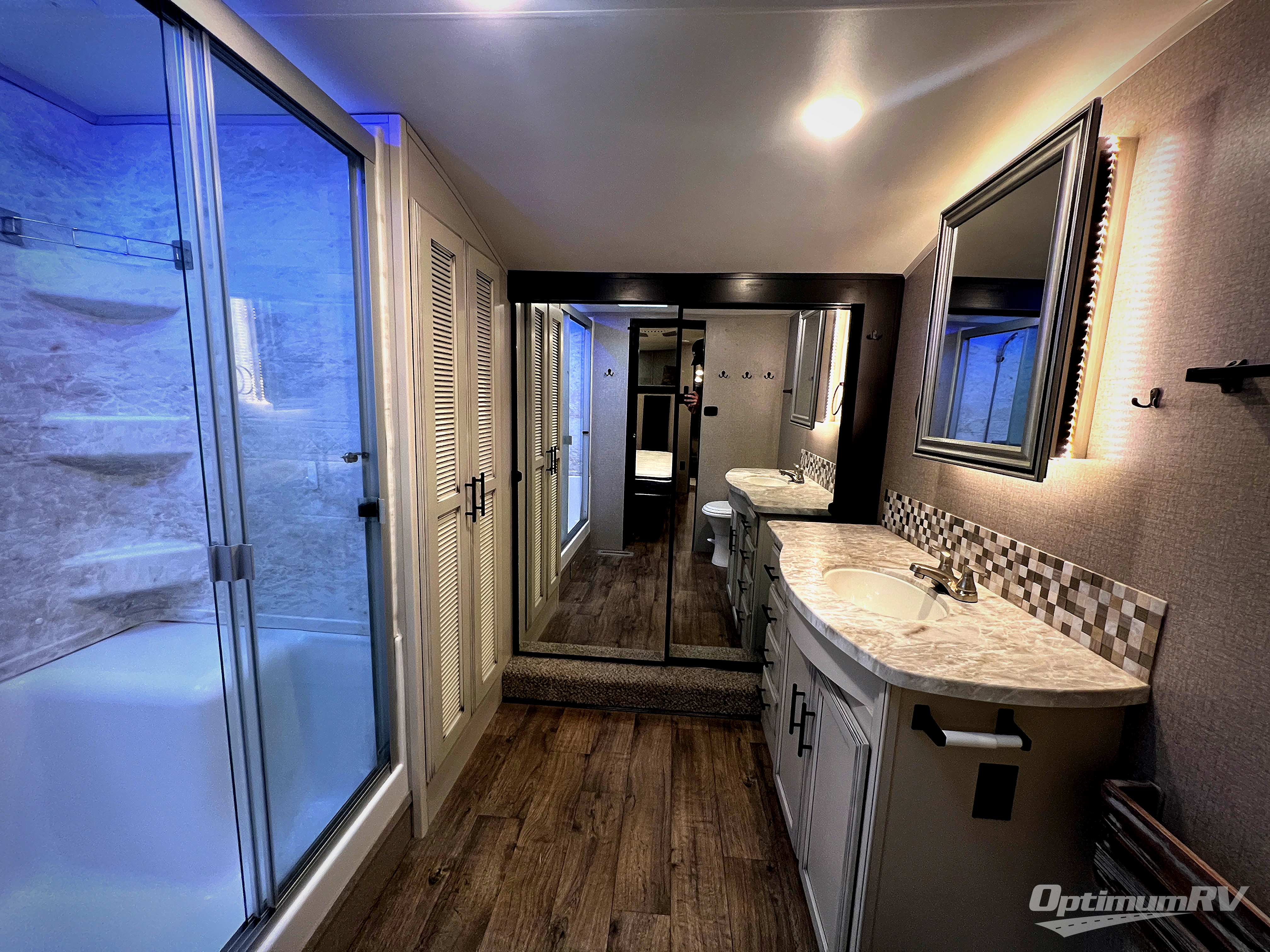 Check out the industry's first front full bathroom and half bathroom with a loft above it in this fifth wheel! Inside the front bathroom is a shower with a seat and a walk-in closet with an area prepped to add the optional washer and dryer, plus it leads right into the private bedroom that has a queen bed but can be switched out for the optional king Serta mattress. The kitchen island will make meal prepping easy and the free standing dinette is a great place to enjoy your meals then play a card game or two. The rear living area features a tri-fold sofa that can be used for seating during the day and a sleeping space at night, and theater seating across from the entertainment center with a fireplace and 50" HDTV with a JBL sound system. Outside you will find many handy features like the two electric awnings, the electric auto-leveling, the JAY COMMAND Smart RV technology, and the pass-through storage area!