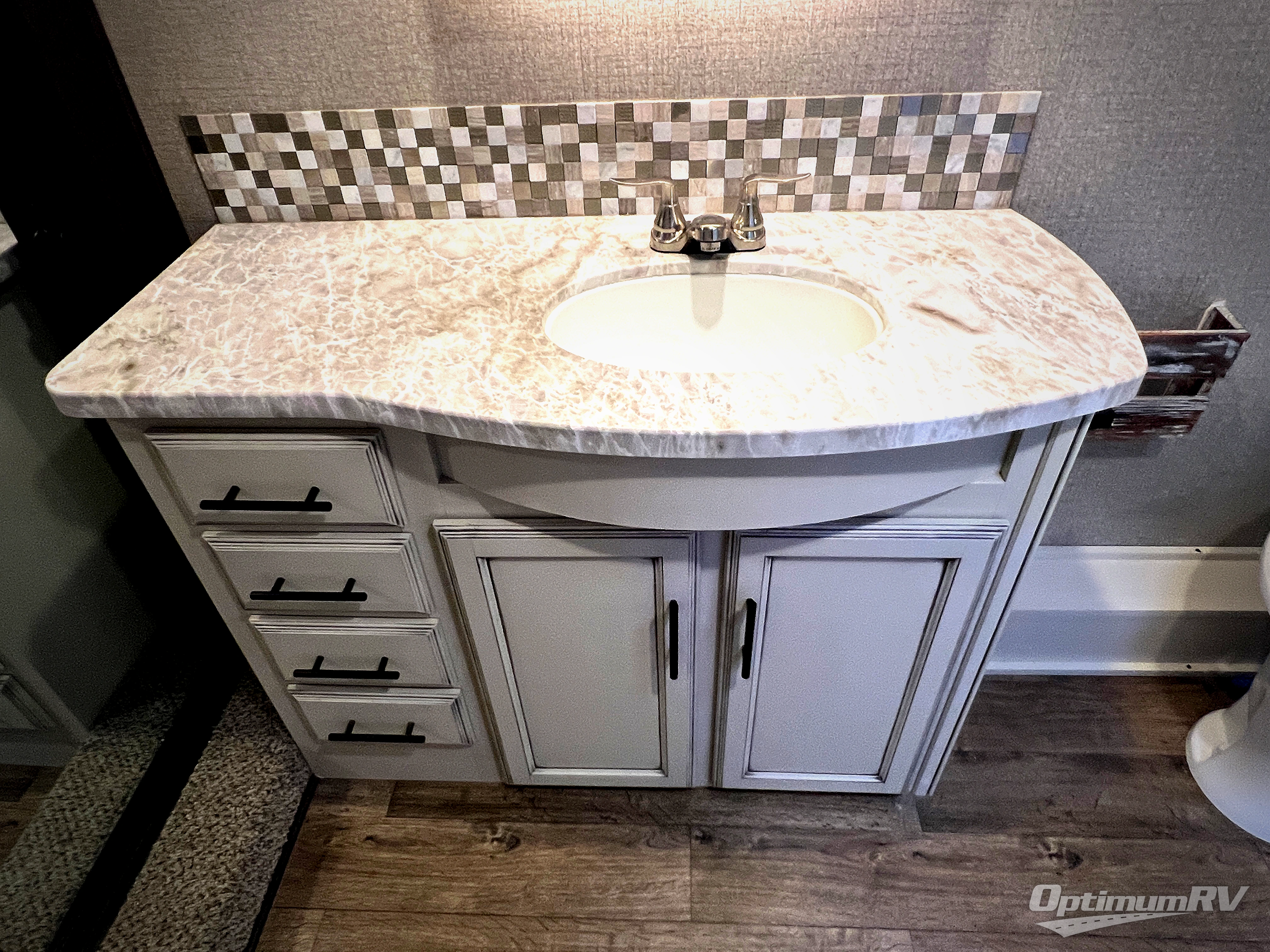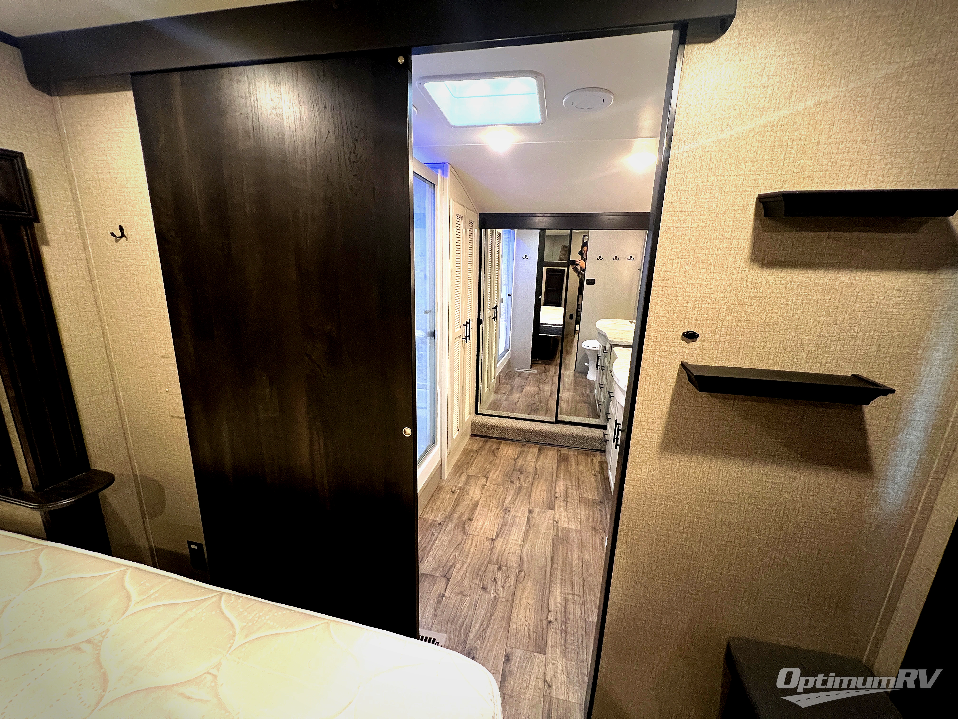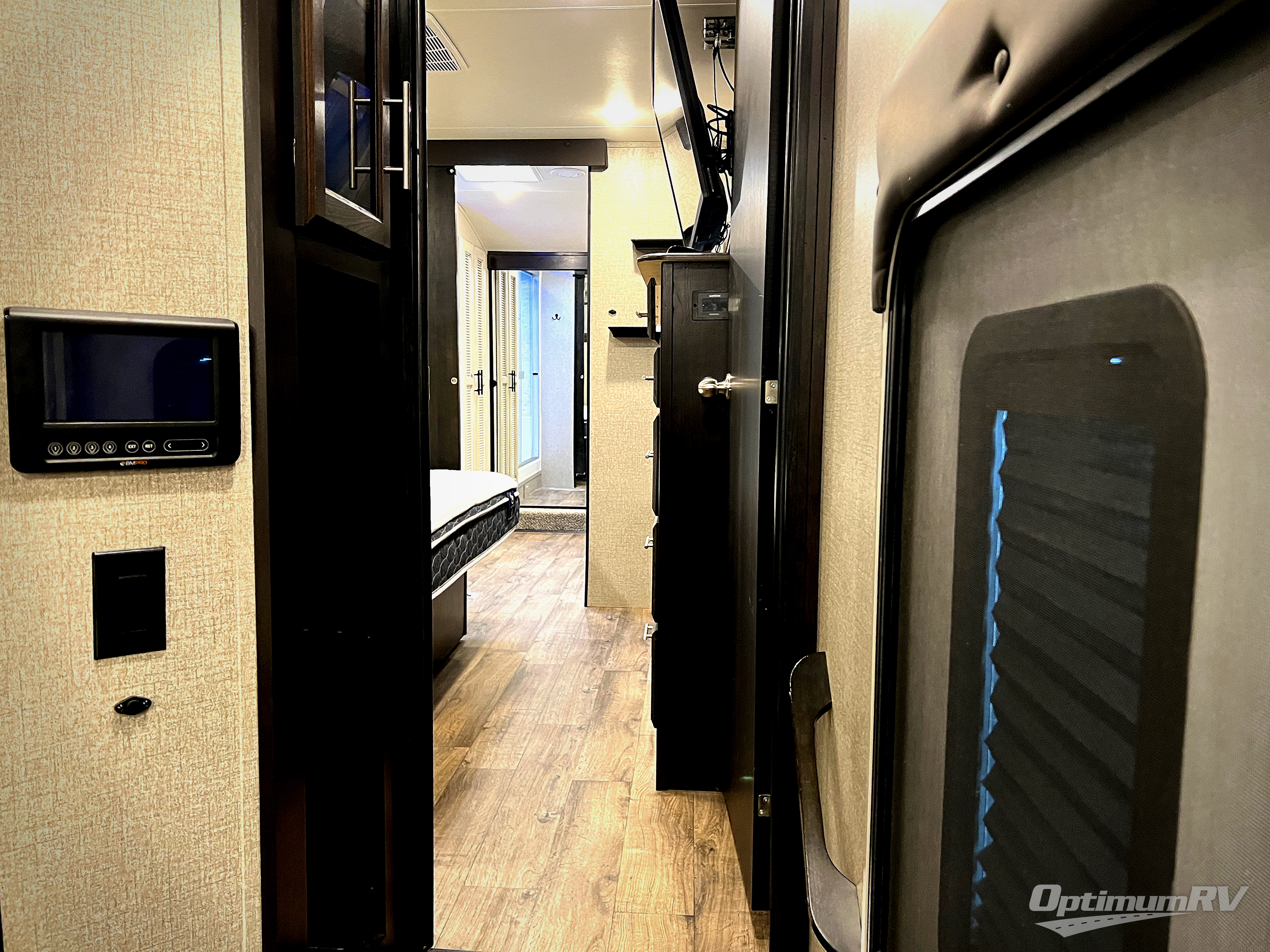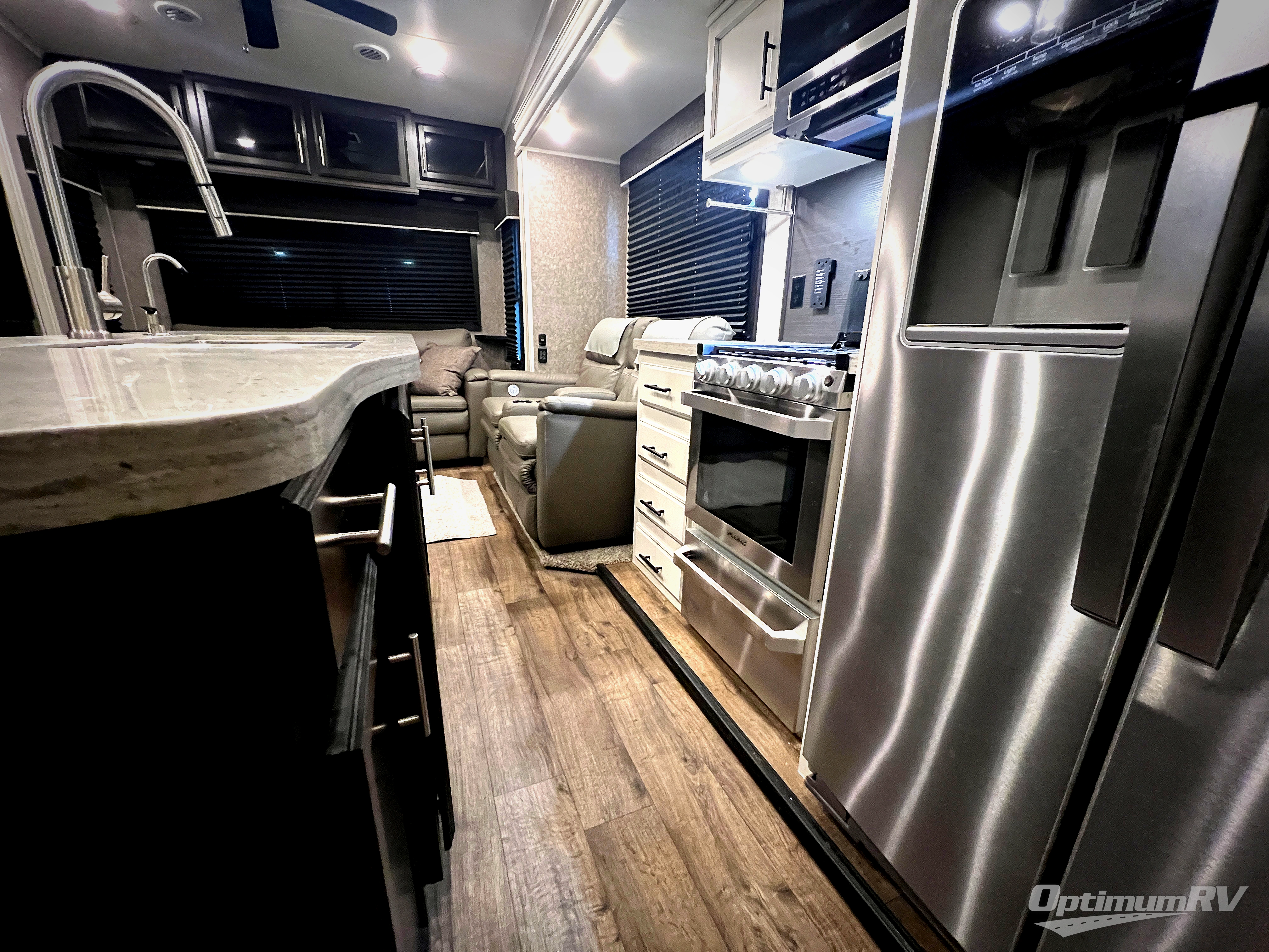Check out the industry's first front full bathroom and half bathroom with a loft above it in this fifth wheel! Inside the front bathroom is a shower with a seat and a walk-in closet with an area prepped to add the optional washer and dryer, plus it leads right into the private bedroom that has a queen bed but can be switched out for the optional king Serta mattress. The kitchen island will make meal prepping easy and the free standing dinette is a great place to enjoy your meals then play a card game or two. The rear living area features a tri-fold sofa that can be used for seating during the day and a sleeping space at night, and theater seating across from the entertainment center with a fireplace and 50" HDTV with a JBL sound system. Outside you will find many handy features like the two electric awnings, the electric auto-leveling, the JAY COMMAND Smart RV technology, and the pass-through storage area!