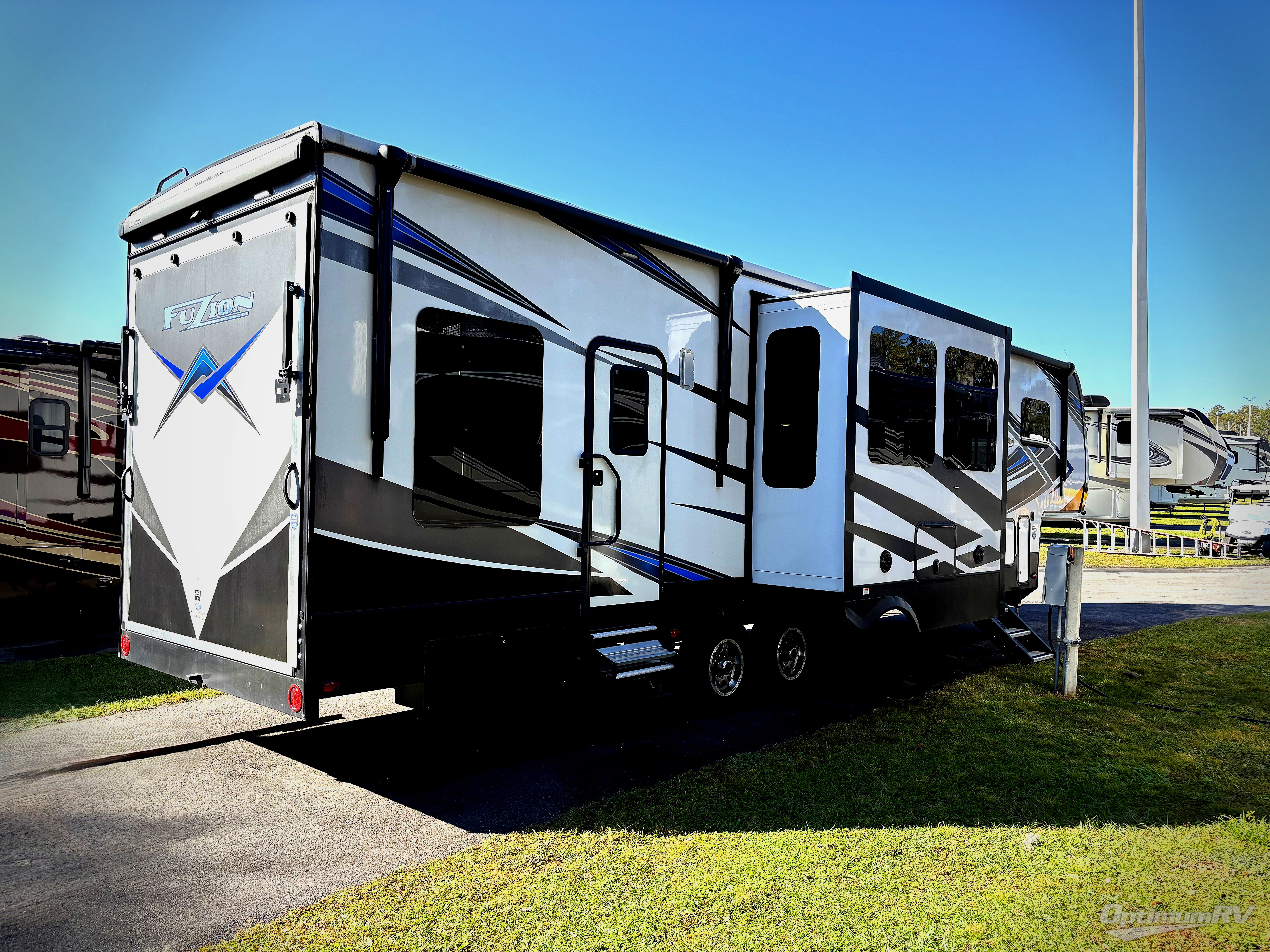 Seek new thrills and see new sights in a Fuzion toy hauler fifth wheel by Keystone. A few of the advantages you'll find with these models are Adjust-A-Track frame-welded tie-downs, Tru-fit slide construction, 12V color-coded wiring, plus much more. The Max Turn technology makes turning and parking easier than ever, and the MORryde CRE 3000 suspension will provide smooth towing to the campground. You will stay comfortable year around with the in-floor heating ducts and the Blade high performance air flow system that gives 20% more air flow. Each model includes many interior comforts, including residential-style furniture, extra tall ceilings with crown molding, and fiberglass backed linoleum floors. The garage features gas and oil resistant tuff-fly flooring, an 8' ramp door, a fuel station with dual 30 gallon tanks, and double electric beds with dual opposing sofas so you can invite more friends along!