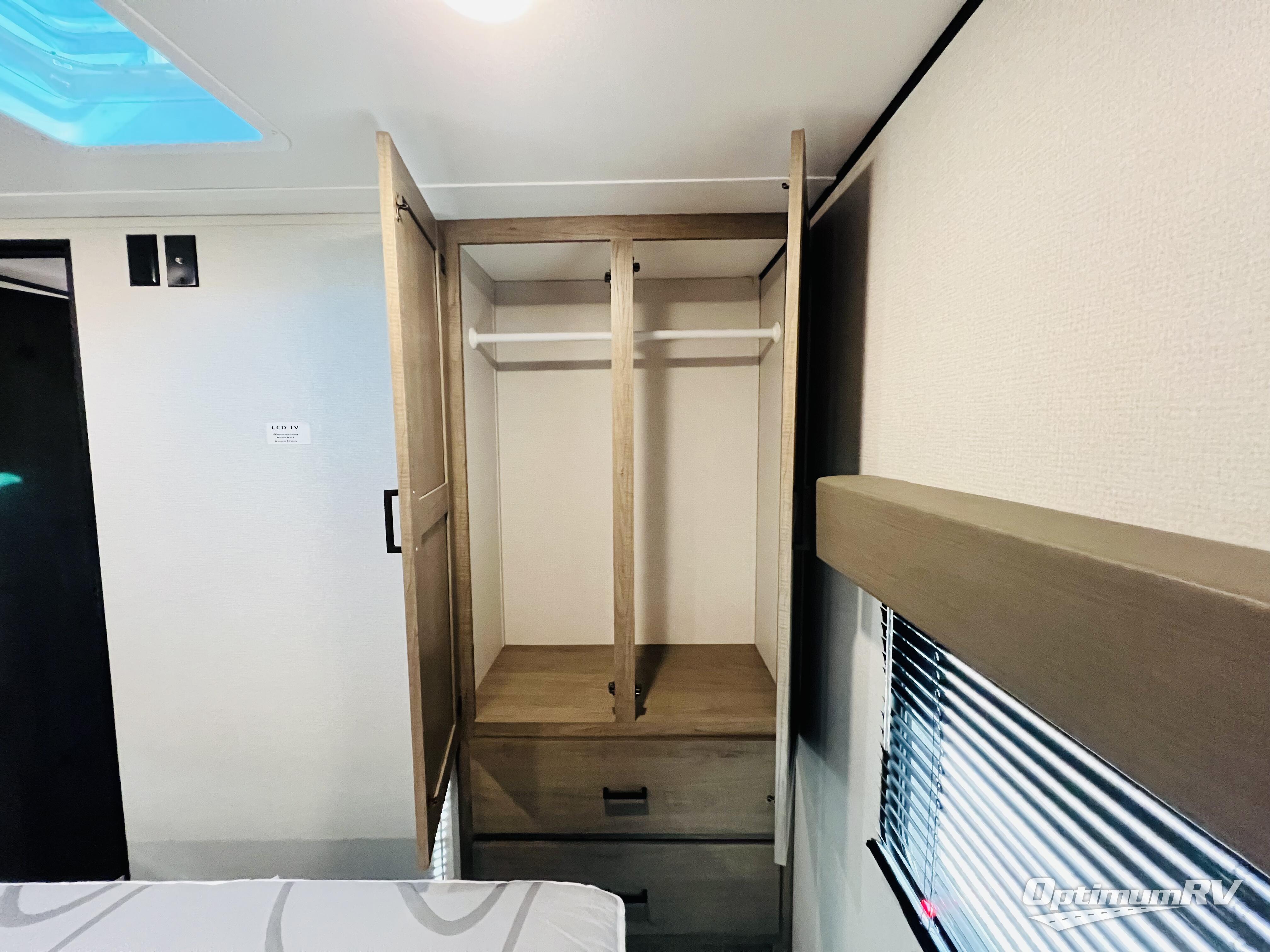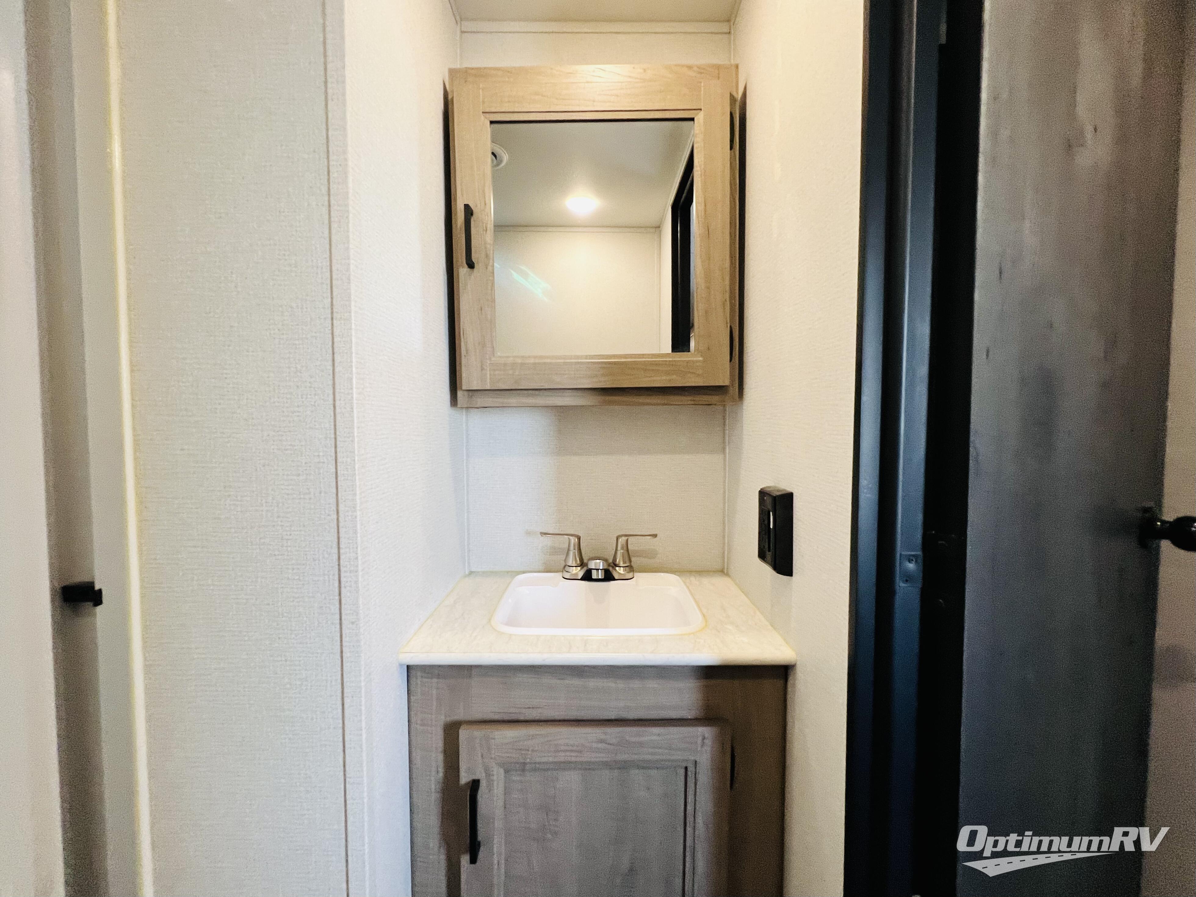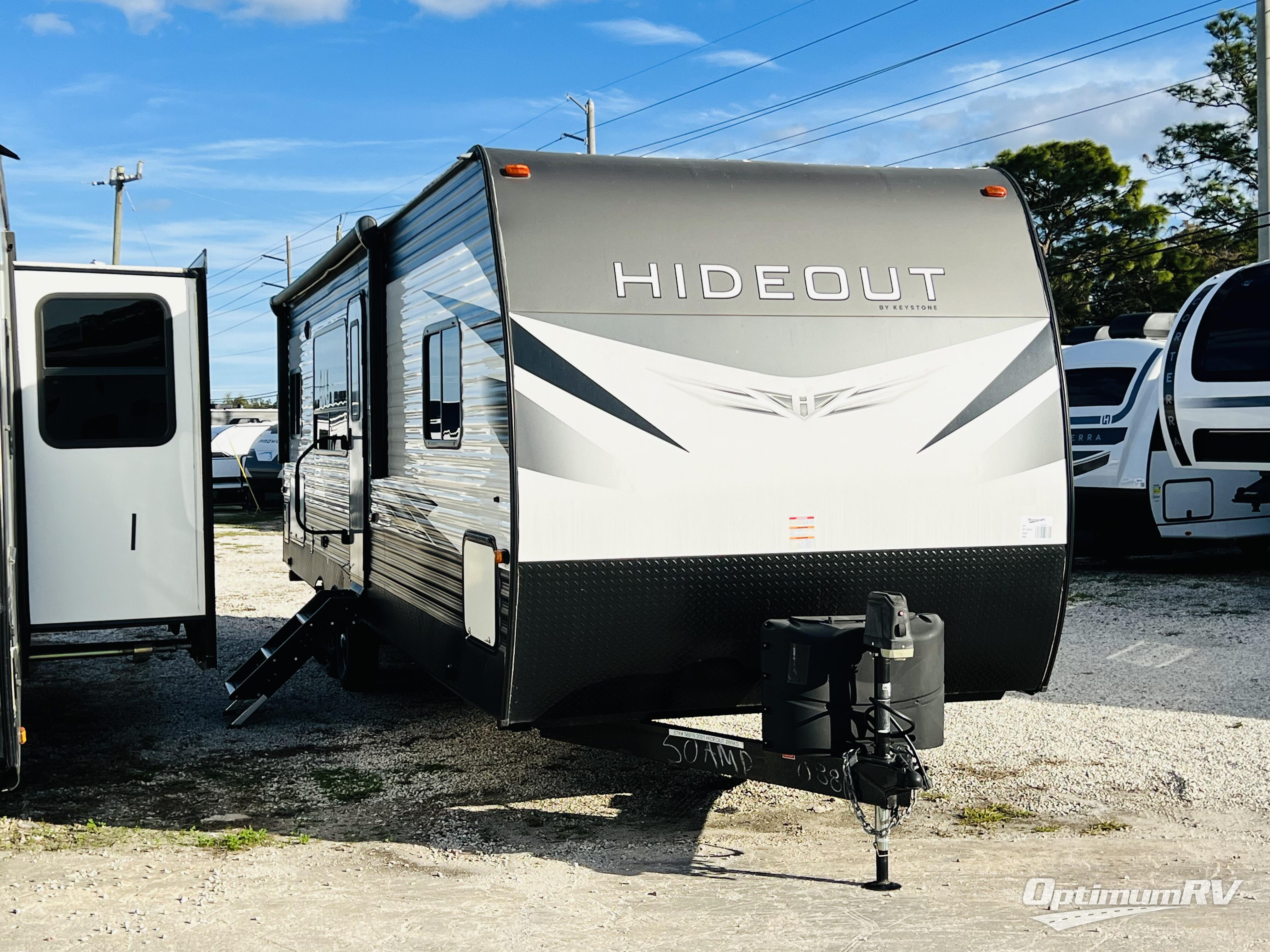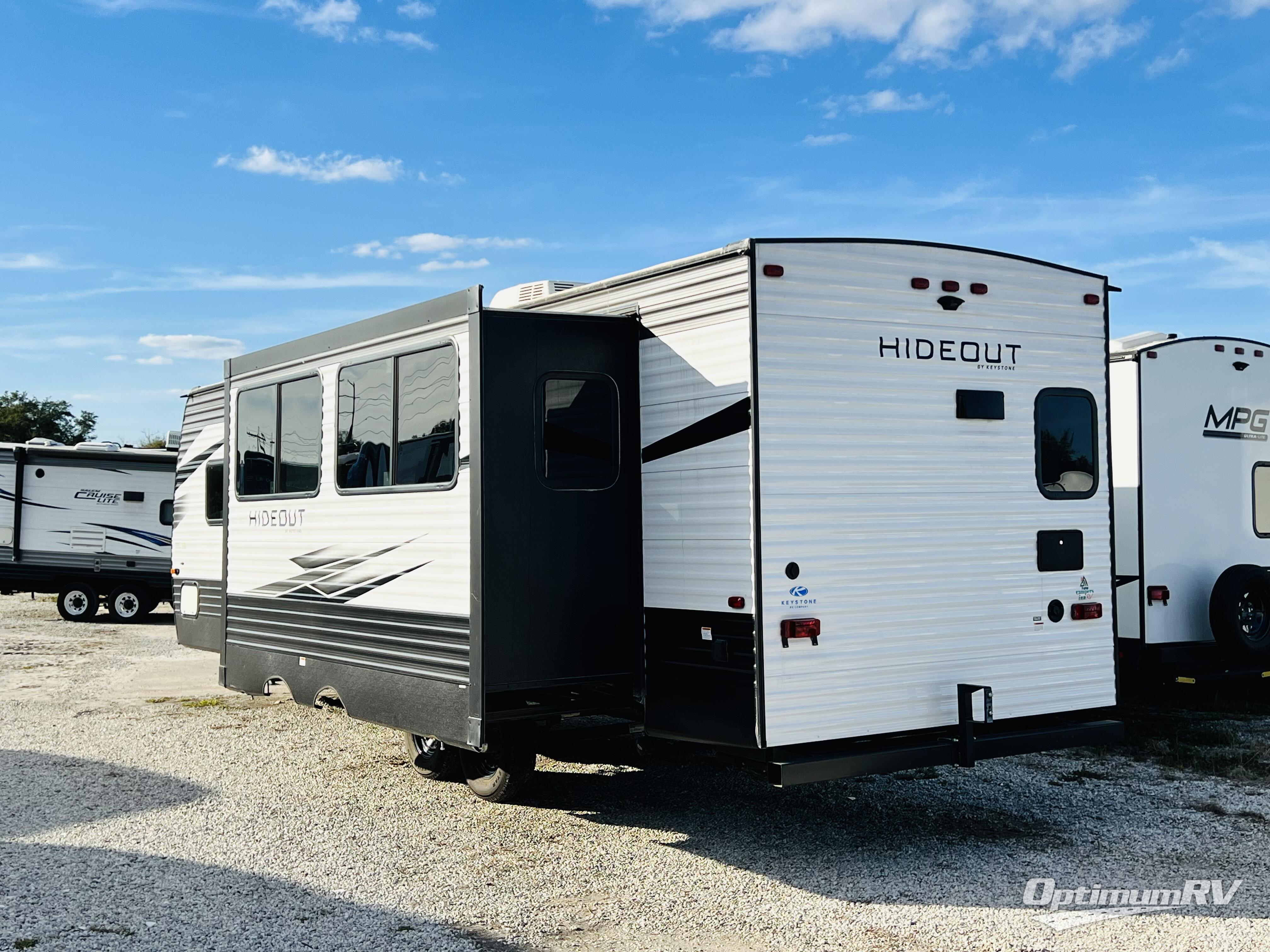 You will love the rear kitchen layout and large slide in this Keystone Hideout travel trailer. With ample space to sleep three people, this unit is perfect for your family to enjoy. The hardest decision you will have to make while you are away from home is where you will fix your meals, inside or at the outdoor kitchen. If you decide to cook outside, you can also enjoy your meal underneath the lighted adjustable power awning as you take in the beautiful sunset. The full bathroom has everything you need to get ready for the day, like a 38" walk-in shower and linen closet, and it also is directly next to the front private bedroom.