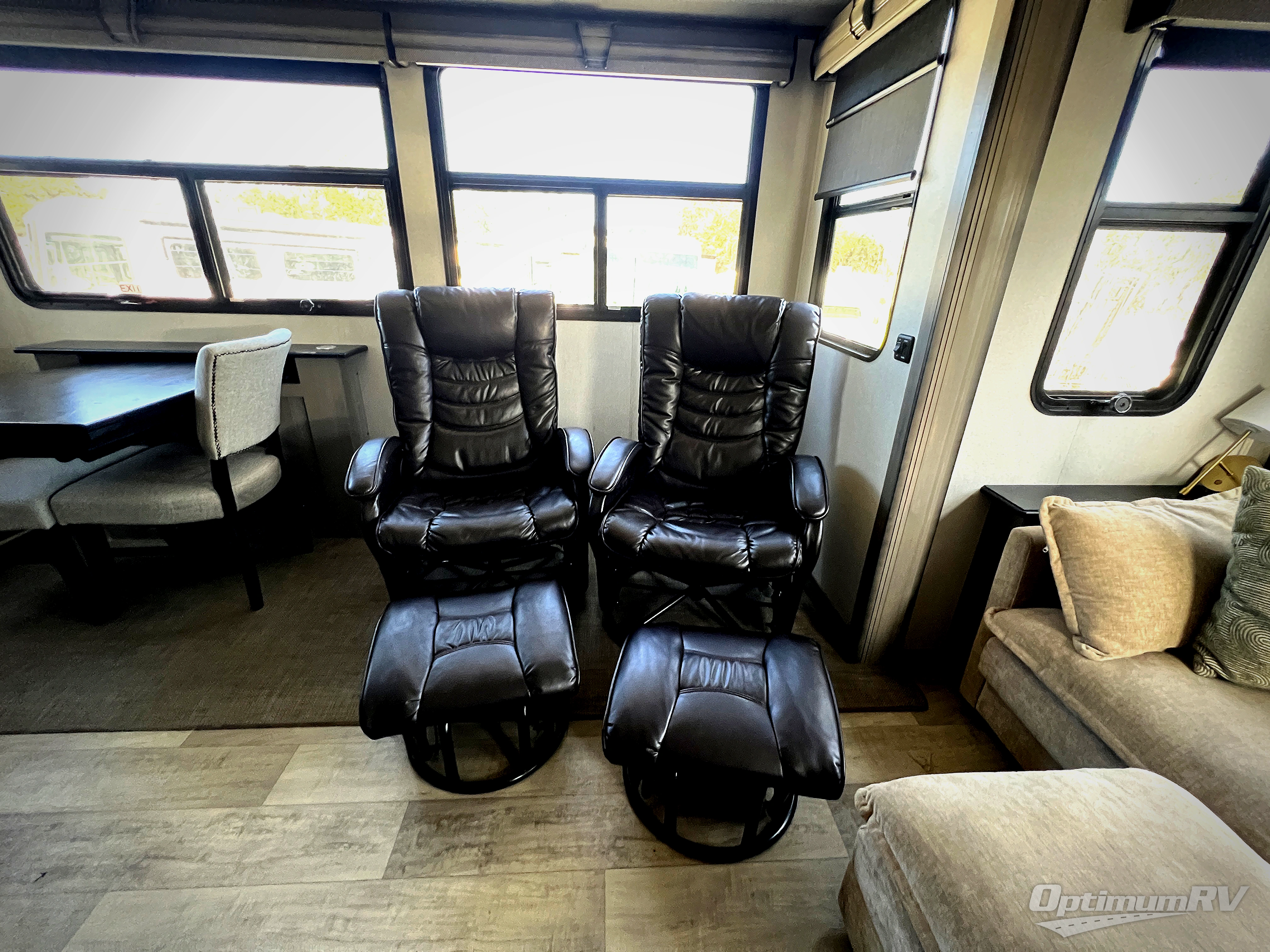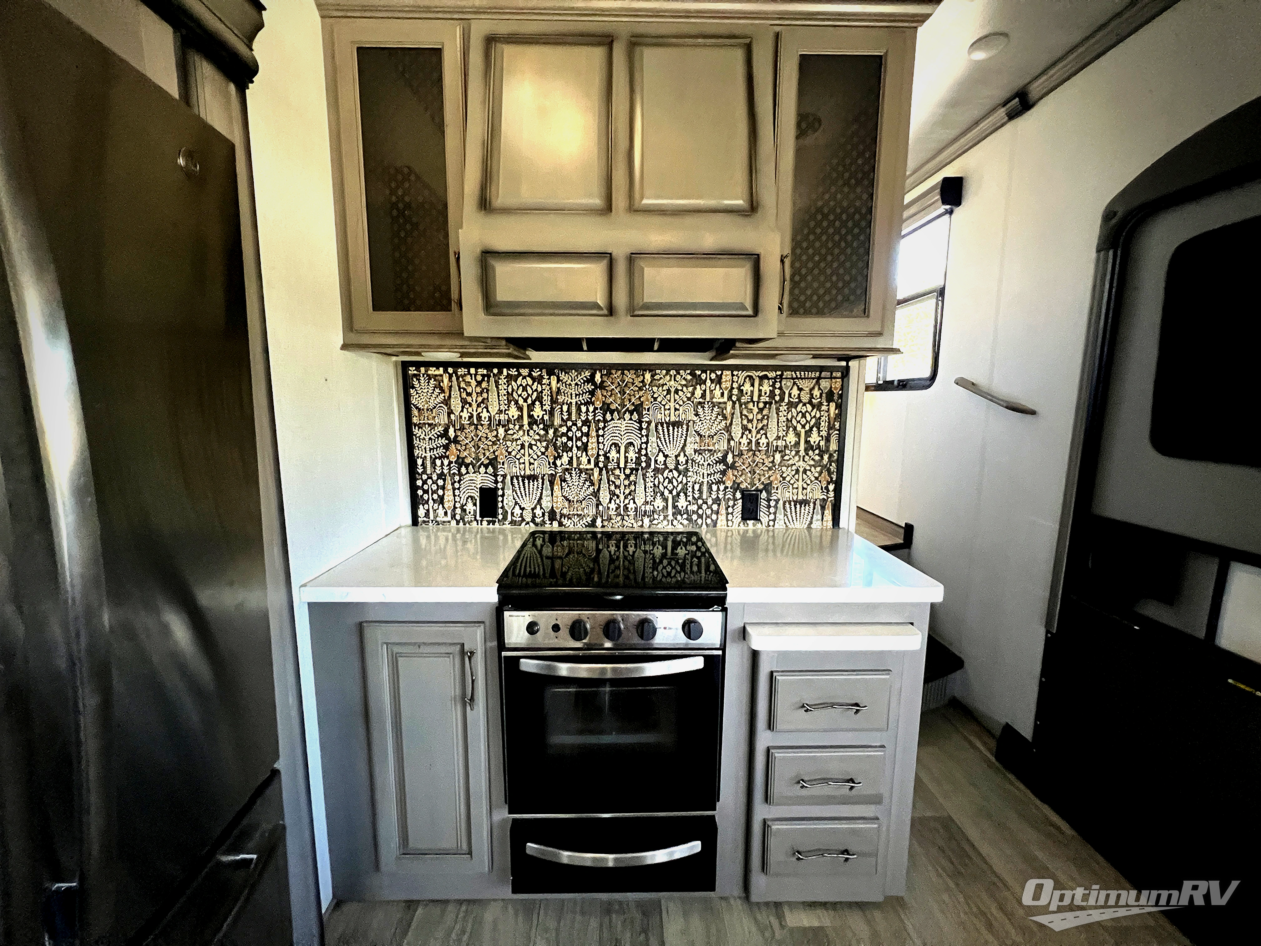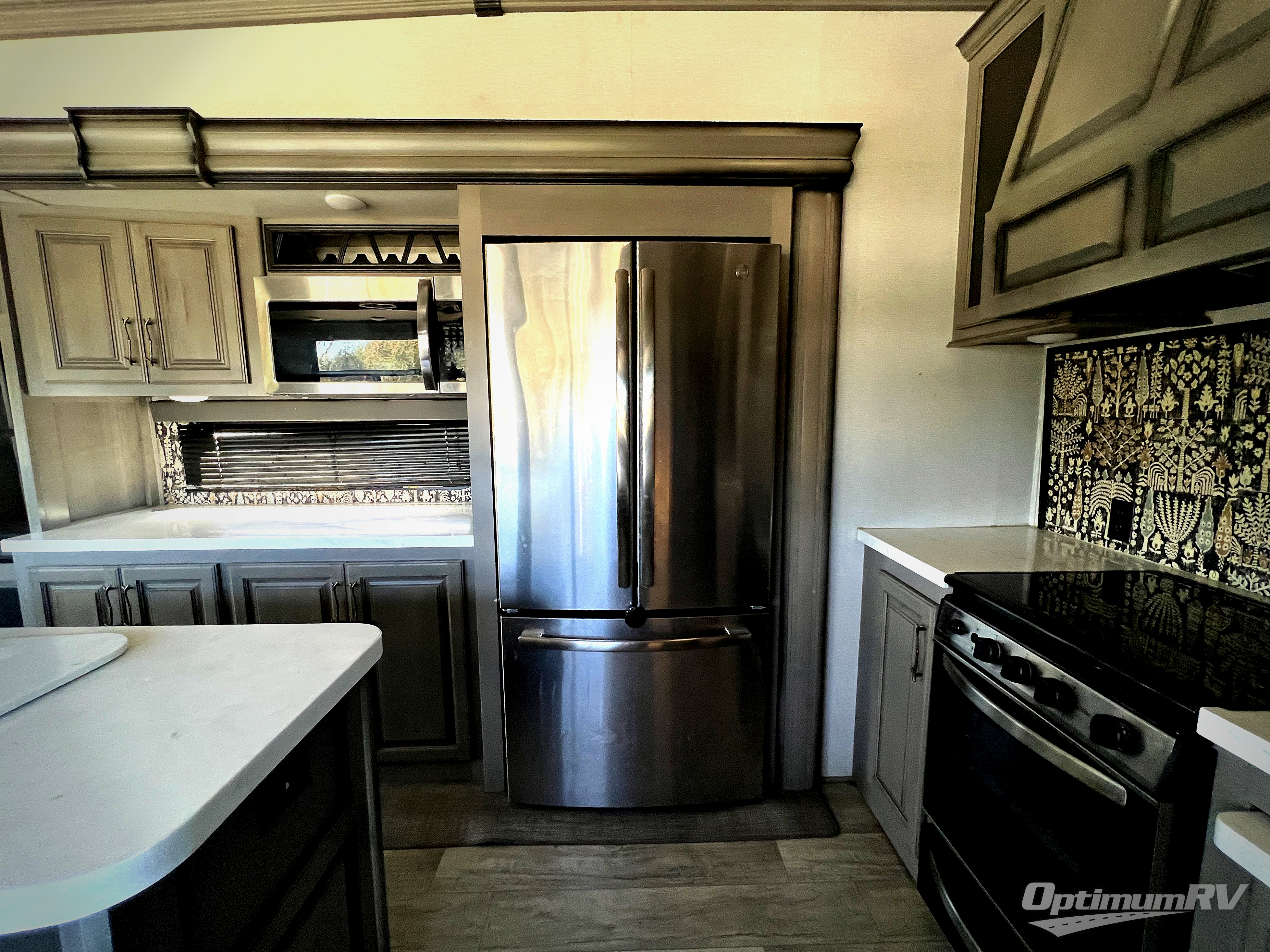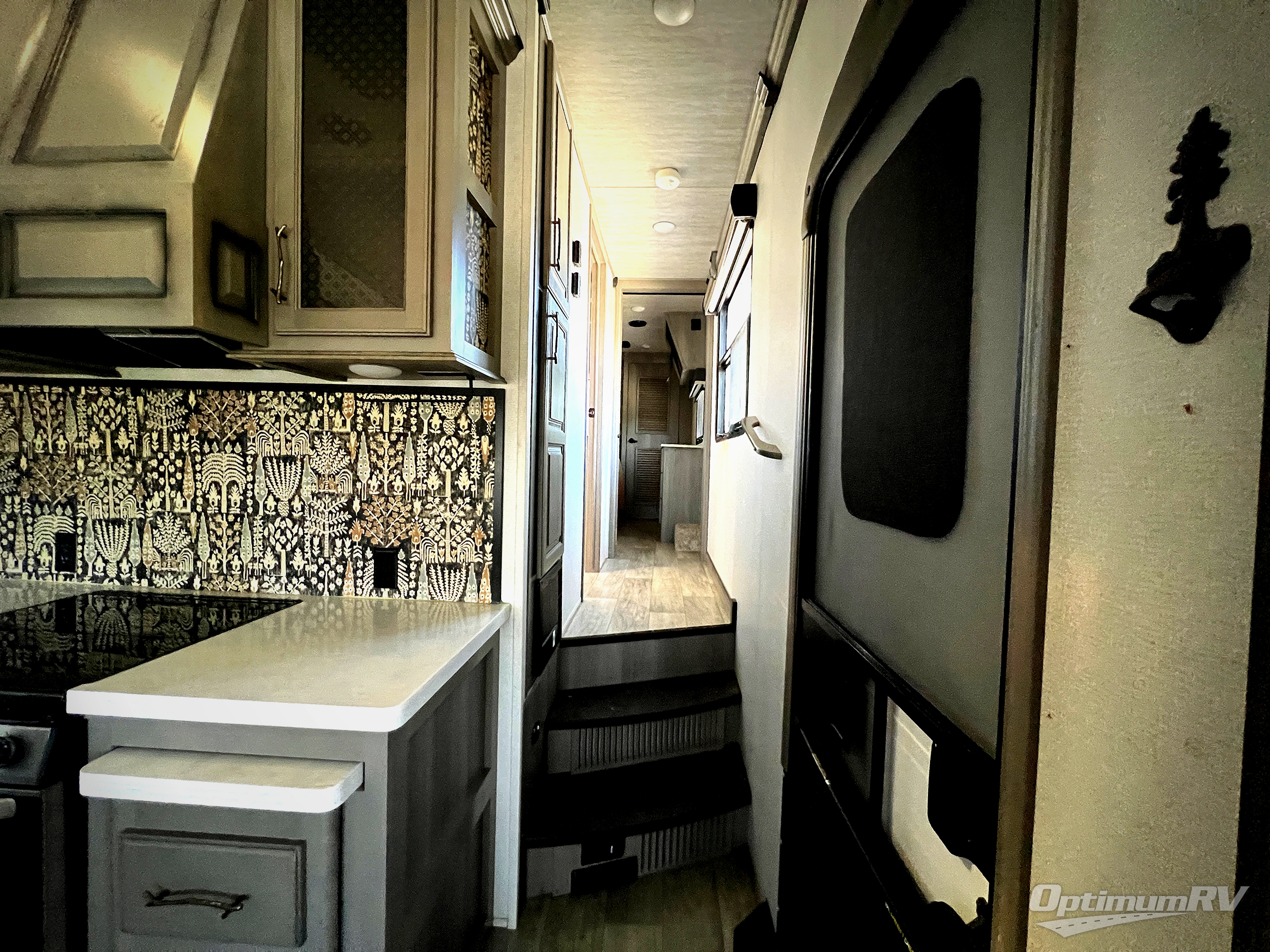 This Montana fifth wheel is absolutely amazing, and it will be extremely useful when it comes time for another getaway! One feature that makes this fifth wheel so great is the front private bedroom. This bedroom has a barn door that closes it off, and it also has a queen bed slide, a full-width closet with a space prepped for the optional washer/dryer, under-bed storage, a dresser, and a 32" LED HDTV. Right next to the bedroom is the bathroom that has a dual-sink vanity and 48" x 30" shower, and when you head out into the main living area, you will find lots of living space thanks to the opposing slides. Take a load off and sit back on the power theater seating, or you can sit down with a snack at the dinette with four chairs and storage. The kitchen also provides you with lots of amenities, like two pull-out pantries, a pull-out countertop, an island, an 18-cubic foot residential refrigerator, and a residential range hood.