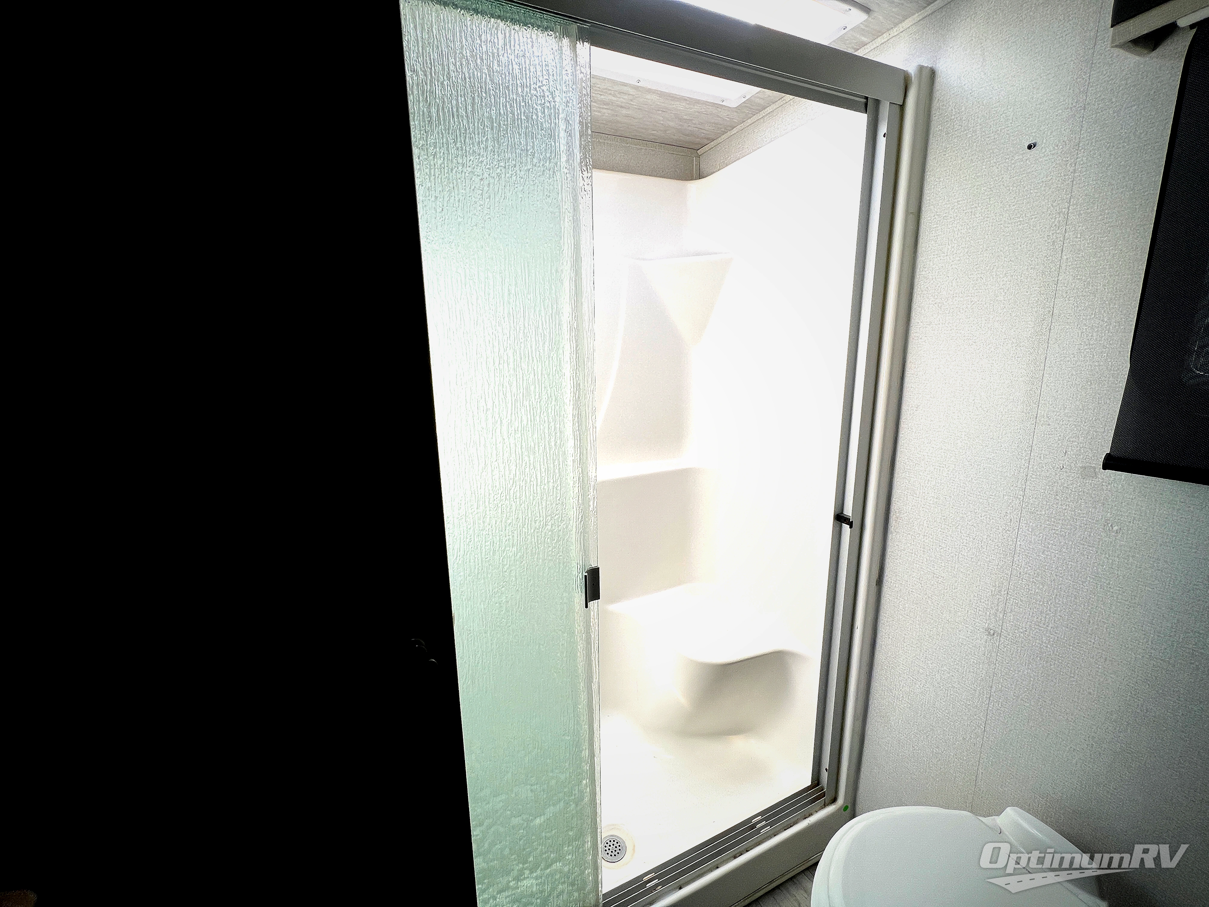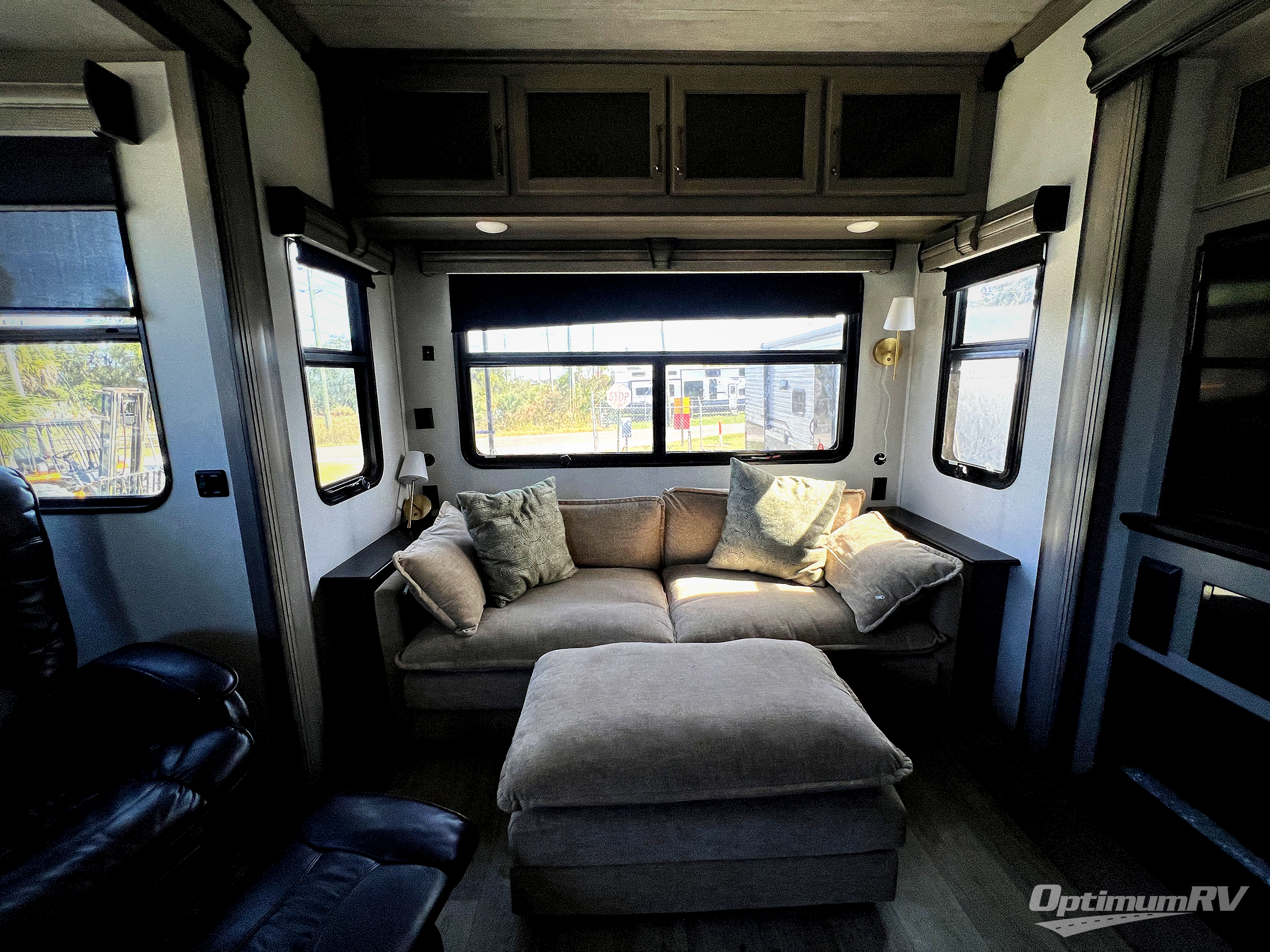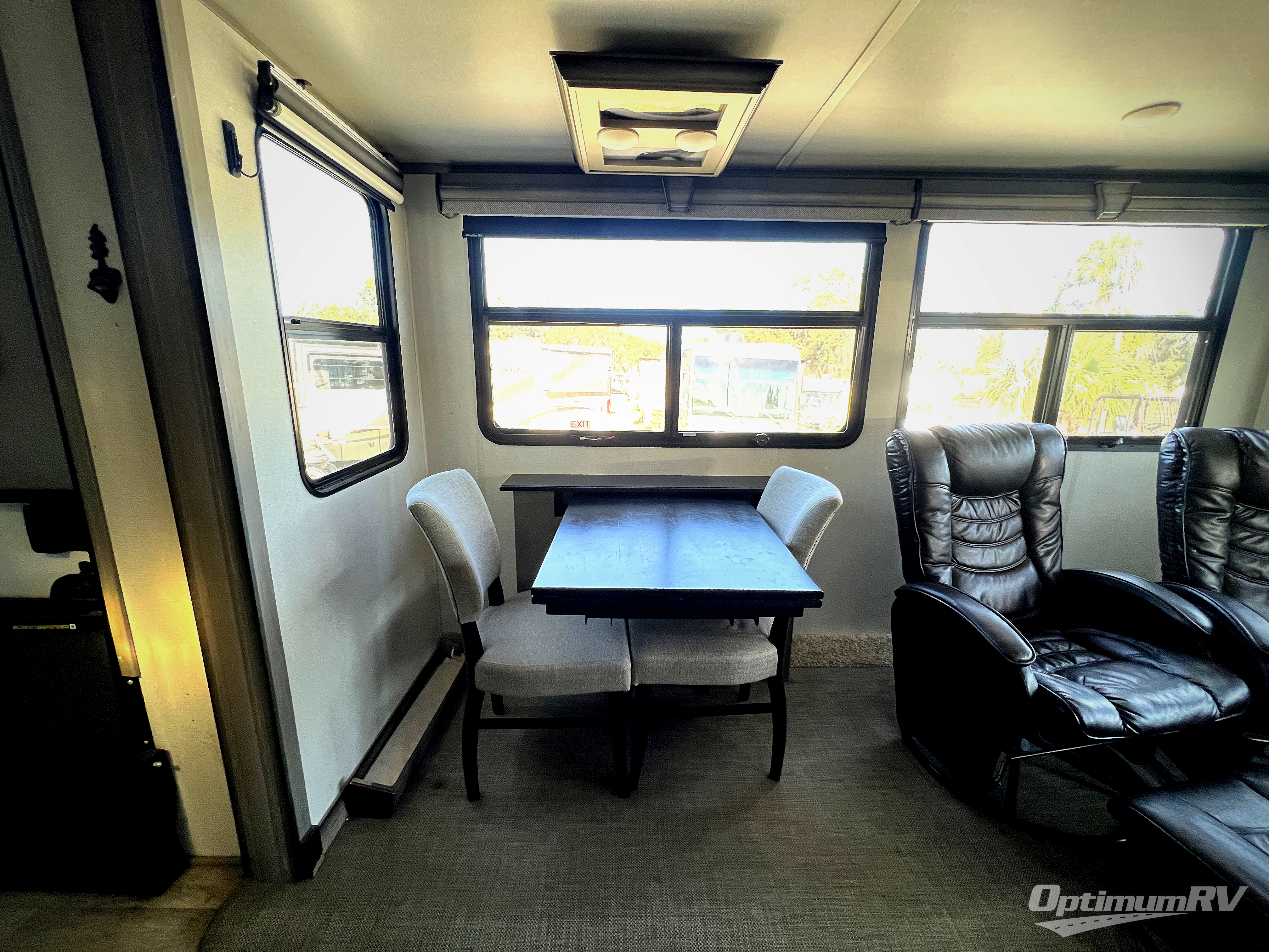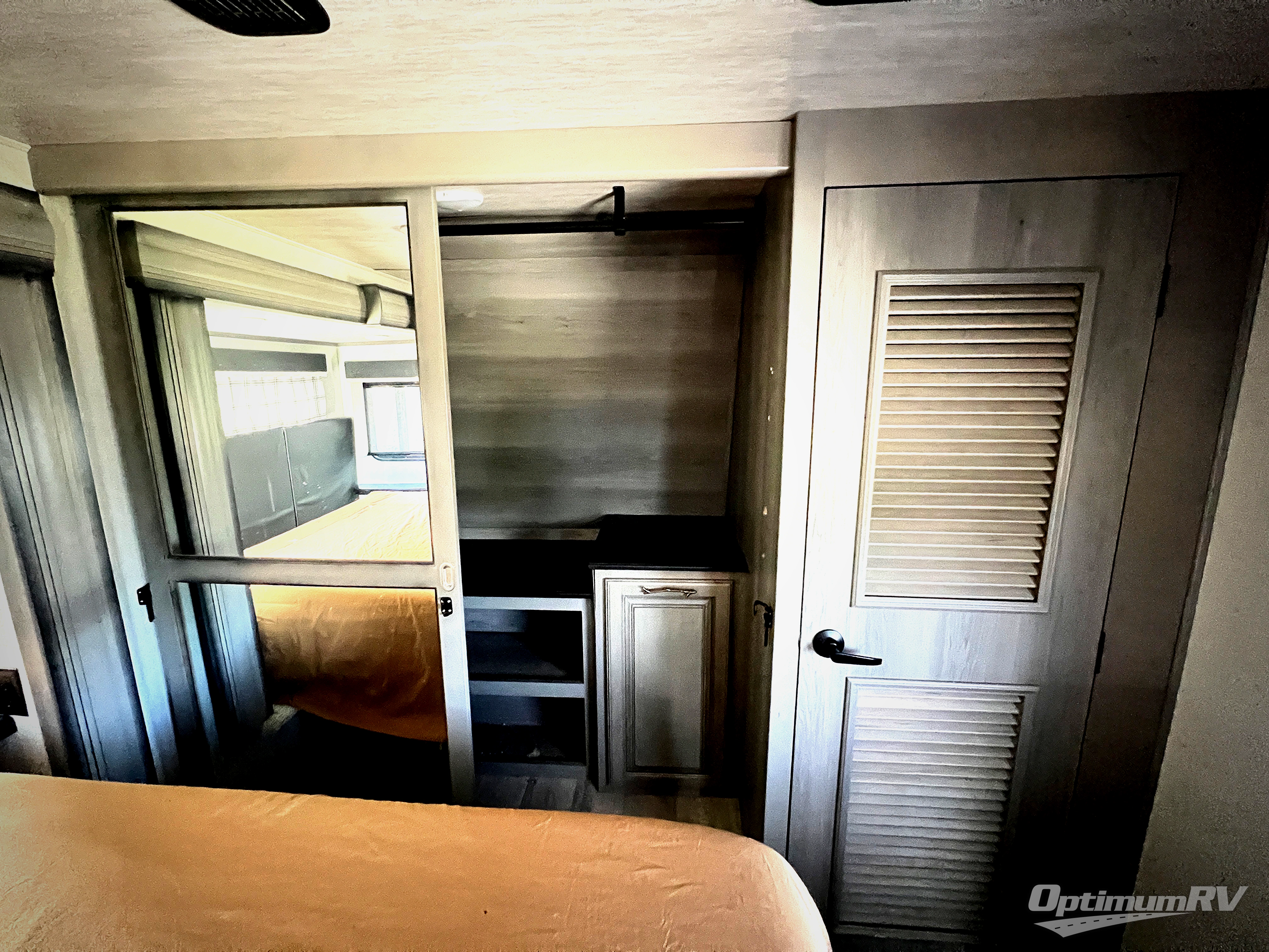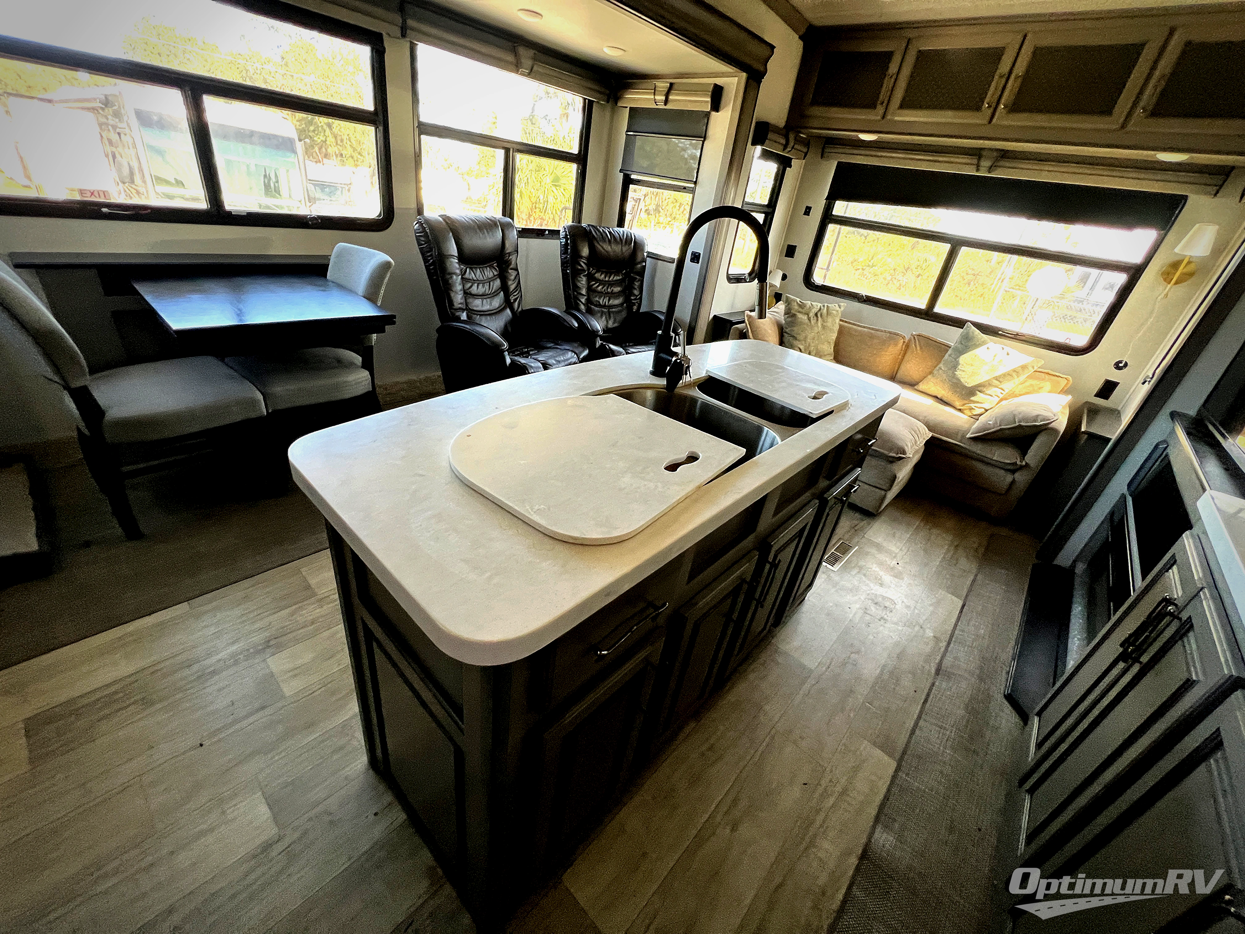 This Montana fifth wheel is absolutely amazing, and it will be extremely useful when it comes time for another getaway! One feature that makes this fifth wheel so great is the front private bedroom. This bedroom has a barn door that closes it off, and it also has a queen bed slide, a full-width closet with a space prepped for the optional washer/dryer, under-bed storage, a dresser, and a 32" LED HDTV. Right next to the bedroom is the bathroom that has a dual-sink vanity and 48" x 30" shower, and when you head out into the main living area, you will find lots of living space thanks to the opposing slides. Take a load off and sit back on the power theater seating, or you can sit down with a snack at the dinette with four chairs and storage. The kitchen also provides you with lots of amenities, like two pull-out pantries, a pull-out countertop, an island, an 18-cubic foot residential refrigerator, and a residential range hood.