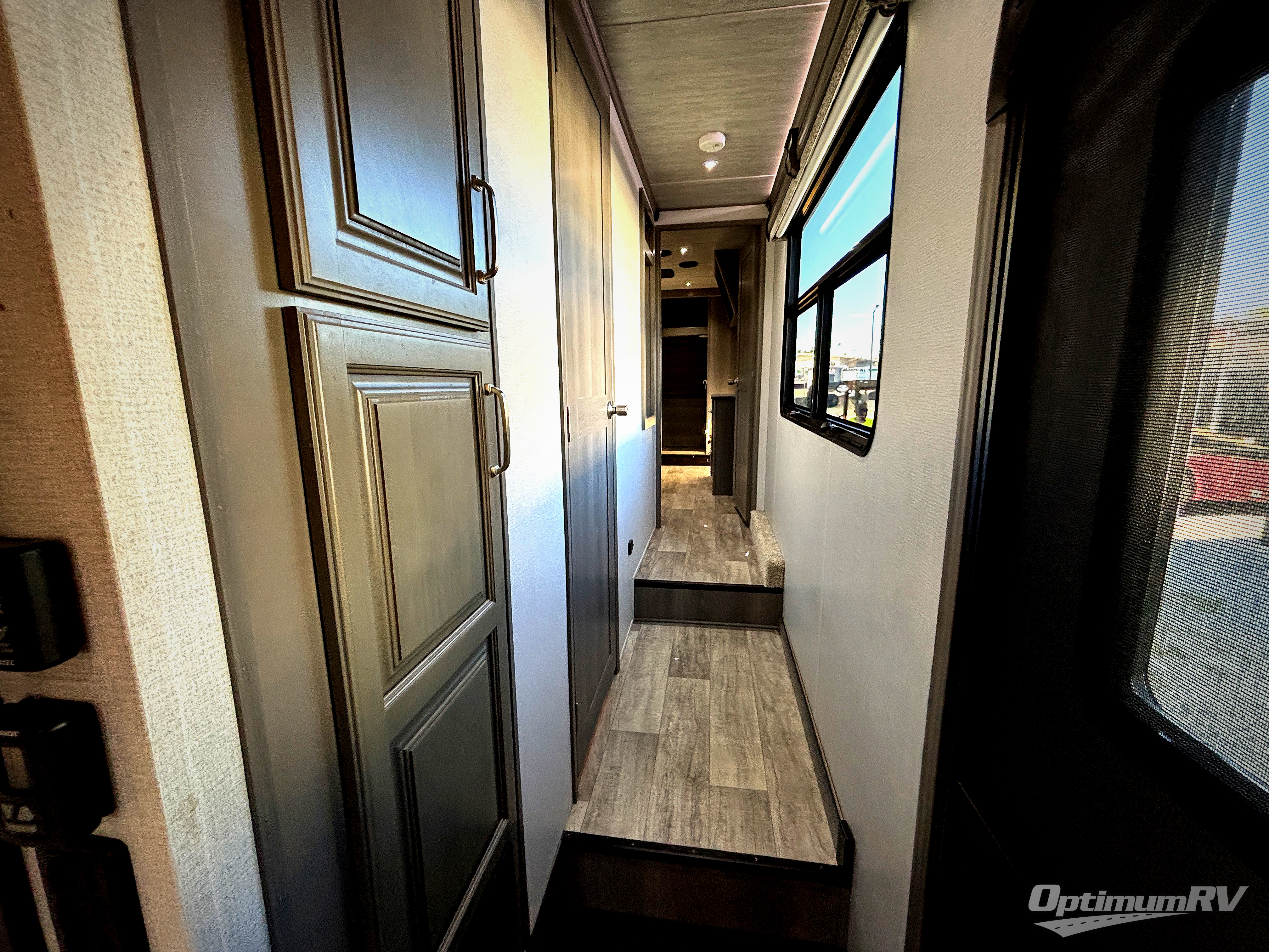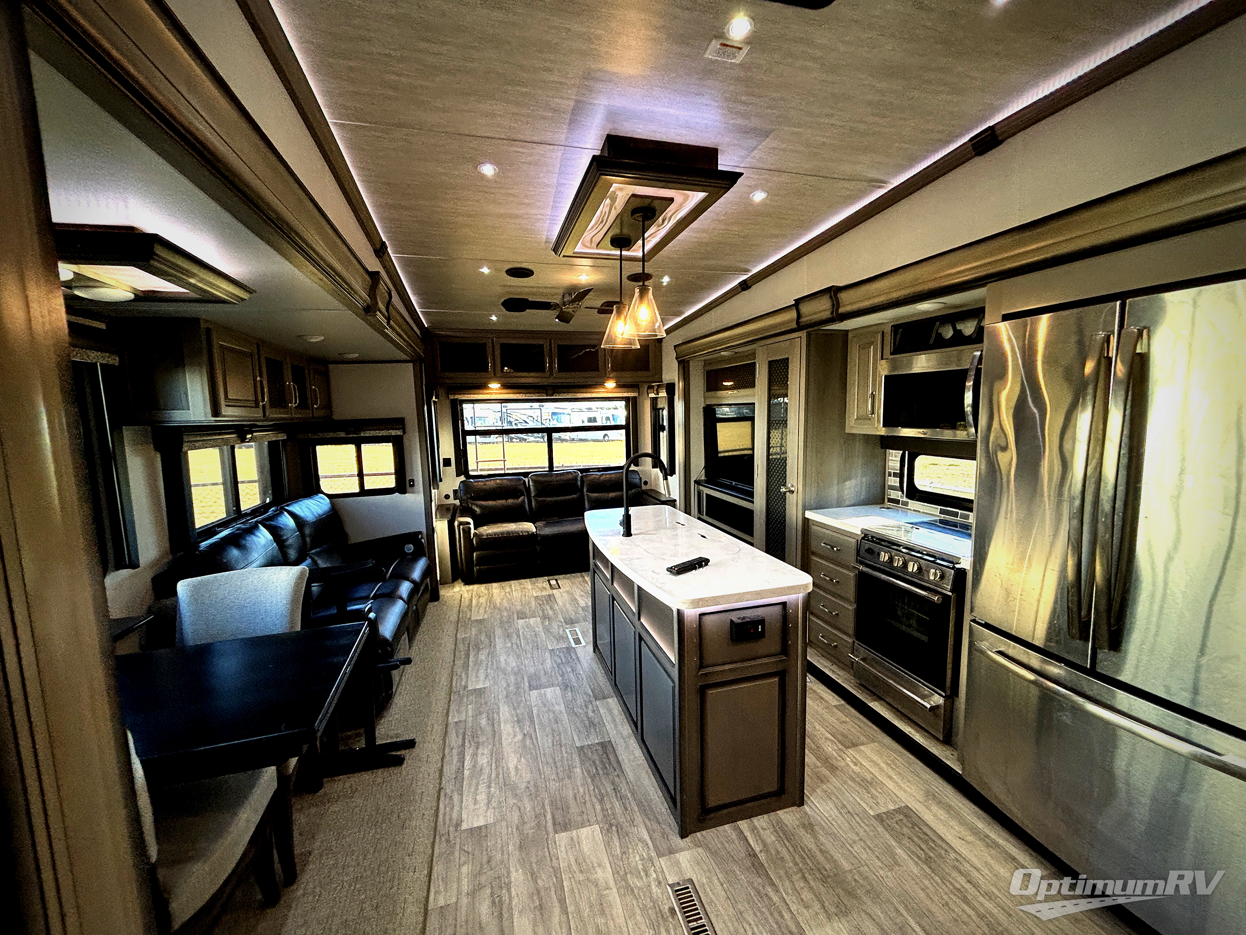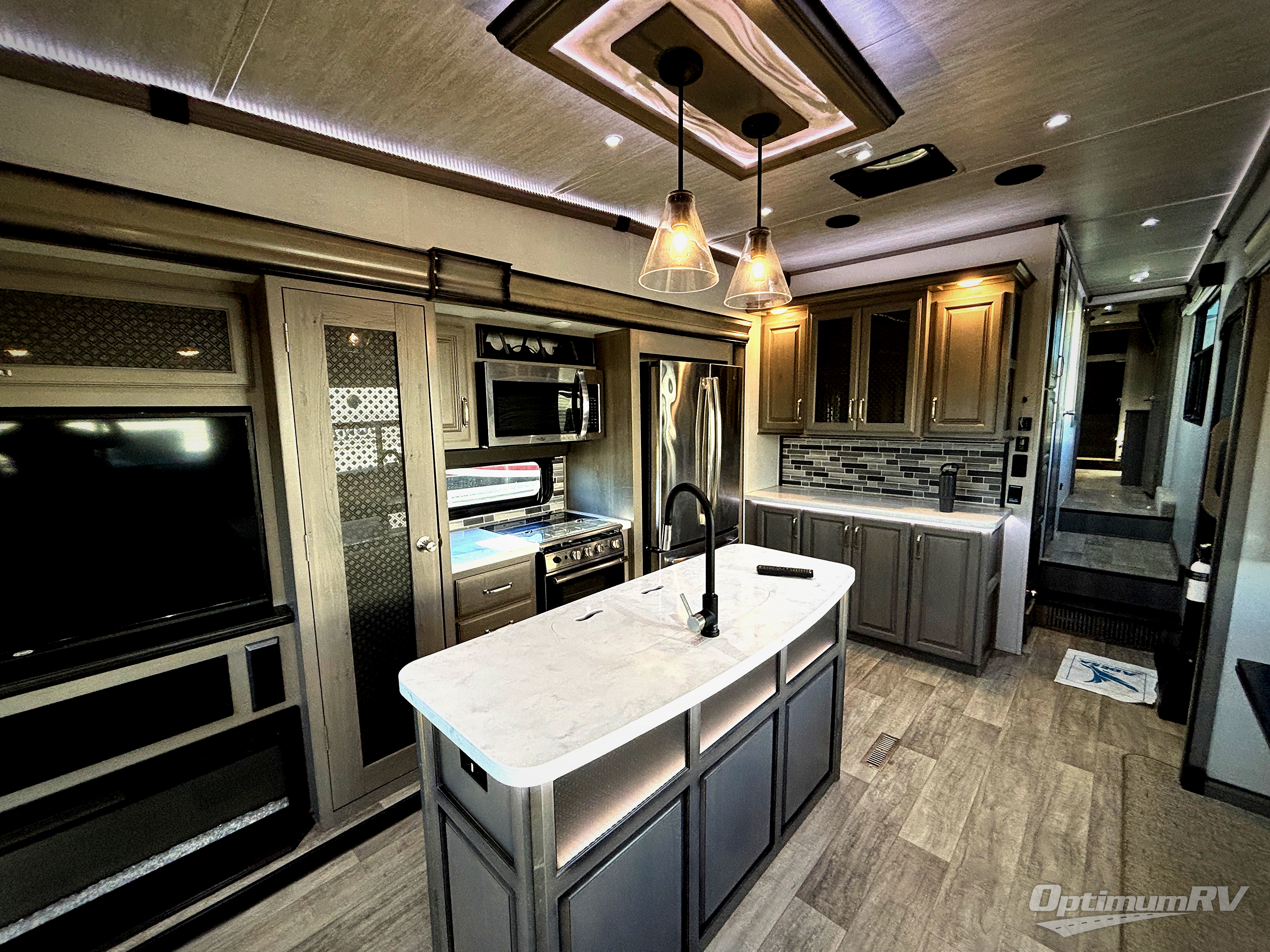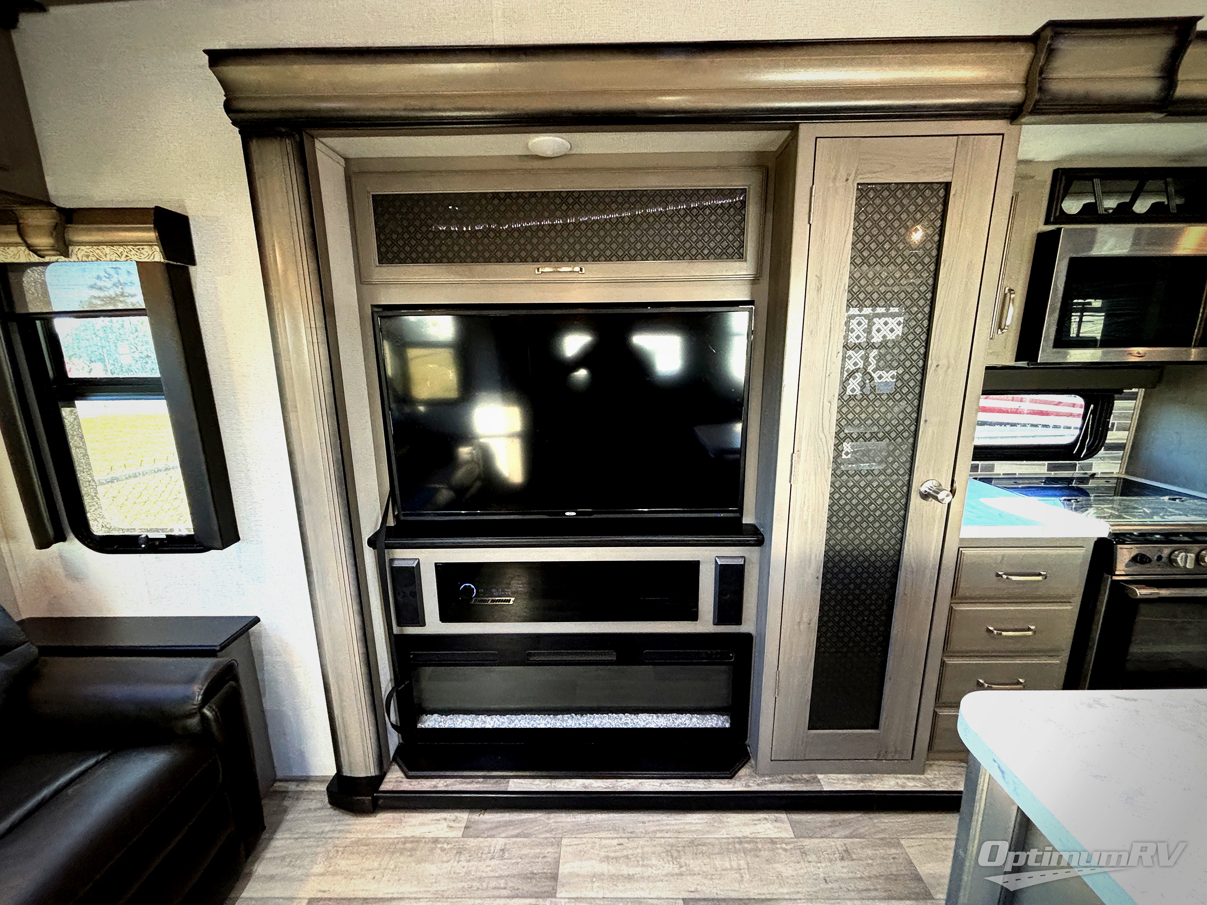 With a large, unique master suite, this Montana fifth wheel is sure to provide you with the very best vacations! Not only does the bedroom have one full-width closet, but it also has a second walk-in closet which makes this space feel glamorous. Plus, you have even more storage space with the under-bed storage, and the 32" LED HDTV rests on the dresser across from the queen-size bed so that you can easily view the news before bed. The bedroom connects to the dual-entry bathroom so that you can have discreet access into the 48" x 30" shower in the morning, and once you make your way out into the main living area, you'll be pleasantly surprised to find power theater seating across from the fireplace and 50" LED HDTV for an additional lounge space.