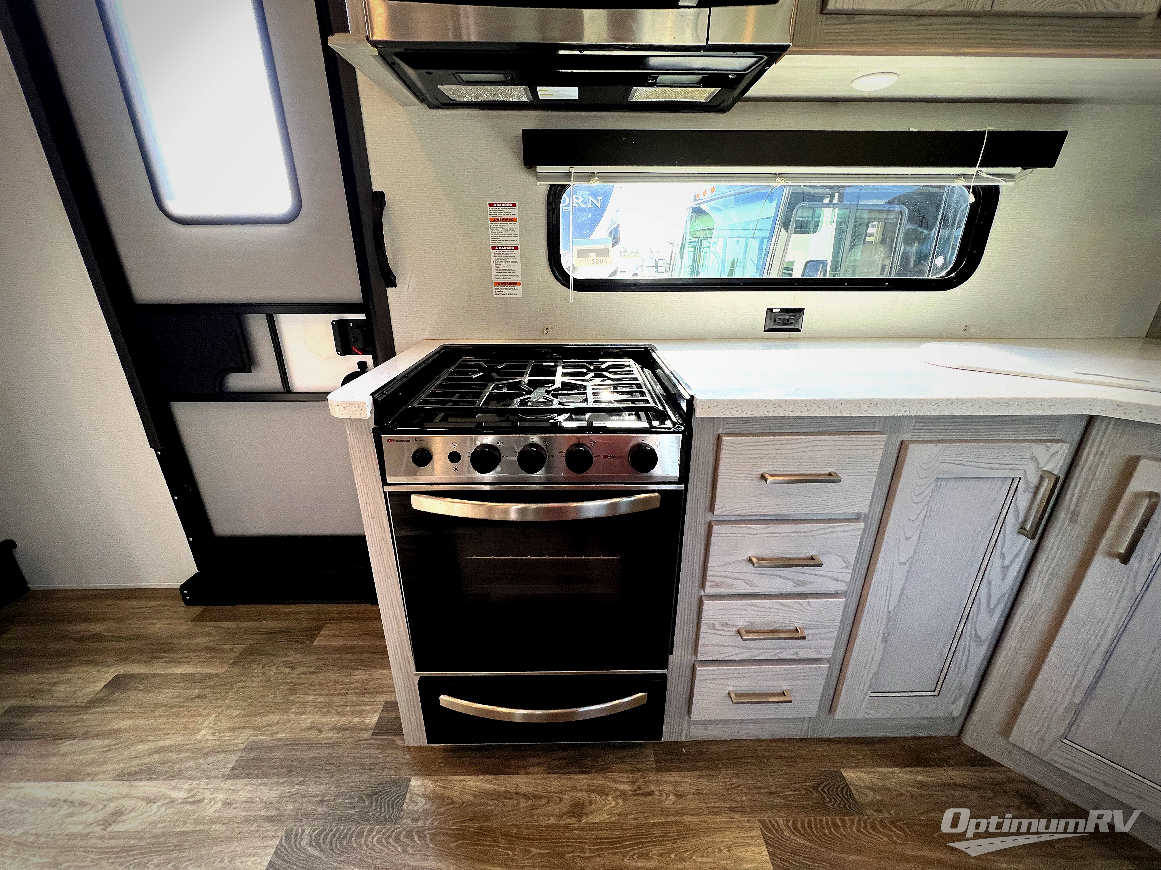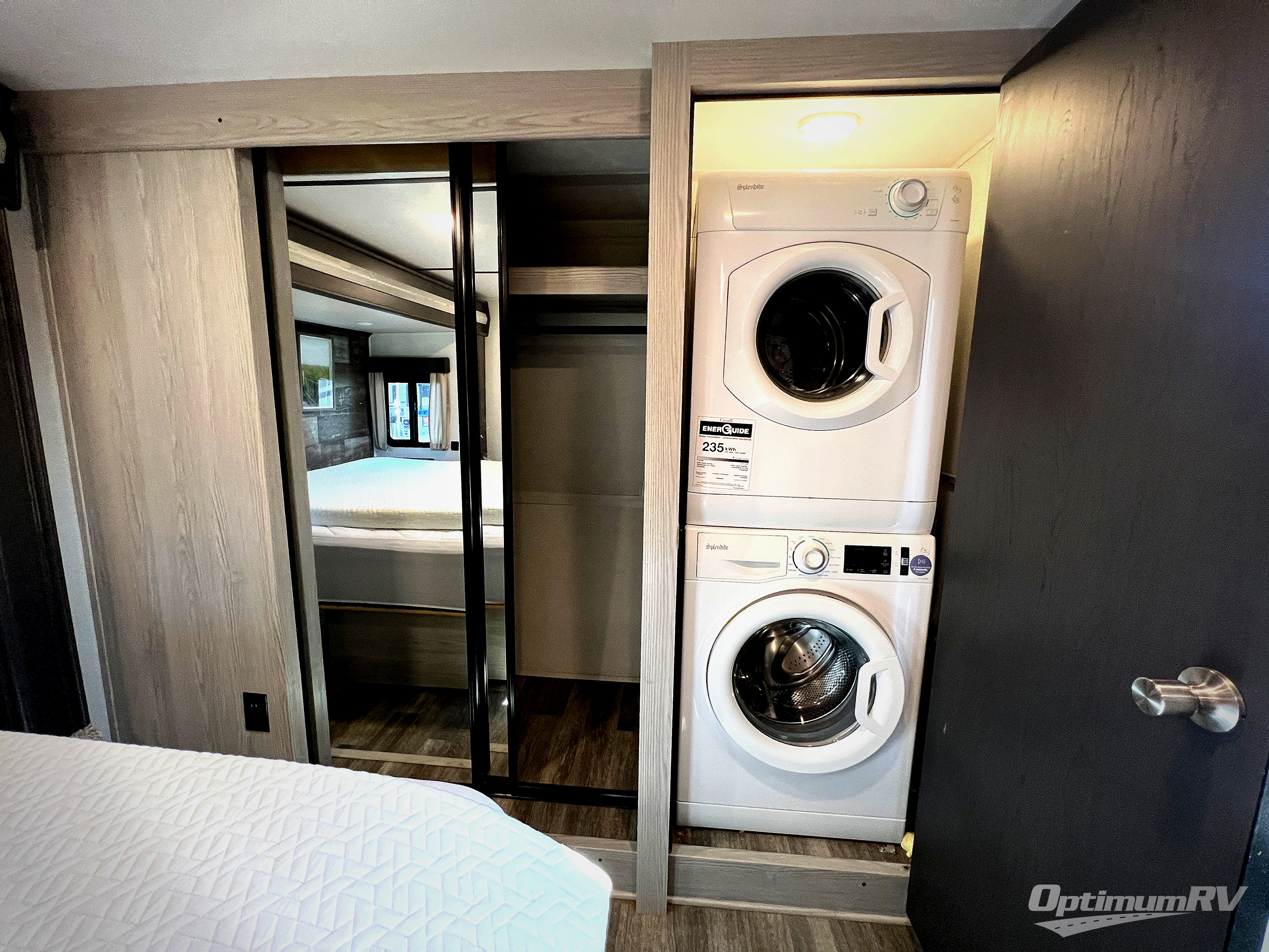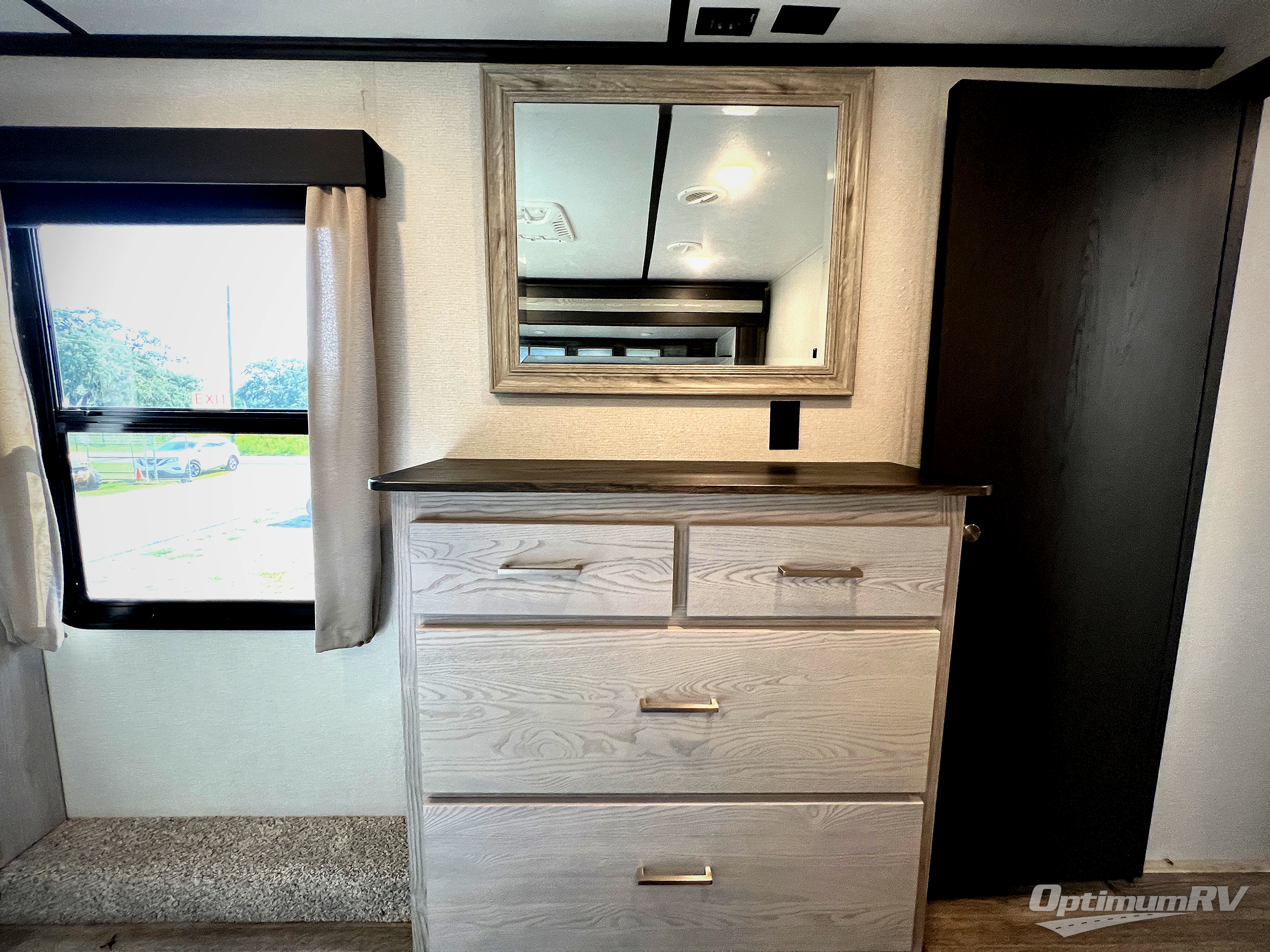 You and your family will enjoy the separate elevated den while watching the LED HDTV above the fireplace on either the dual hide-a-bed sofa slide outs, or the power theater seats. The separate kitchen area features a coffee station for the coffee lover in the family, a large pantry for your canned goods and snacks, a range with a glass top, and a residential refrigerator, plus a residential microwave. Outside you will find an outdoor living space under the awning once you place your camp chairs and mat down. The exterior storage tray slide out allows you to bring those larger items such as fishing poles, an outdoor table, and extra totes.
