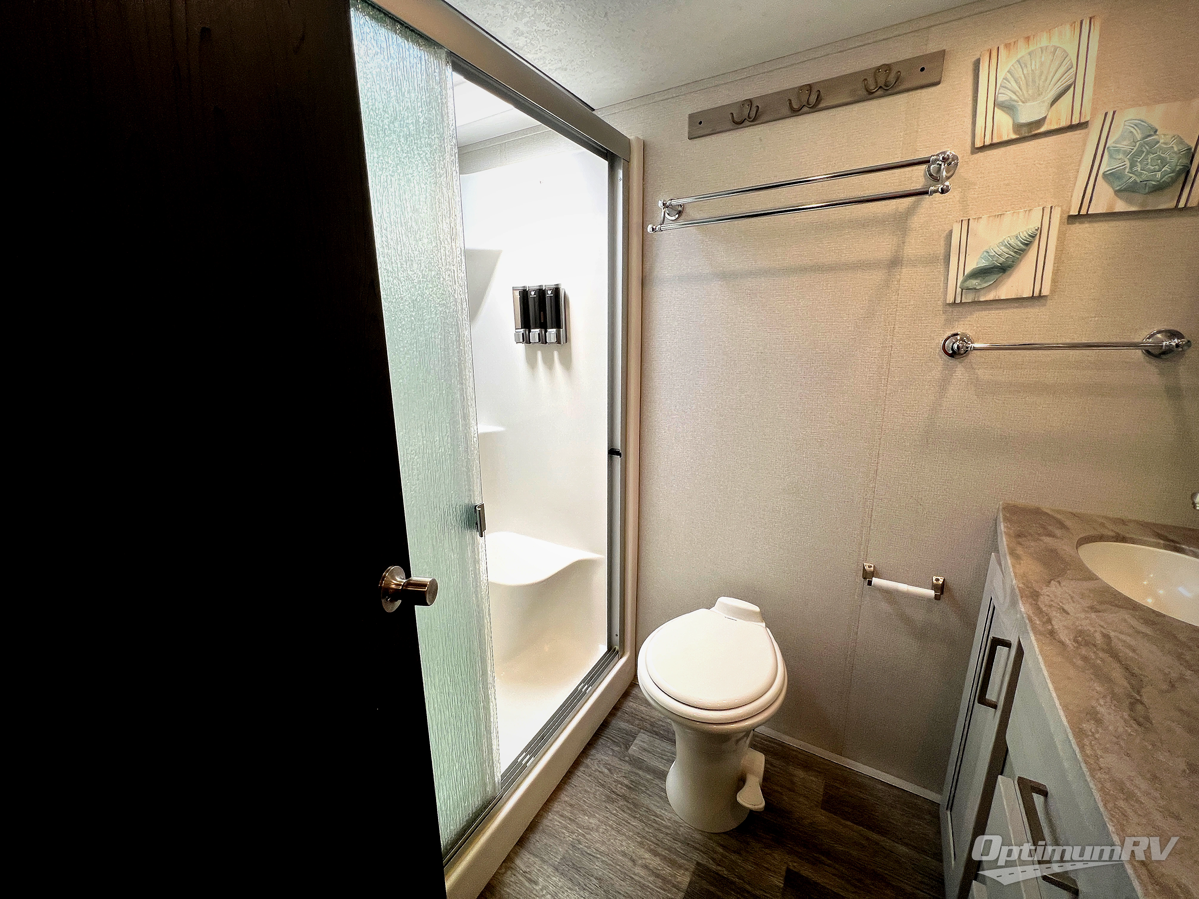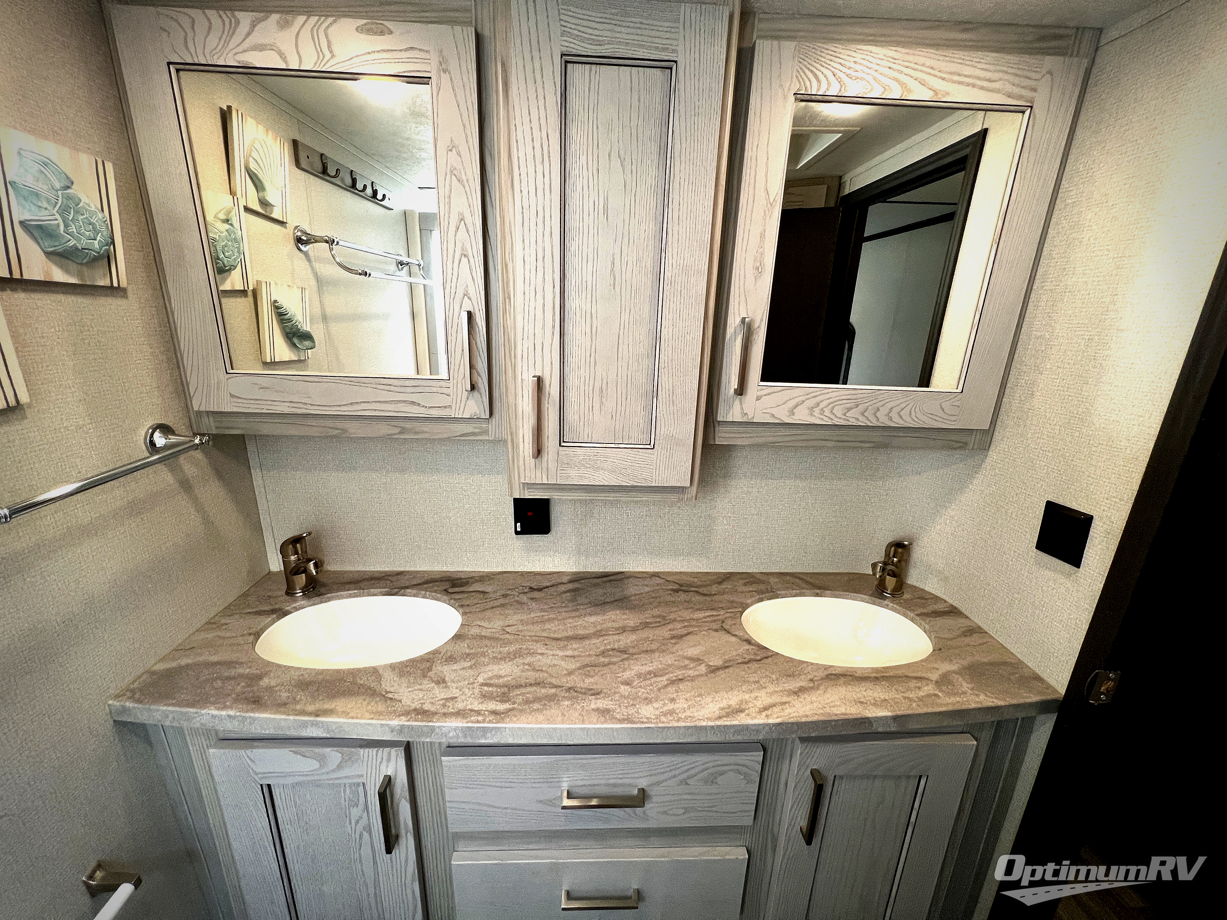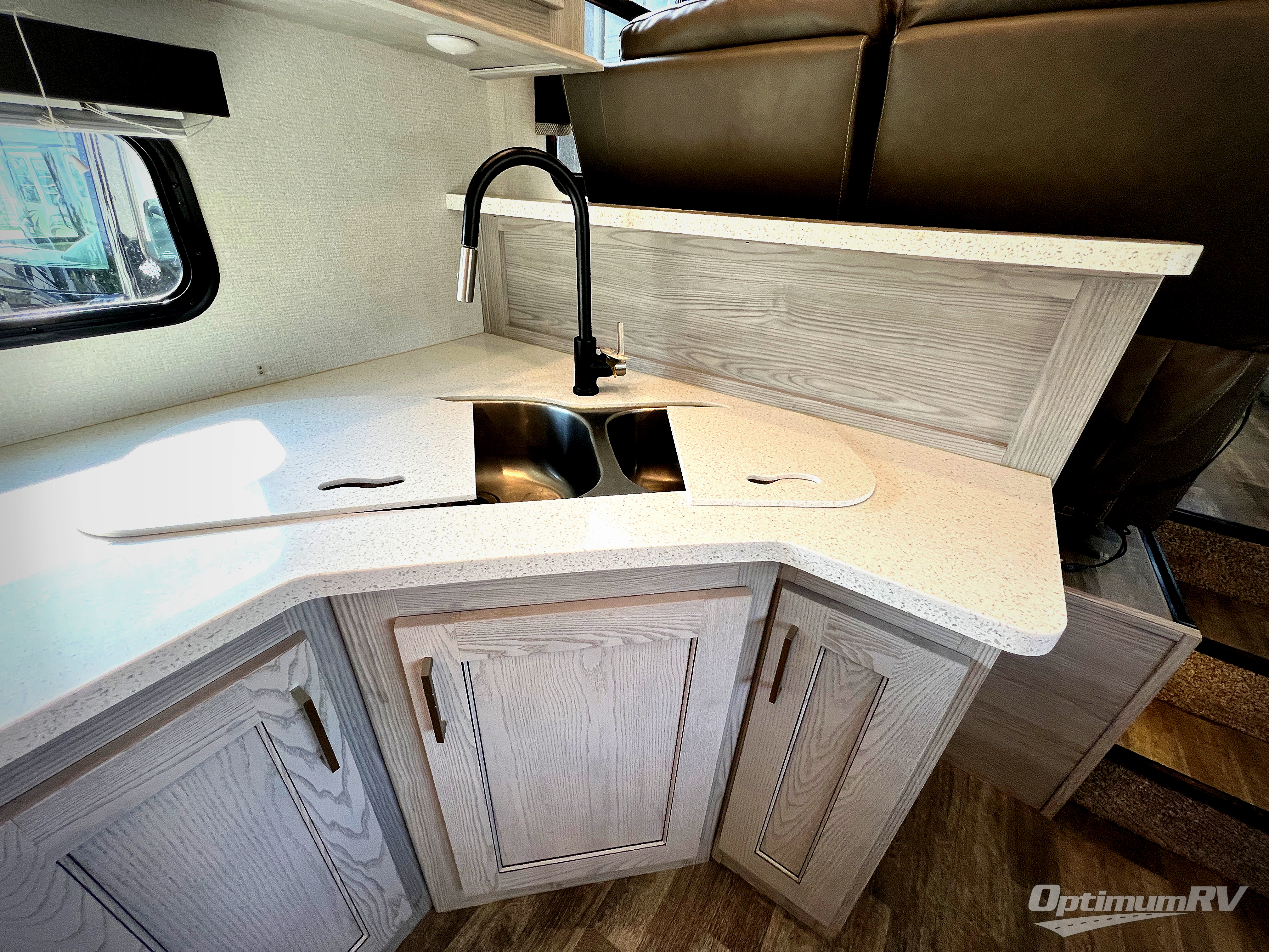 You and your family will enjoy the separate elevated den while watching the LED HDTV above the fireplace on either the dual hide-a-bed sofa slide outs, or the power theater seats. The separate kitchen area features a coffee station for the coffee lover in the family, a large pantry for your canned goods and snacks, a range with a glass top, and a residential refrigerator, plus a residential microwave. Outside you will find an outdoor living space under the awning once you place your camp chairs and mat down. The exterior storage tray slide out allows you to bring those larger items such as fishing poles, an outdoor table, and extra totes.