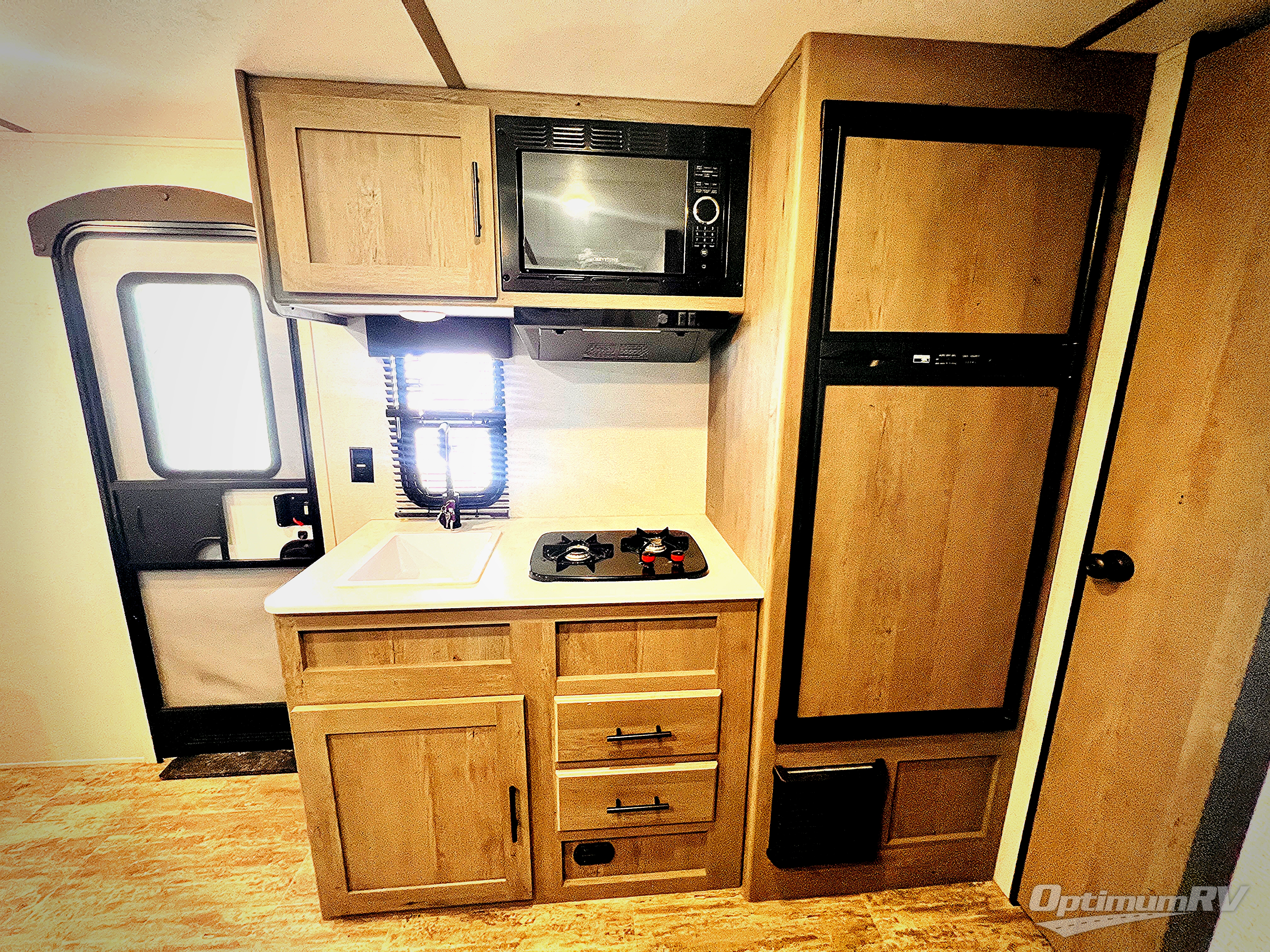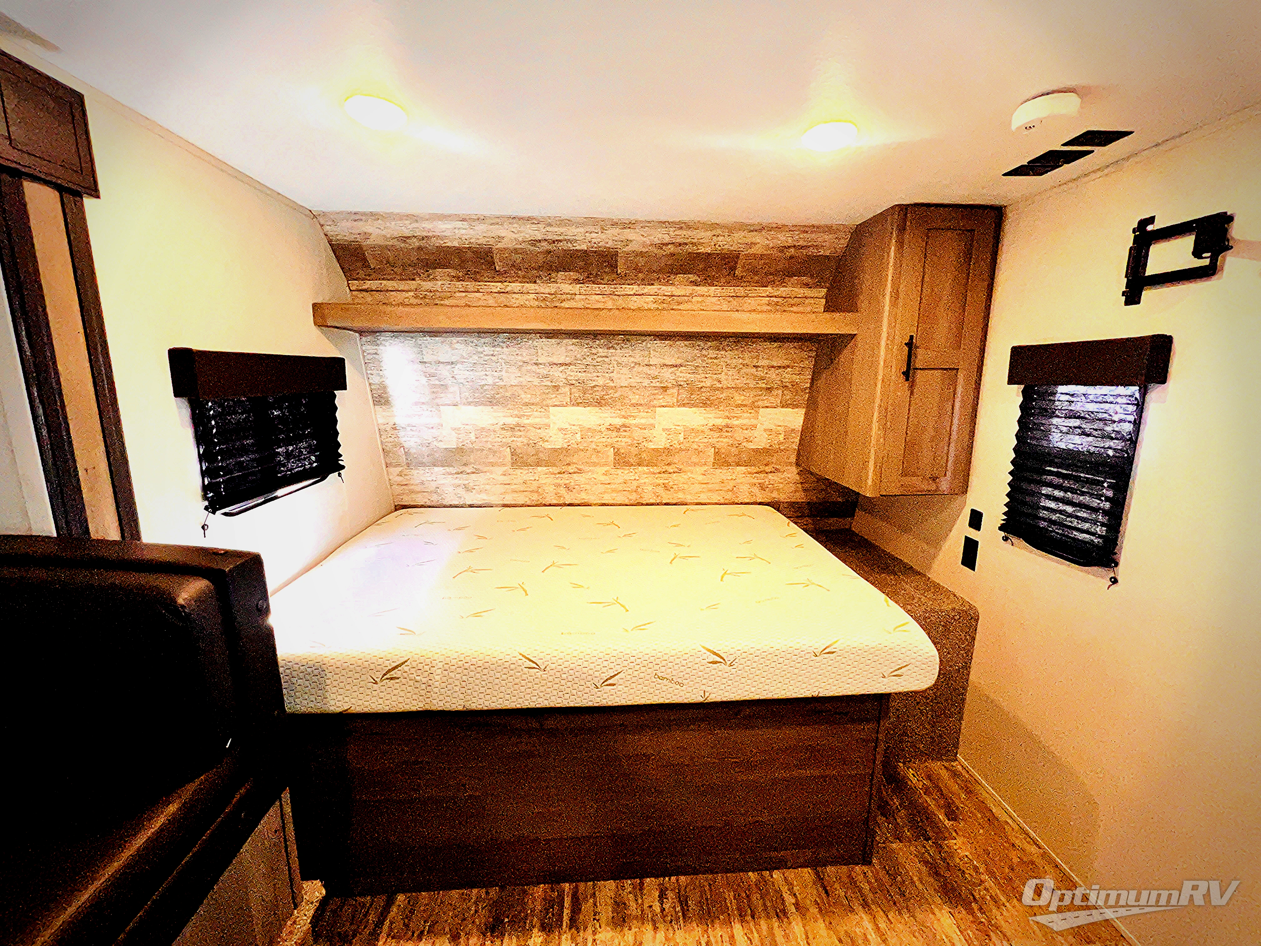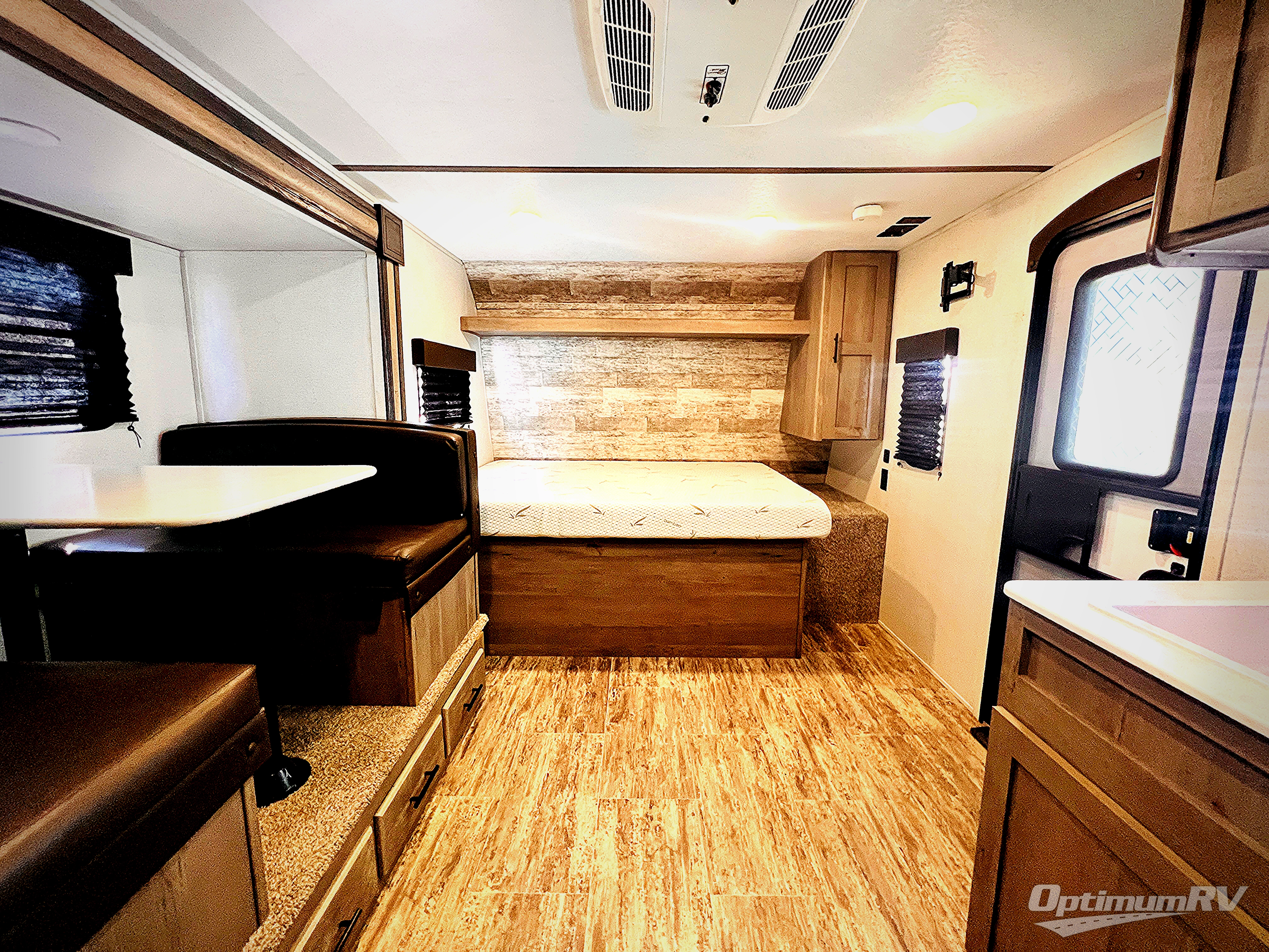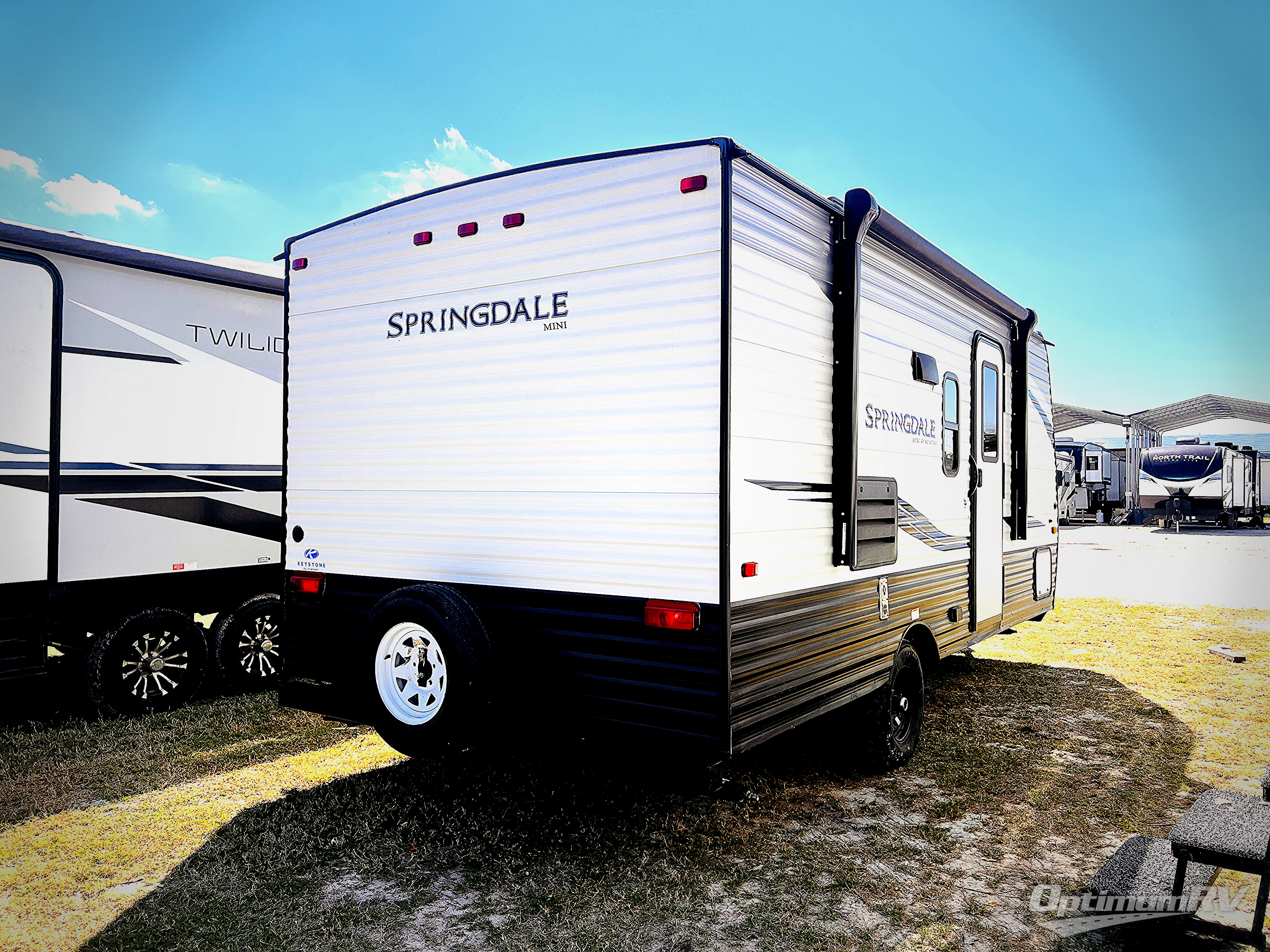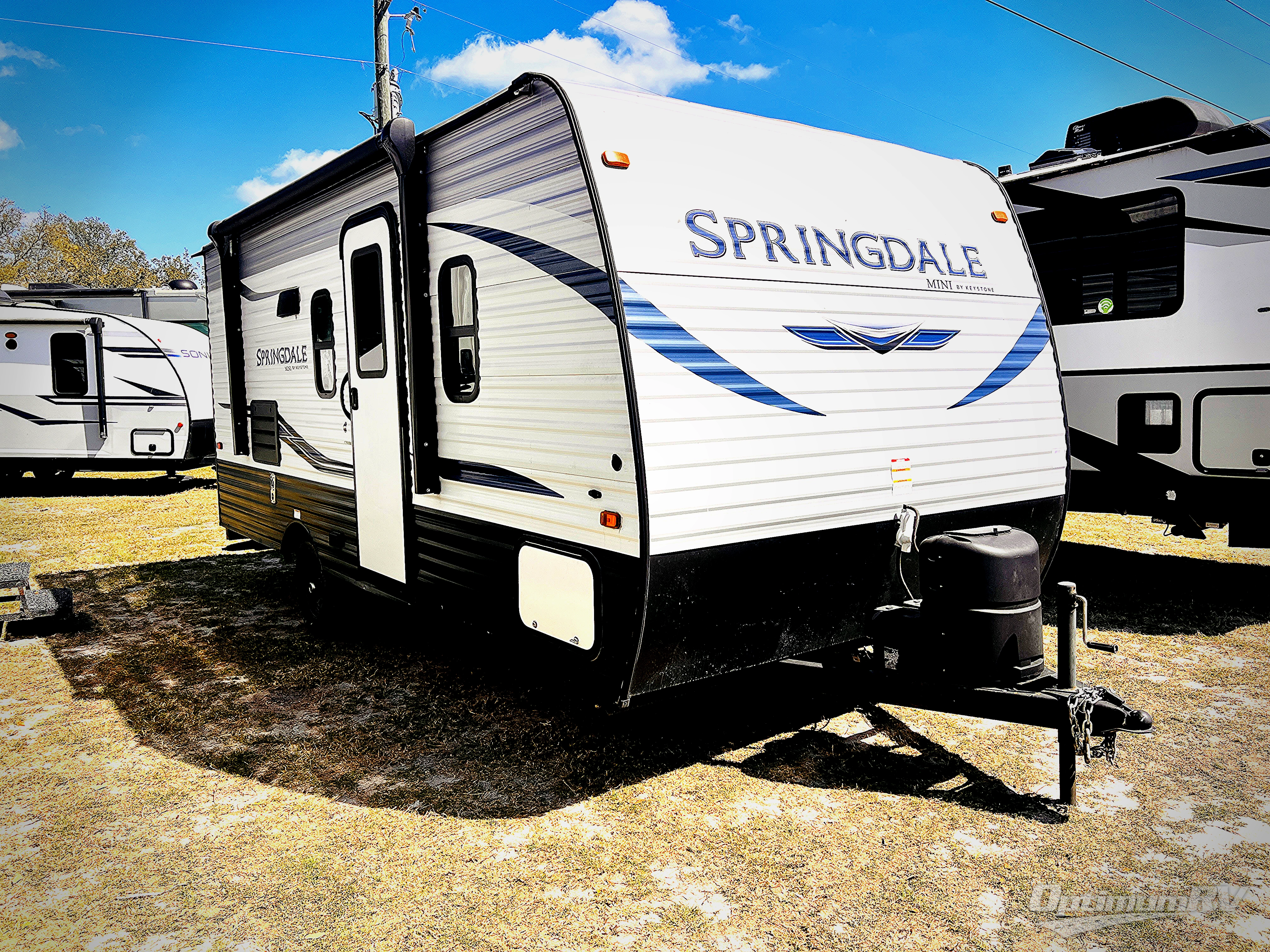 If you're ready for camping near or far, you will want an easy to tow, lightweight Keystone Springdale Mini travel trailer. These models include a power awning with LED lights, a pass-through storage compartment for all your gear, and LCI SolidStep entry steps for your convenience. The interior is made bright and open with a Whitewashed brick accent wall, larger windows, and lighter vinyl flooring throughout. You will find many convenient storage solutions, such as wall-mounted cargo nets next to each USB port for your tablet, camera, or phone, two shelves above the bed for your books, and easy access storage under the sofa or bunks where applicable. These travel trailers also include safety measures for your peace of mind, including GFI receptacles, smoke and carbon monoxide detectors, a fire extinguisher, plus more!