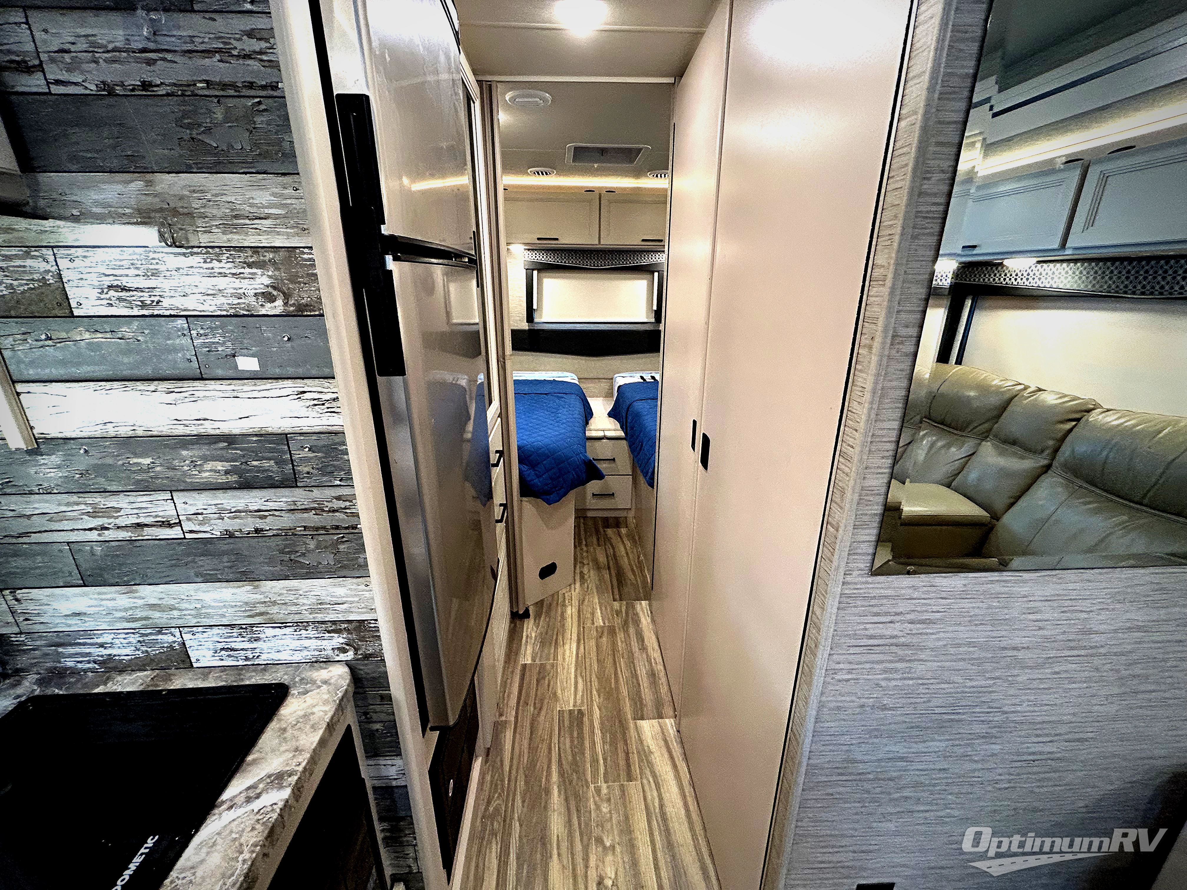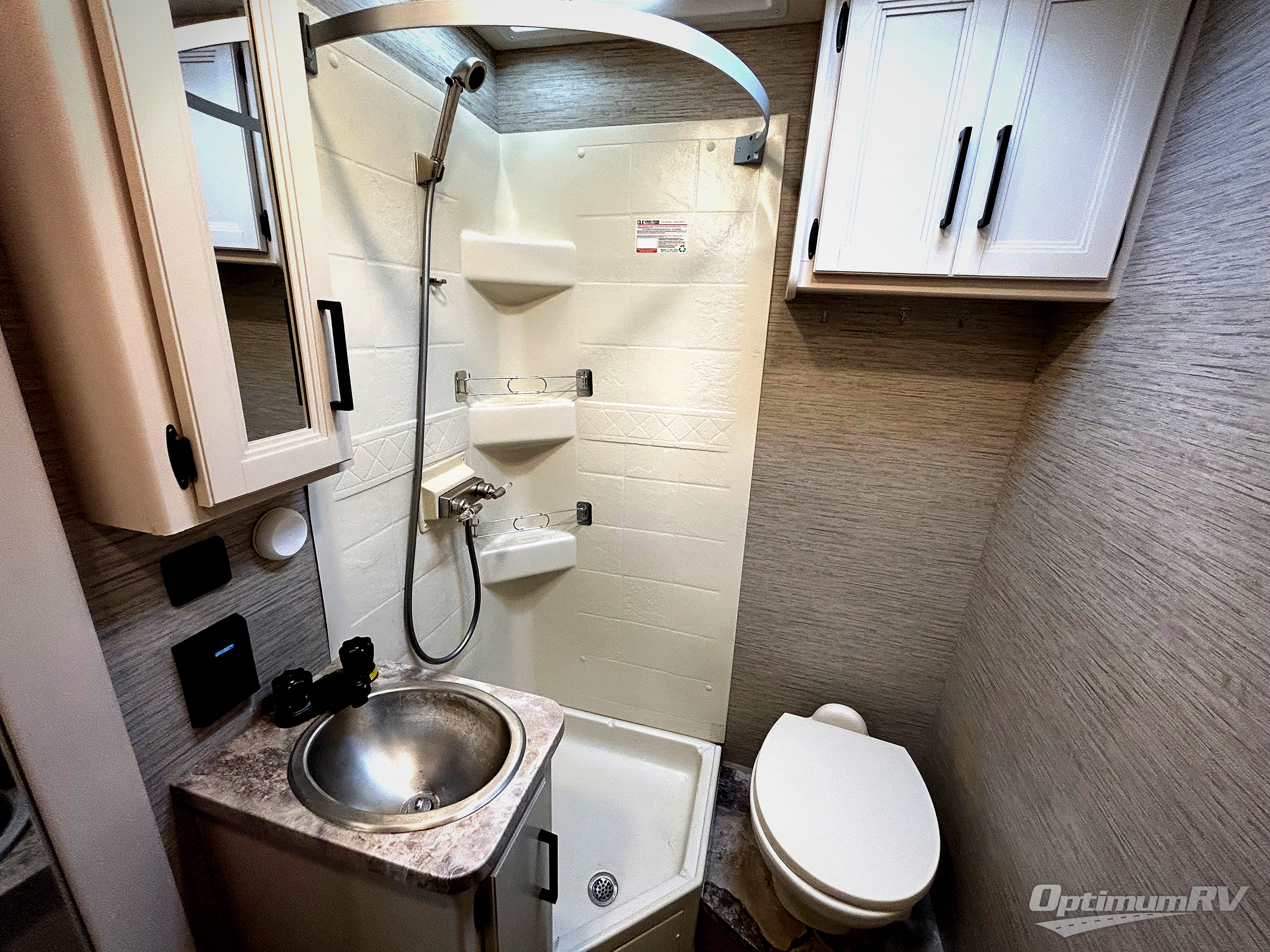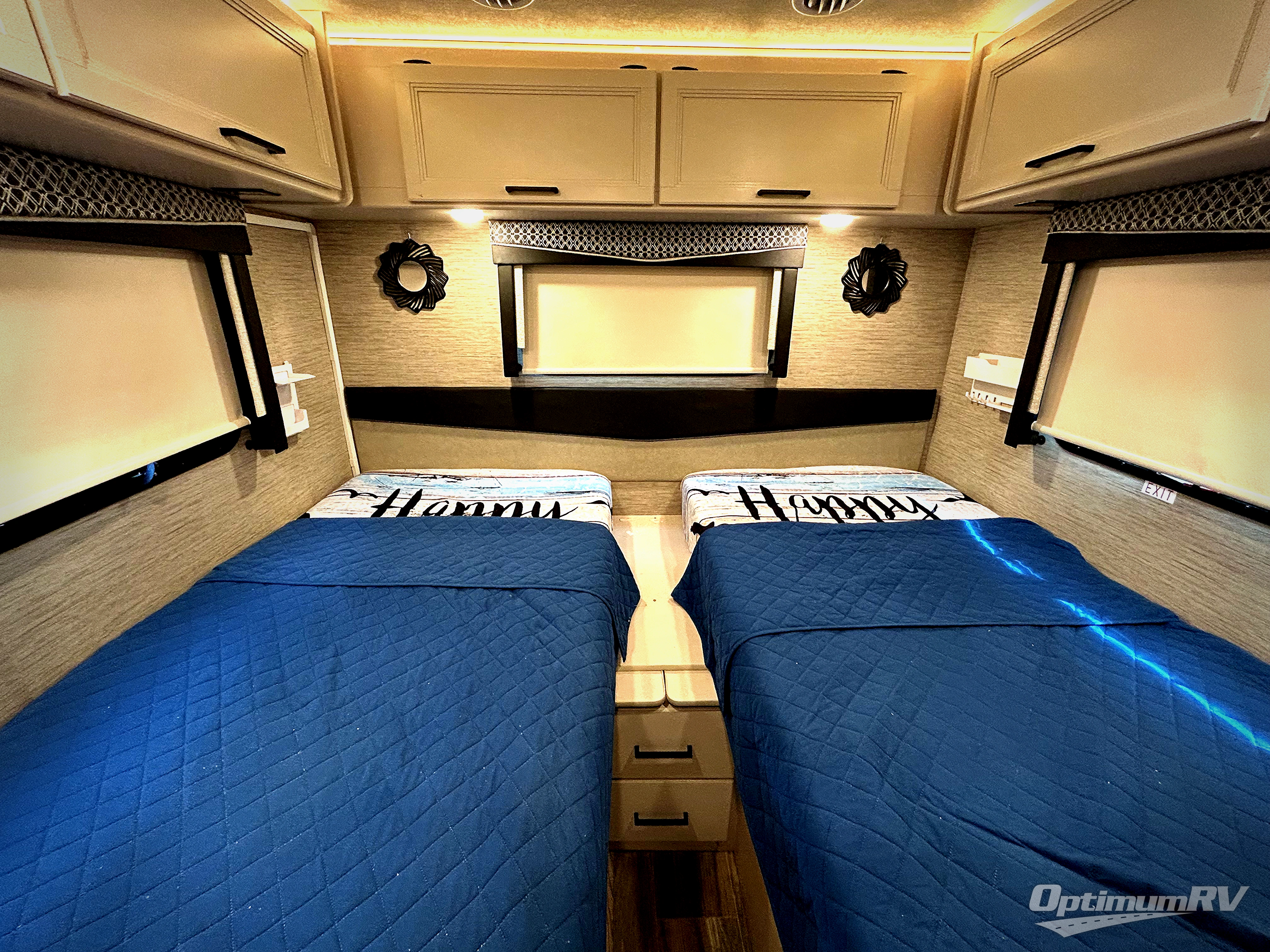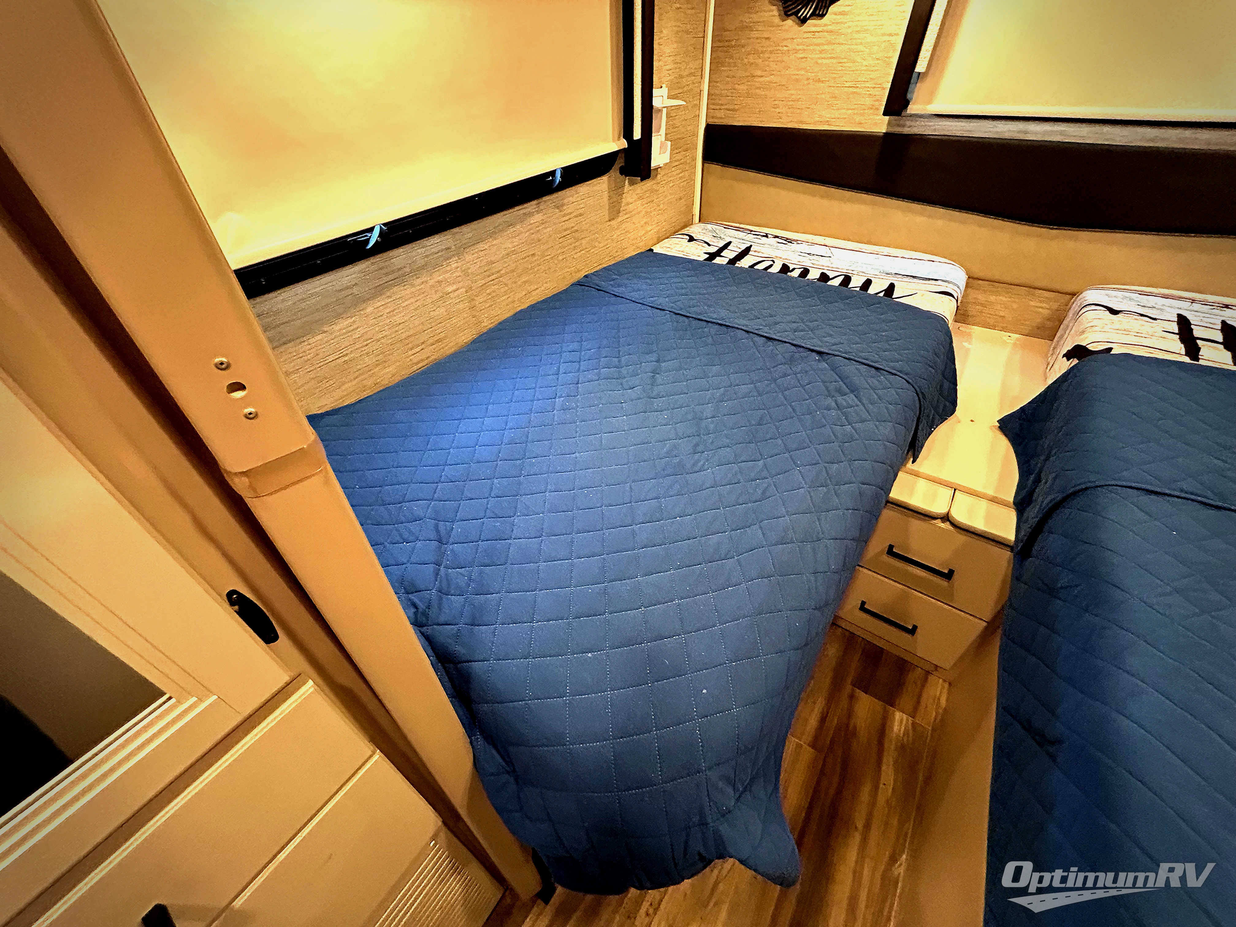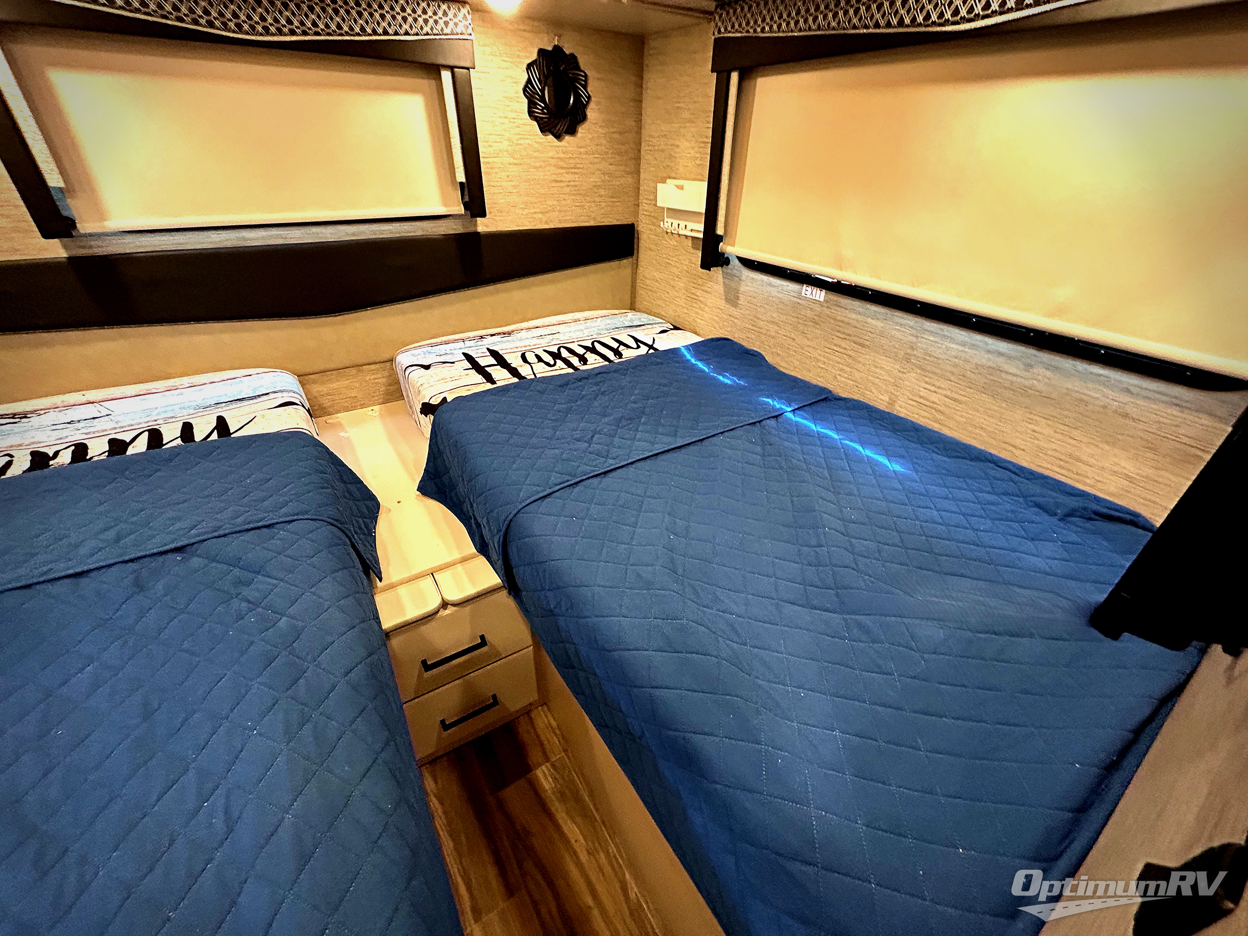 Pack your bags, grab your spouse, and head out to the open road with this motorhome! The two rear twin beds can convert into a king bed and the 32" TV lets you drift off to sleep watching your favorite movie. You won't need to get ready at any public facilities either thanks to the full bathroom with a 27" x 27" neo-angled shower for you to start off your mornings with a steamy, hot shower. Once you're ready for the day, you can head to the kitchen and grab some bacon to fry up on the two burner gas cooktop with electric start, and enjoy it at either the front captain's chairs with a coffee table in between or at the 68" sofa bed with a removable pedestal table. There is also a drop-down overhead bunk for you to bring along a couple kids or friends!