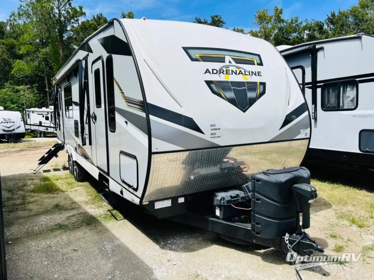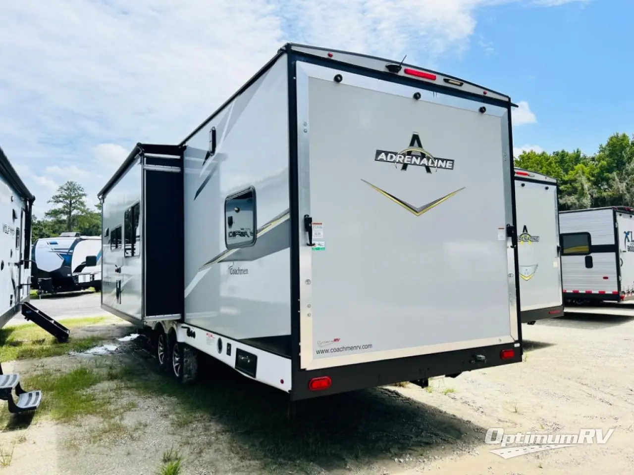 With any Adrenaline toy hauler travel trailer by Coachmen, the required Exterior Value package includes a one-piece Tufllex PVC roof membrane, a fiberglass front cap with rock guard to help against road debris, heavy duty Dexter axles with Nev-R-Adjust brakes and E-Z Lube, and aluminum wheels. Some exterior standards include a heated and enclosed underbelly, a patio ready ramp door with cables for an outdoor above ground space to enjoy, a power tongue jack for easy setup, and an outside spray port to clean off your toys. The interior standards include HD rubberized oil/gas/moisture resistant flooring in the garage area, shaker style cabinets and doors, a rear detachable screen, and USB charging ports in multiple locations for your electronics to mention a few.