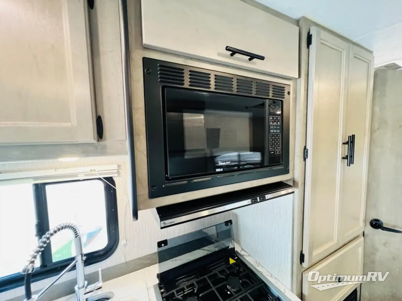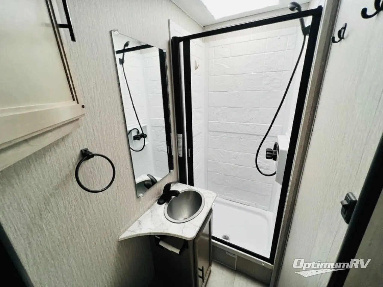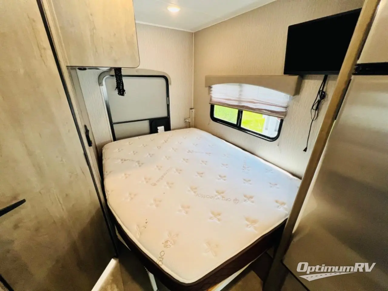 This coach is compact and full of features for you and your favorite person or family of three to enjoy road trips and camping in tighter spaces than most! The chef of your group can prepare a quick lunch on the two burner cooktop, and you can dine together on the dinette/sofa that offers sleeping for one at night. There is a large shower to clean up in, and the private toilet and sink is just across the hall so two people can freshen up at once. This coach also includes plenty of storage space, including in overhead compartments, a pantry for snacks and paper goods, and even under the double-size bed where you might like to store your bike through an extra large exterior door.