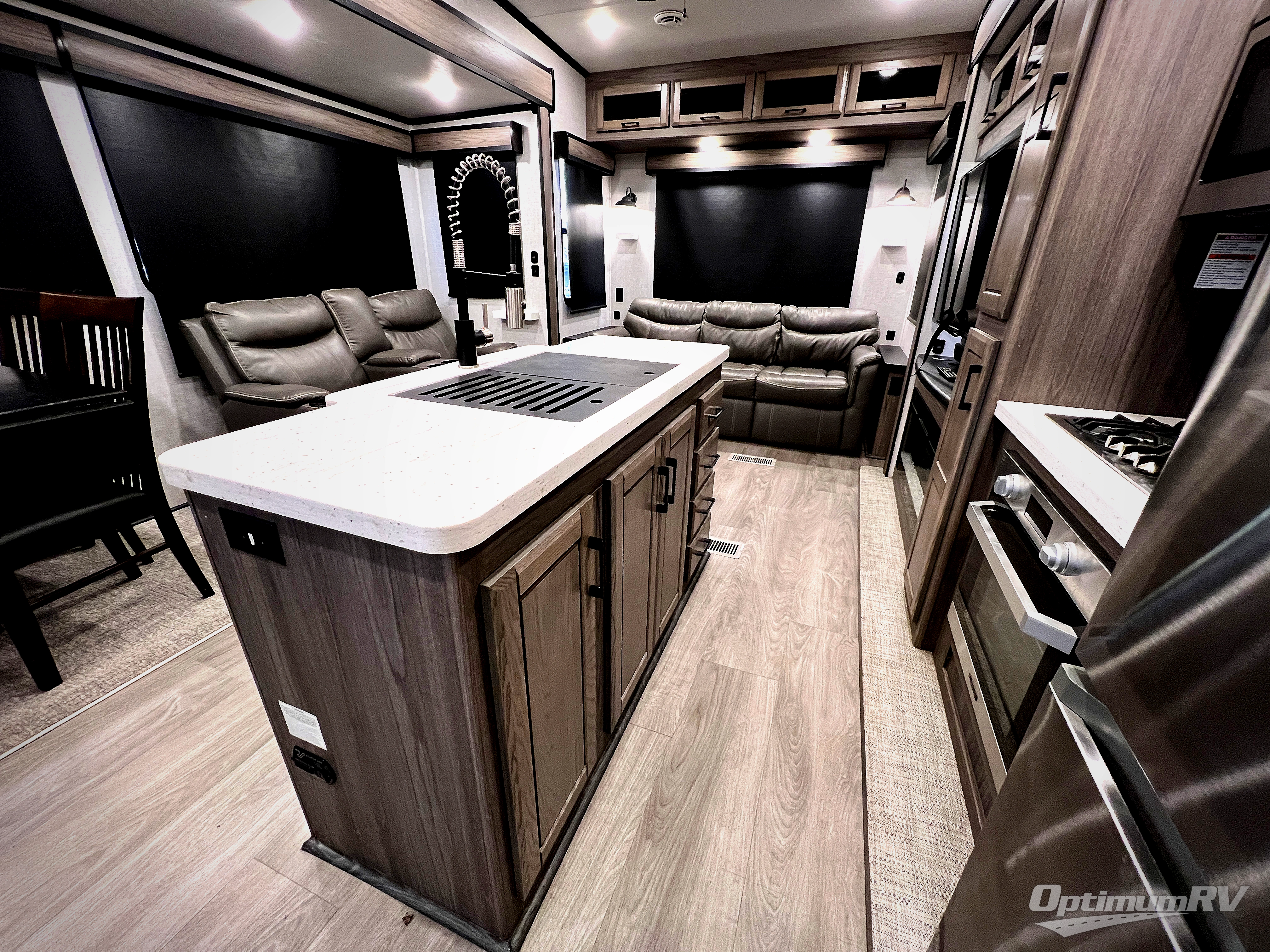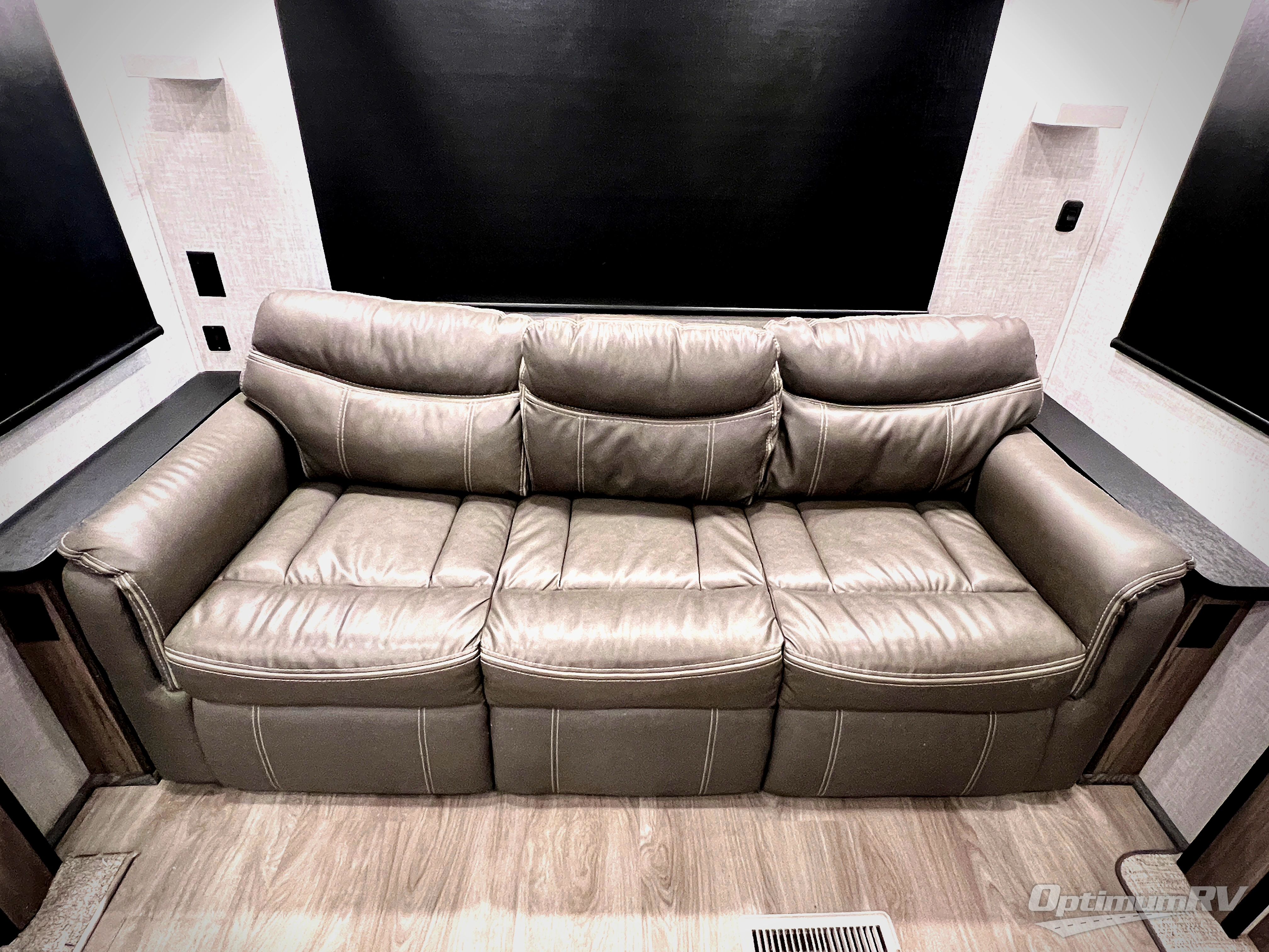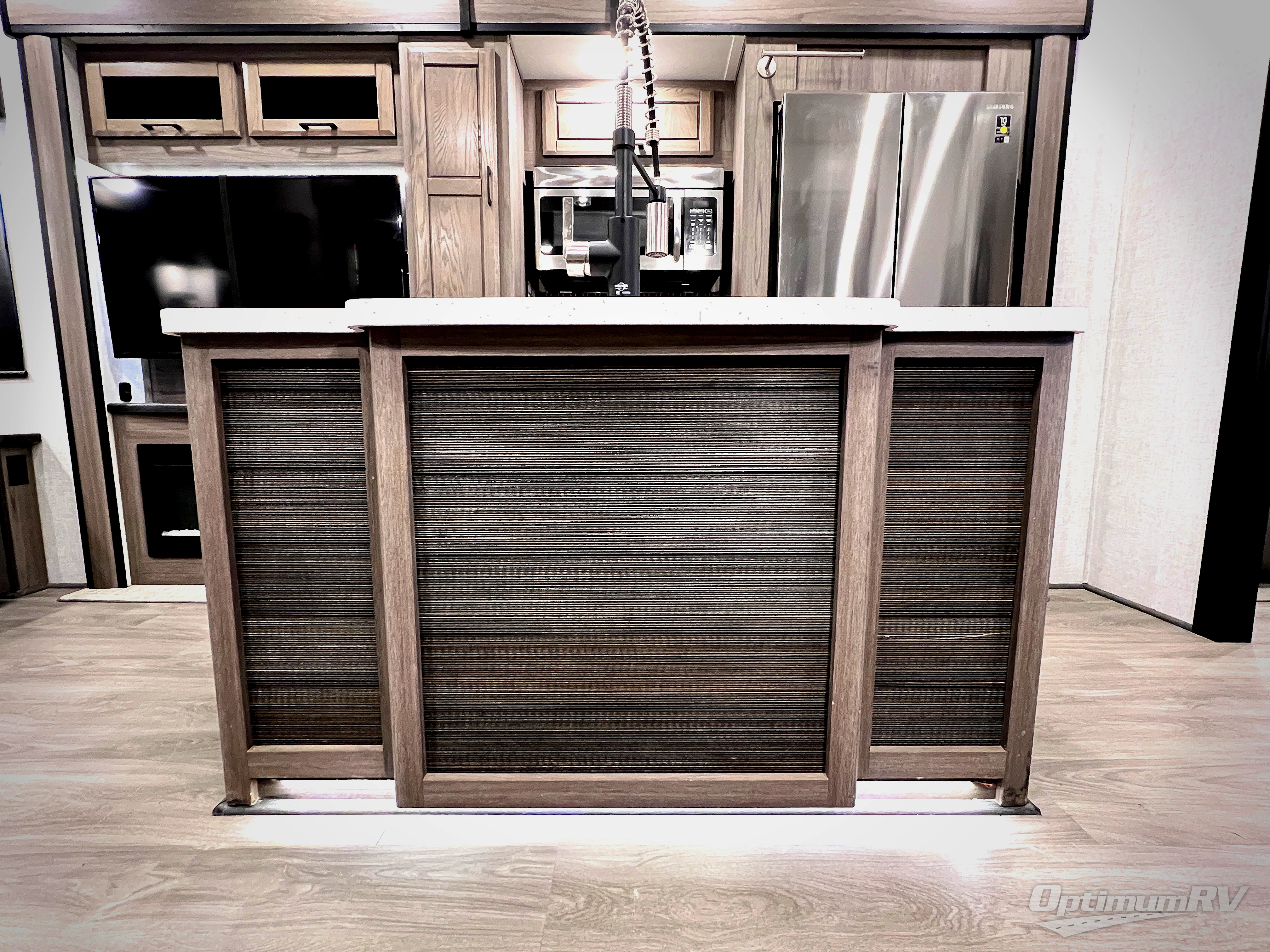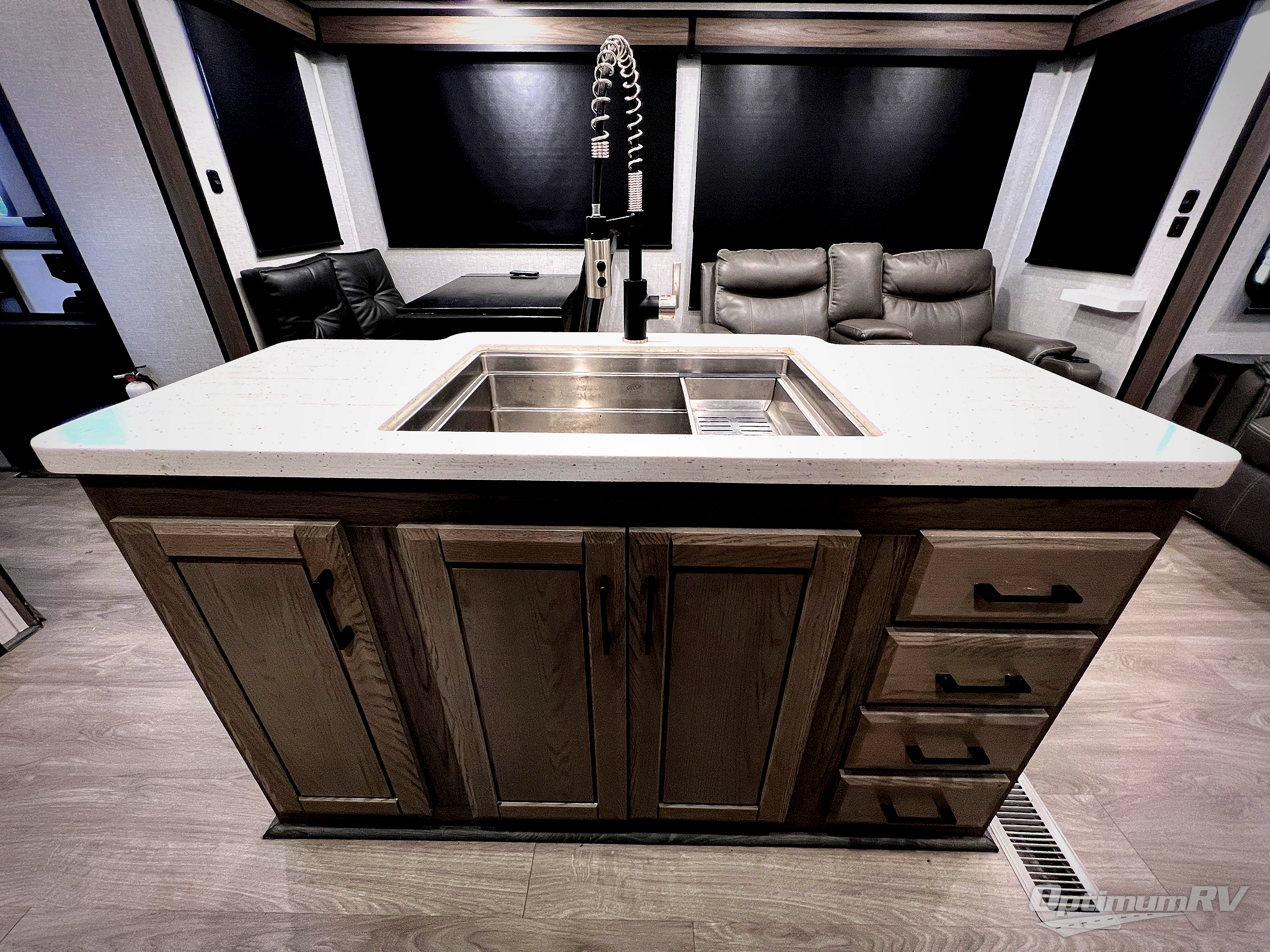 With two bedrooms, everyone will have their own comfortable place to sleep in this fifth wheel! The front private bedroom has a king bed slide, a dresser base with a fireplace and 39" TV, a bench seat, and a front closet that is prepped to add an optional washer and dryer. The second bedroom has a tri-fold sofa, a dresser, a wardrobe, and overhead cabinets, plus a loft above it all for storage or sleeping. Prepare your best home cooked meals with the Furrion kitchen collection and the kitchen island then enjoy them at the dinette. There is even an outside kitchen with a refrigerator, a sink, and a two burner cooktop to breathe in some fresh air while you cook and stay protected by the 18' power awning. Relax in true comfort each night on either the rear tri-fold sofa or the power theater seating across from the entertainment center with a fireplace and a 50" TV.