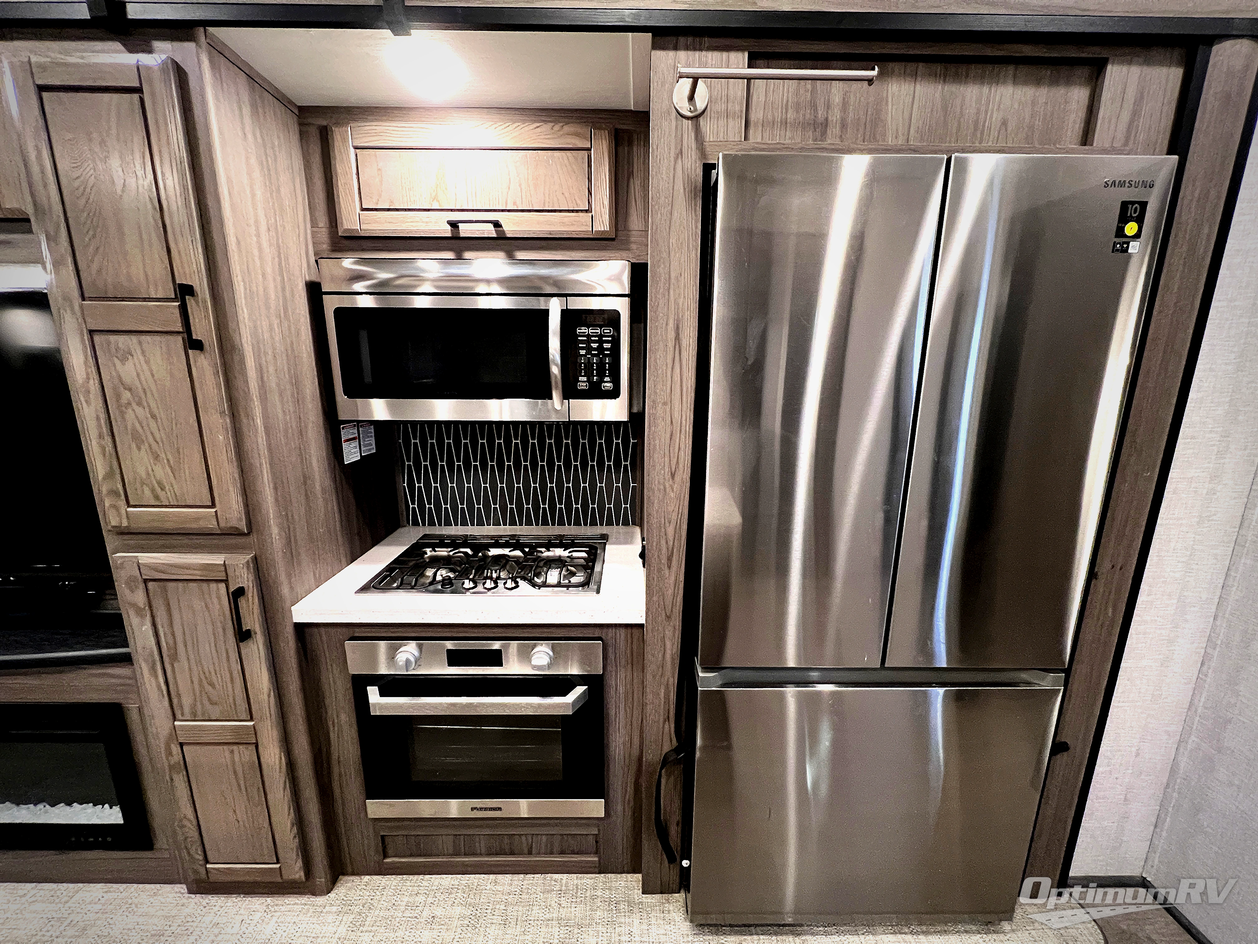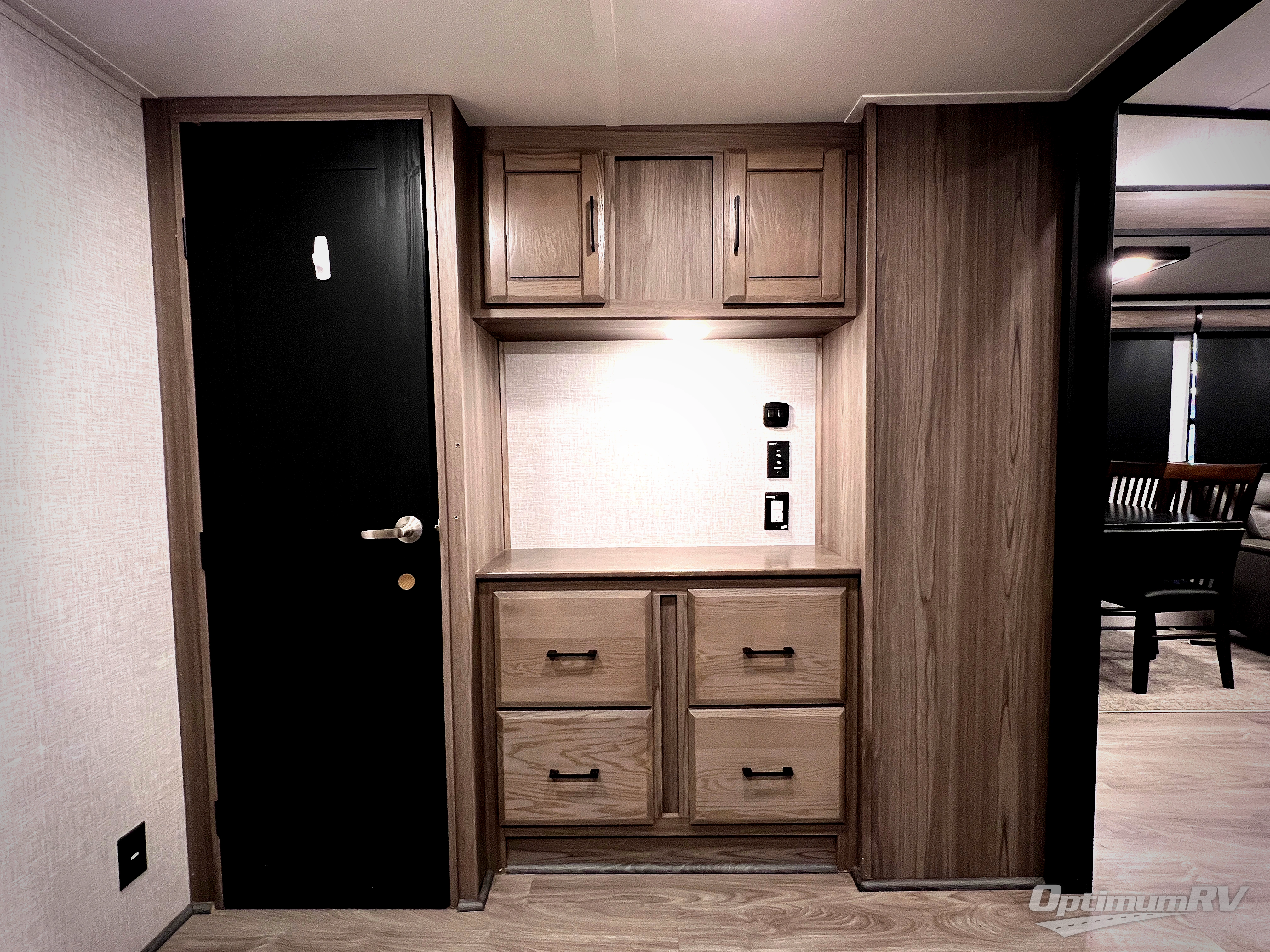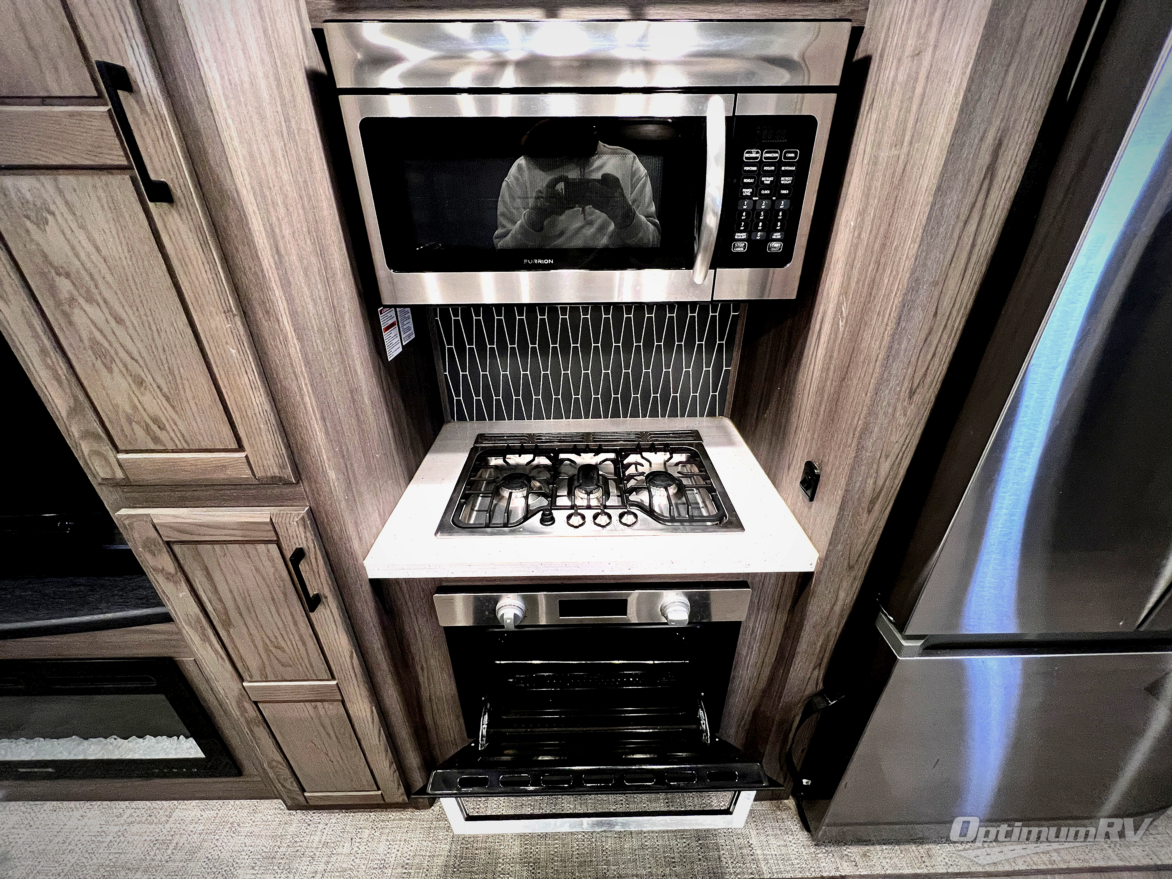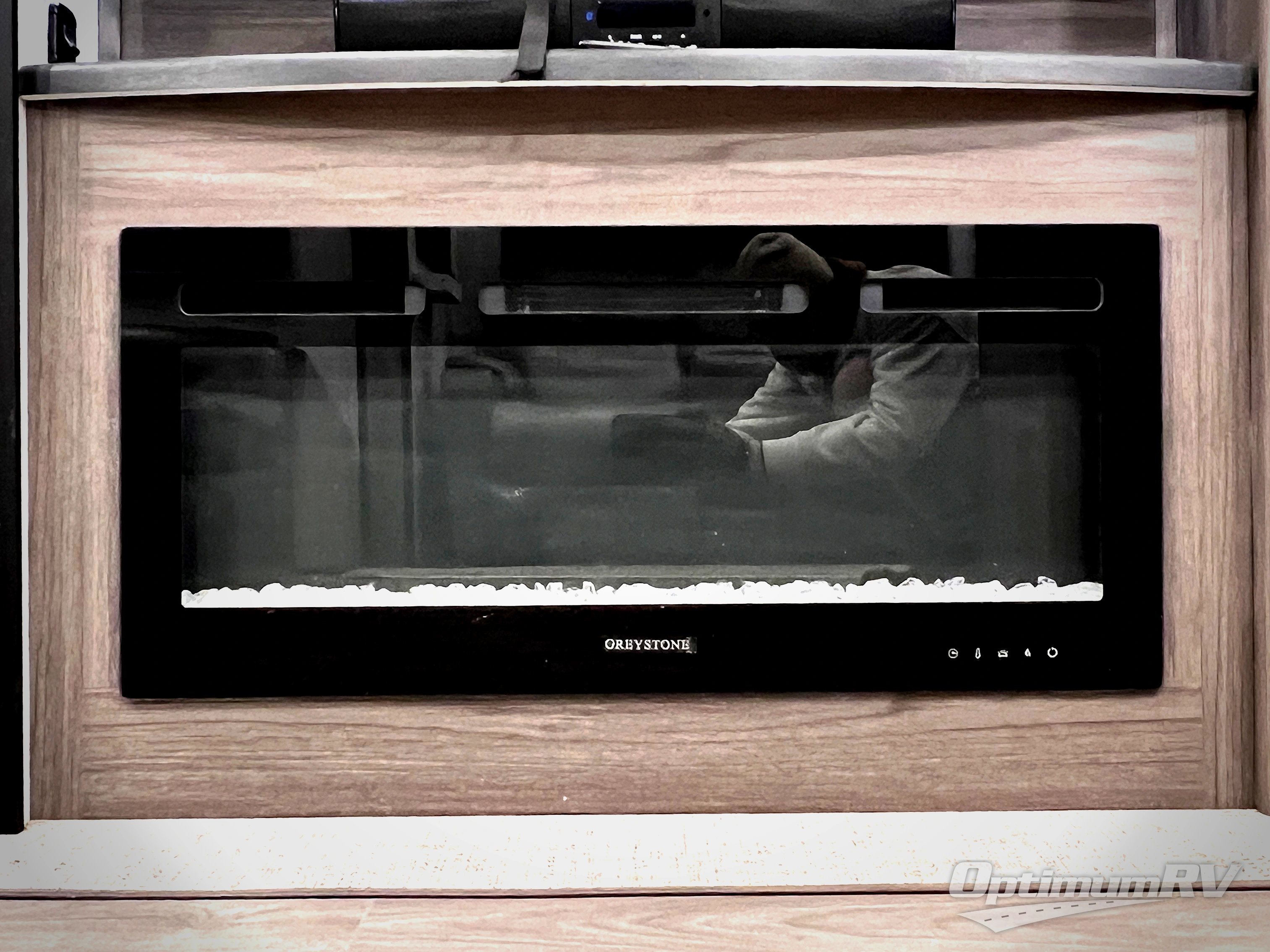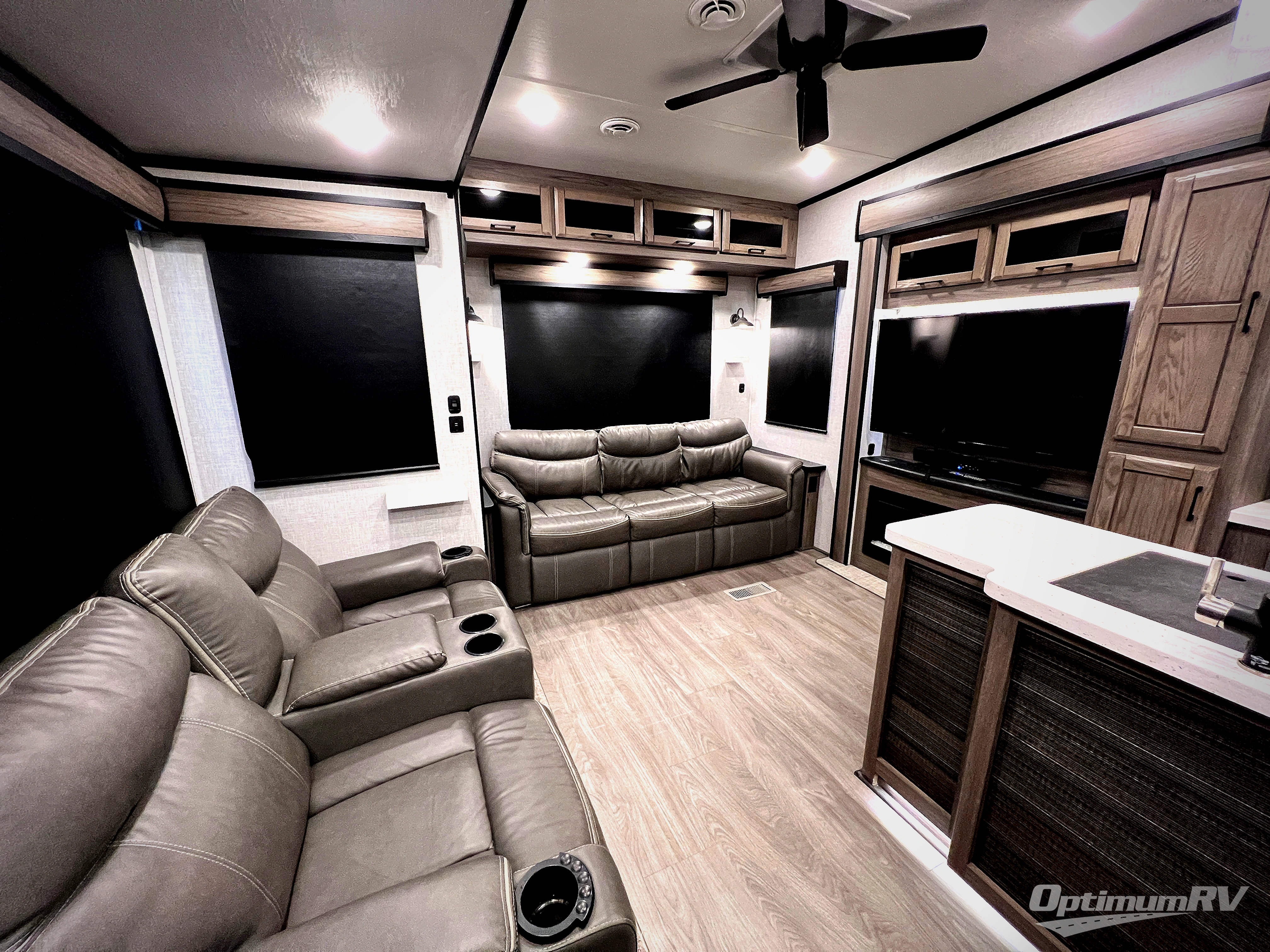 With two bedrooms, everyone will have their own comfortable place to sleep in this fifth wheel! The front private bedroom has a king bed slide, a dresser base with a fireplace and 39" TV, a bench seat, and a front closet that is prepped to add an optional washer and dryer. The second bedroom has a tri-fold sofa, a dresser, a wardrobe, and overhead cabinets, plus a loft above it all for storage or sleeping. Prepare your best home cooked meals with the Furrion kitchen collection and the kitchen island then enjoy them at the dinette. There is even an outside kitchen with a refrigerator, a sink, and a two burner cooktop to breathe in some fresh air while you cook and stay protected by the 18' power awning. Relax in true comfort each night on either the rear tri-fold sofa or the power theater seating across from the entertainment center with a fireplace and a 50" TV.