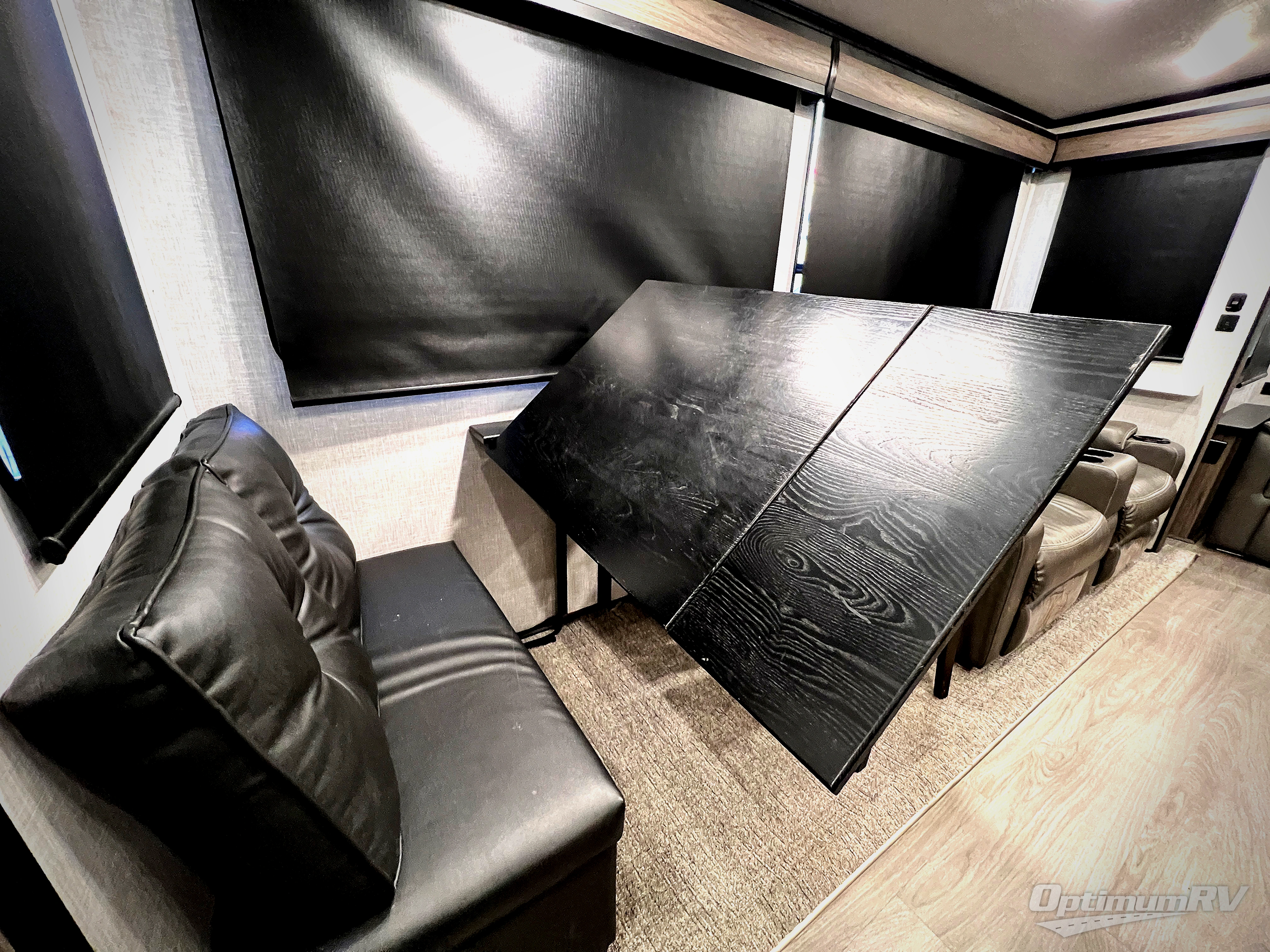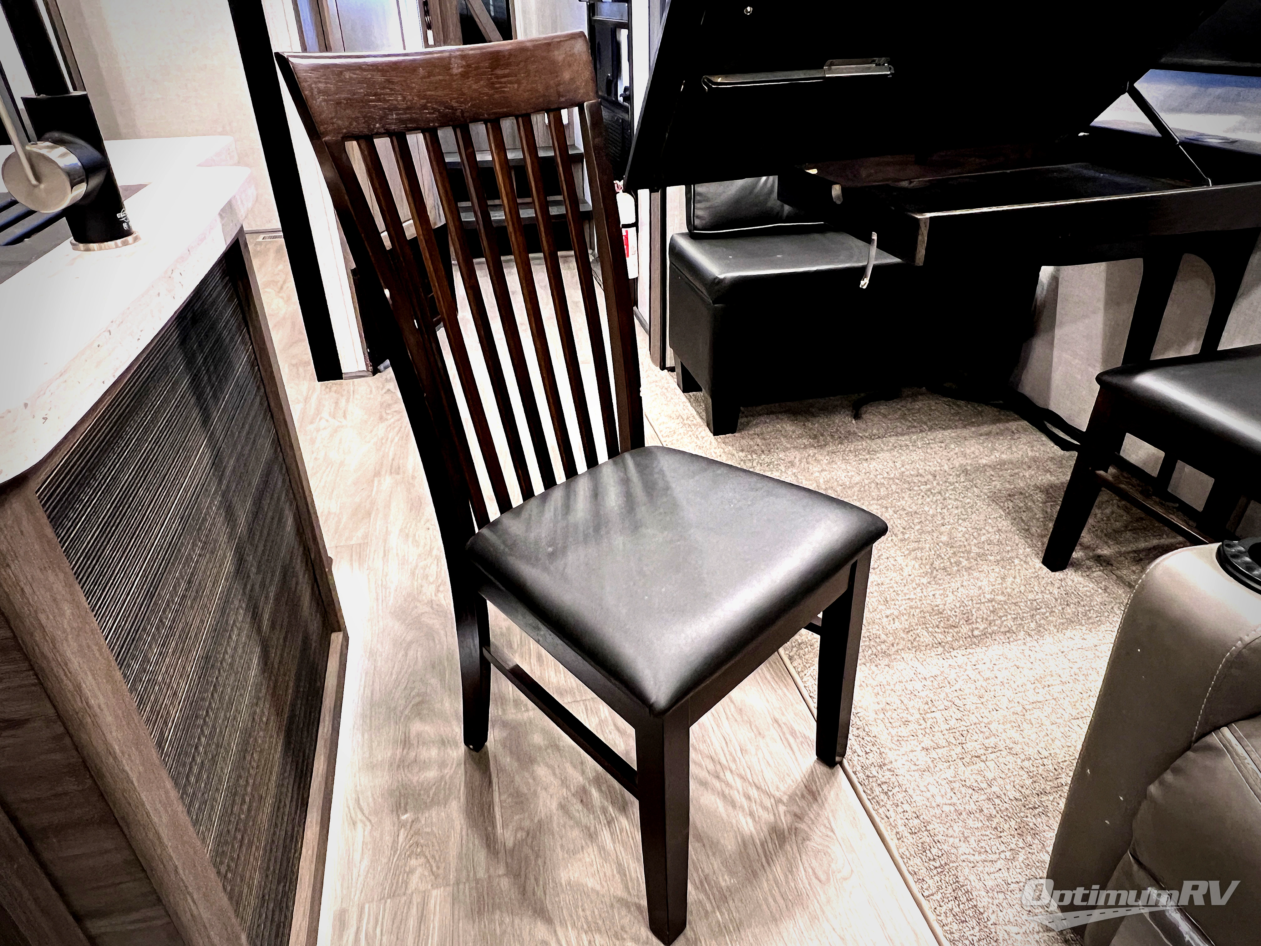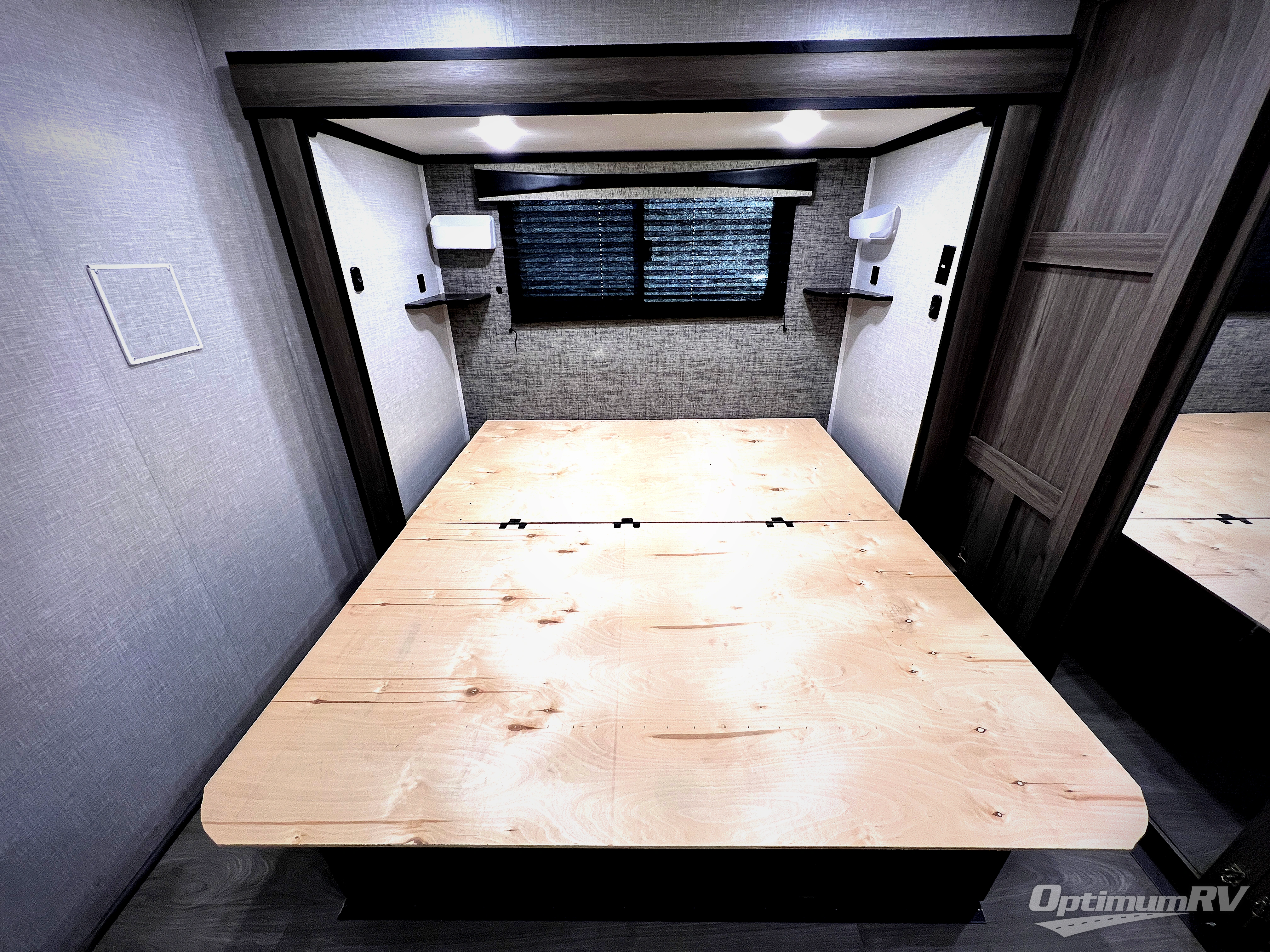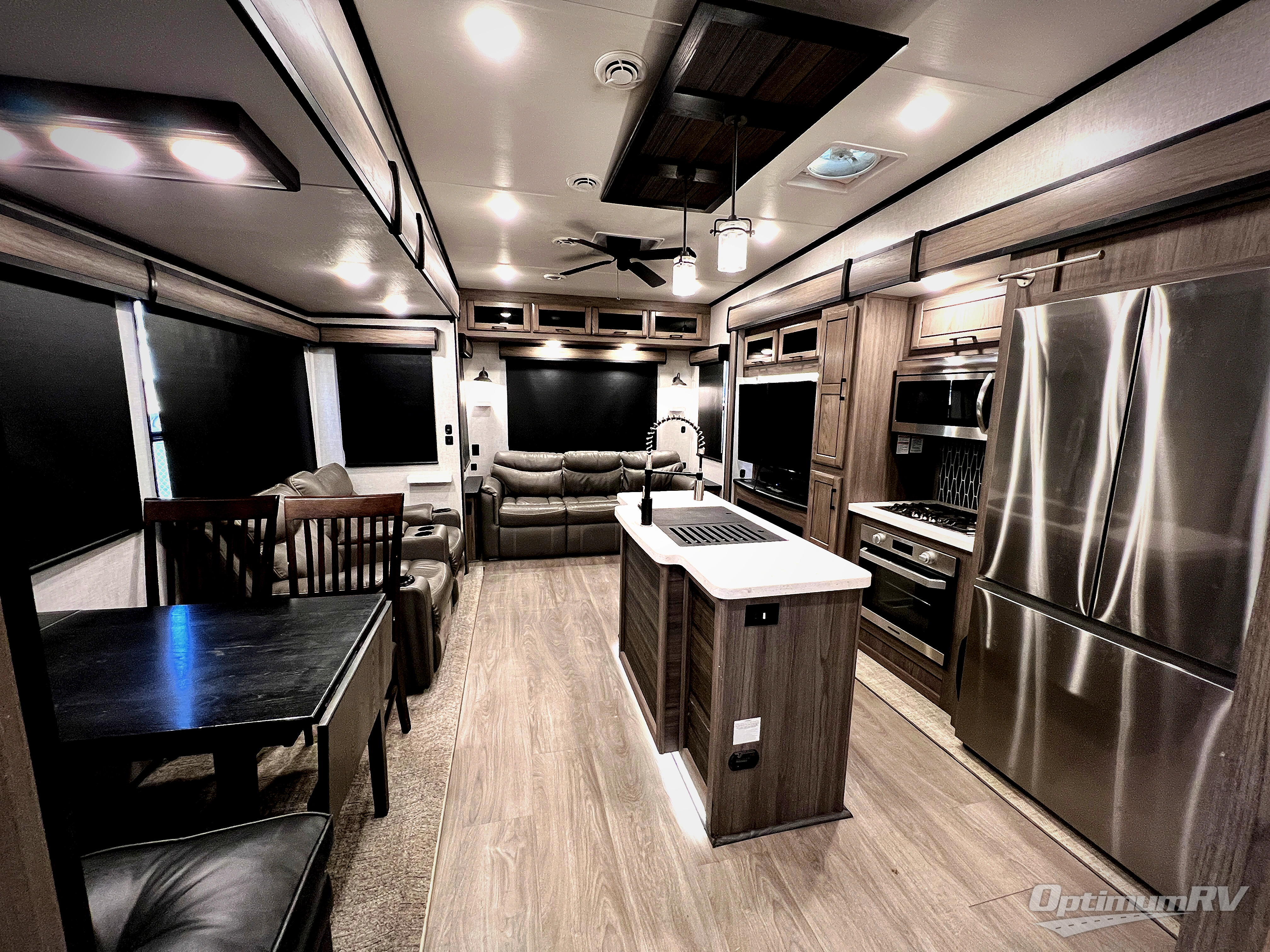 With two bedrooms, everyone will have their own comfortable place to sleep in this fifth wheel! The front private bedroom has a king bed slide, a dresser base with a fireplace and 39" TV, a bench seat, and a front closet that is prepped to add an optional washer and dryer. The second bedroom has a tri-fold sofa, a dresser, a wardrobe, and overhead cabinets, plus a loft above it all for storage or sleeping. Prepare your best home cooked meals with the Furrion kitchen collection and the kitchen island then enjoy them at the dinette. There is even an outside kitchen with a refrigerator, a sink, and a two burner cooktop to breathe in some fresh air while you cook and stay protected by the 18' power awning. Relax in true comfort each night on either the rear tri-fold sofa or the power theater seating across from the entertainment center with a fireplace and a 50" TV.