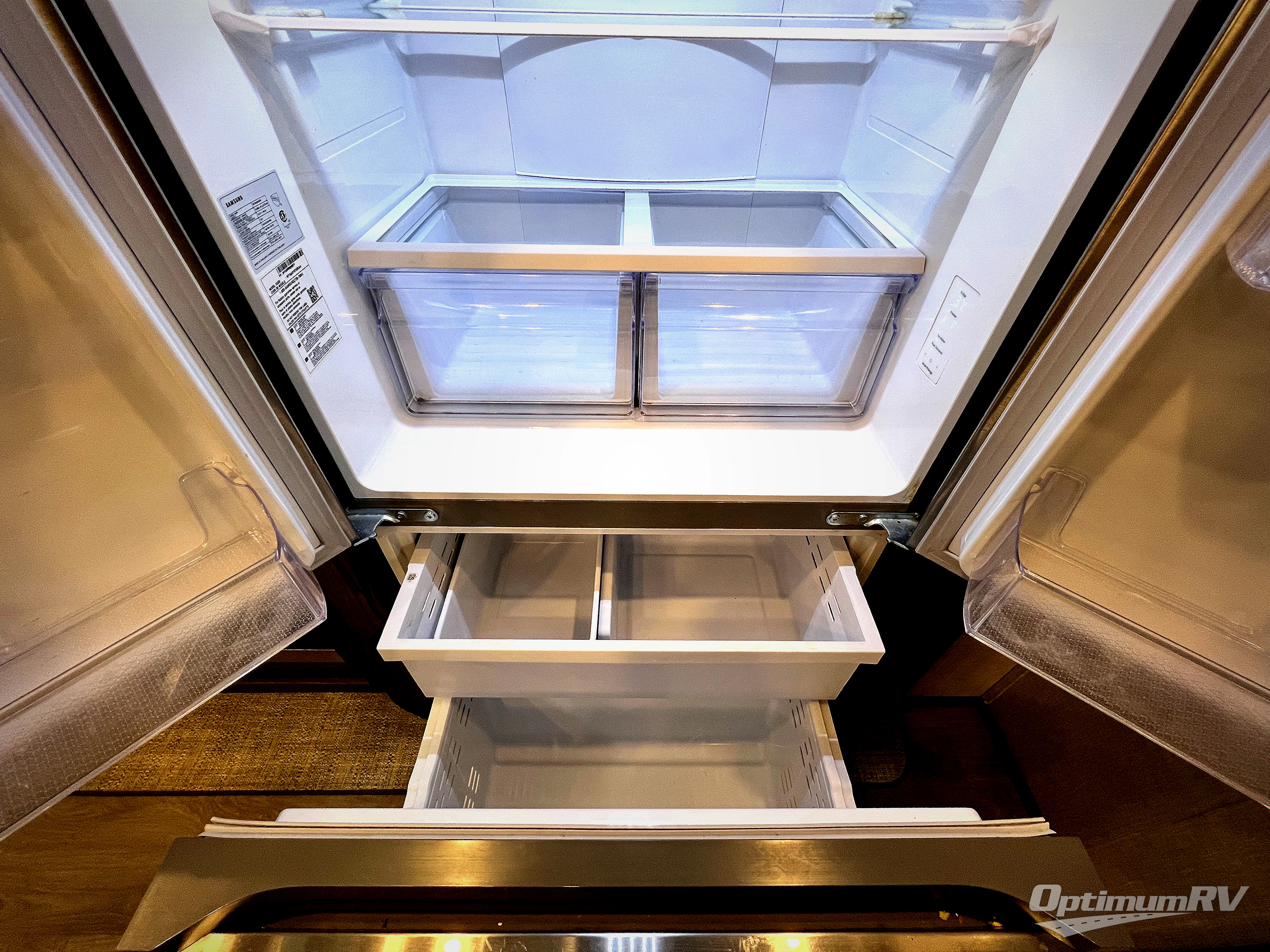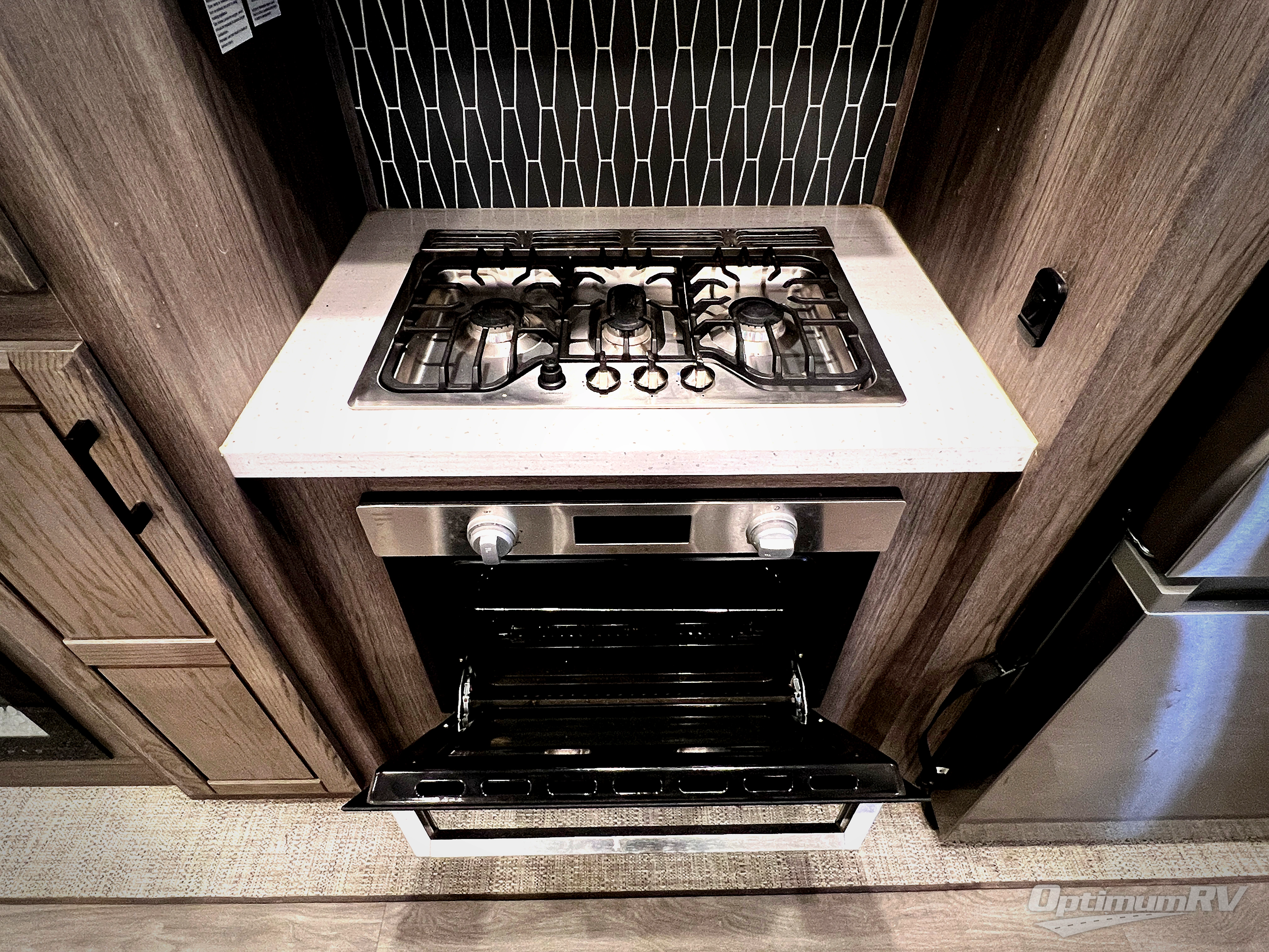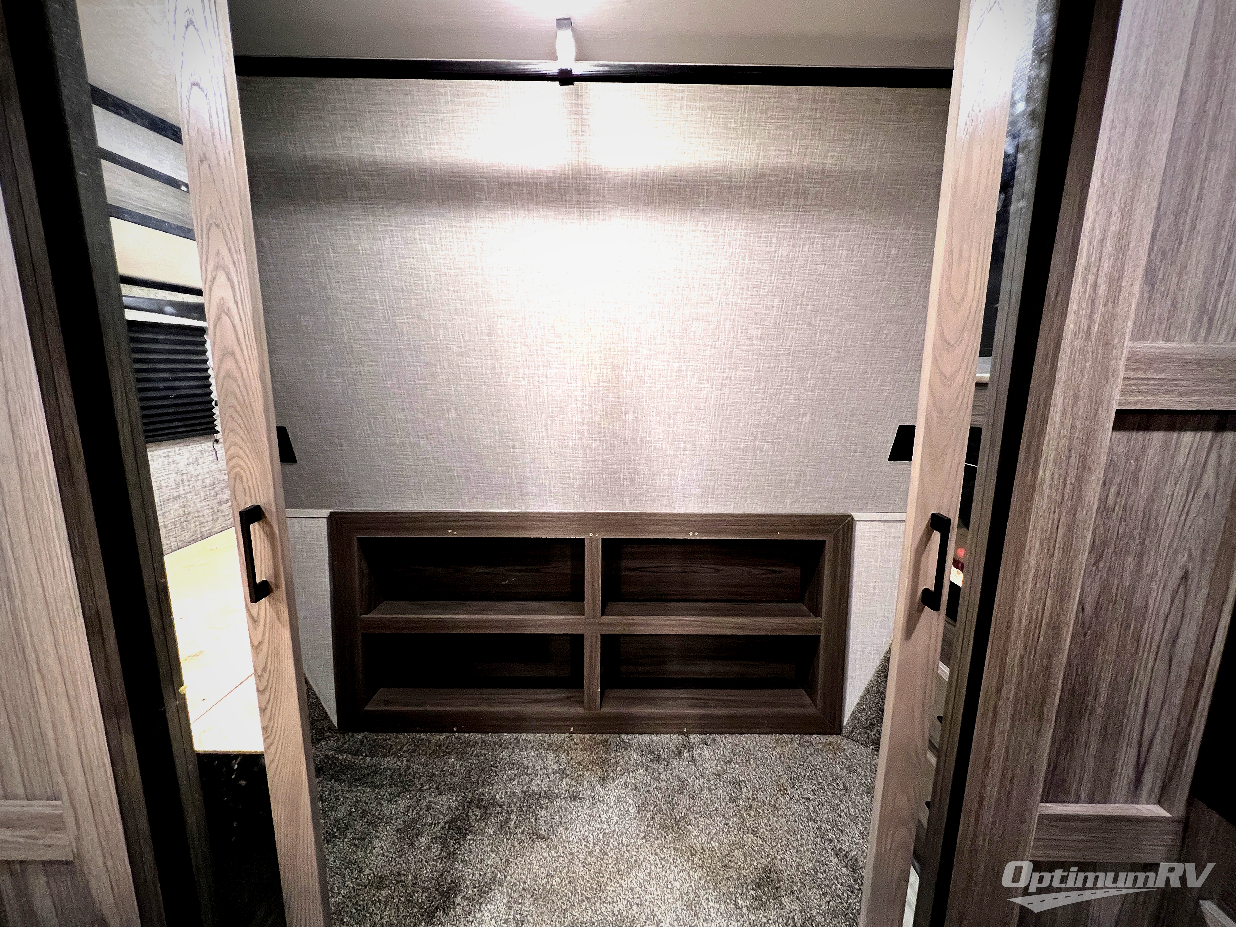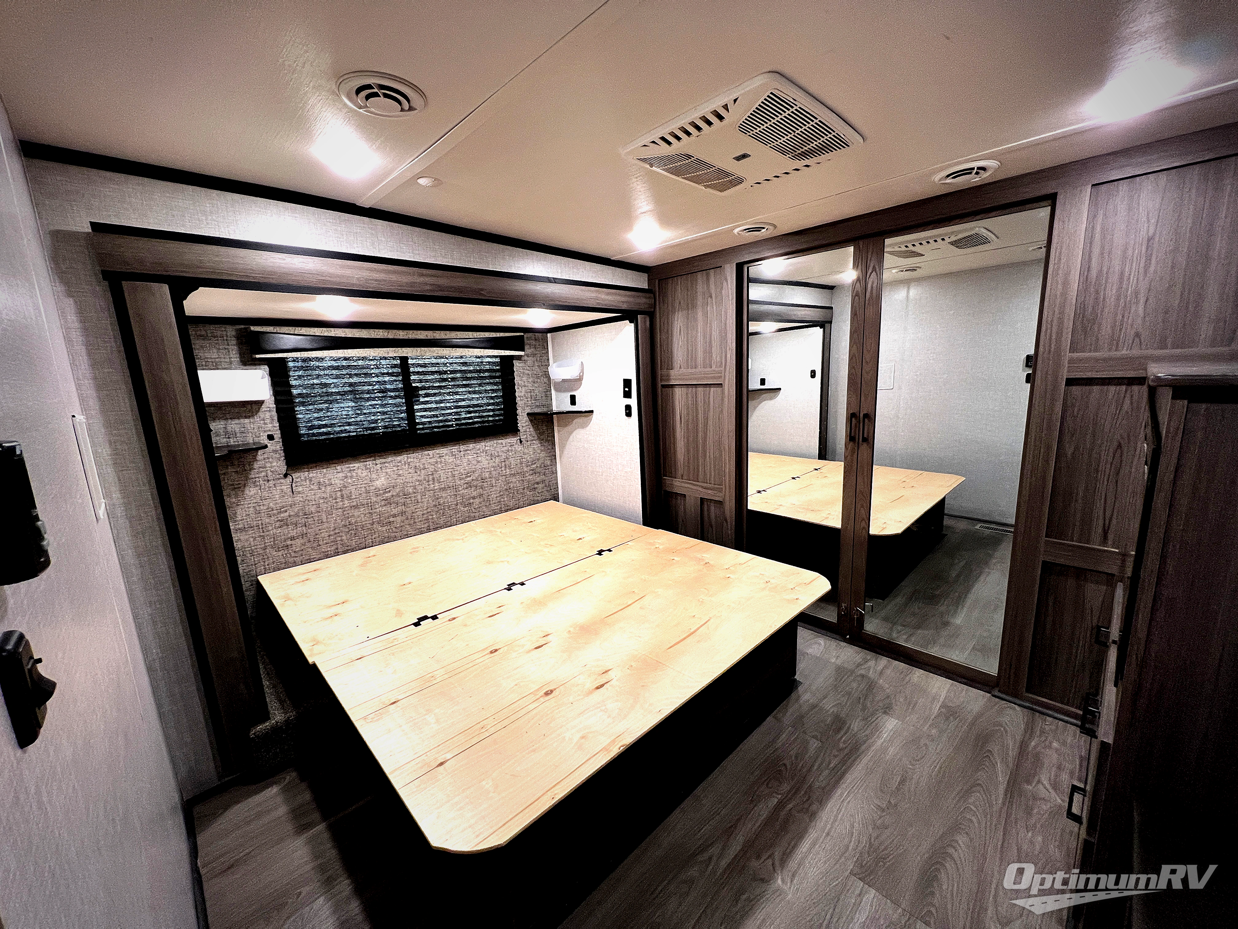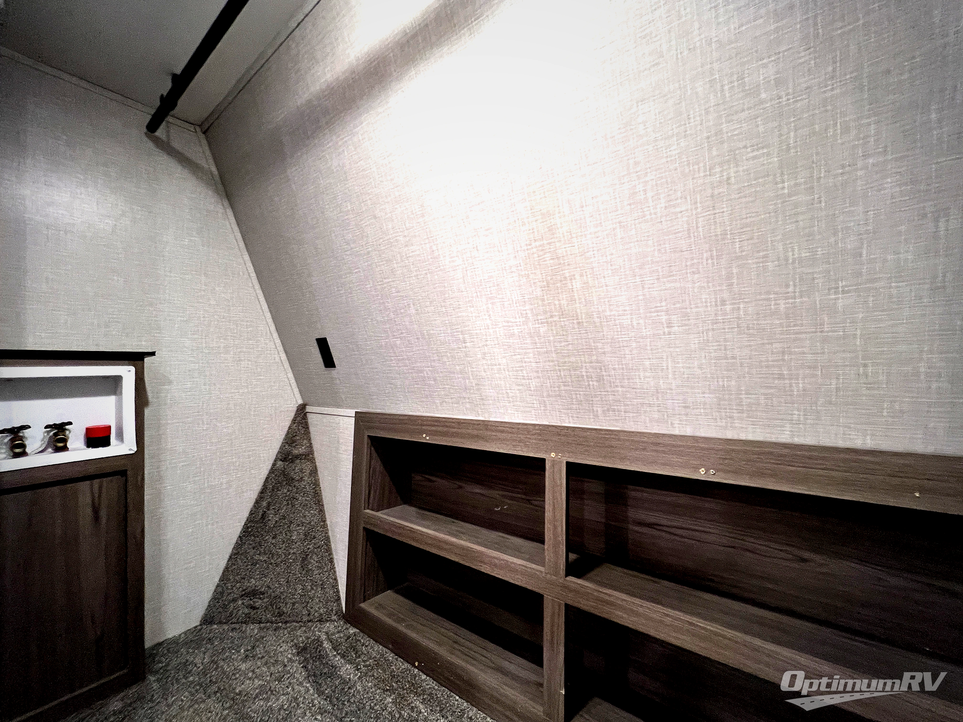 With two bedrooms, everyone will have their own comfortable place to sleep in this fifth wheel! The front private bedroom has a king bed slide, a dresser base with a fireplace and 39" TV, a bench seat, and a front closet that is prepped to add an optional washer and dryer. The second bedroom has a tri-fold sofa, a dresser, a wardrobe, and overhead cabinets, plus a loft above it all for storage or sleeping. Prepare your best home cooked meals with the Furrion kitchen collection and the kitchen island then enjoy them at the dinette. There is even an outside kitchen with a refrigerator, a sink, and a two burner cooktop to breathe in some fresh air while you cook and stay protected by the 18' power awning. Relax in true comfort each night on either the rear tri-fold sofa or the power theater seating across from the entertainment center with a fireplace and a 50" TV.