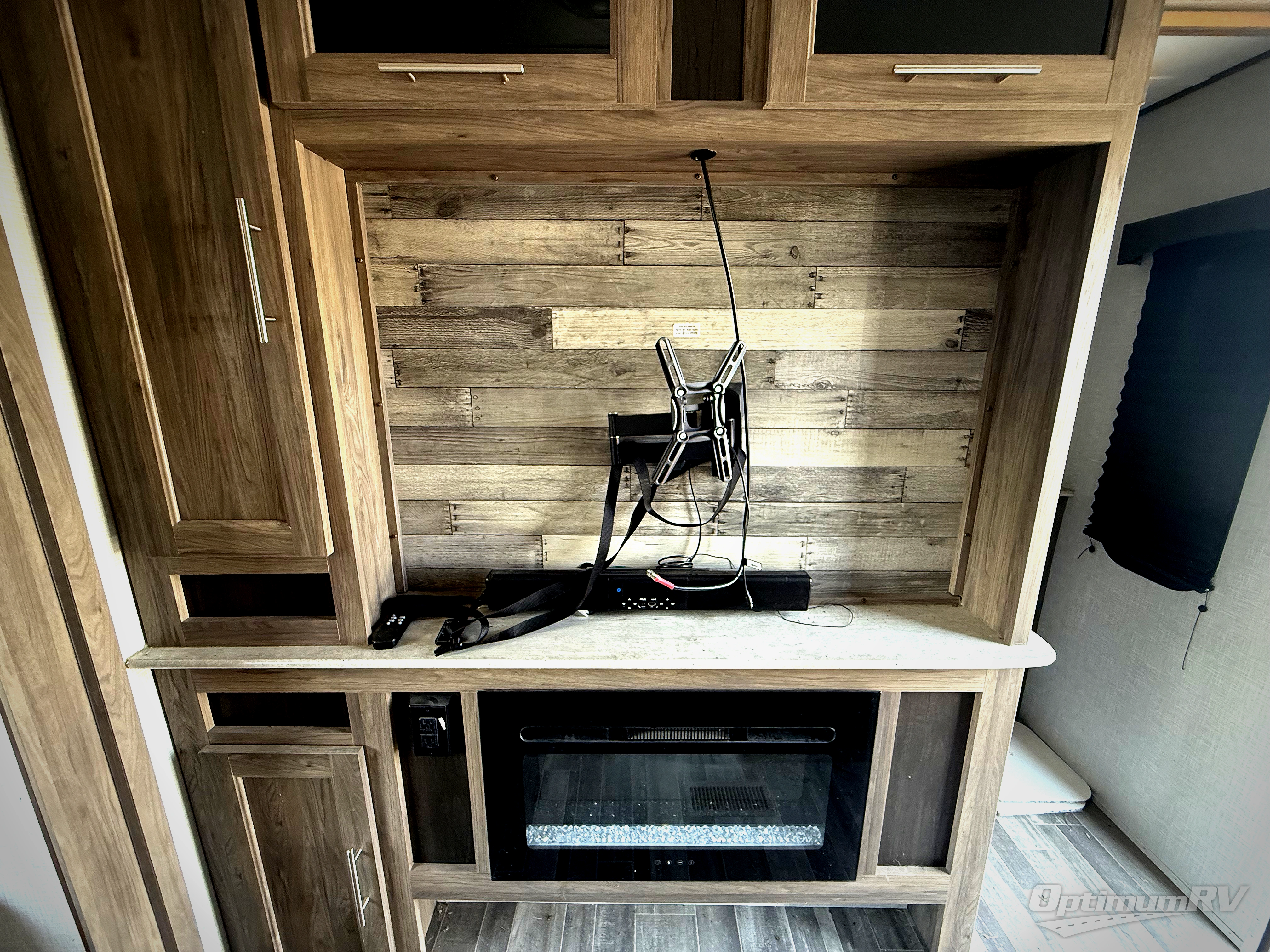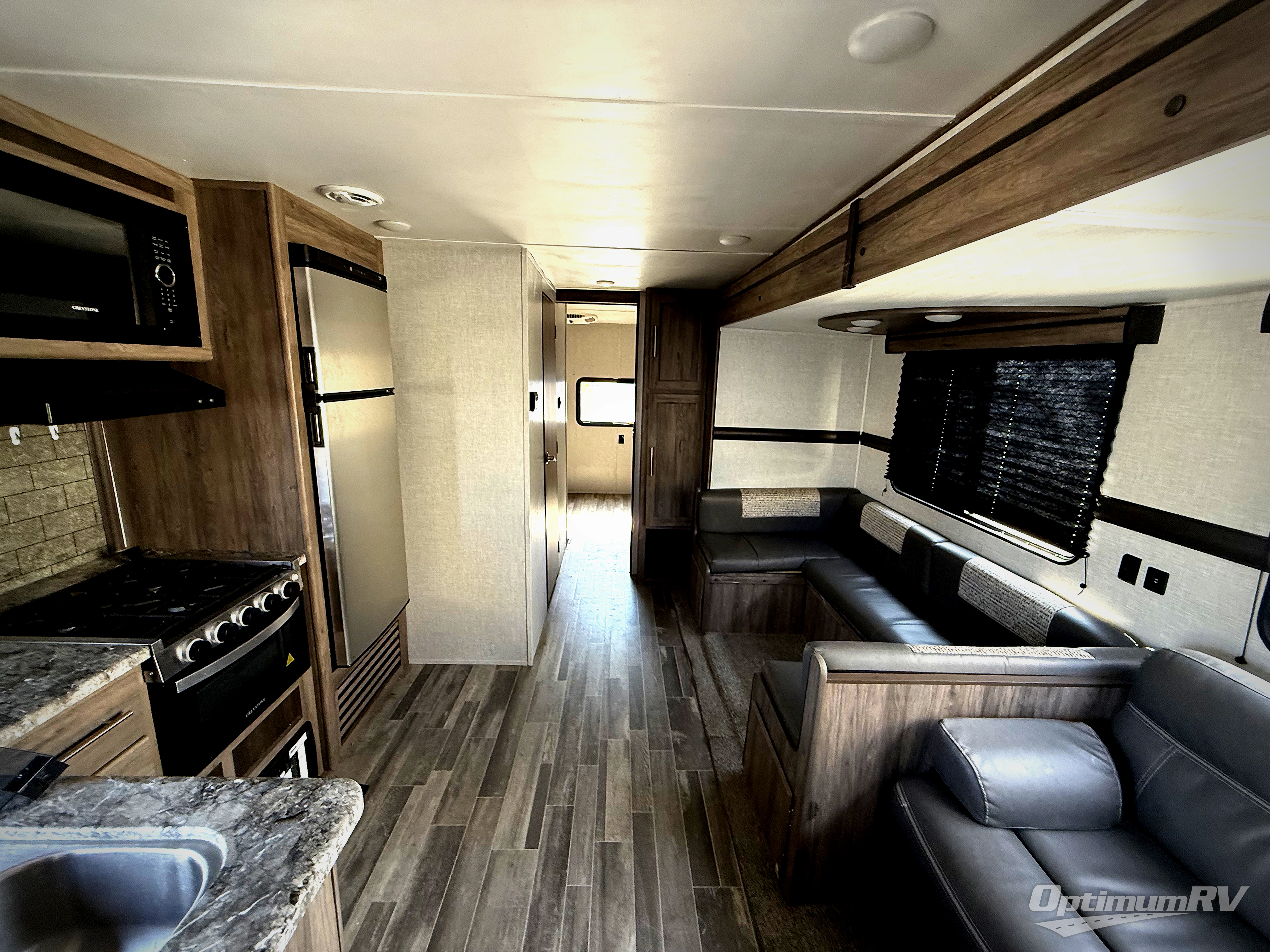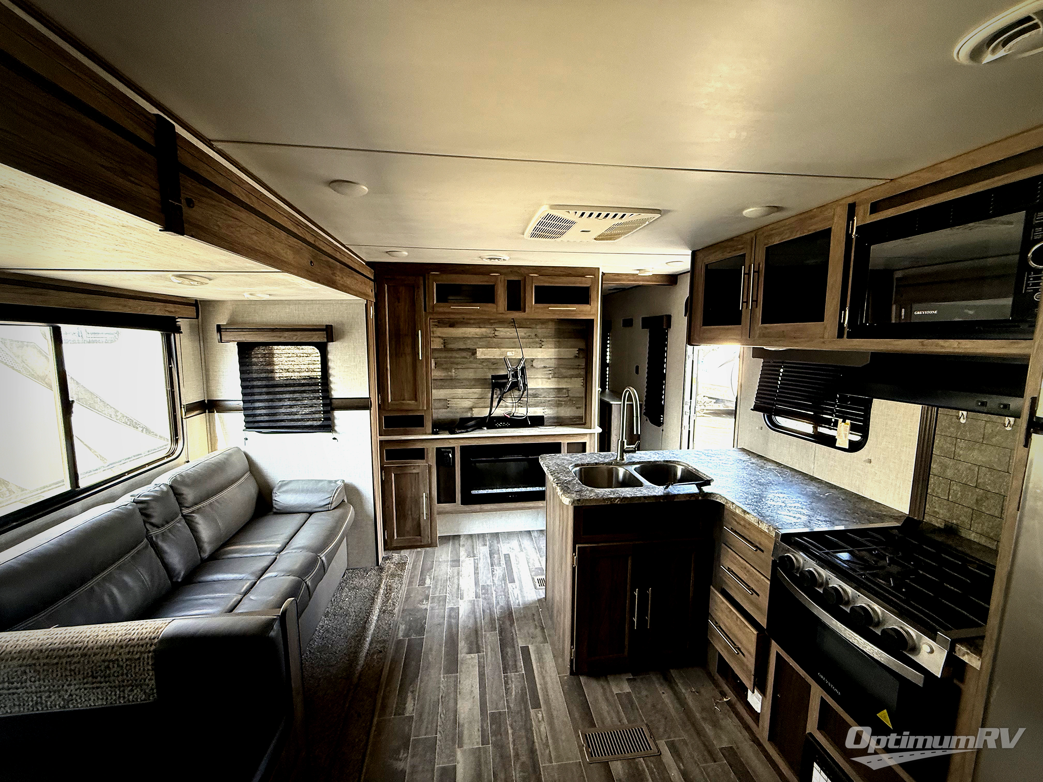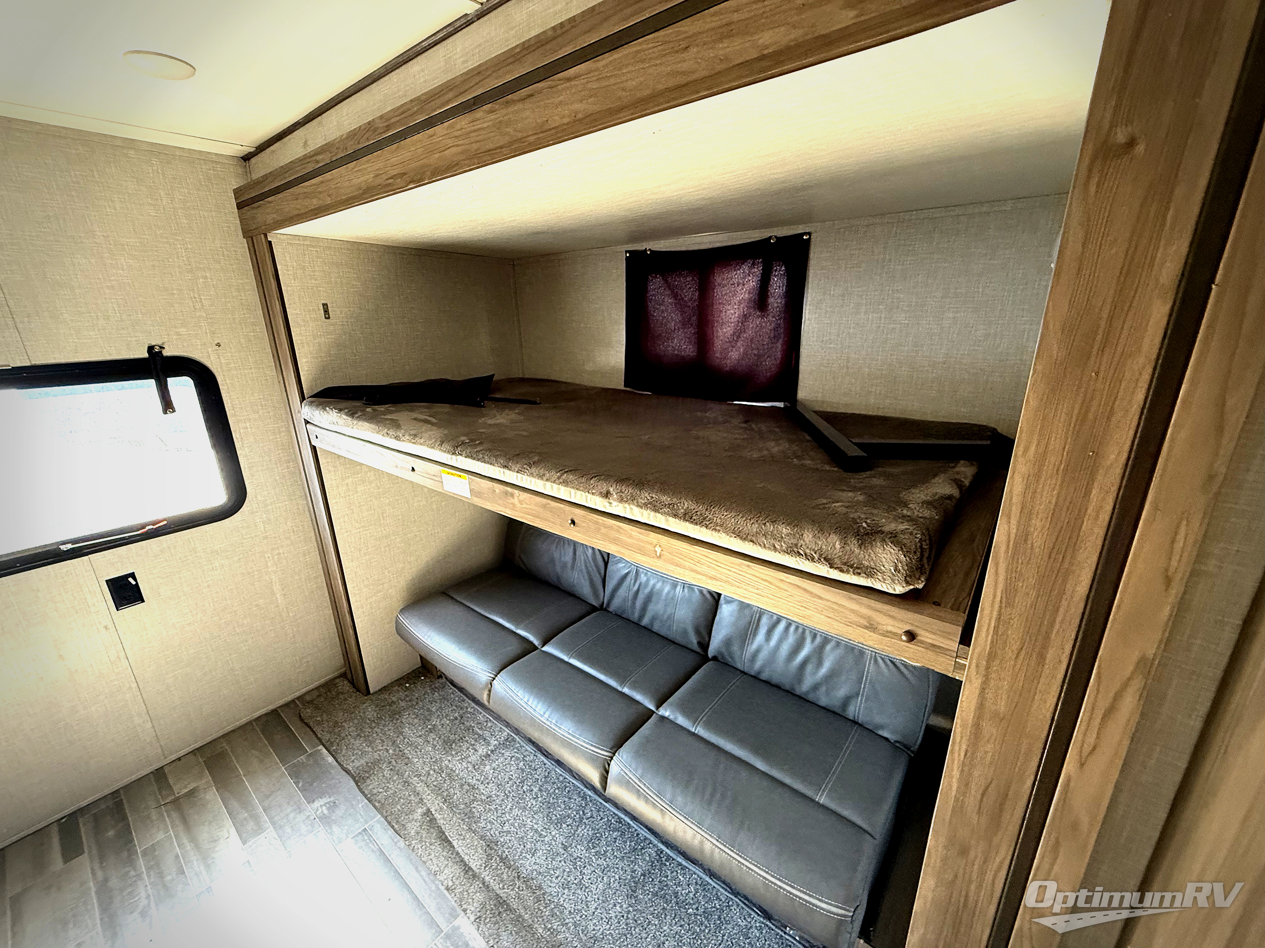 Camp like royalty in this travel trailer! The front private bedroom features a king bed across from a dresser and next to a large wardrobe with overhead cabinets, plus there is a closet that is prepped to add the optional washer and dryer so that you can enjoy clean clothes throughout your entire trip. The living area has a 60" jackknife sofa that can be pulled out for a comfortable place to lie down and watch a movie on the 50" HDTV while a fire is roaring in the electric fireplace. The rear private bunkhouse is big enough to house all of the kiddos with the 38" x 74" flip-up bunk above the 72" jackknife sofa and the 38" x 74" bunk above the wardrobe/entertainment center. You can even cook dinner while breathing in fresh air at the outdoor kitchen!
