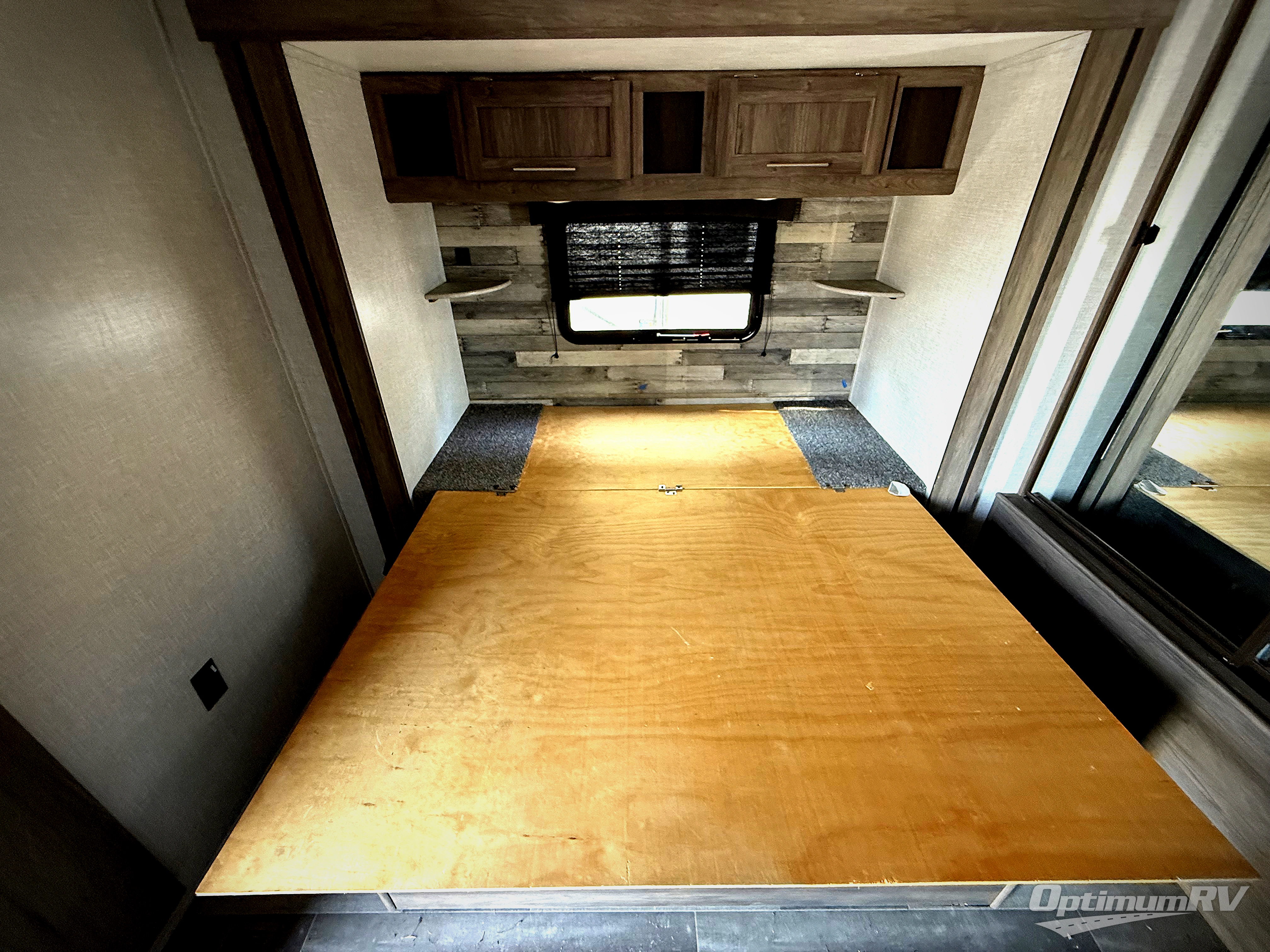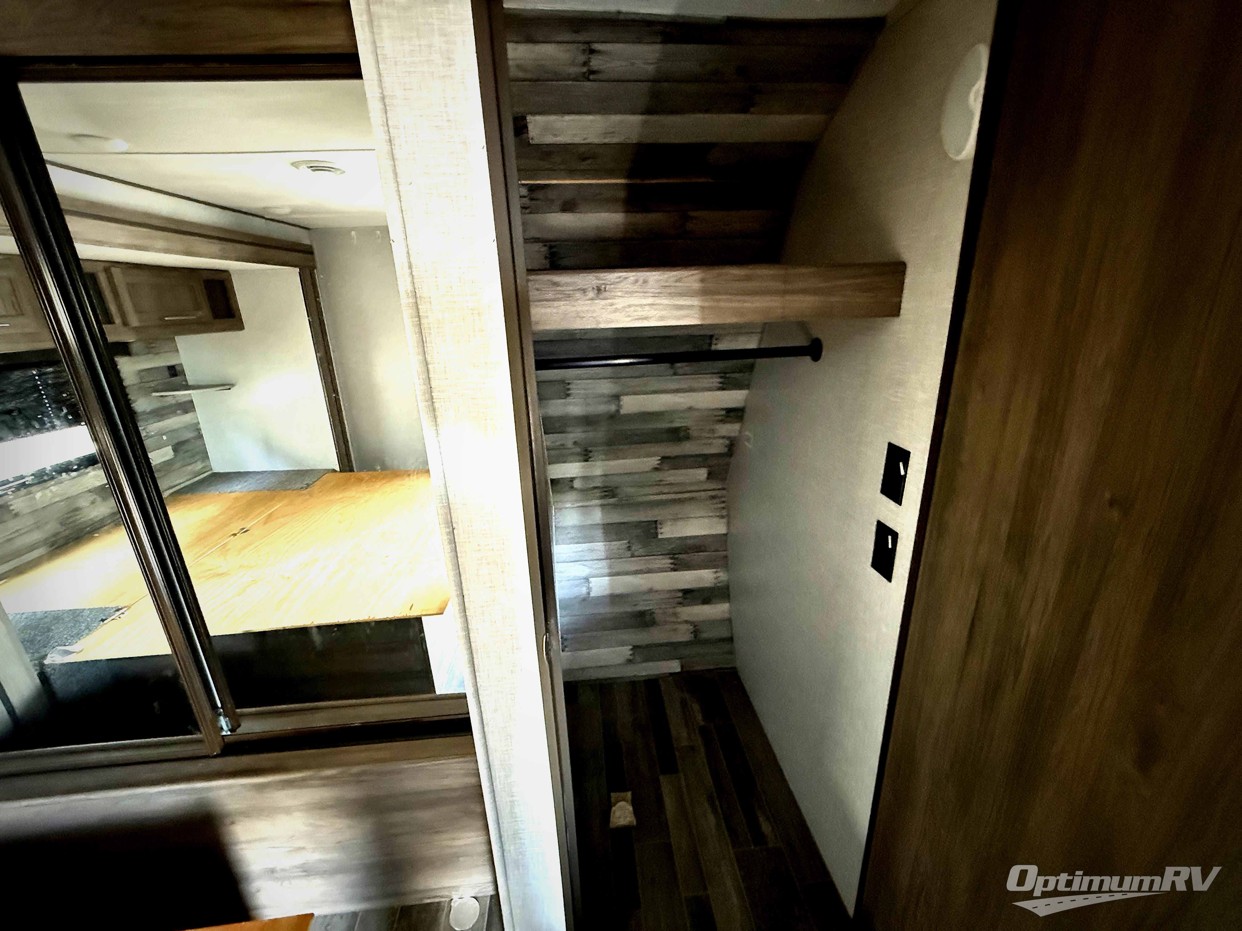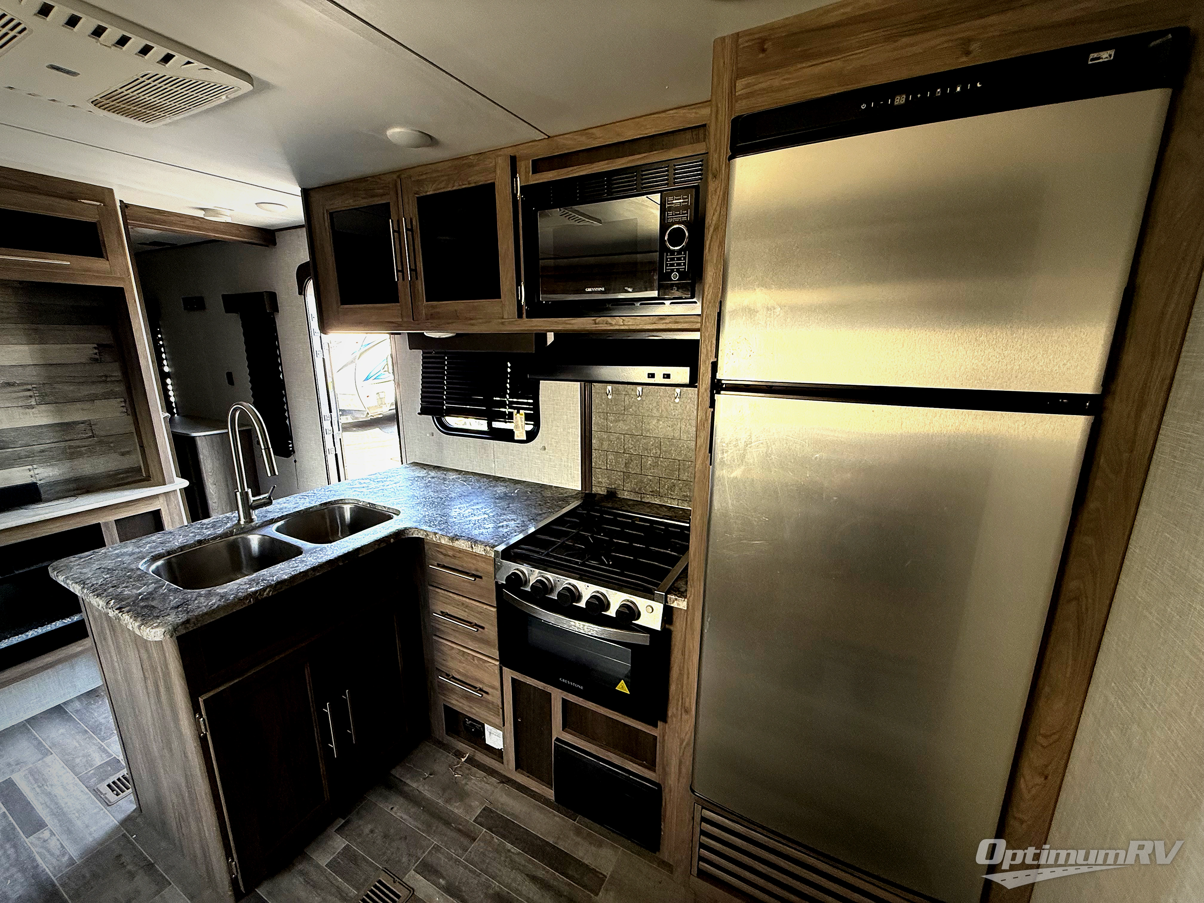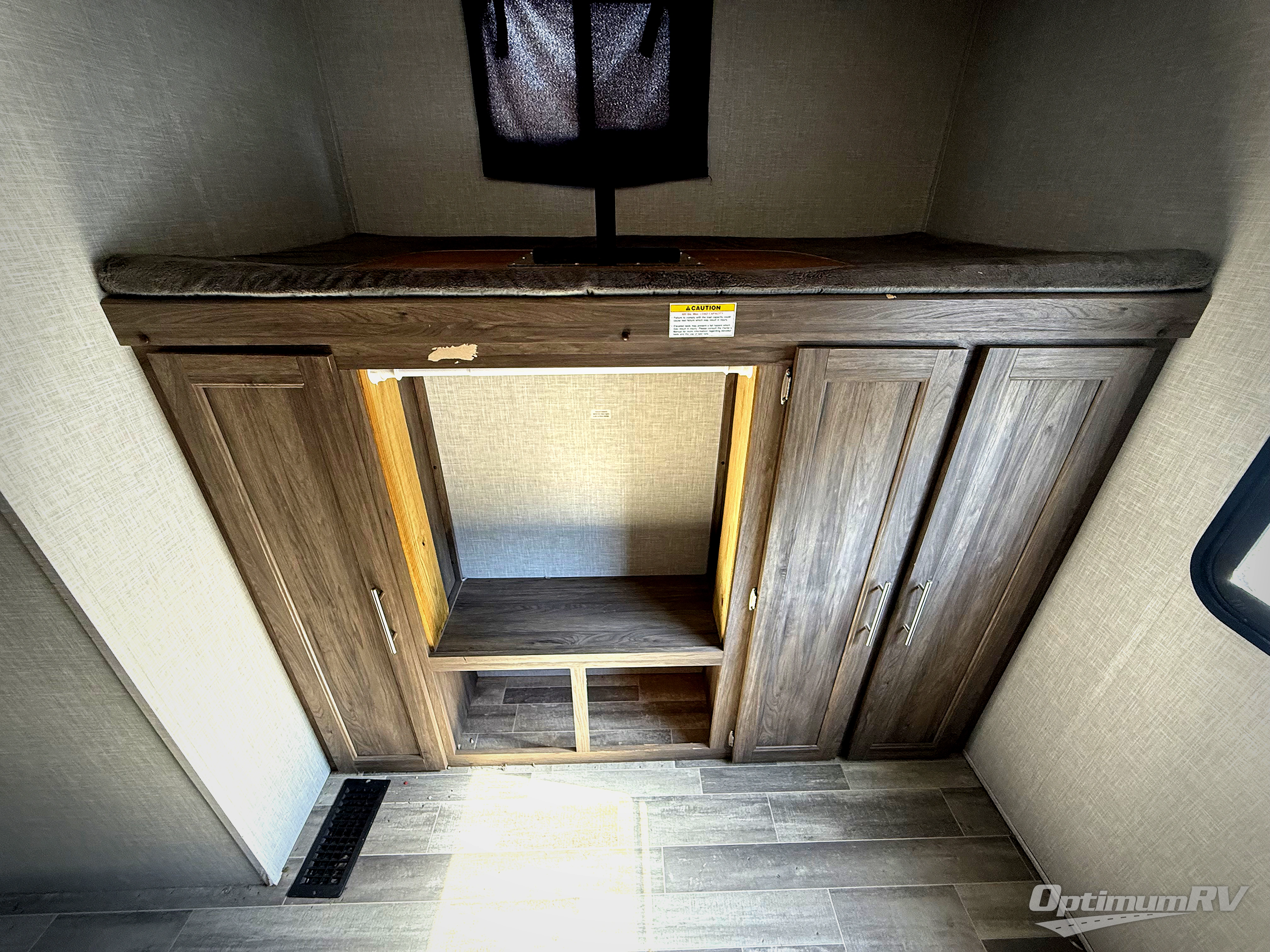 Camp like royalty in this travel trailer! The front private bedroom features a king bed across from a dresser and next to a large wardrobe with overhead cabinets, plus there is a closet that is prepped to add the optional washer and dryer so that you can enjoy clean clothes throughout your entire trip. The living area has a 60" jackknife sofa that can be pulled out for a comfortable place to lie down and watch a movie on the 50" HDTV while a fire is roaring in the electric fireplace. The rear private bunkhouse is big enough to house all of the kiddos with the 38" x 74" flip-up bunk above the 72" jackknife sofa and the 38" x 74" bunk above the wardrobe/entertainment center. You can even cook dinner while breathing in fresh air at the outdoor kitchen!
