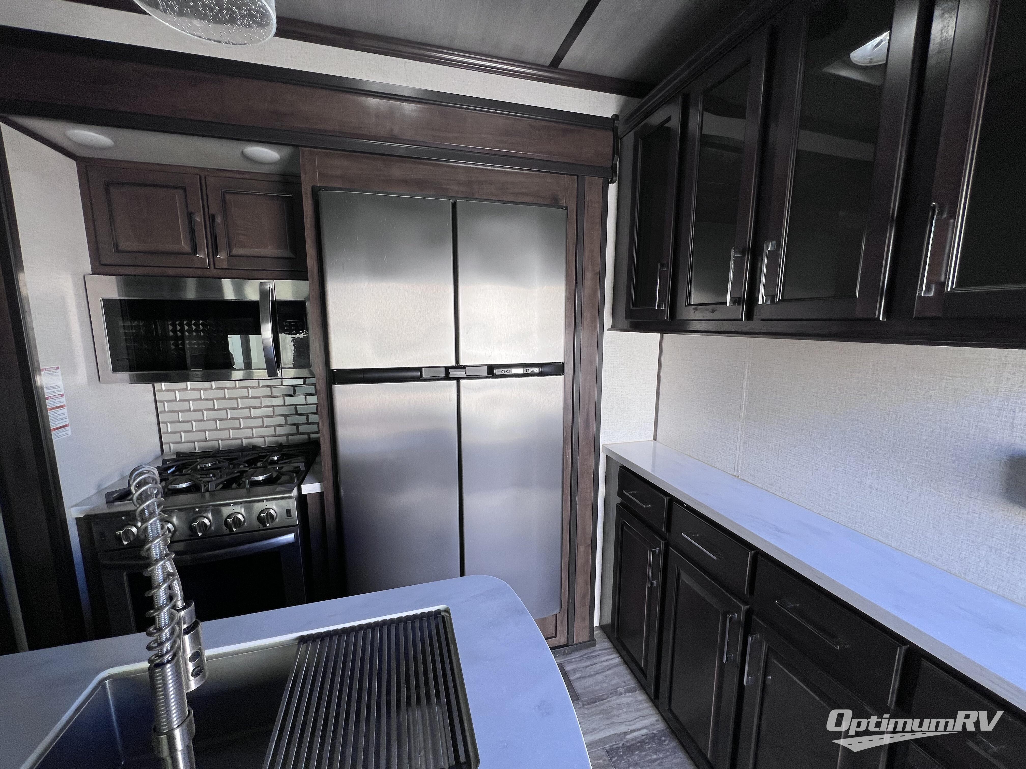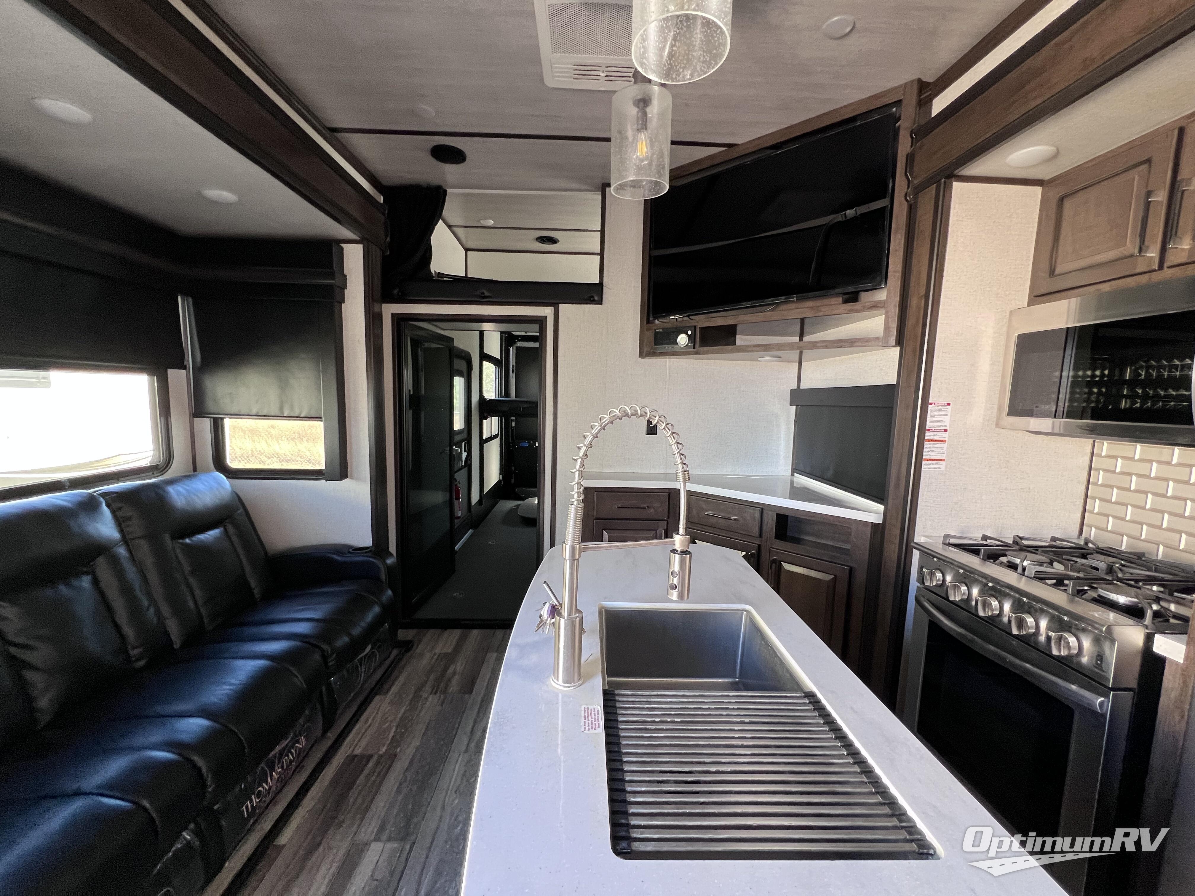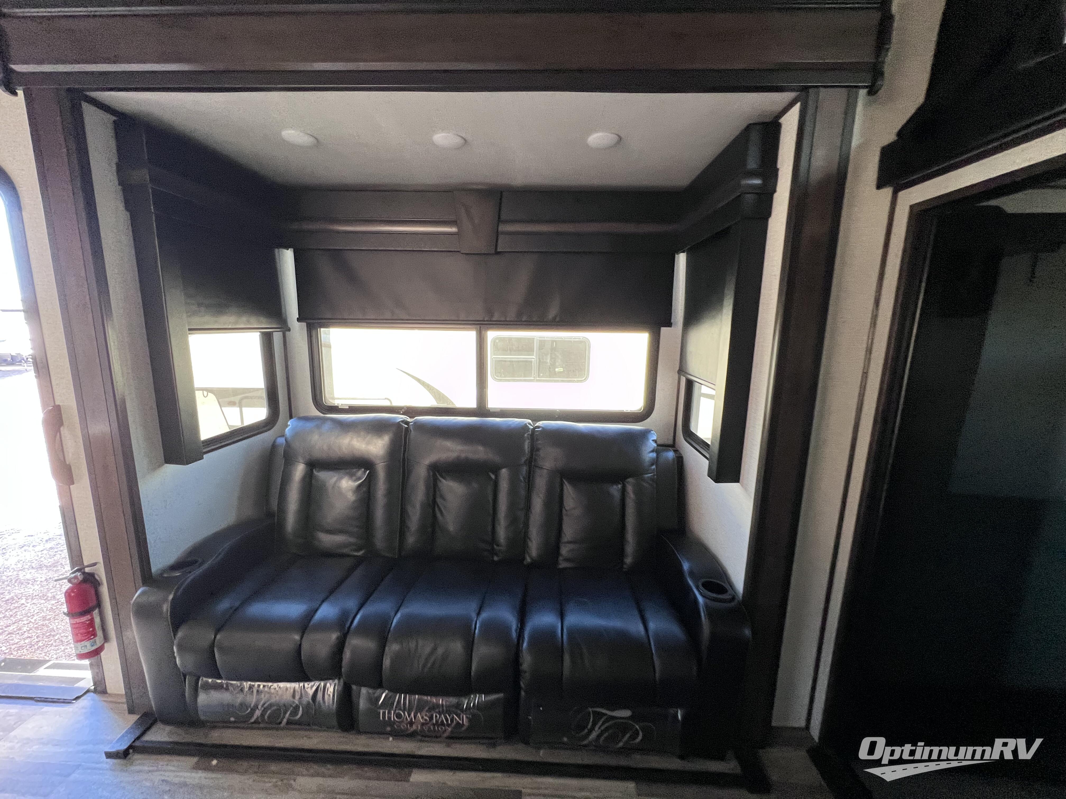 The full and half bathroom are what really add luxury to this Voltage toy hauler! Each bathroom is incorporated into a sleeping space, so you have a master suite up front and a guest suite in the garage. The main living area has opposing slides, so you won't get crowded as you work around the kitchen island, and the heated/massaging residential sofa sits right across from the kitchen and entertainment center. At any time throughout the day, you can reach into the 18-cubic foot refrigerator to grab a cold drink, and then you can head to the sofas with table top in between to sit down and enjoy that drink.