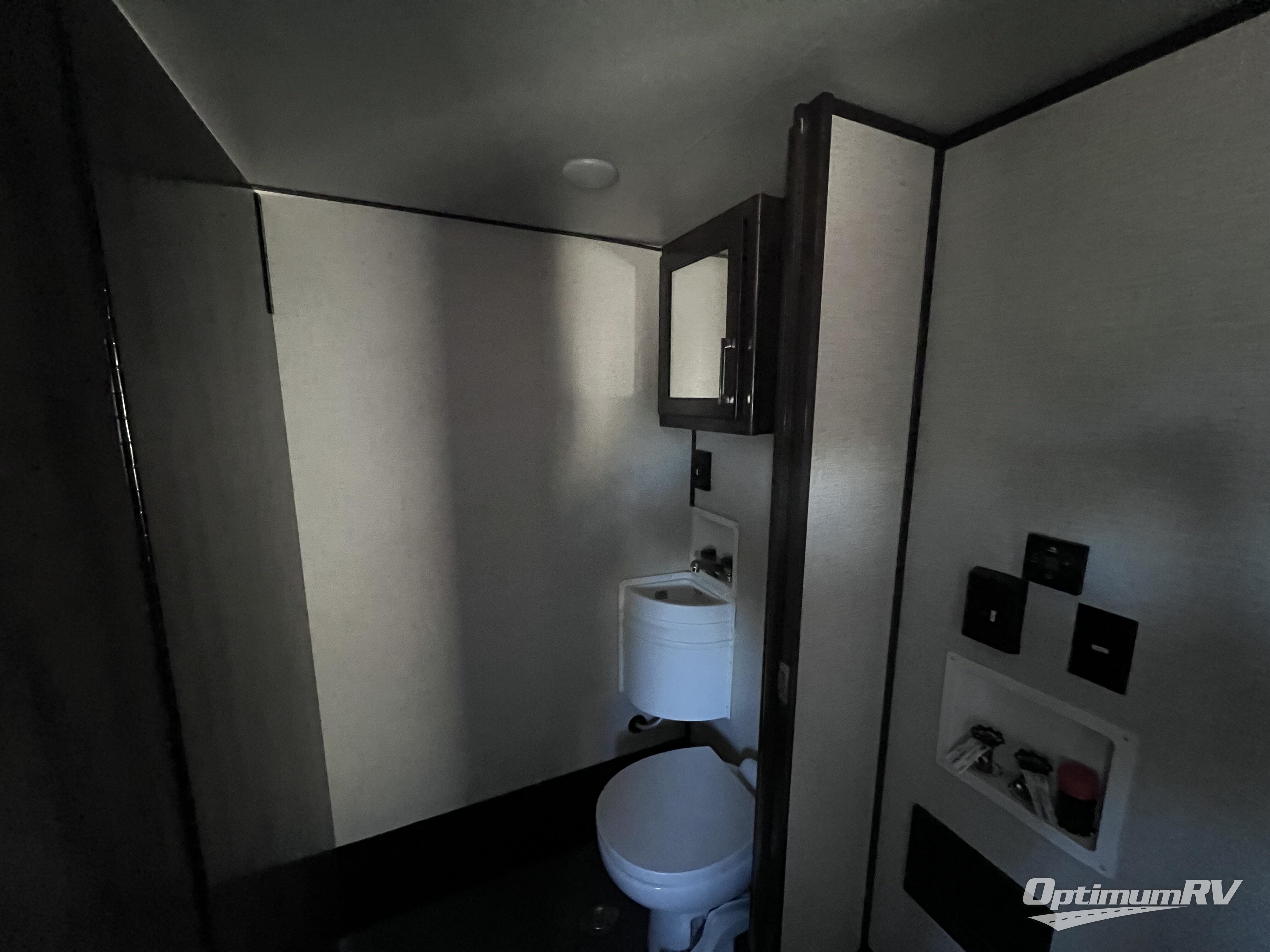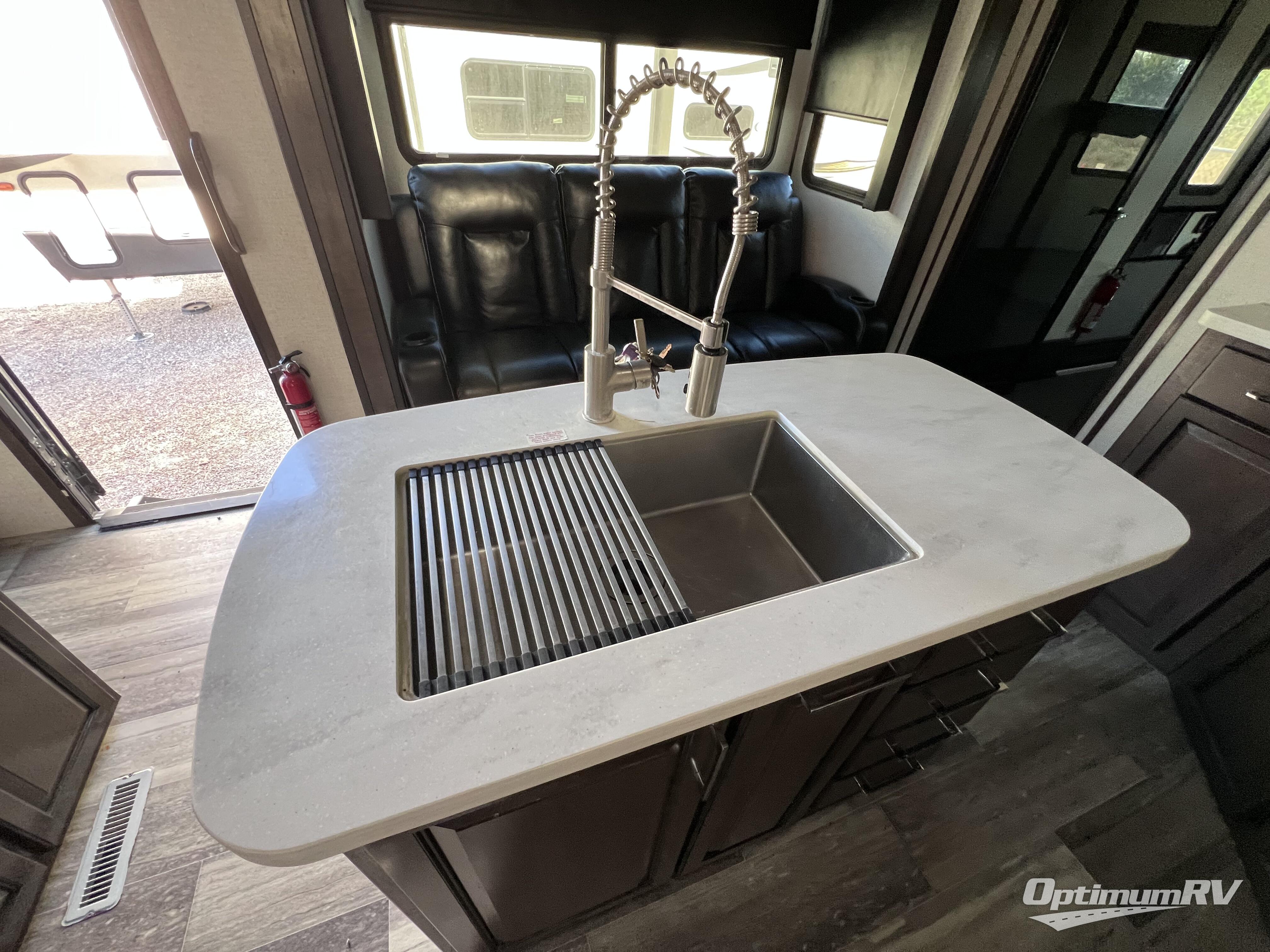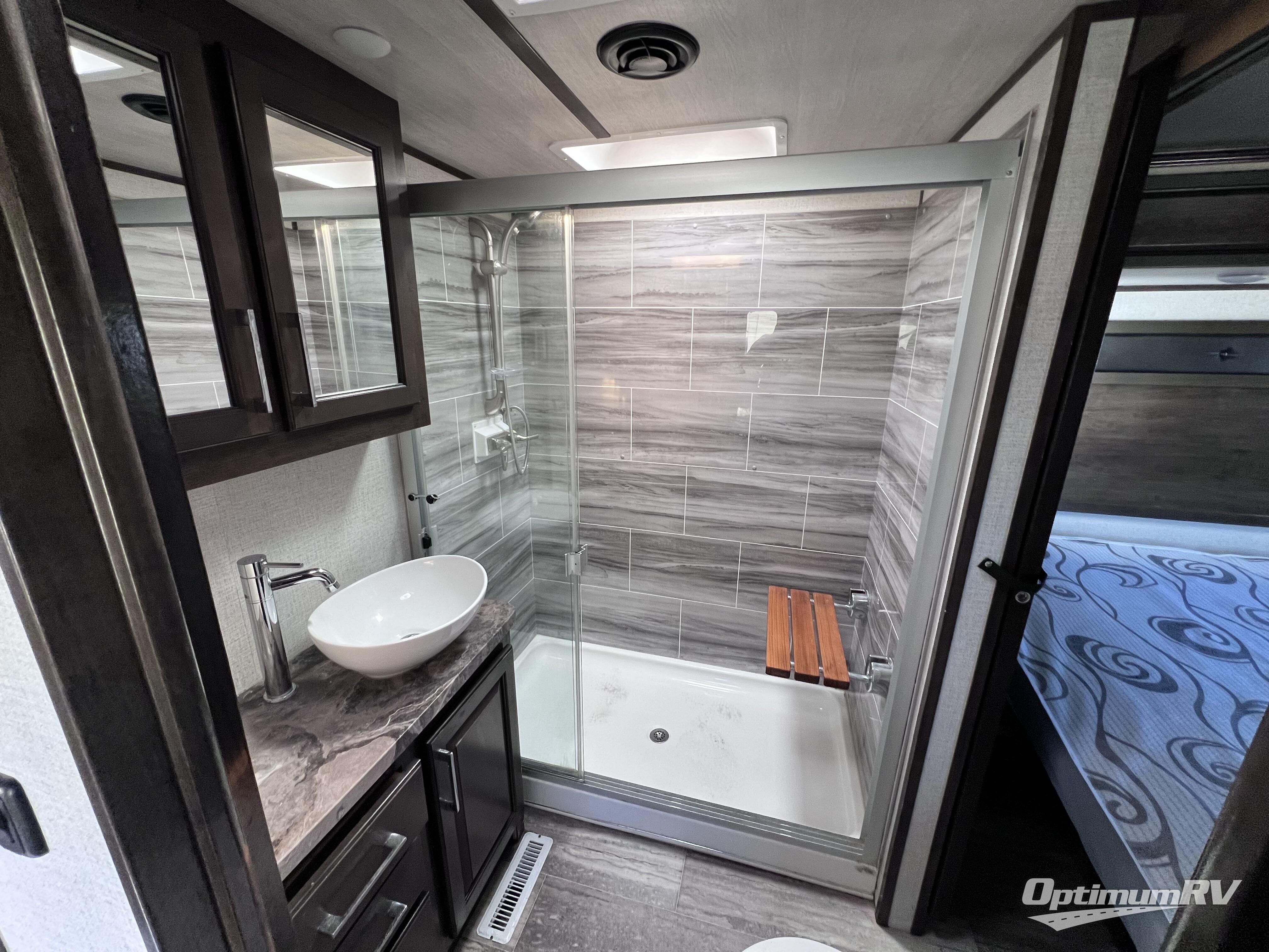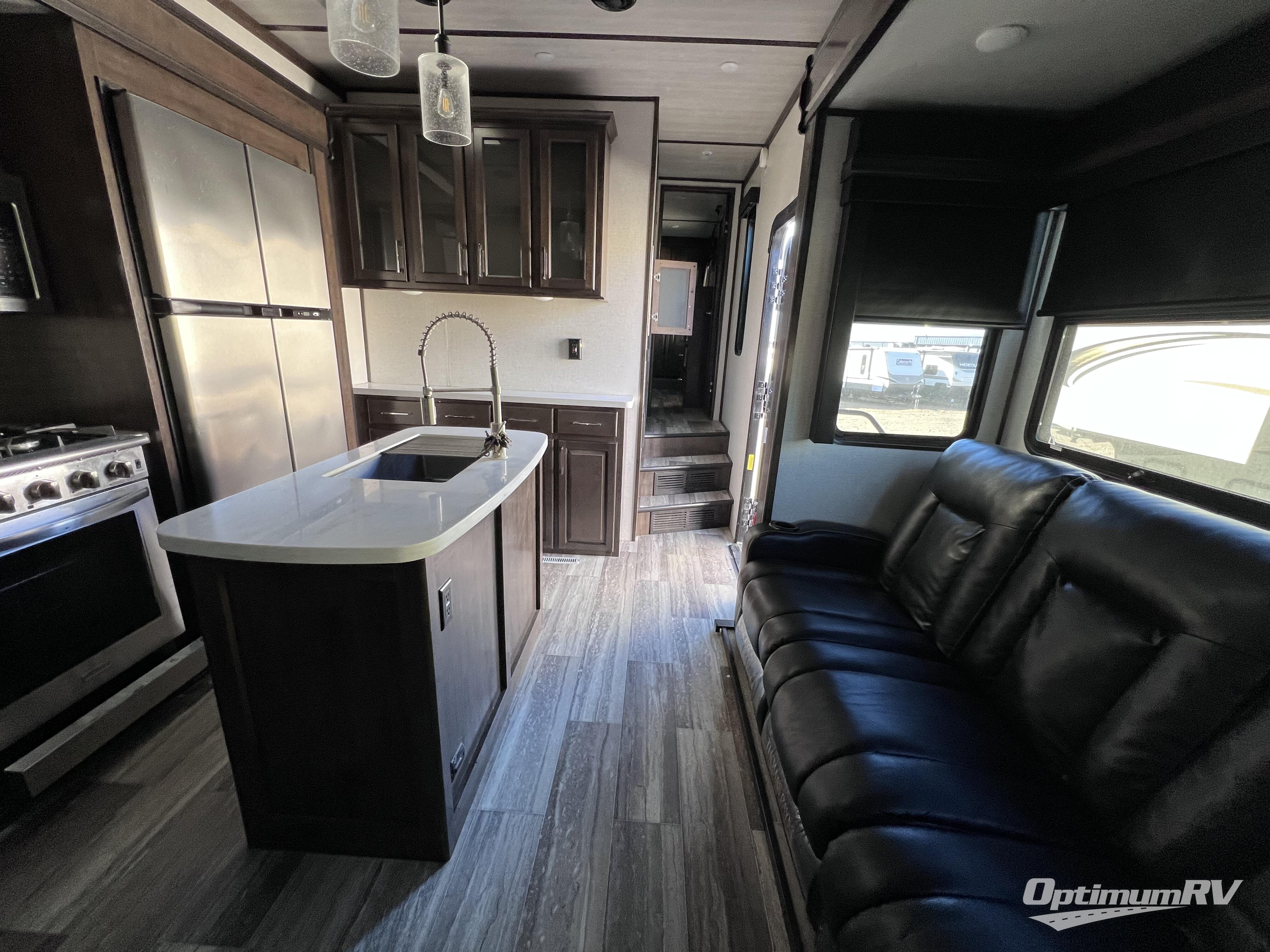 The full and half bathroom are what really add luxury to this Voltage toy hauler! Each bathroom is incorporated into a sleeping space, so you have a master suite up front and a guest suite in the garage. The main living area has opposing slides, so you won't get crowded as you work around the kitchen island, and the heated/massaging residential sofa sits right across from the kitchen and entertainment center. At any time throughout the day, you can reach into the 18-cubic foot refrigerator to grab a cold drink, and then you can head to the sofas with table top in between to sit down and enjoy that drink.