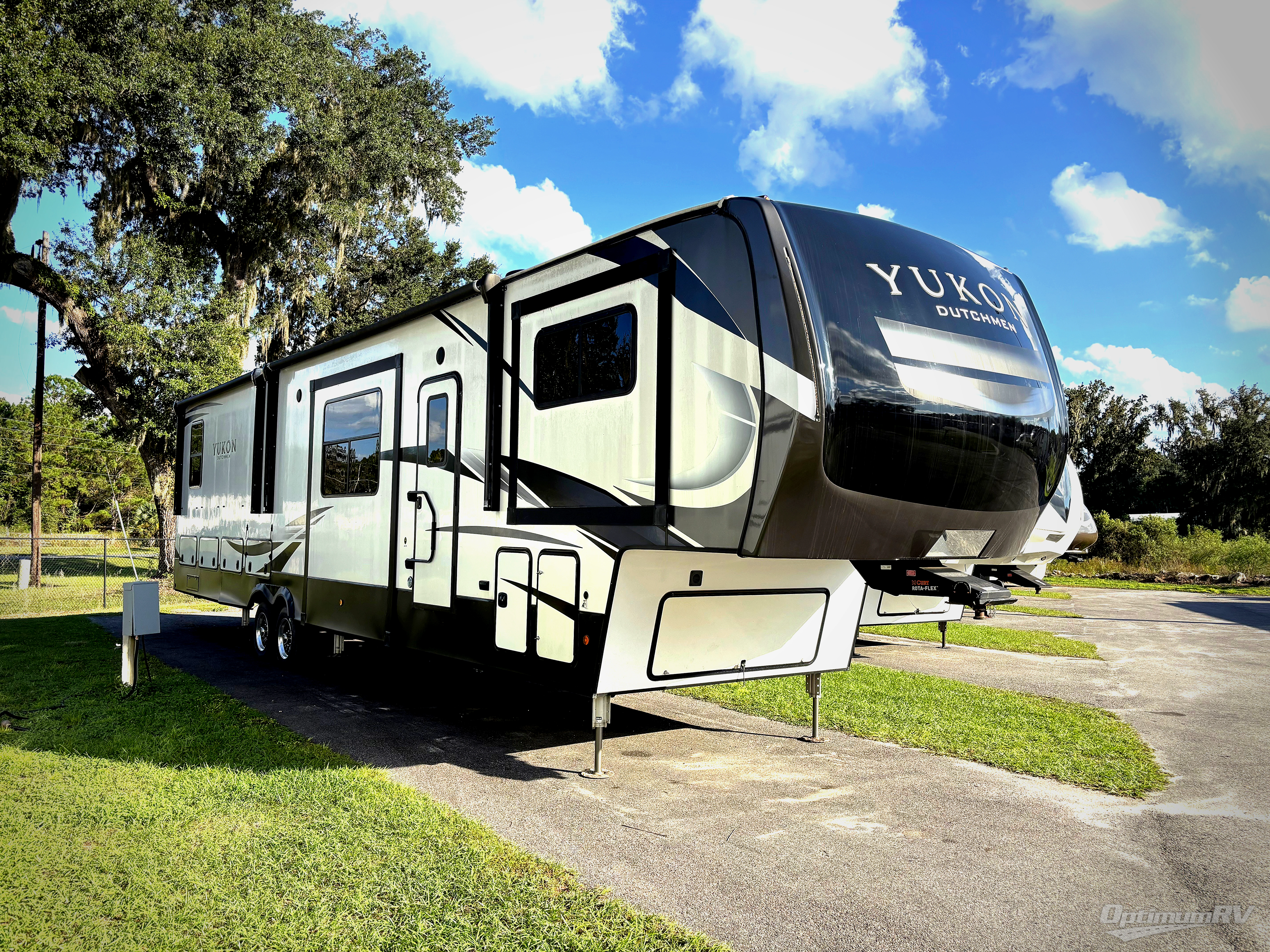 The Dutchmen Yukon fifth wheel features luxury you can take anywhere! The main floor structure consists of linoleum flooring, Dynaspan floor decking, an aluminum frame with block foam insulation and heat duct, a Lauan panel, a Darco moisture barrier, a steel powder-coated main I-beam frame, radiant insulation, and a fully enclosed underbelly. There is a lot of thought and precision that goes into the construction of each Yukon, and the standard features are also well thought out. You'll have a roto flex pin box, dual 30-LB propane tanks, an All Weather Thermal Package, six-point one-touch auto leveling, USB ports, and preparation for Wi-Fi 4G LTE. 3 A/C's from manufacturer as well as solar package with inverter from factory.