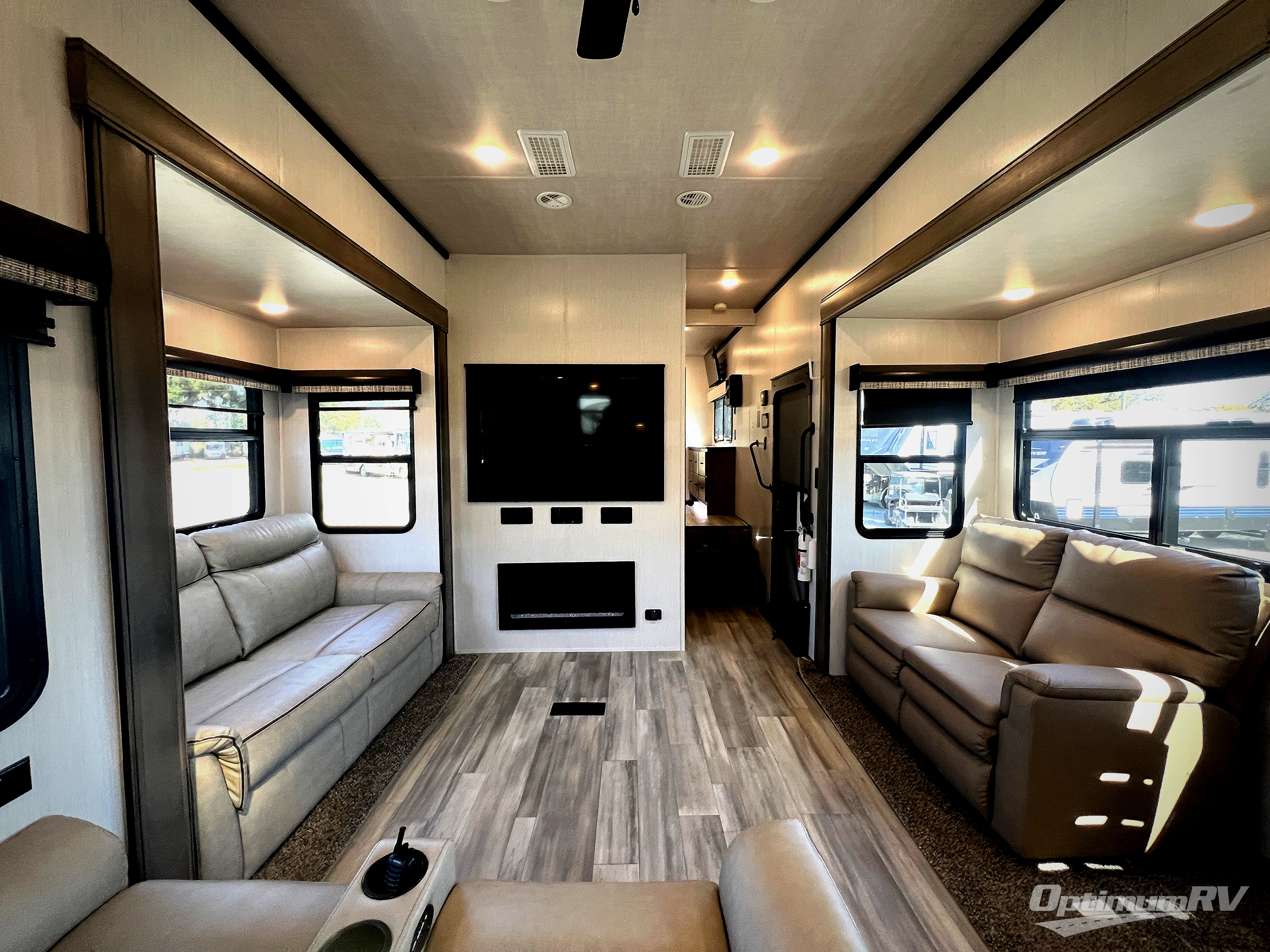 If you need to get some work done while you are camping in this fifth wheel then you will appreciate the desk with a chair! The rear kitchen has plenty of countertop space and a free standing 24" gas range for you to prepare your best meals, a 20 cu. ft. stainless steel electric refrigerator with ice maker to store any leftovers, and a free standing table to enjoy your meals then play card games. The hide-a-bed sofa slide opens up the living area which also has power theater seating with USB charging across from an entertainment center with a fireplace and 50" flat screen TV to watch your favorite movies. The half bathroom has an area prepped to add an optional washer and dryer so you can have clean clothes throughout your entire trip. Inside the master suite is a king bed slide and access to the front full bathroom which has a walk-in closet with a bench, a 48" x 30" shower with a seat, and a dual sink vanity for two to get ready at once. You can even choose to add the optional pull-out kitchen to cook your meals while breathing in fresh air!