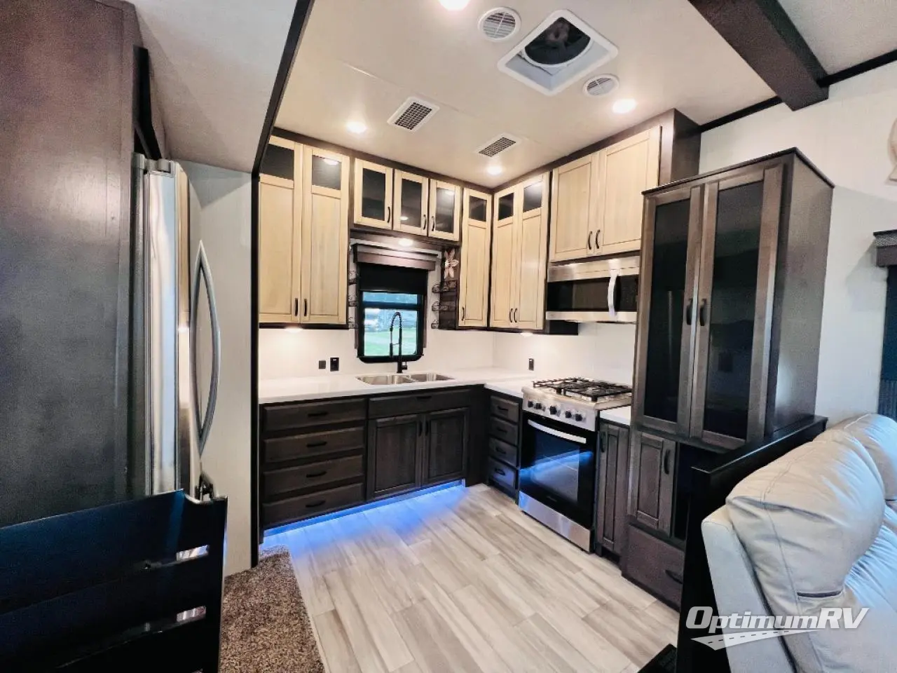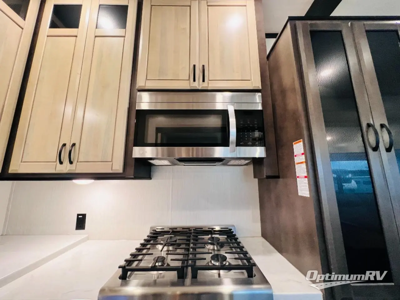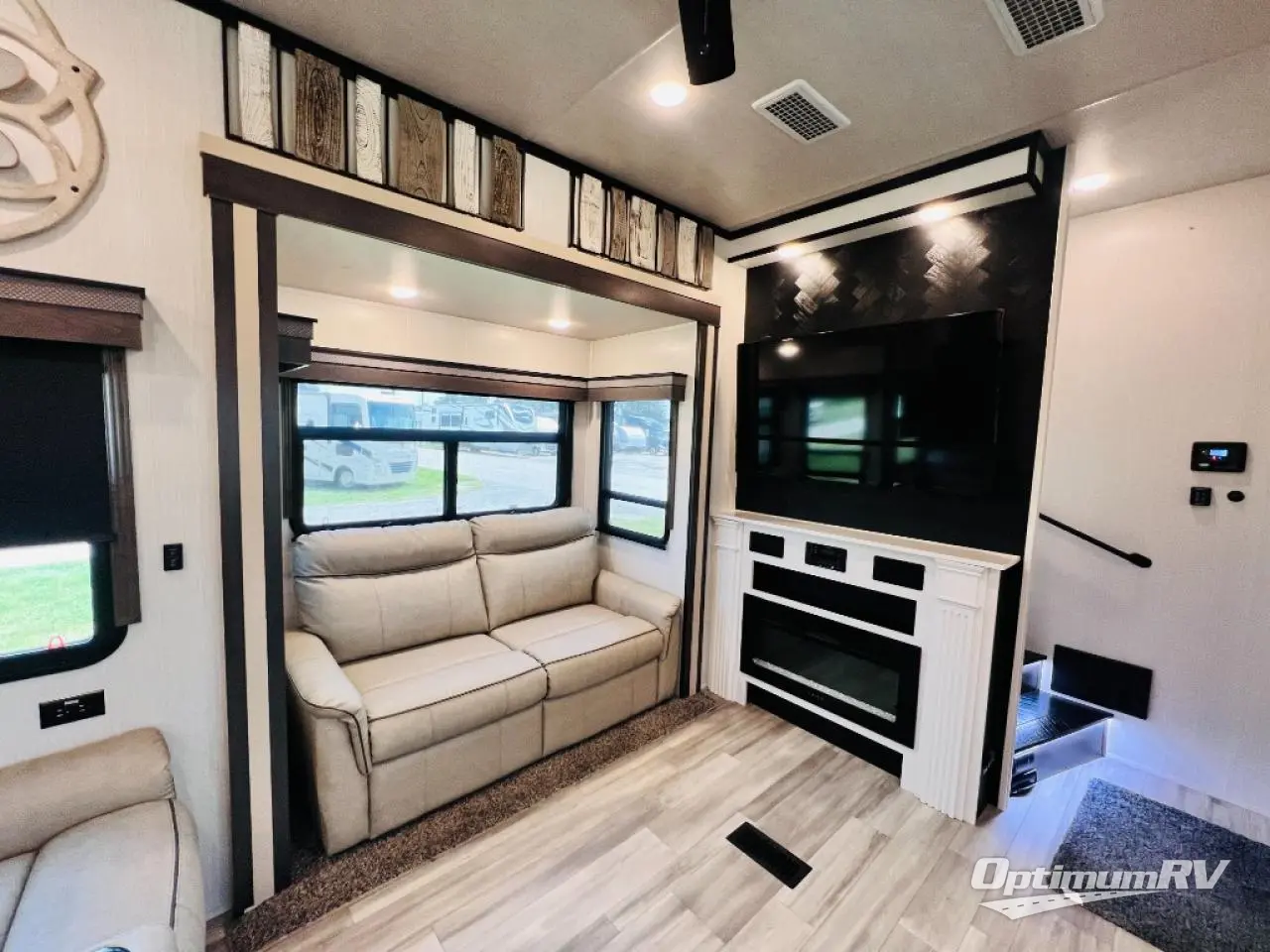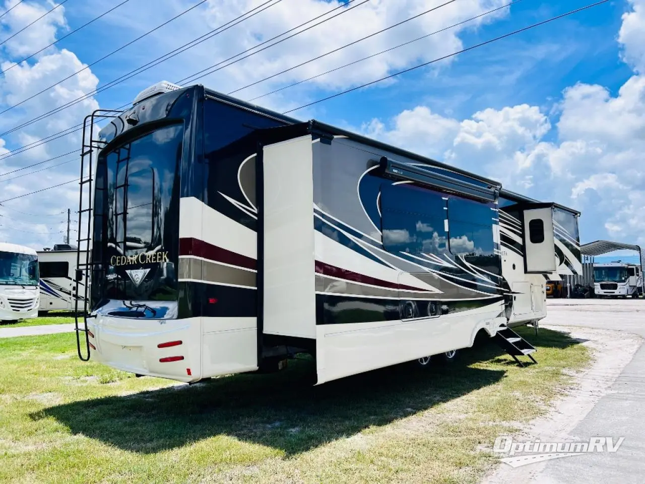 You are going to be stunned by the attractive and modern features found on this Cedar Creek Champagne Edition fifth wheel! The kitchen is extremely well-equipped with its four-burner range, stainless steel microwave, solid-surface countertops, 20-cubic foot stainless steel refrigerator with ice maker, and dishwasher. Now all of your meals will end up looking just like they do at home. And not only that, but you also have the ability to add an optional exterior pull-out kitchen for even more space to prep meals. There is a fireplace in the living area to keep the space cozy, and there are two sets of power theater seats for relaxing. The full bathroom is filled with residential comfort with the dual-sink vanity and 48" shower, and the private bedroom has an upgraded luxury king mattress to sleep on.