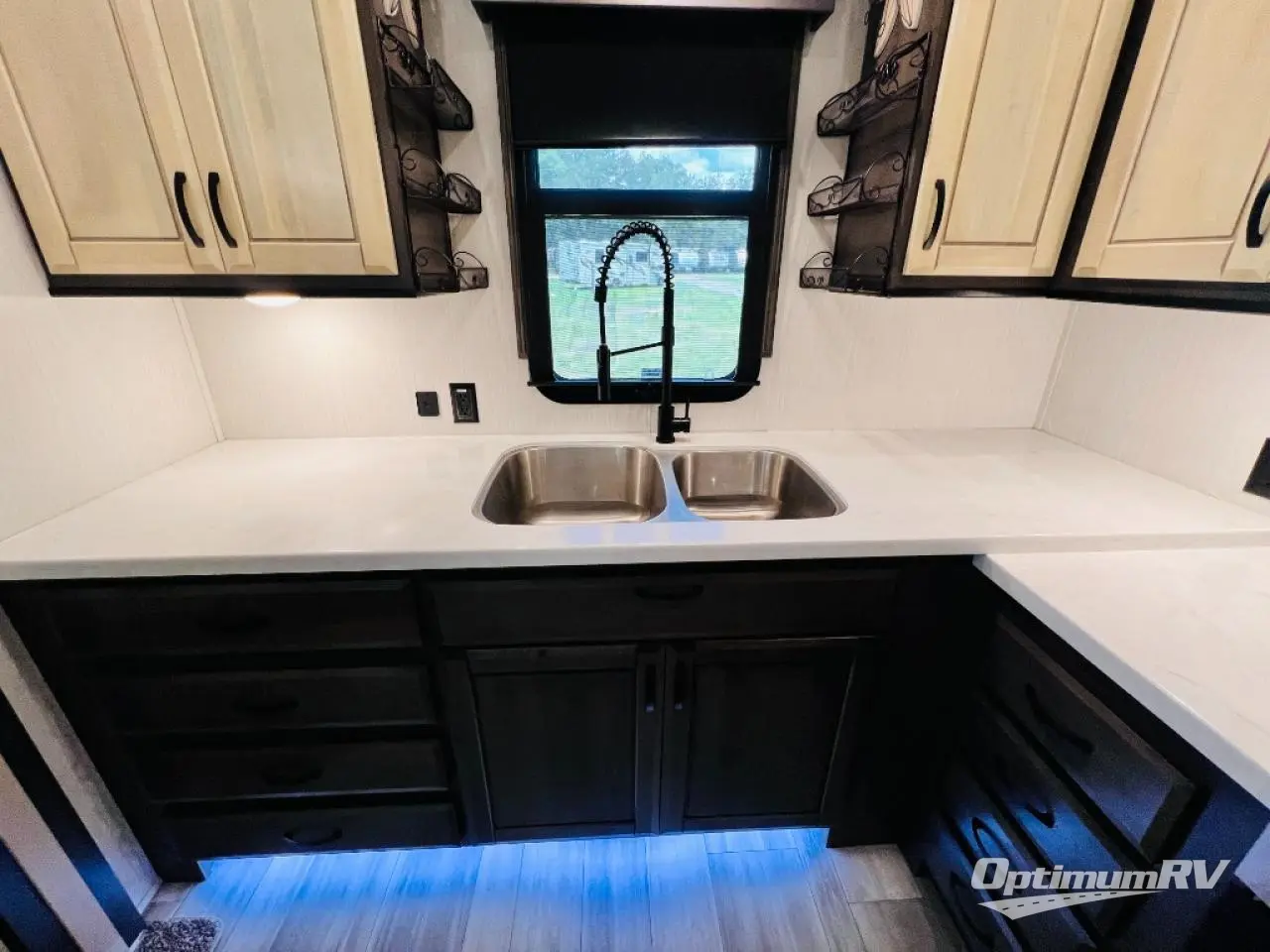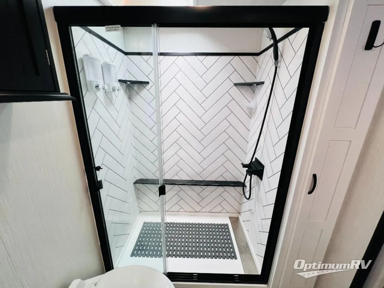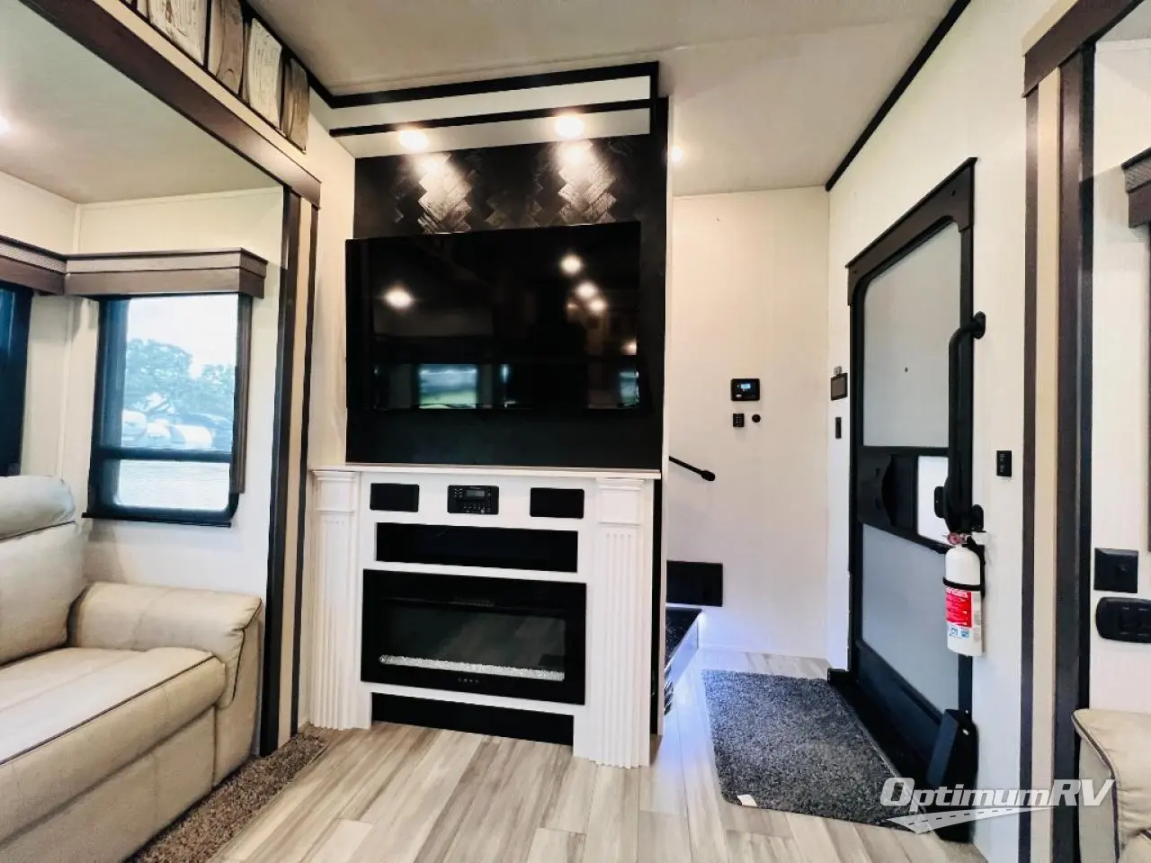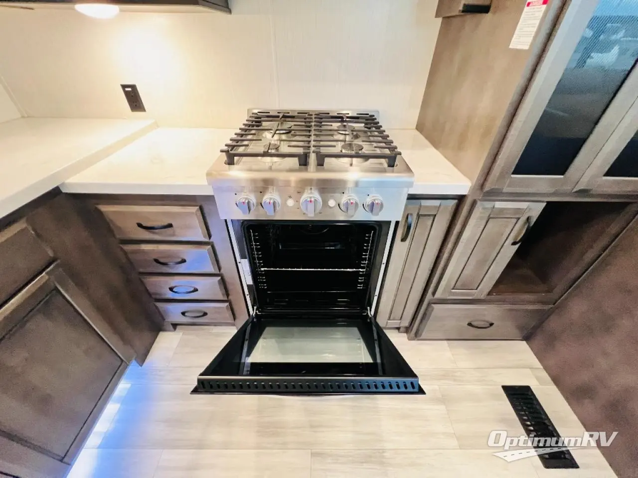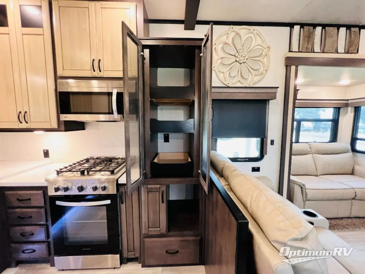 You are going to be stunned by the attractive and modern features found on this Cedar Creek Champagne Edition fifth wheel! The kitchen is extremely well-equipped with its four-burner range, stainless steel microwave, solid-surface countertops, 20-cubic foot stainless steel refrigerator with ice maker, and dishwasher. Now all of your meals will end up looking just like they do at home. And not only that, but you also have the ability to add an optional exterior pull-out kitchen for even more space to prep meals. There is a fireplace in the living area to keep the space cozy, and there are two sets of power theater seats for relaxing. The full bathroom is filled with residential comfort with the dual-sink vanity and 48" shower, and the private bedroom has an upgraded luxury king mattress to sleep on.