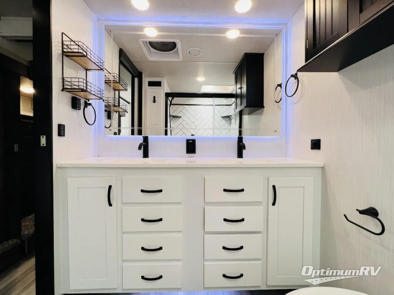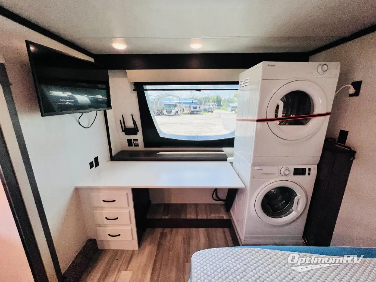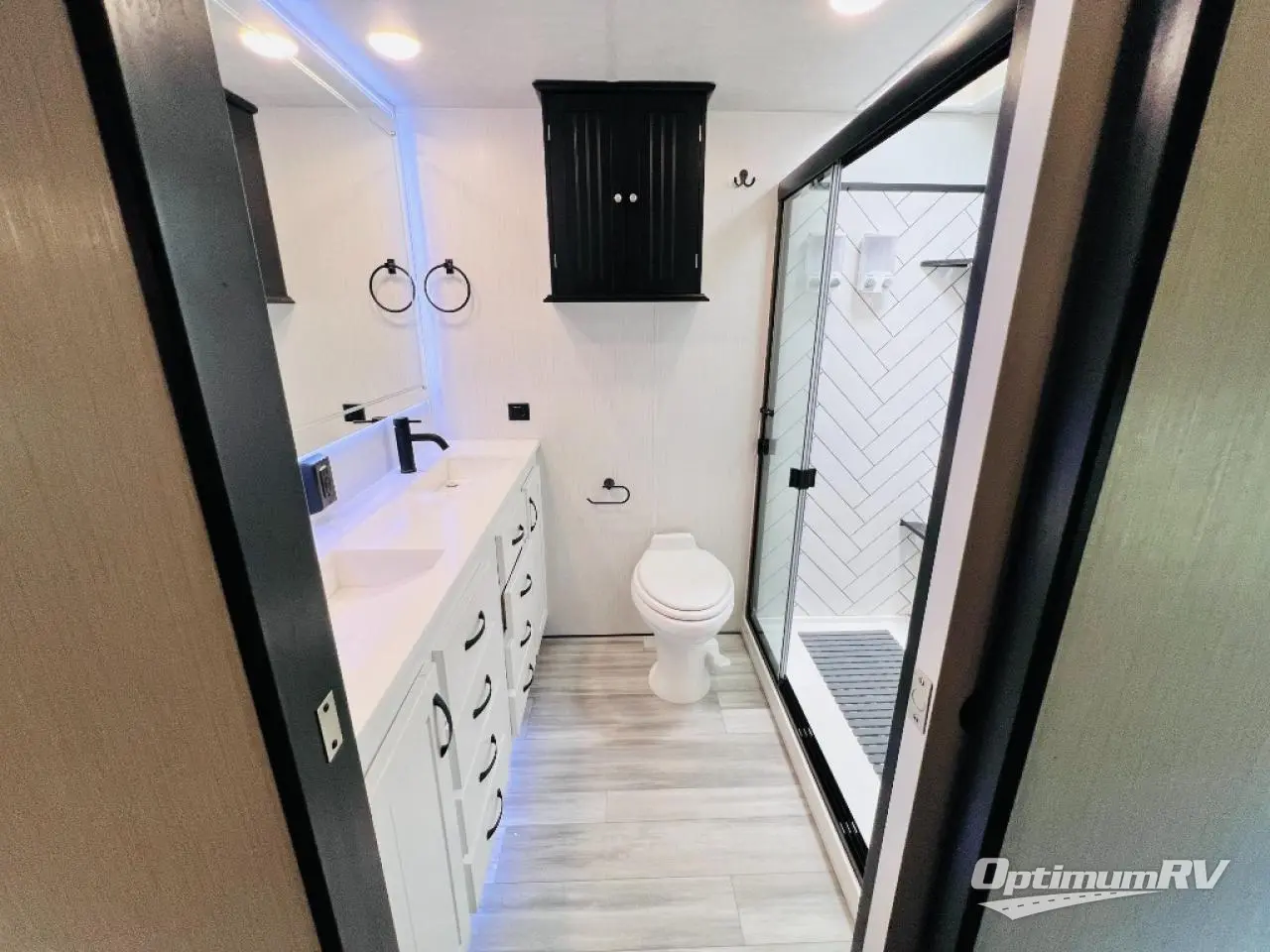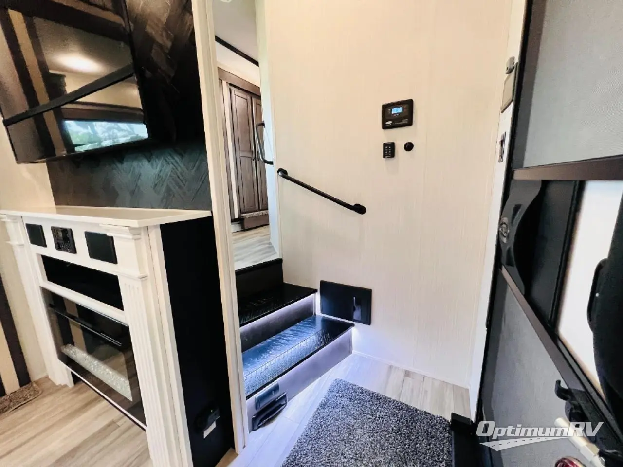 You are going to be stunned by the attractive and modern features found on this Cedar Creek Champagne Edition fifth wheel! The kitchen is extremely well-equipped with its four-burner range, stainless steel microwave, solid-surface countertops, 20-cubic foot stainless steel refrigerator with ice maker, and dishwasher. Now all of your meals will end up looking just like they do at home. And not only that, but you also have the ability to add an optional exterior pull-out kitchen for even more space to prep meals. There is a fireplace in the living area to keep the space cozy, and there are two sets of power theater seats for relaxing. The full bathroom is filled with residential comfort with the dual-sink vanity and 48" shower, and the private bedroom has an upgraded luxury king mattress to sleep on.