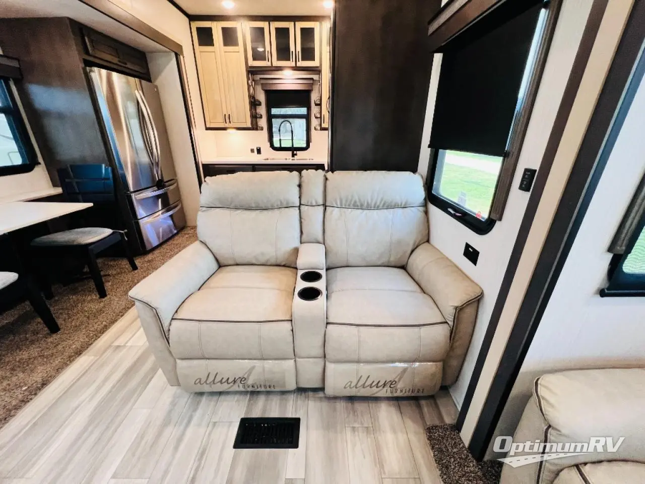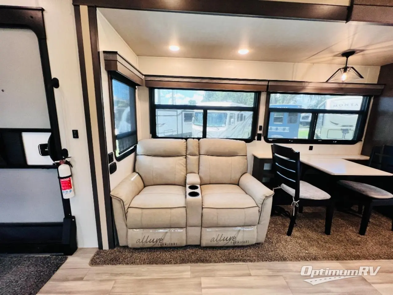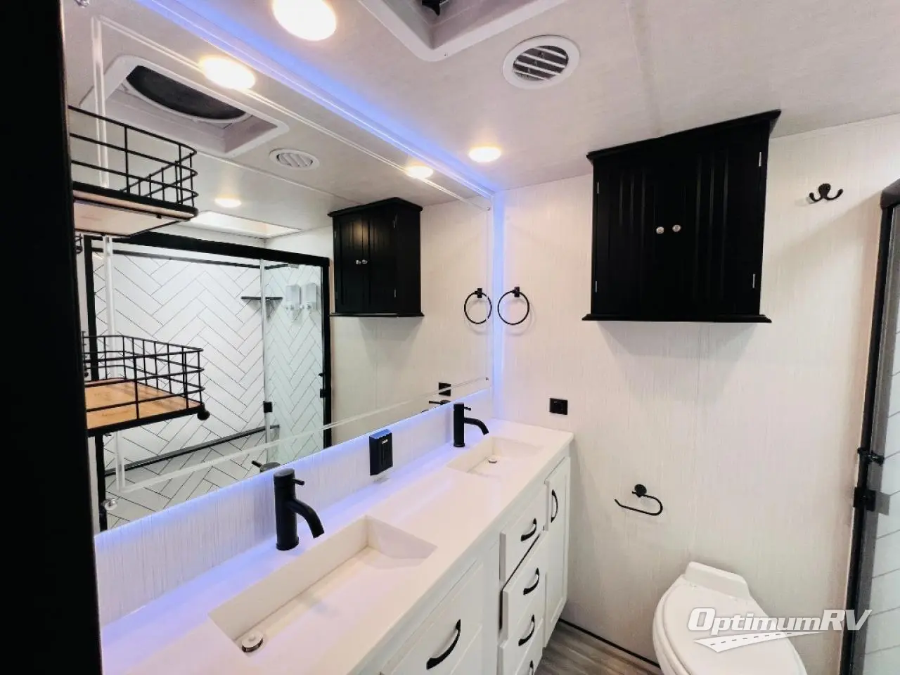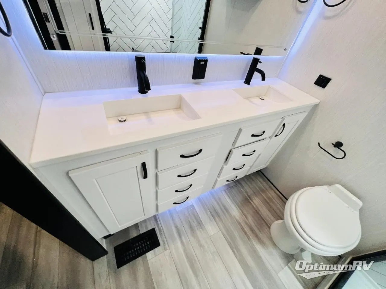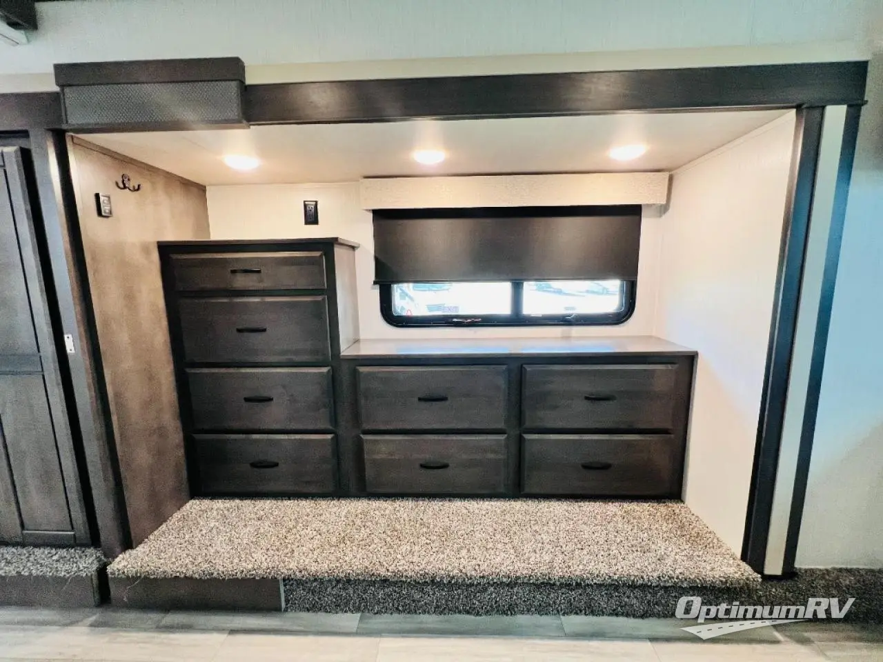 You are going to be stunned by the attractive and modern features found on this Cedar Creek Champagne Edition fifth wheel! The kitchen is extremely well-equipped with its four-burner range, stainless steel microwave, solid-surface countertops, 20-cubic foot stainless steel refrigerator with ice maker, and dishwasher. Now all of your meals will end up looking just like they do at home. And not only that, but you also have the ability to add an optional exterior pull-out kitchen for even more space to prep meals. There is a fireplace in the living area to keep the space cozy, and there are two sets of power theater seats for relaxing. The full bathroom is filled with residential comfort with the dual-sink vanity and 48" shower, and the private bedroom has an upgraded luxury king mattress to sleep on.