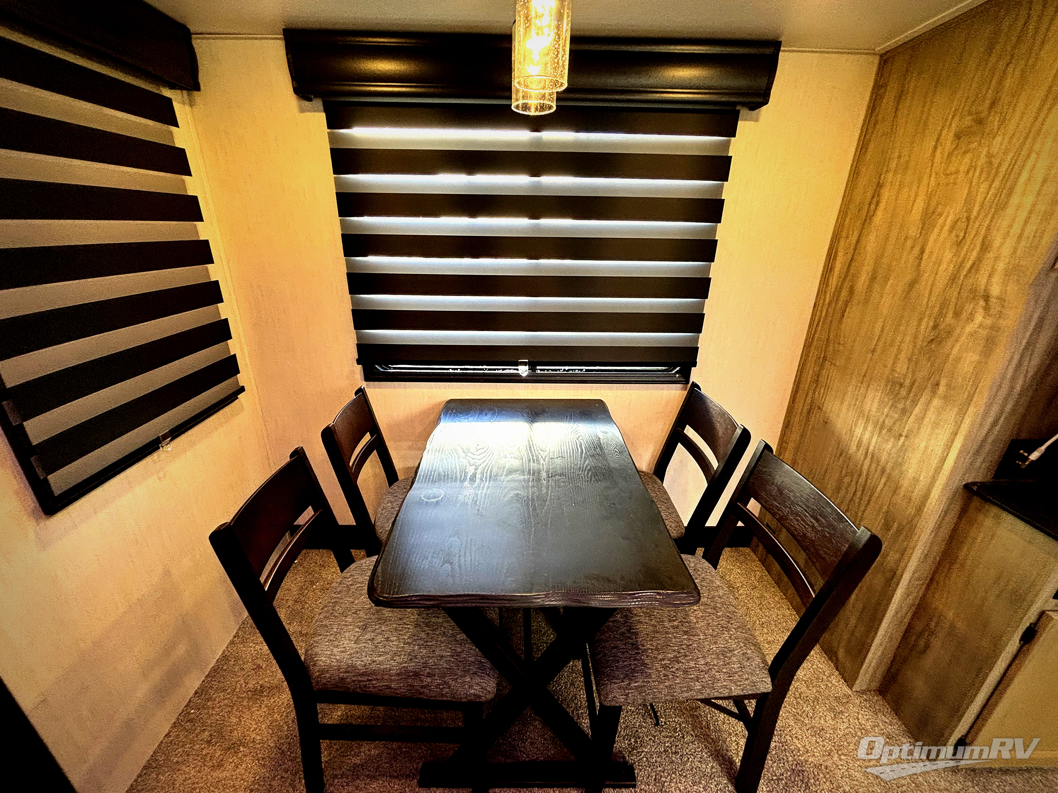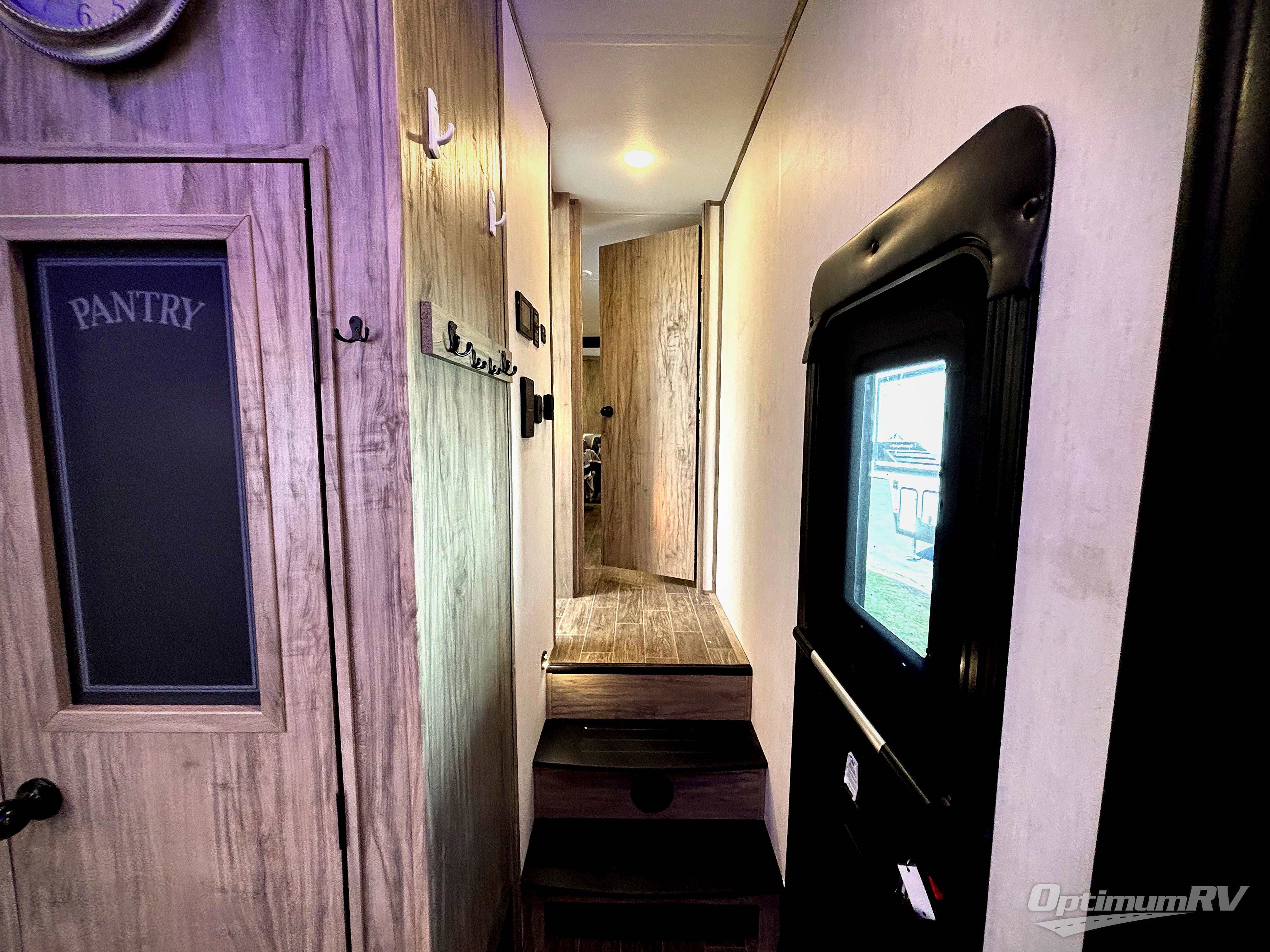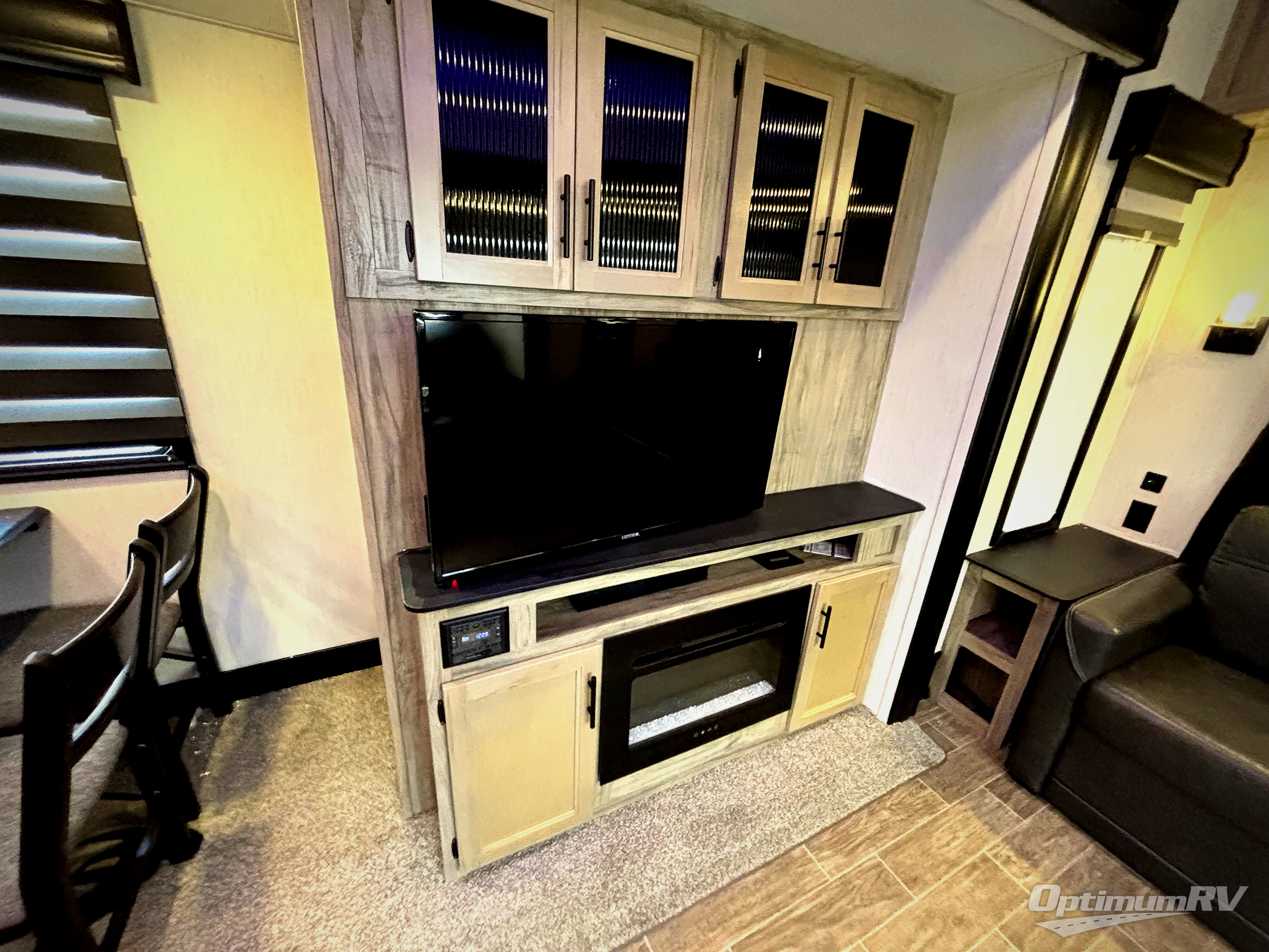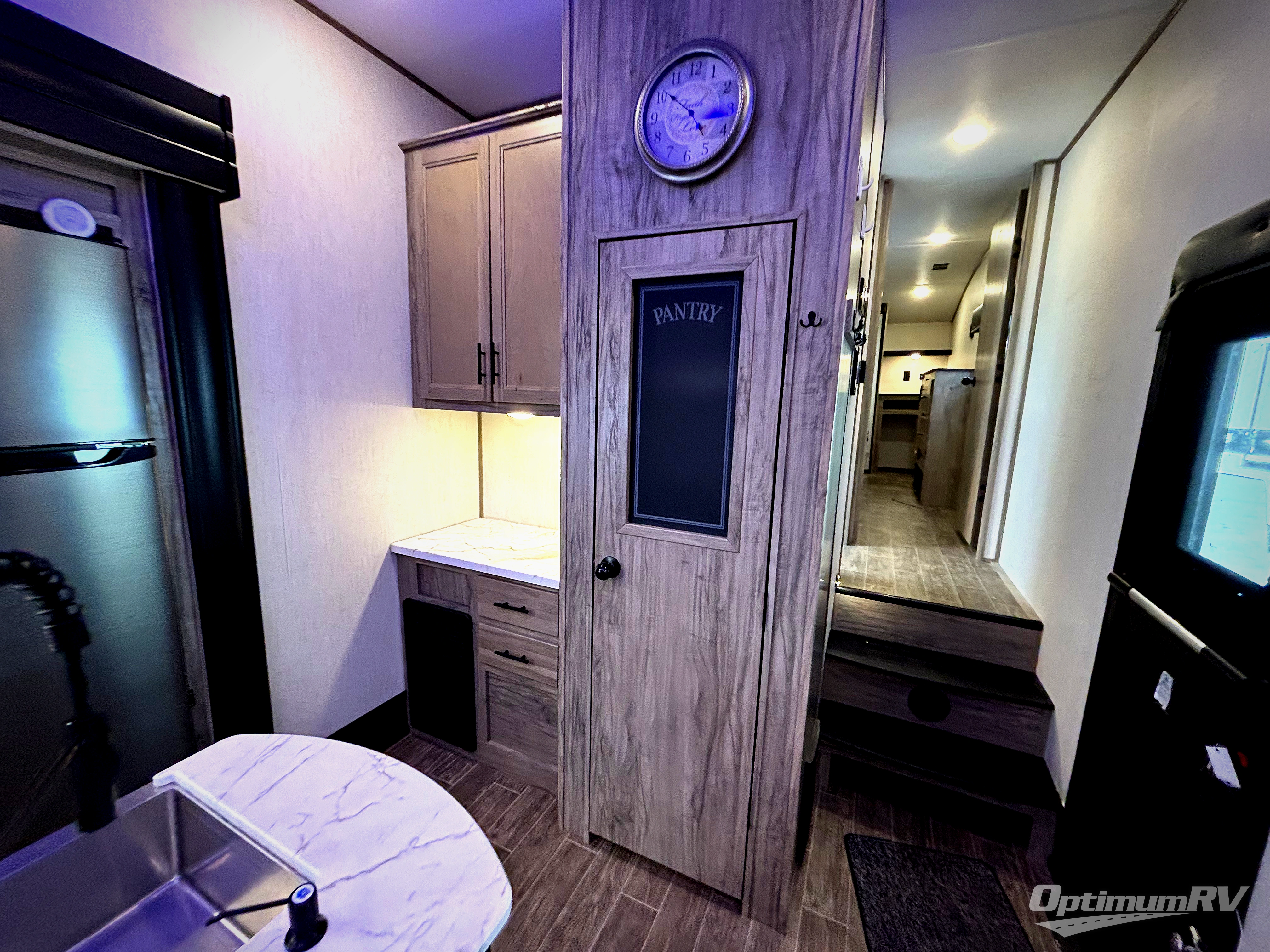 This Cherokee Arctic Wolf Suite fifth wheel is quite extraordinary and accommodating! It has a set of opposing slides in the main living area so that you can have more space to sit back on the theater seating and tri-fold sofa. You can switch on the fireplace to add some warmth to this space if it's a cool night, or if it is a hot afternoon, simply switch on the ceiling fan. The table with two fixed/two foldable chairs is going to be great for sitting down to eat a meal together, and after dinner, you can prepare coffee for everyone at the coffee bar. You'll also be able to grab dessert from the walk-in pantry to go with your coffee. The Juice Pack 50W solar panel will help your unit stay powered when you can't connect at a campsite, and the private bedroom up front is going to provide great relaxation with its king bed slide.