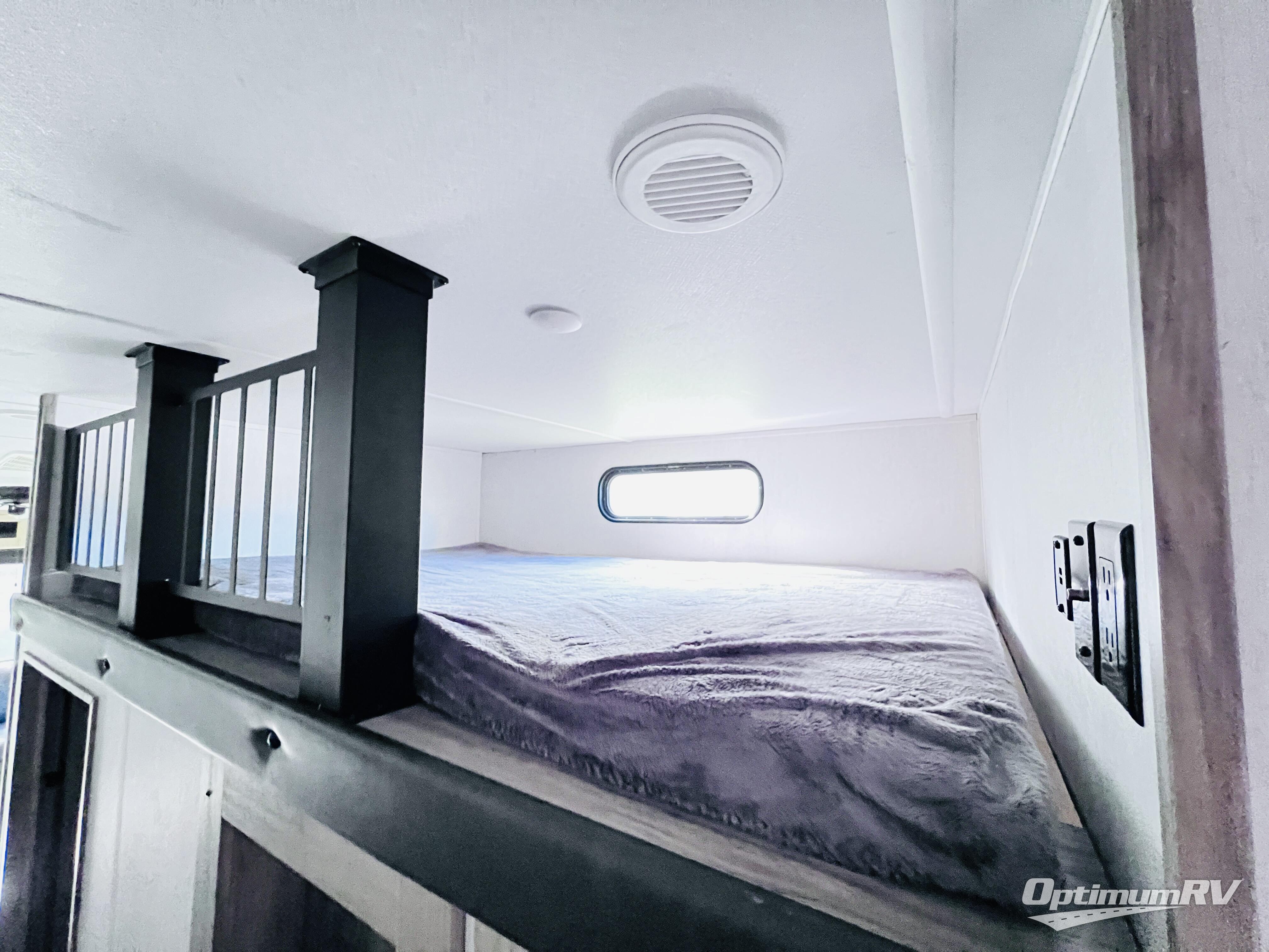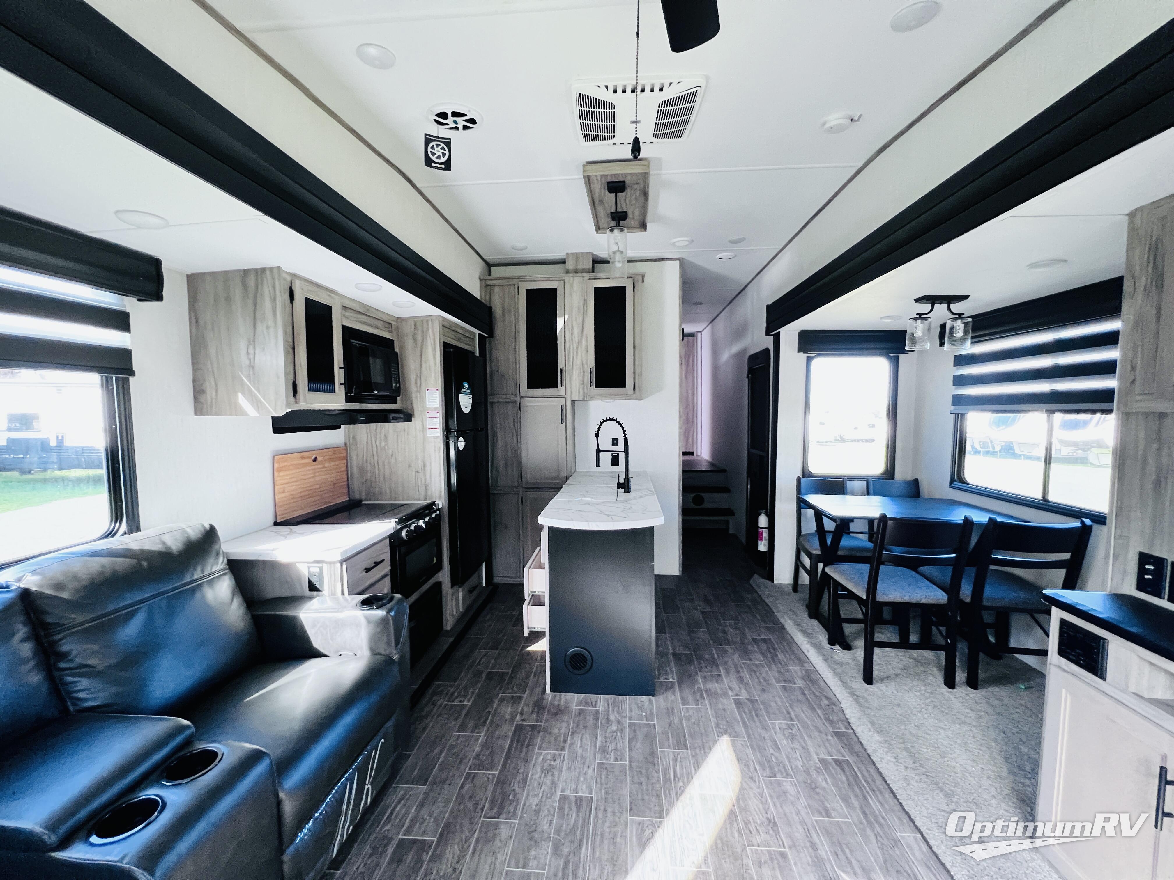 You have excellent sleeping accommodations on this Cherokee Arctic Wolf Suite fifth wheel! There is a private bedroom with a king-size bed at the front for you, and the second bedroom contains a flip-up bunk and tri-fold sofa for any kids or friends you have traveling with you. But it doesn't stop there. There is also a loft above the bunk room and a tri-fold sofa in the living area that you can use as a sleeping space. The kitchen is ready for you to make meals on the three-burner range, and you can work freely around the peninsula countertop. The ceiling fan will cool this area down if it gets too hot while you're cooking, and you can eat your meals at the table with two fixed/two folding chairs. When you enter this unit, you'll also appreciate having a coat drop zone and shoe storage to keep your belongings tidy.