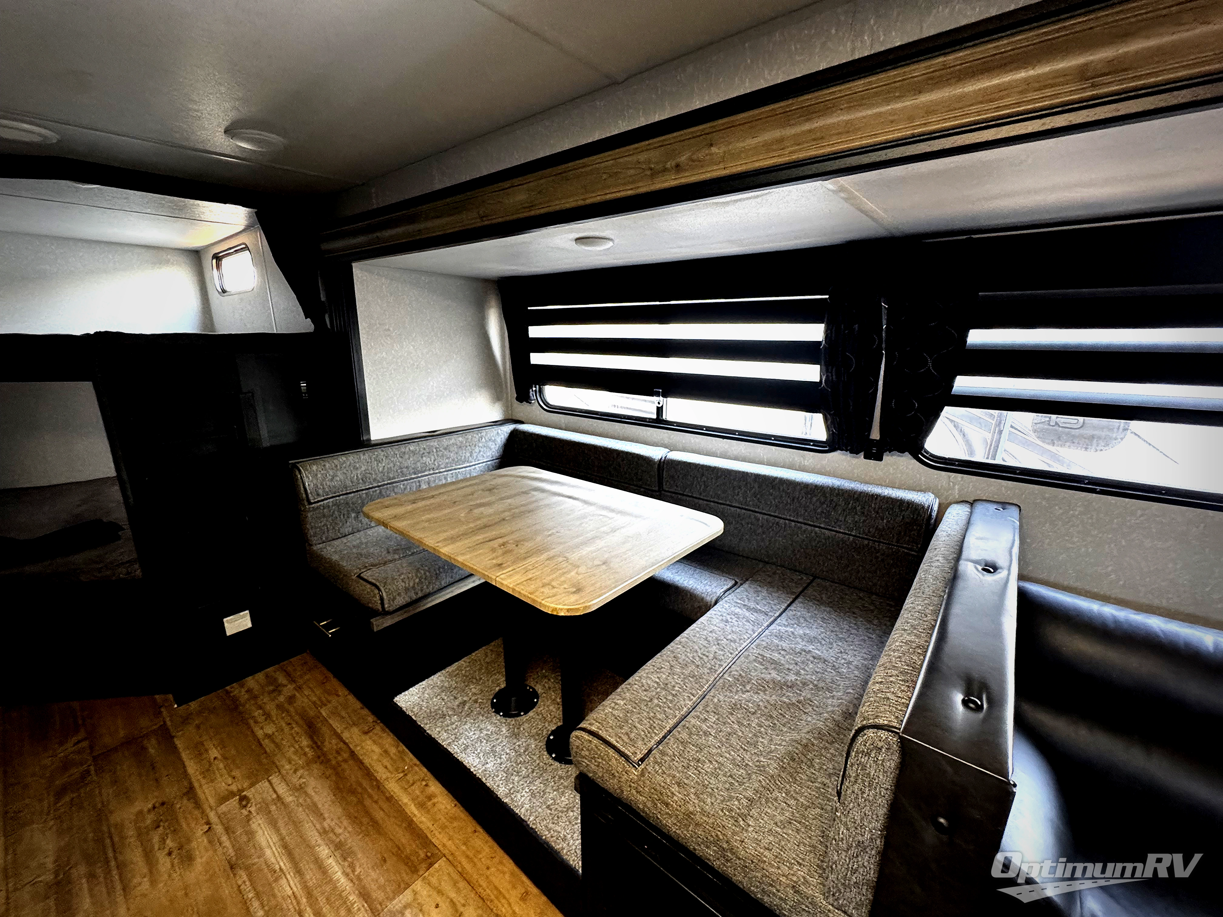 Come on inside this Cherokee Grey Wolf travel trailer and experience the convenience of a smooth flow of traffic in and out with two entry doors. The rear door leads into a full bath which is great for accessibility when outside and when you need to use the bathroom. Once inside, you will notice the large U-shaped dinette and the sofa which sit on the slide and create a spacious footprint for moving about, as well as great places to play games and socialize with your friends and family. A walk-in pantry provides plenty of storage allowing you to stock up on your favorite snacks and dry goods for your family adventure. At night, there is sleeping space for everyone between the double-size bunks and the queen-size bed, plus the furniture.